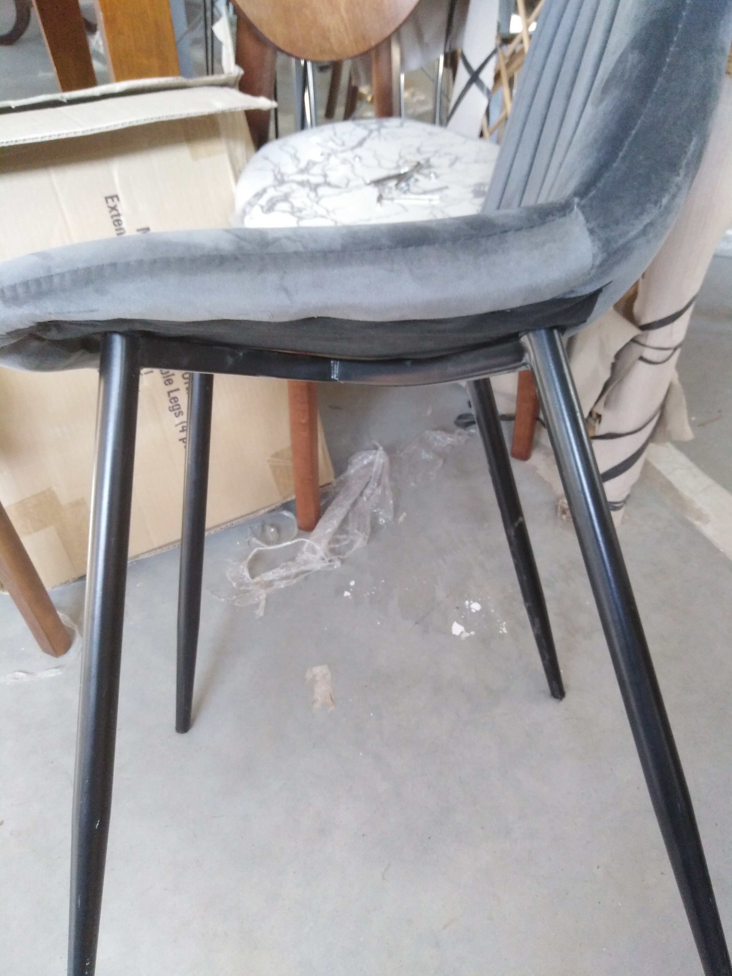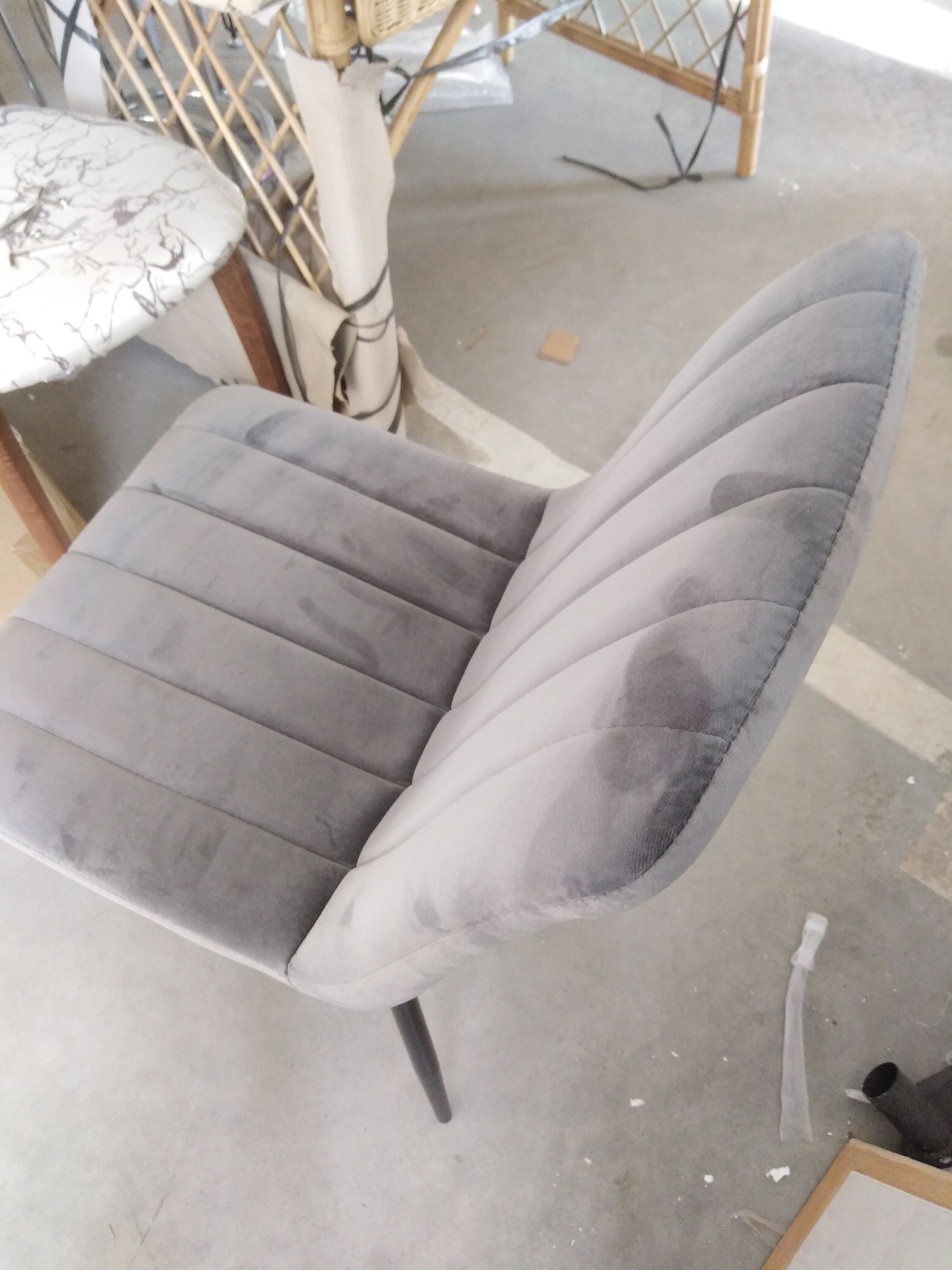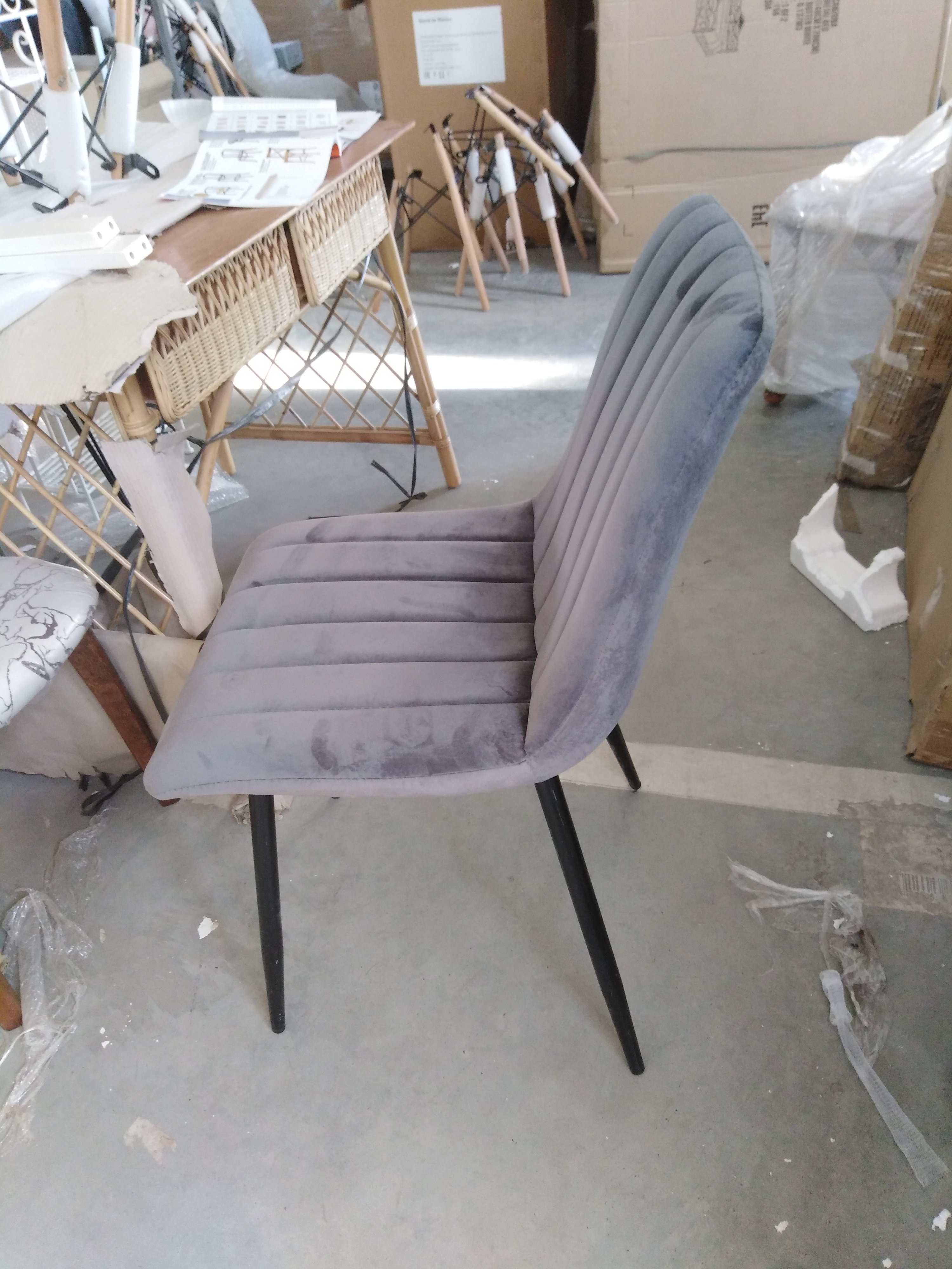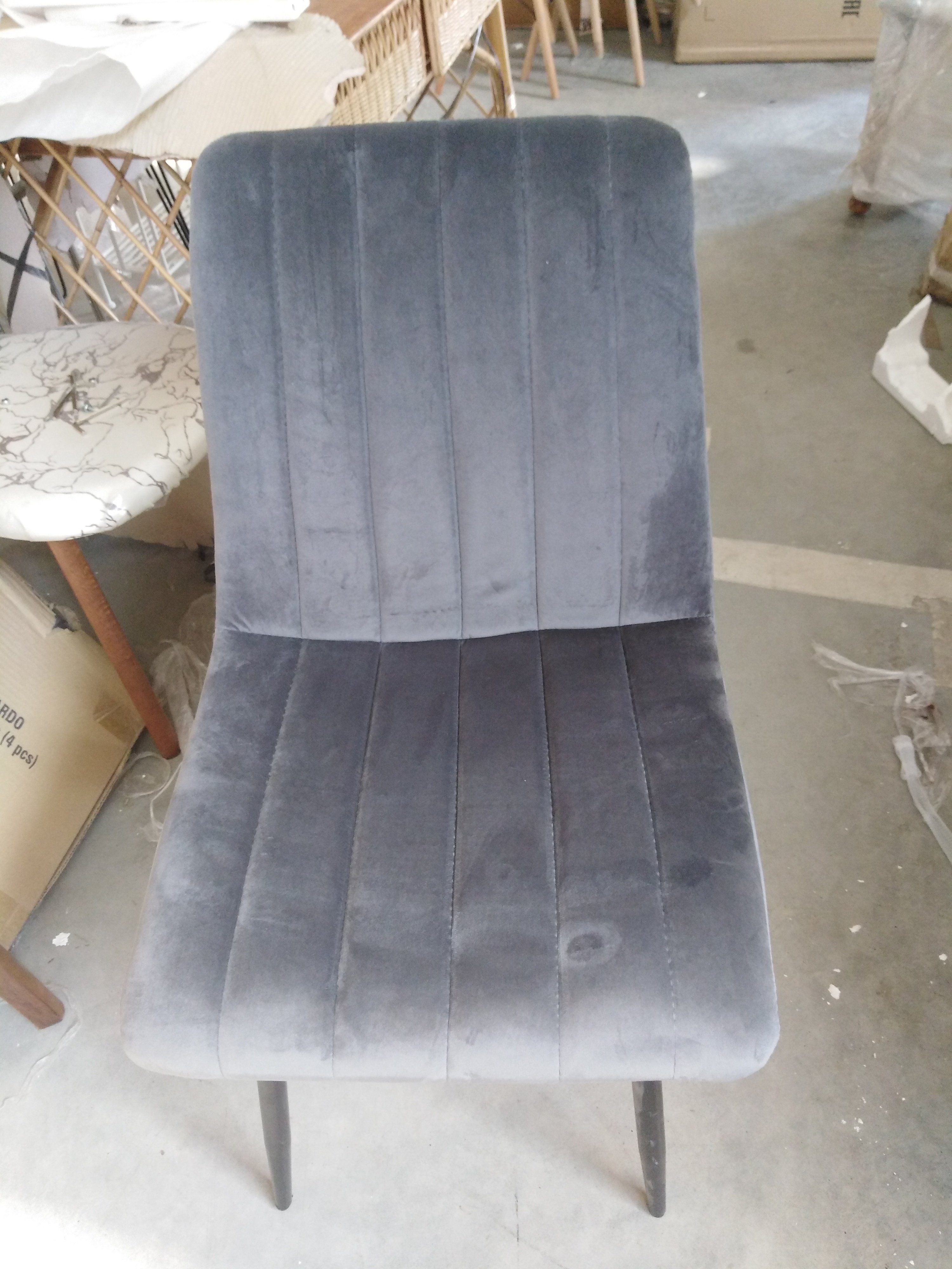 Описание товара без дефектов: Великолепный стул DUBLIN из коллекции Modern сделает ваш интерьер не только стильным, но по-домашнему уютным и комфортным. Тонкие изящные ножки в сочетании со стеганой обивкой из вельвета серого цвета выгодно выделяют его в интерьере. Мягкое сиденье и спинка позволяют комфортно сидеть в течение длительного времени. Бархатистая и приятная на ощупь поверхность обивки обеспечит максимальный комфорт и уют. Четыре прочные ножки делают модель устойчивой и надежной. Тканевая обивка не мнётся, не меняет форму, пропускает воздух, экологична и гипоаллергенна. Этот стильный и удобный стул отлично впишется в интерьер гостиной, кухни или столовой.