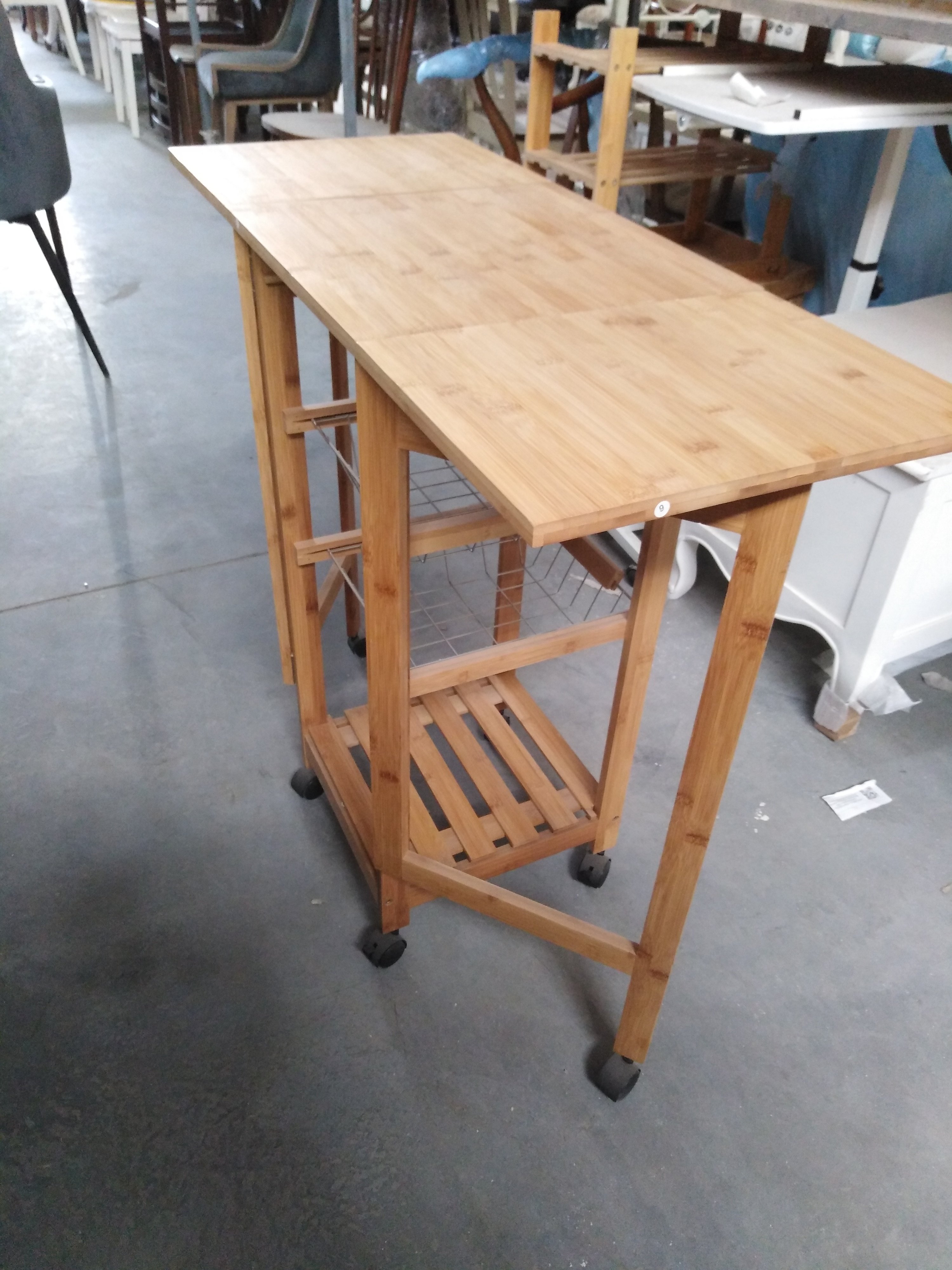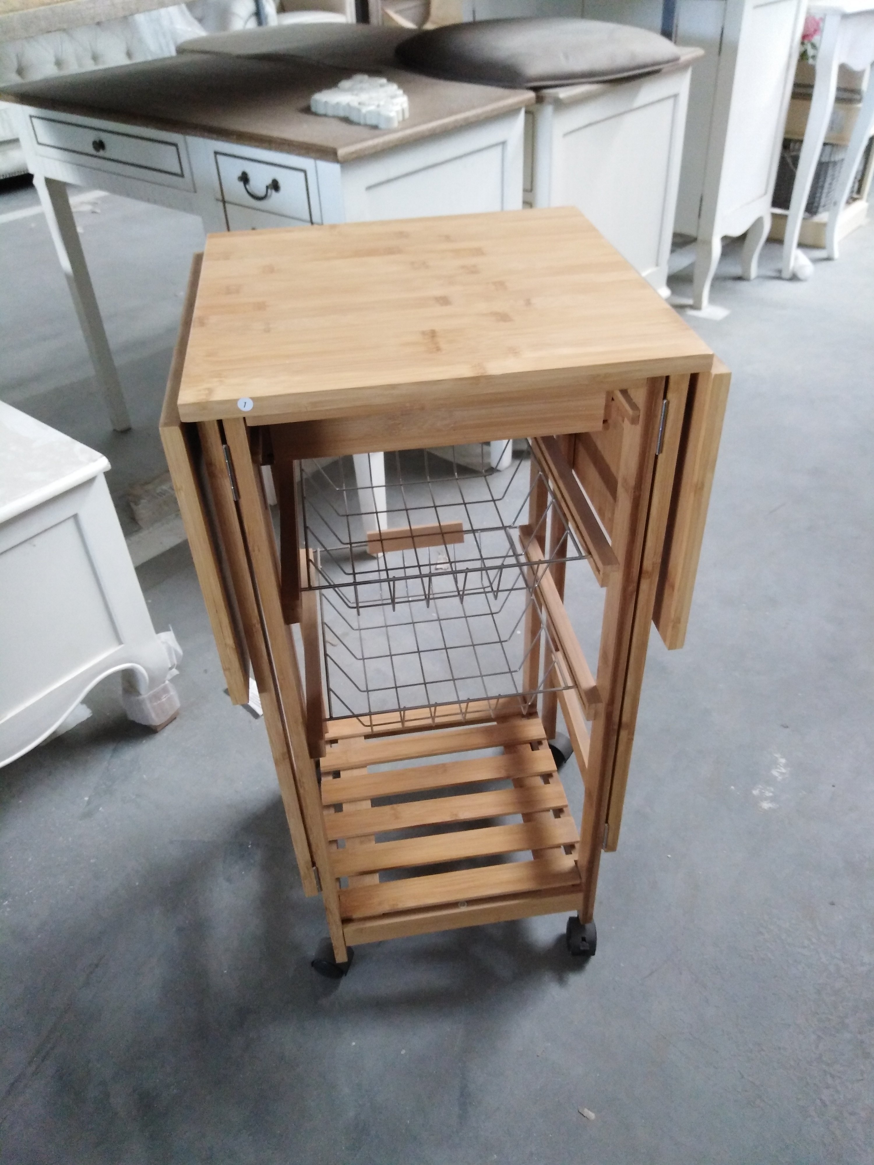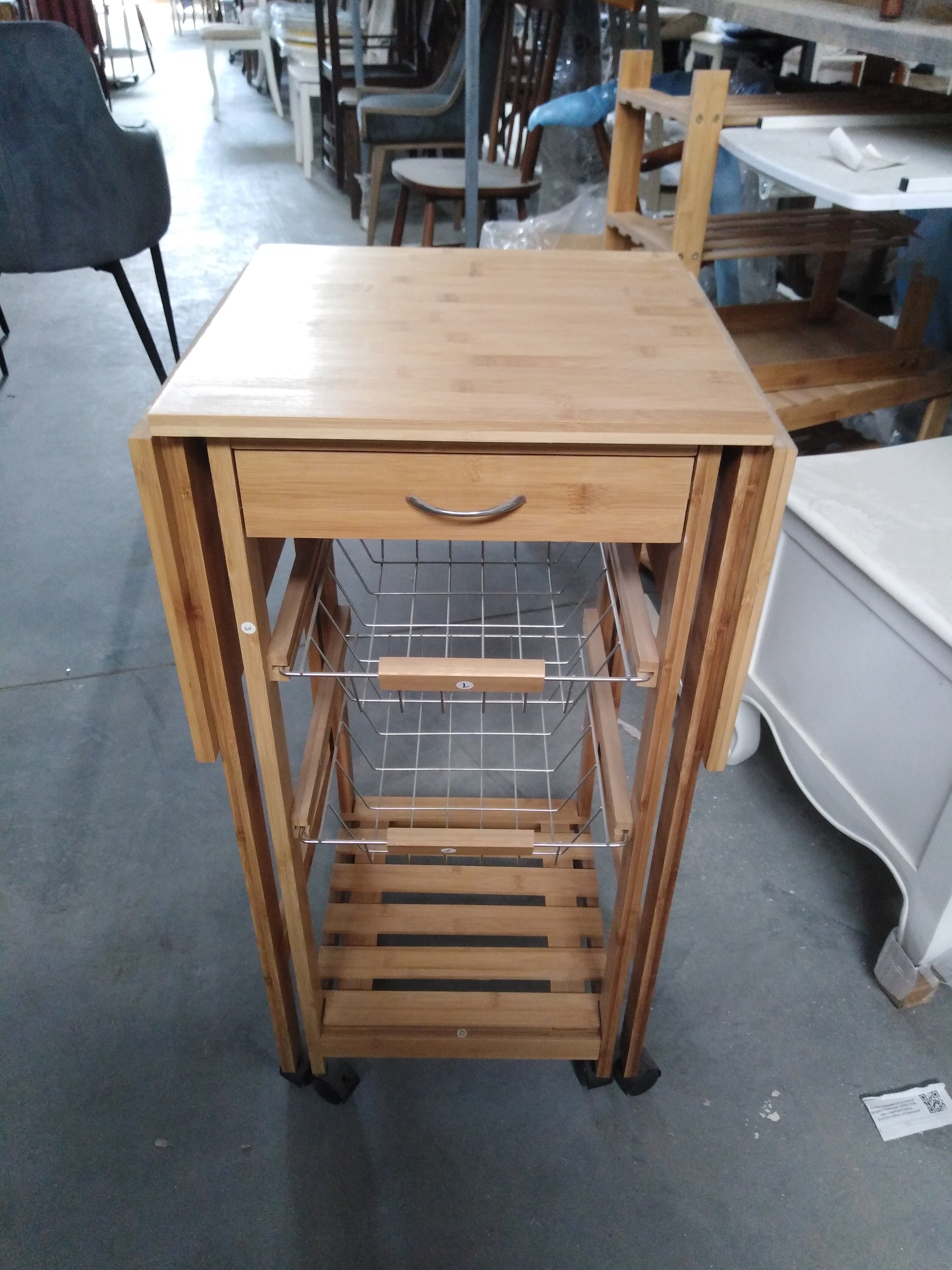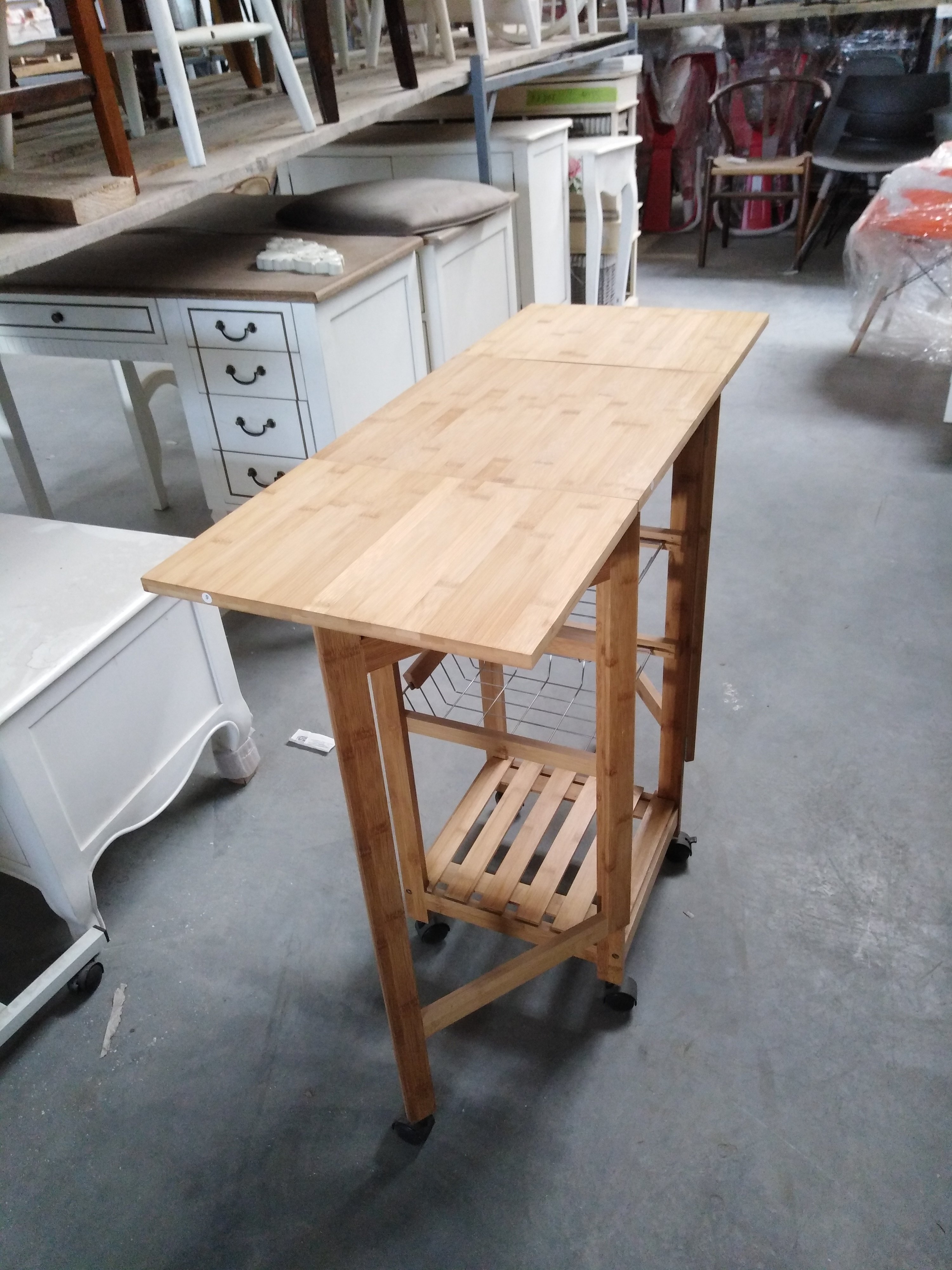 Описание товара без дефектов: Стол раскладной (2 откидные столешницы с дополнительными ножками). Основание и ножки на колёсиках. 1 ящик. 2 металлические выдвижные полки. Материал: прессованный бамбук. Цвет: натуральный. Размеры: 37х37(91)х82 см.