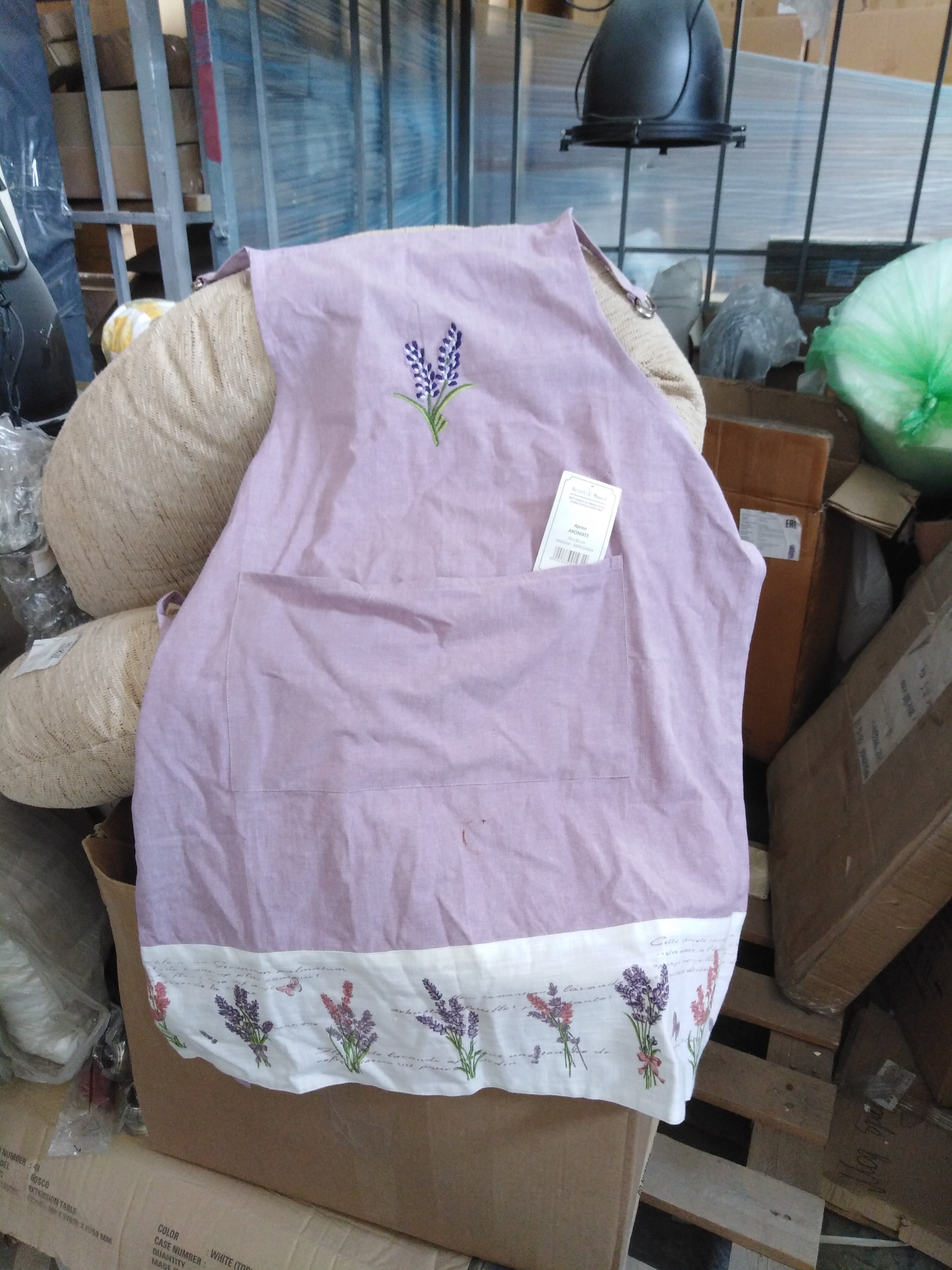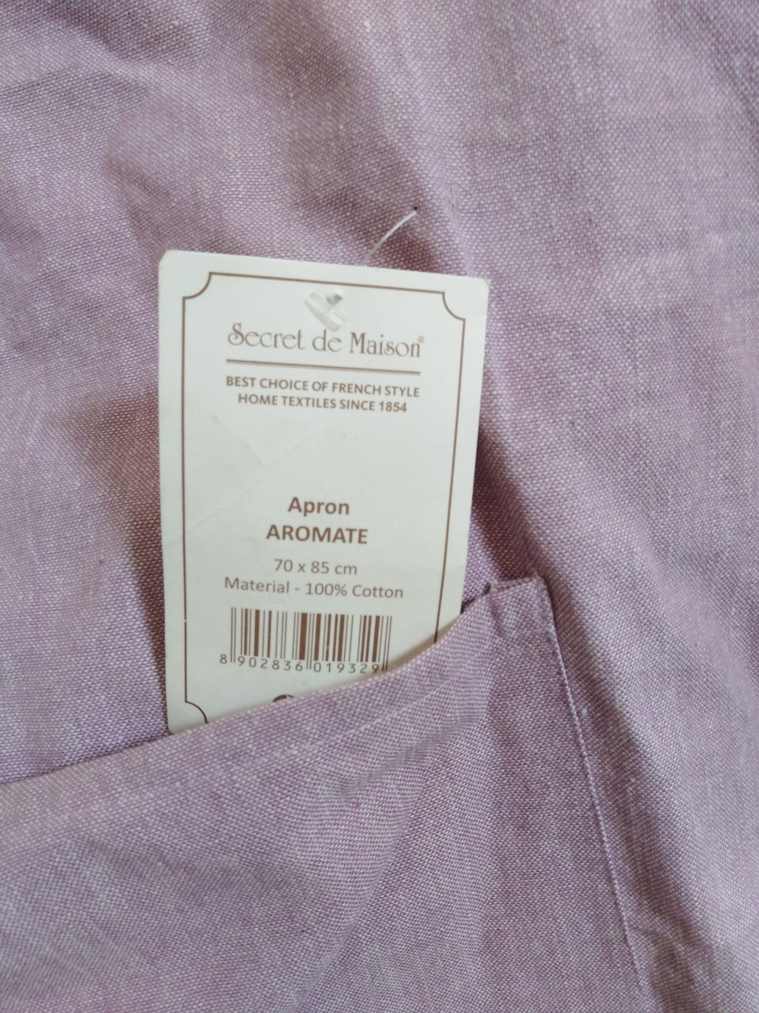 Описание товара без дефектов: Декор - аппликация+вышивка. Высота фартука регулируется с помощью завязок на шее и металлического кольца. 2 кармана. Материал: лён+хлопок. Цвет: основа - нежно-сиреневый, низ - лавандовый принт на белом фоне. Размеры: 70х85 см