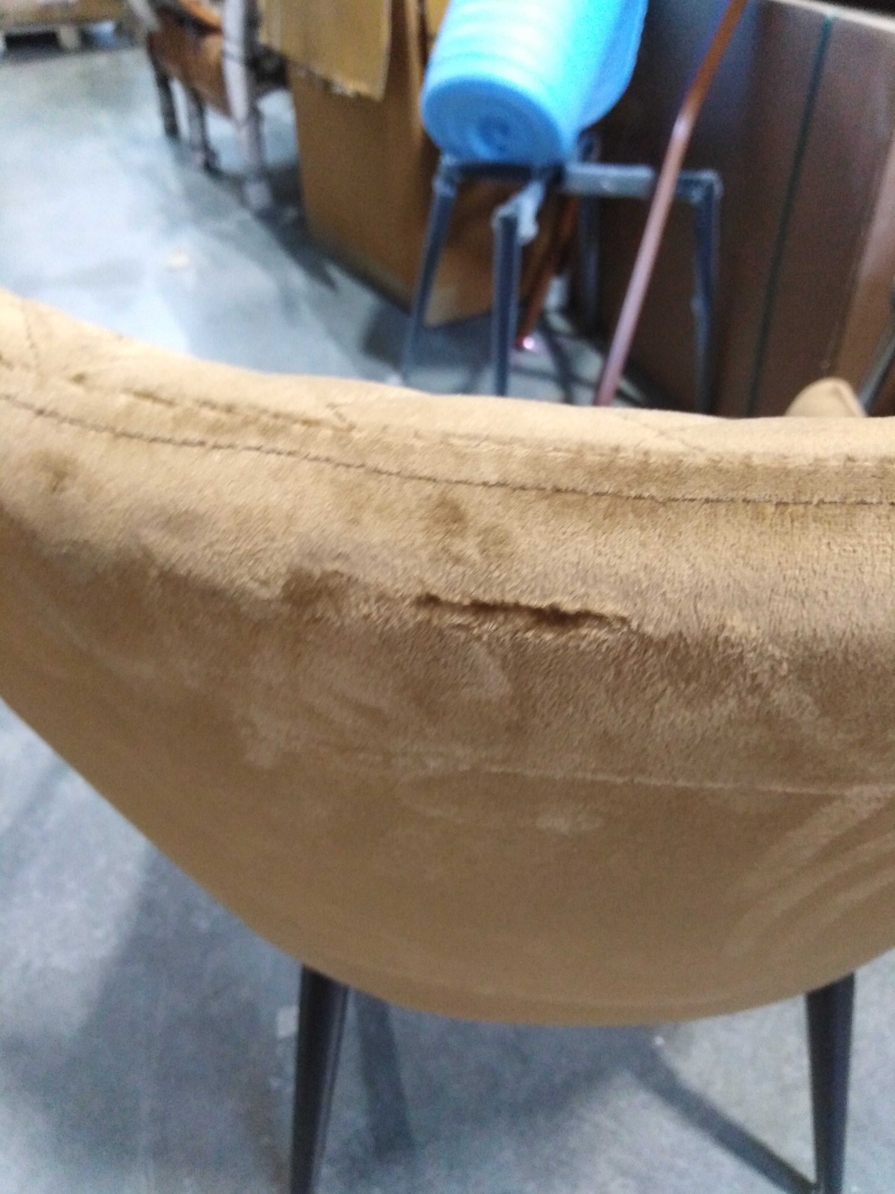 Описание дефекта: На спинках стульев сильные замятия , спинки имеют деформацию (нарушение структуры материала)
