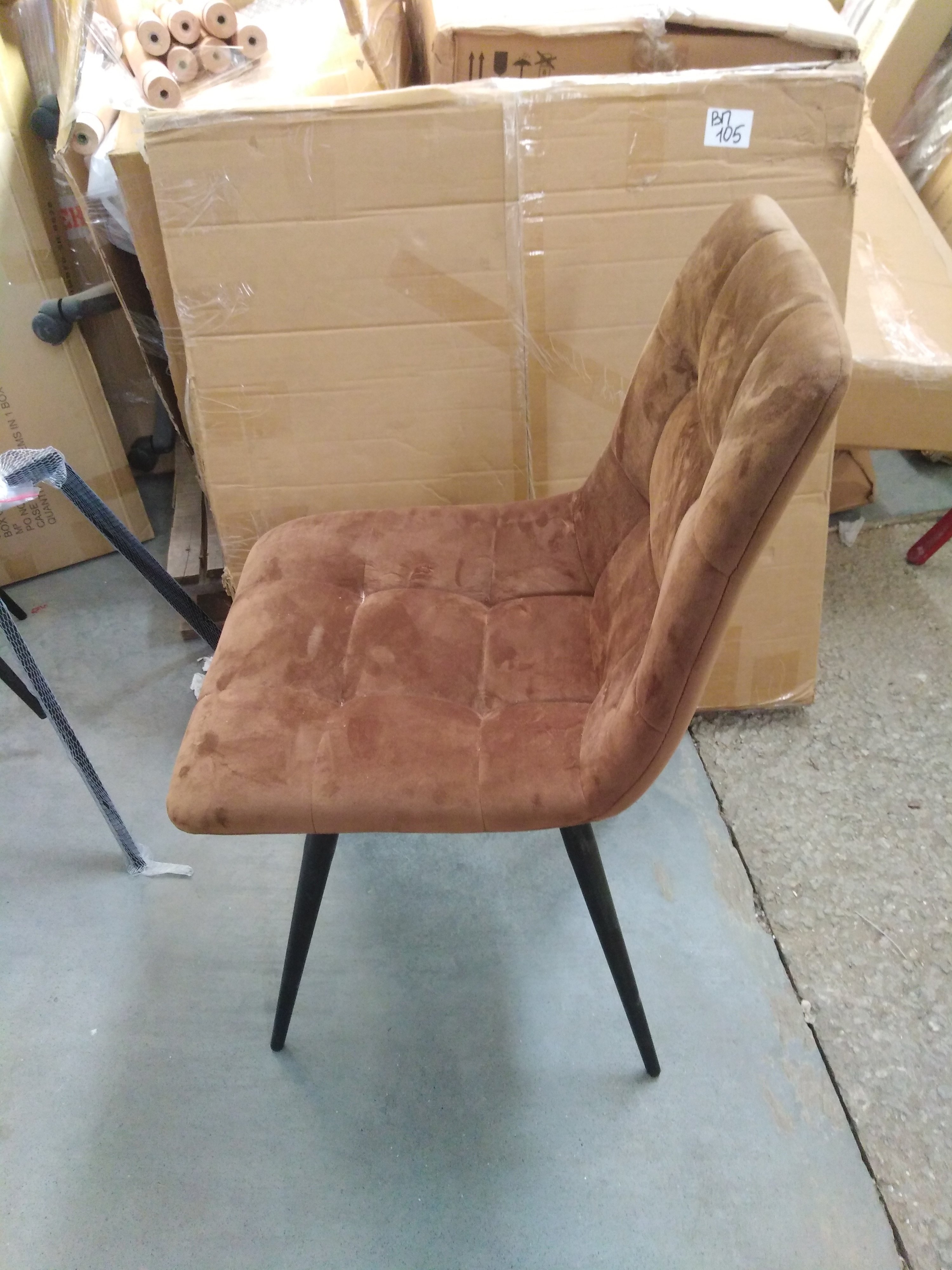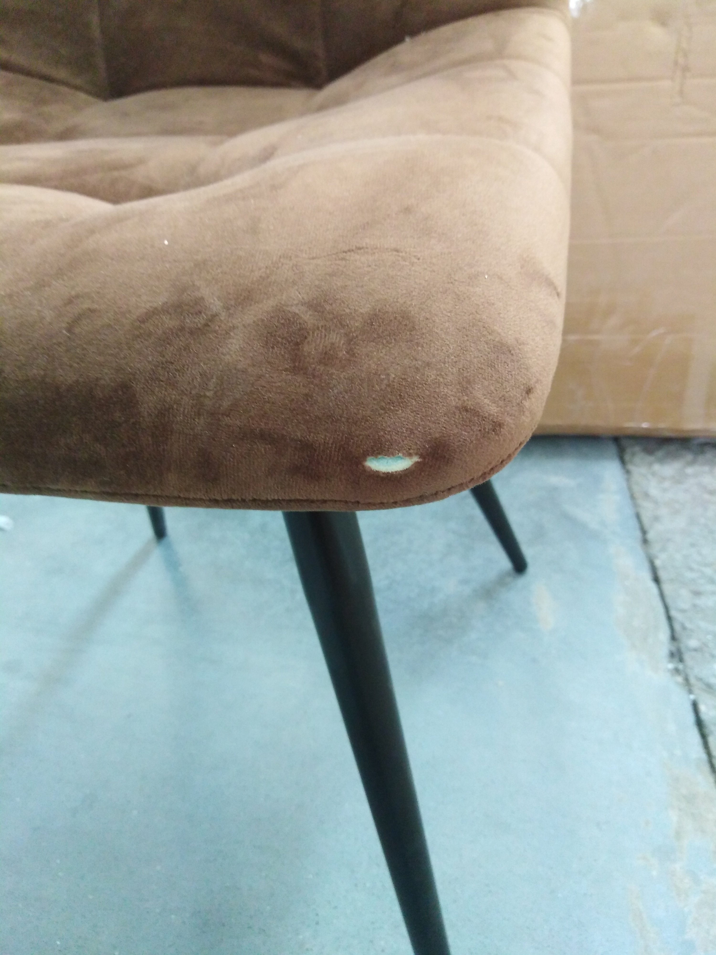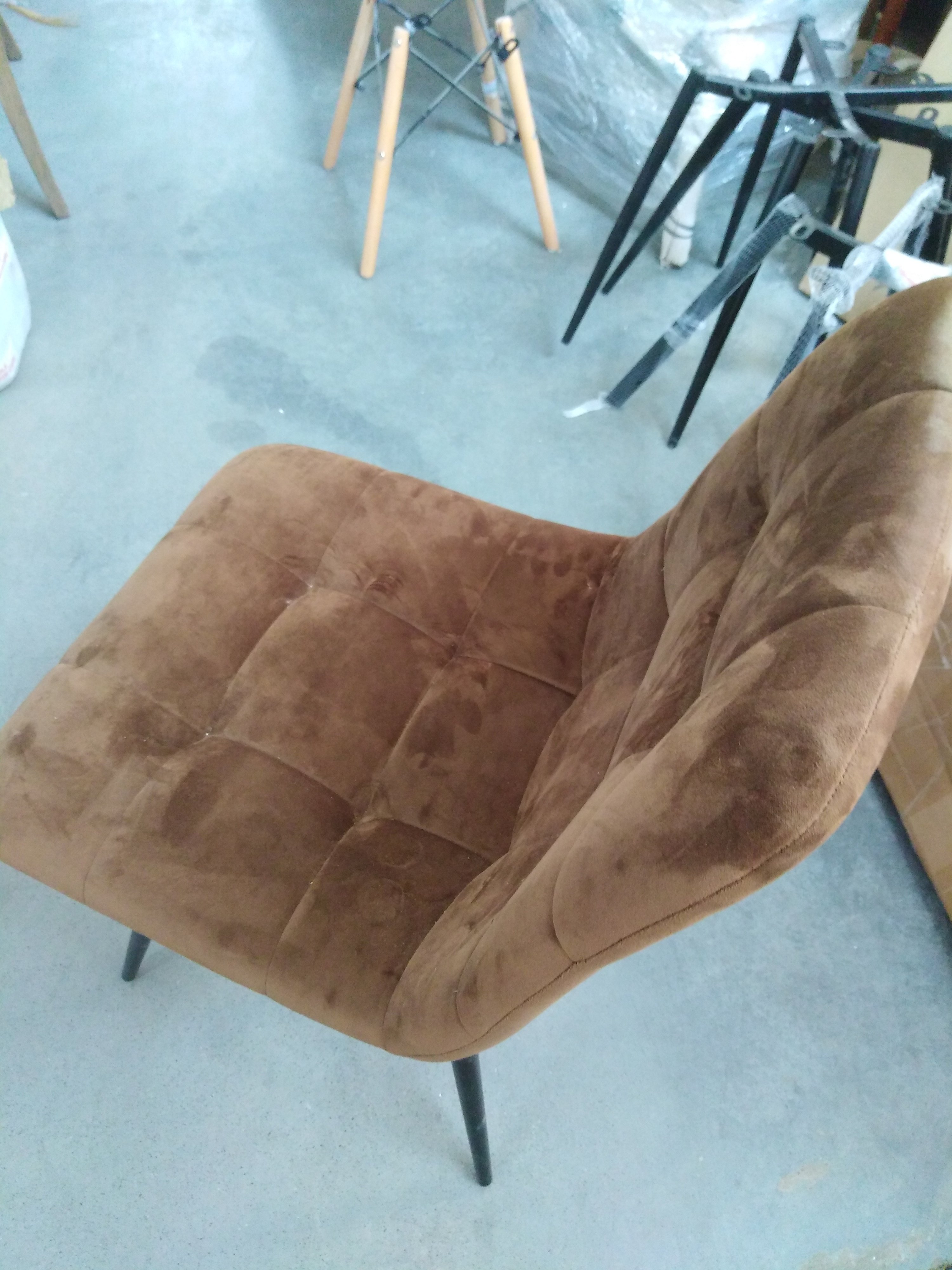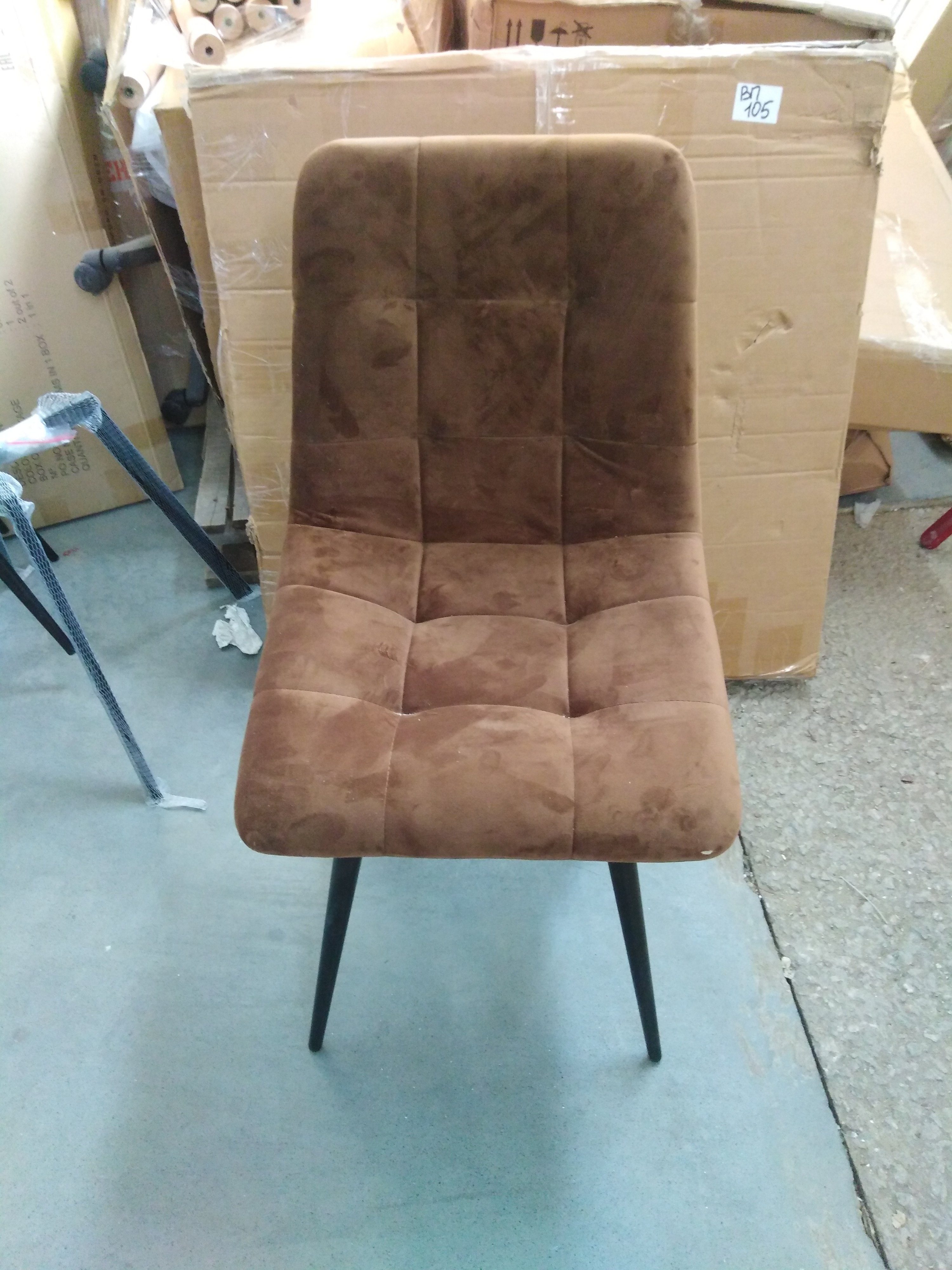 Описание товара без дефектов: Удобный и практичный дизайн стула CHILLY из коллекции Modern позволит ему вписаться практически в любой интерьер. Стул можно расположить в гостиной, кухне или столовой. Он хорошо подойдет для обстановки городской квартиры, загородного дома, кафе или ресторана. Тонкие металлические ножки с порошковым покрытием, стеганая тканевая обивка и лаконичные формы стула идеально соответствуют концепции современного стильного пространства. Мягкое сиденье и спинка позволяют комфортно расположиться на длительное время. Практичная тканевая обивка коричневого цвета отличается устойчивостью к износу и долговечностью, благодаря чему стул не требует специального ухода и будет долгое время радовать вас своим первоначальным видом. Монолитный каркас изделия выполнен из многослойного гнутоклееного шпона толщиной 10 мм. Наполнение - комбинация пенополиуретанов различной плотности.