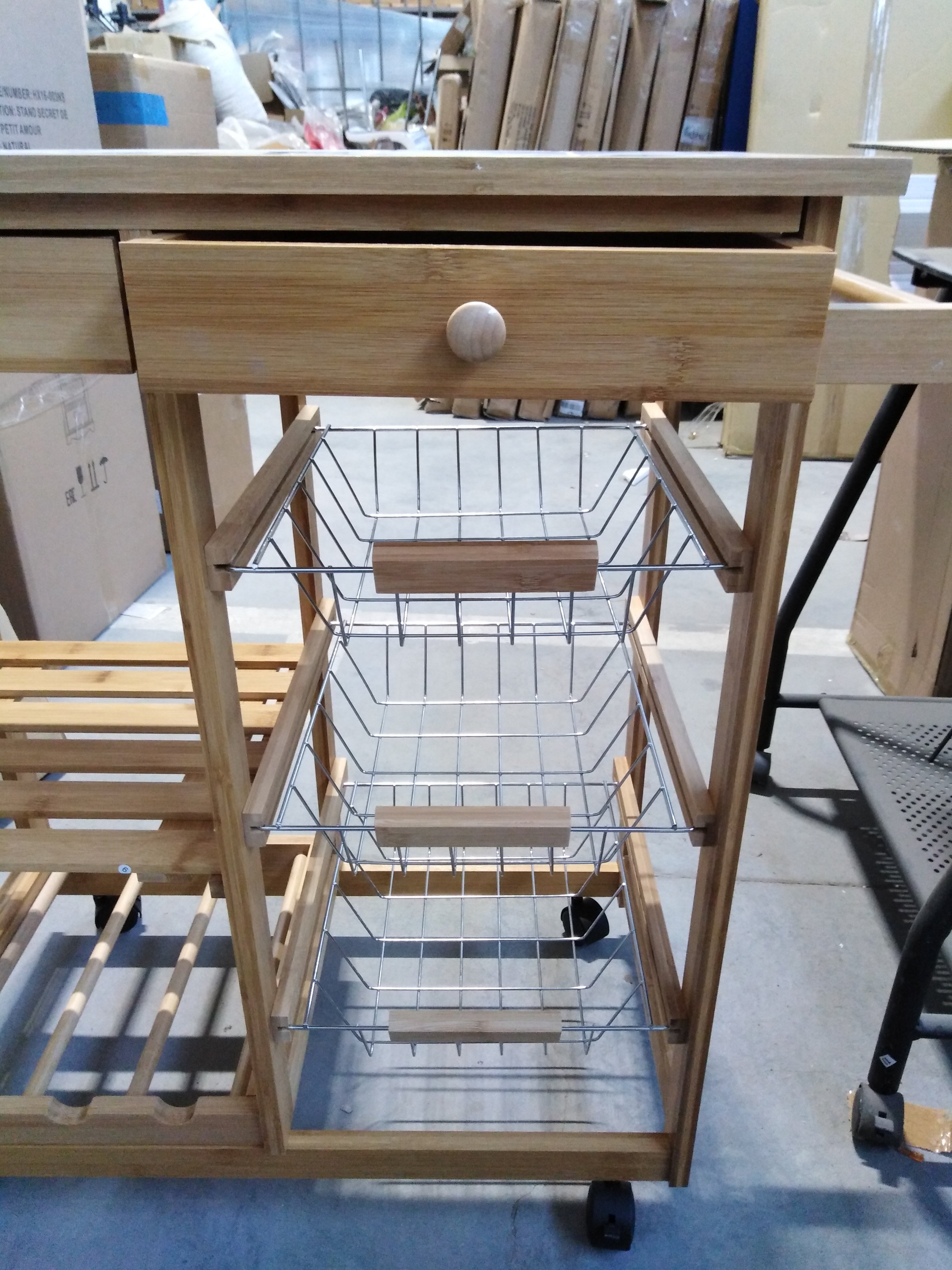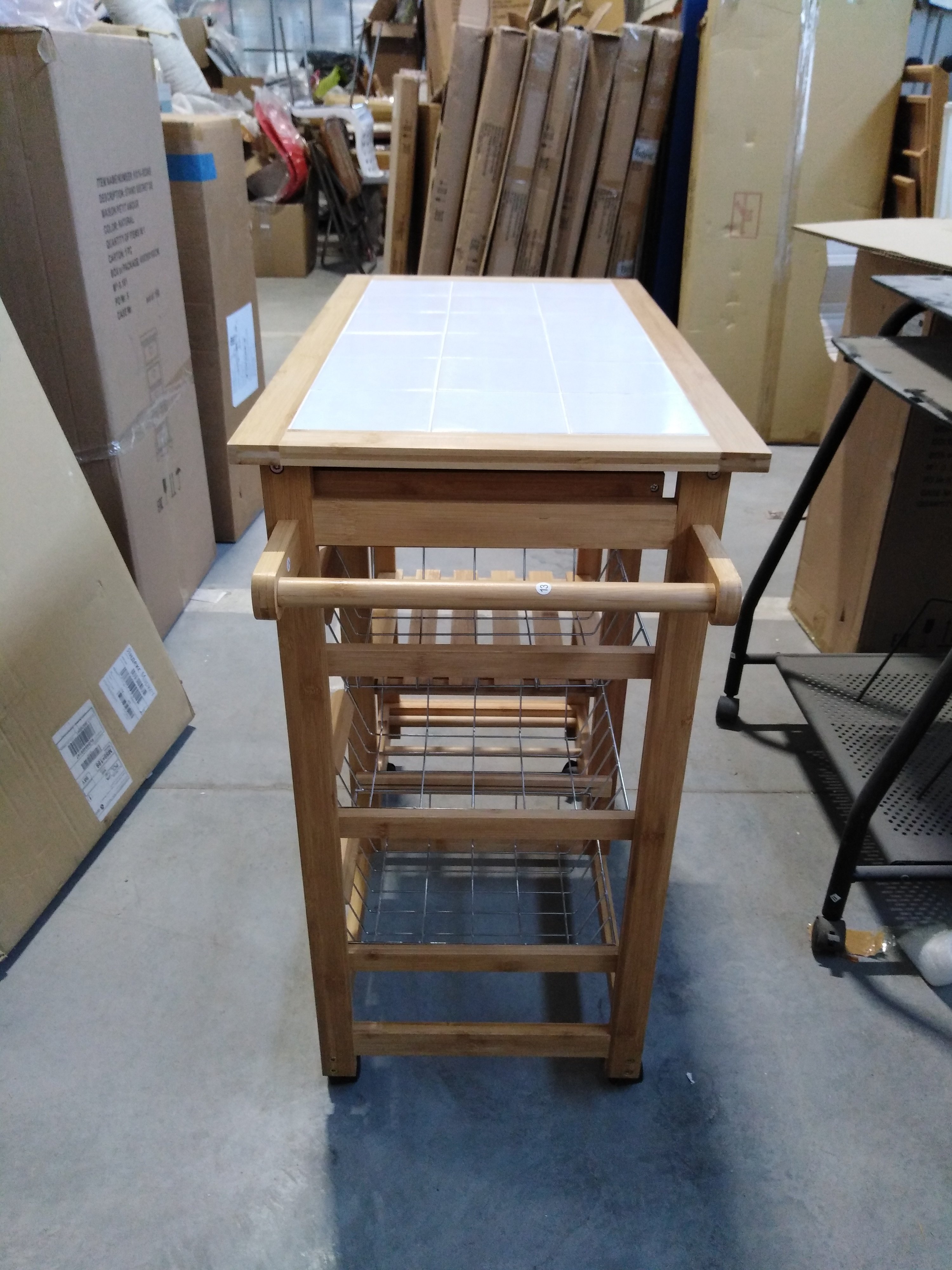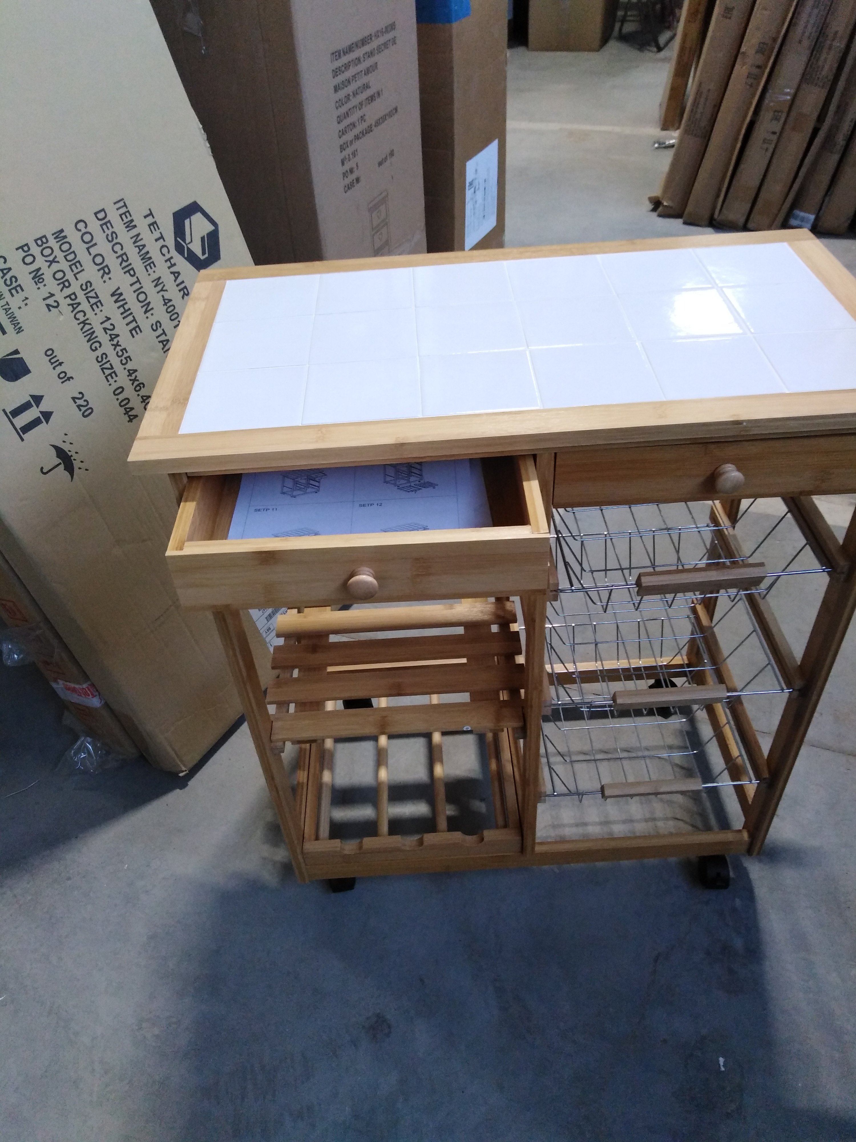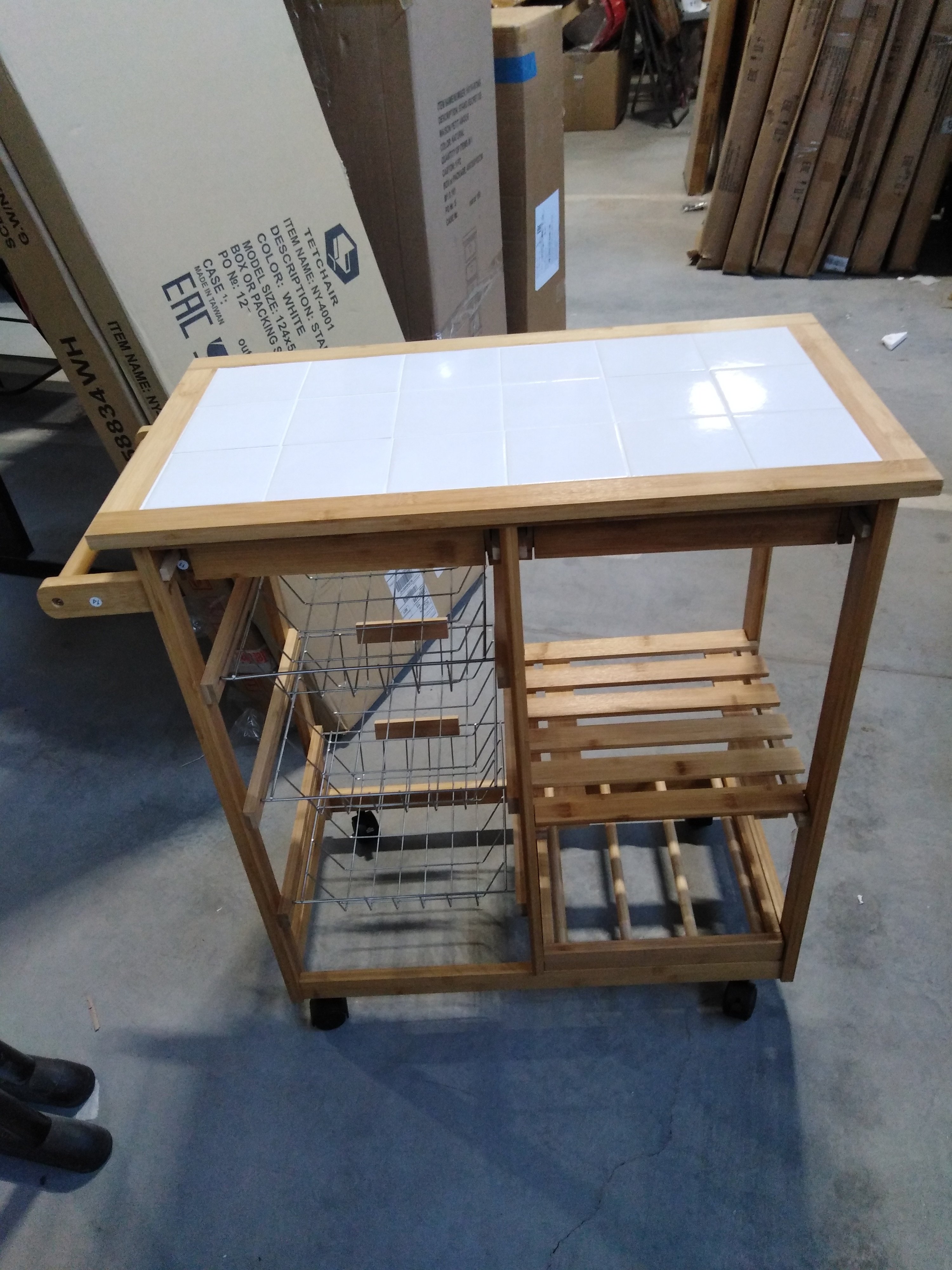 Описание товара без дефектов: Основание на колёсиках. 2 ящика. 3 металлические выдвижные полки. 1 деревянная полка. Полотенцесушитель. Материал: каркас - прессованный бамбук, столешница - плитка. Цвет: каркас - натуральный, столешница - белый. Размеры: 77х37х76 см