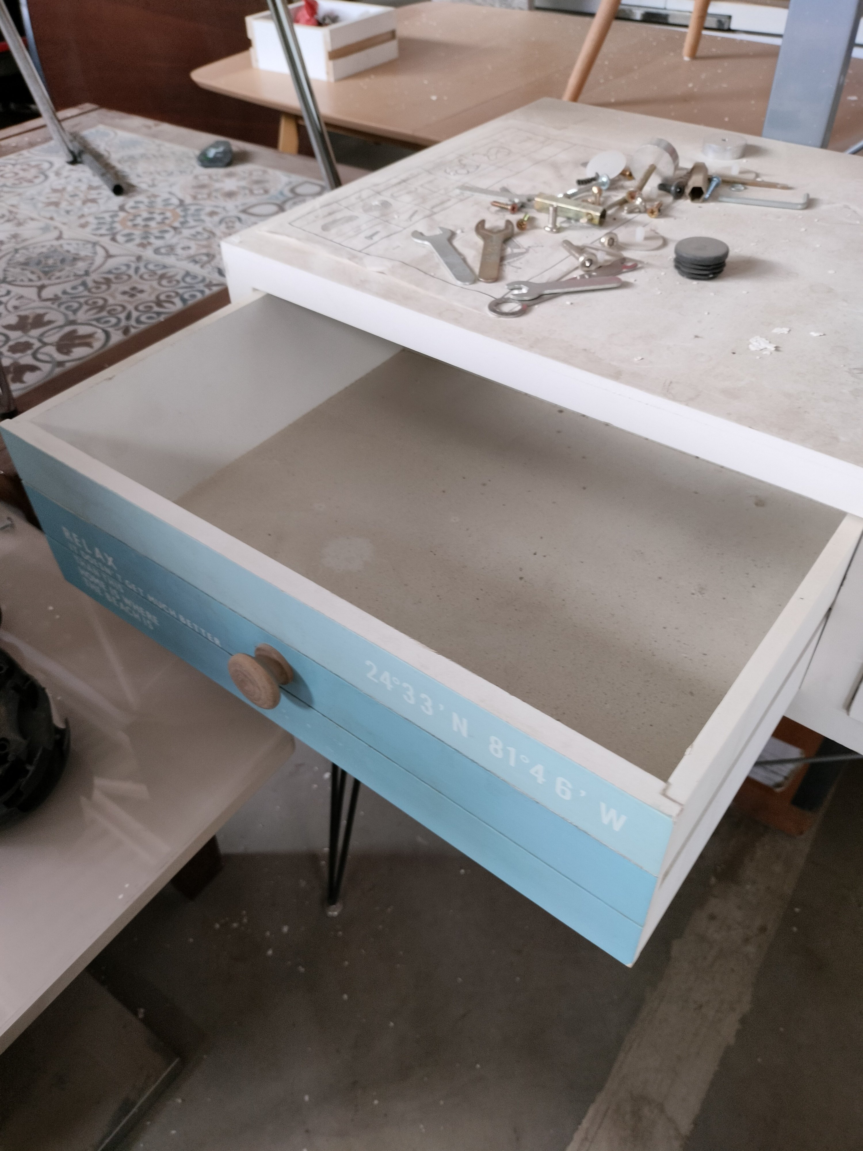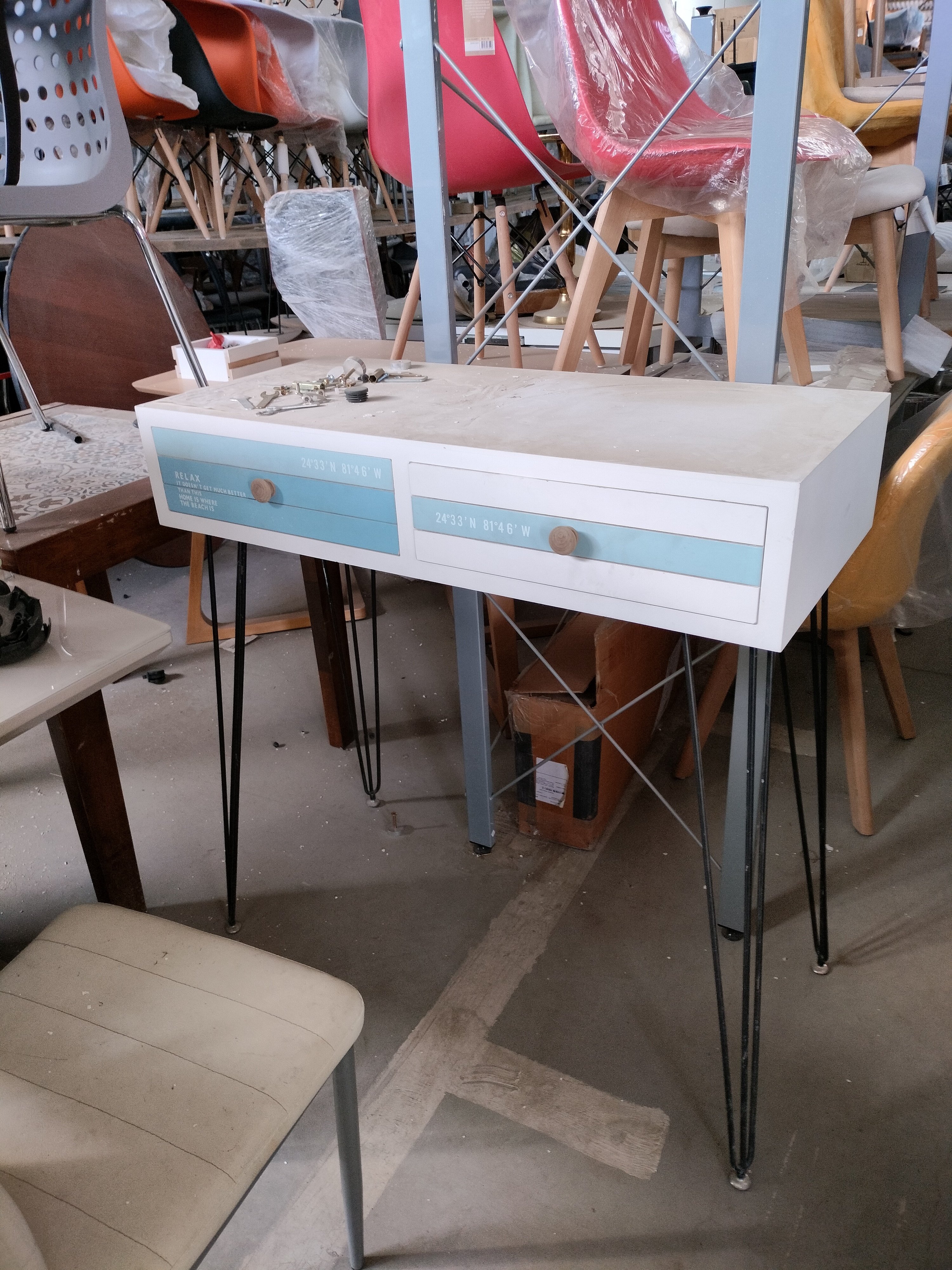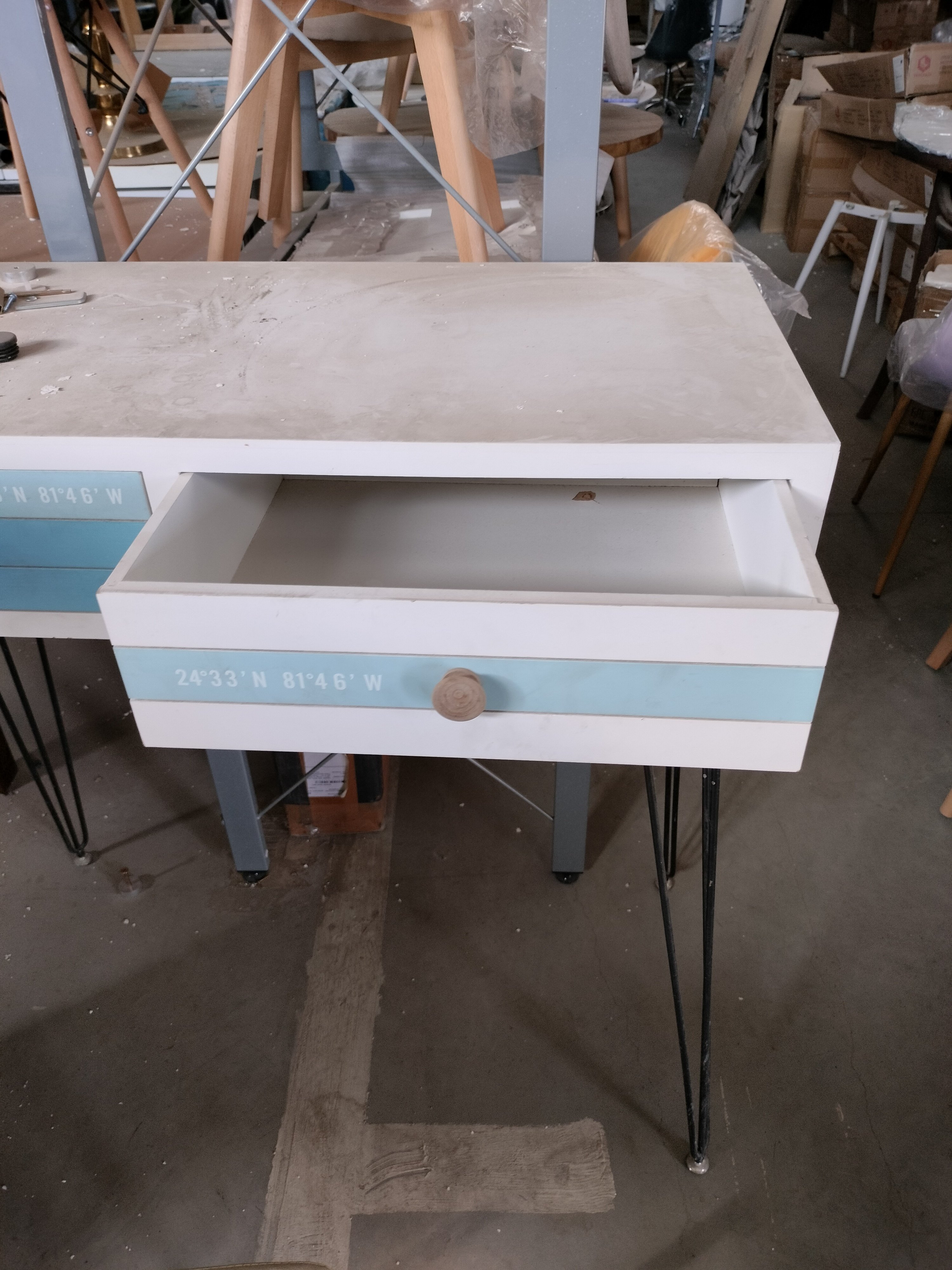 Описание товара без дефектов: Материал: ножки - металл, корпус - дерево павловния, МДФ. Цвет: ножки - чёрный, столешница - белый, голубой. Размер: 90х40х80 см