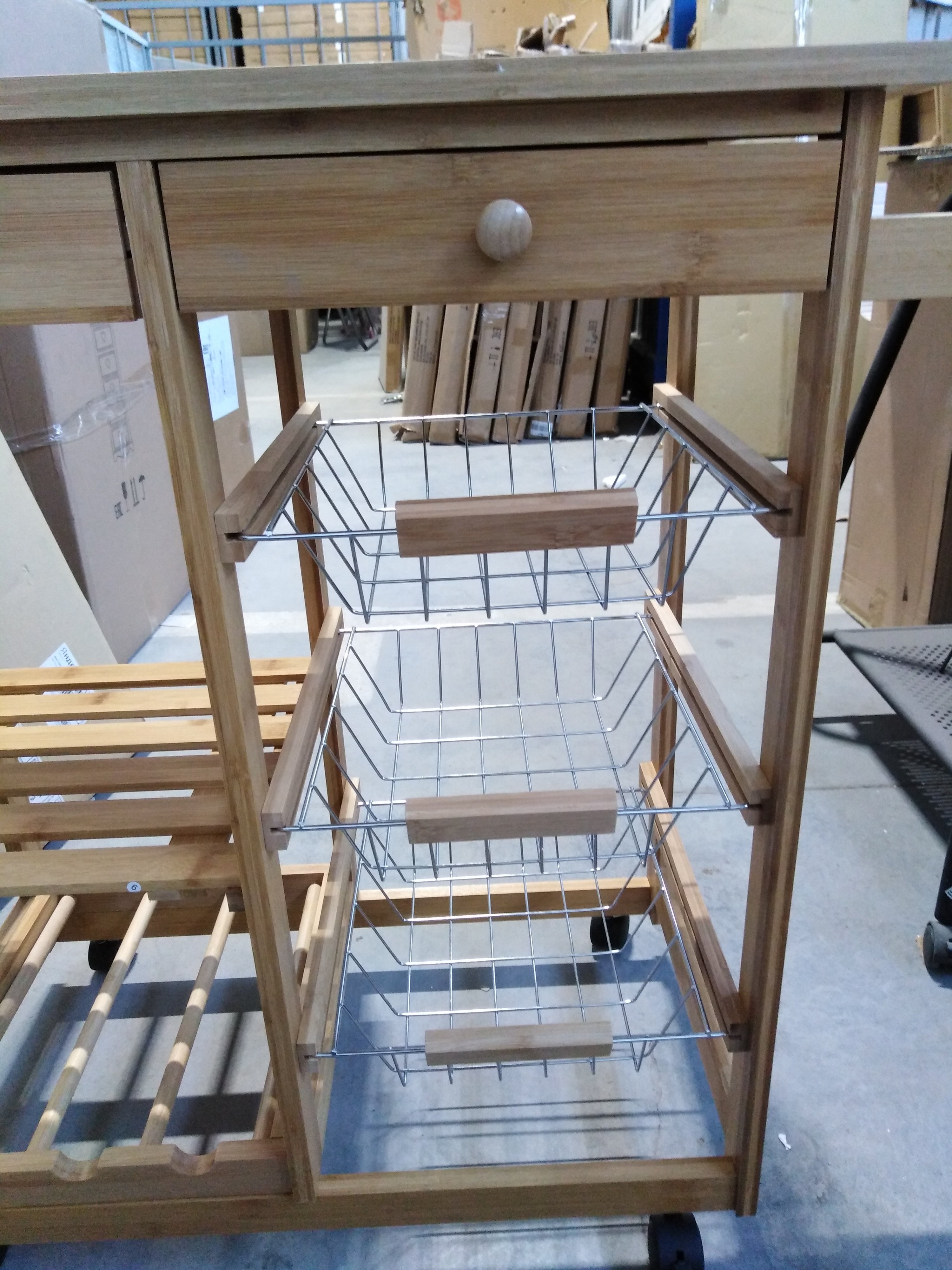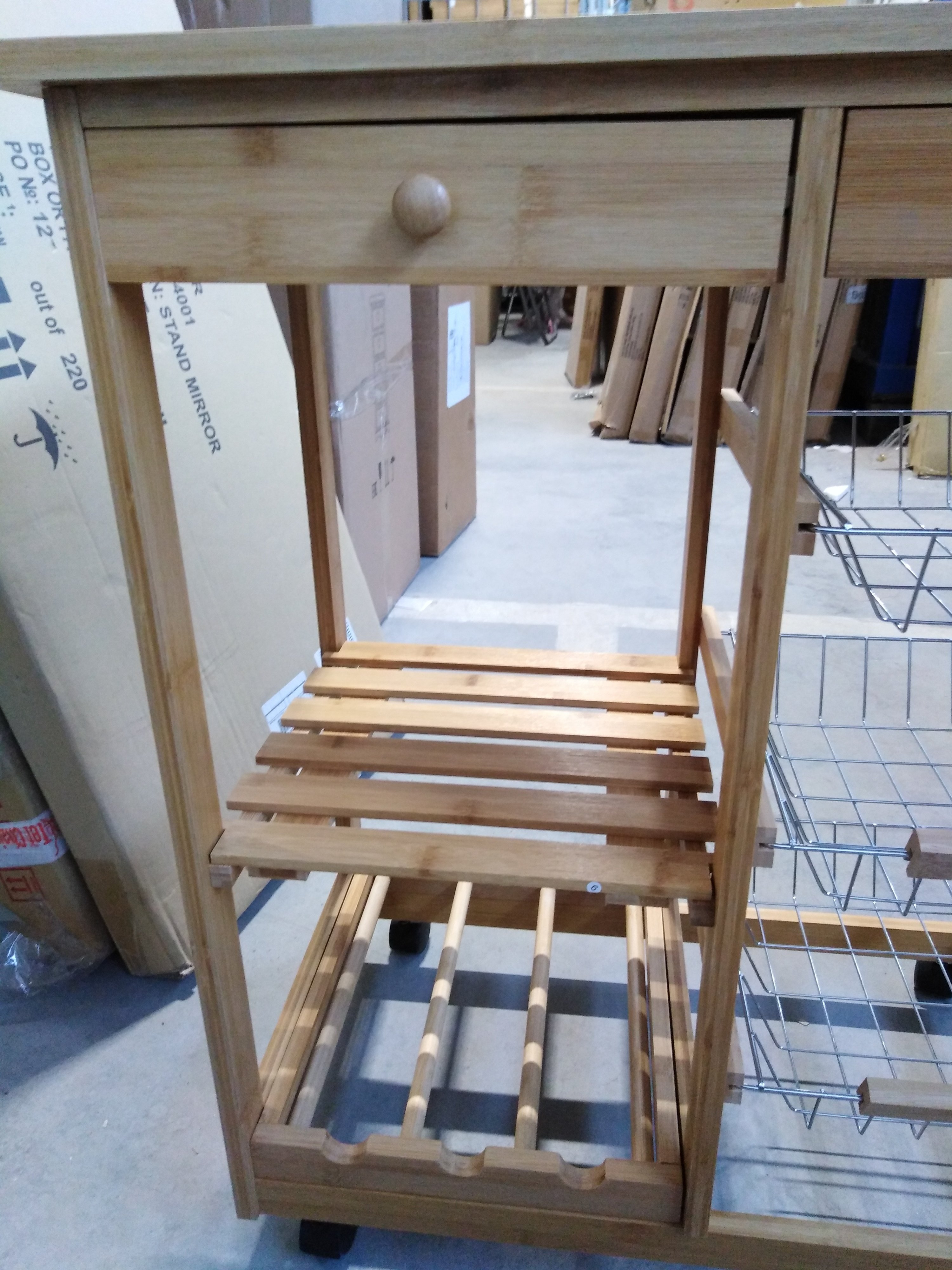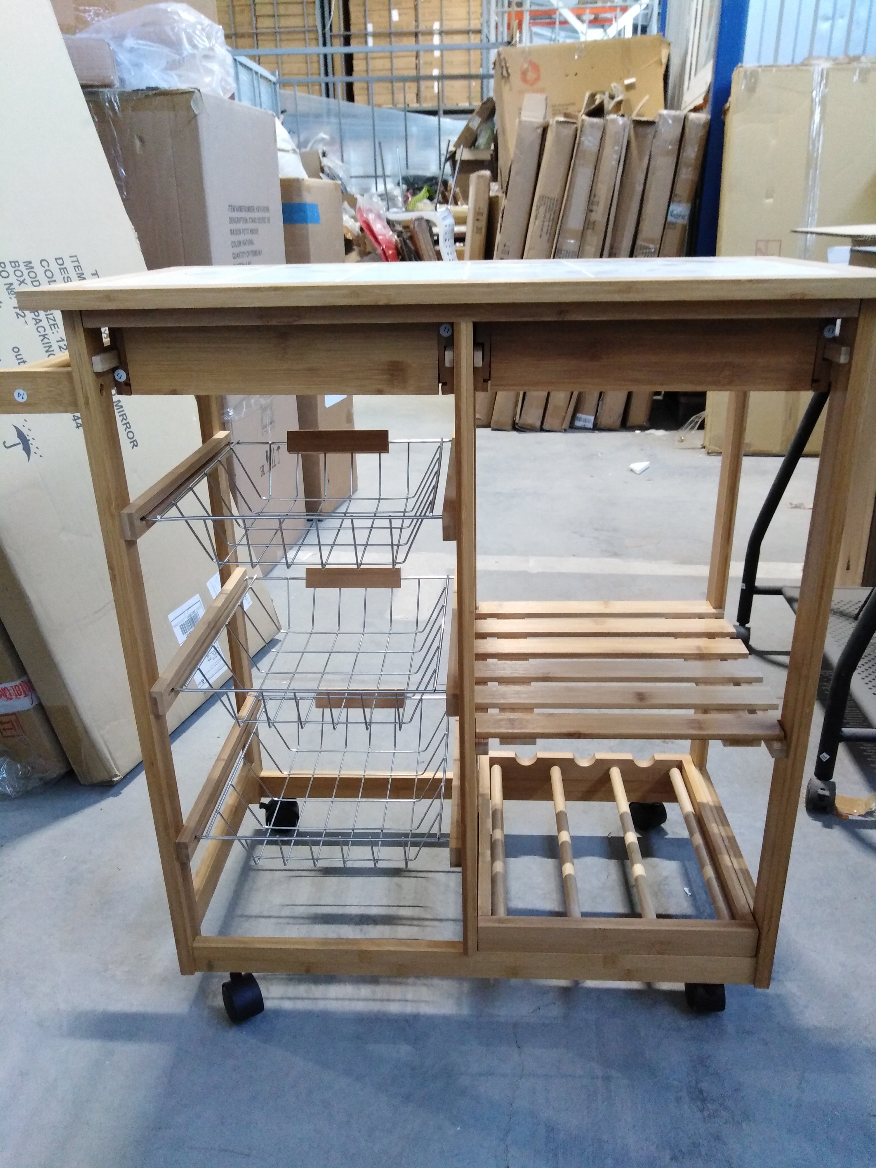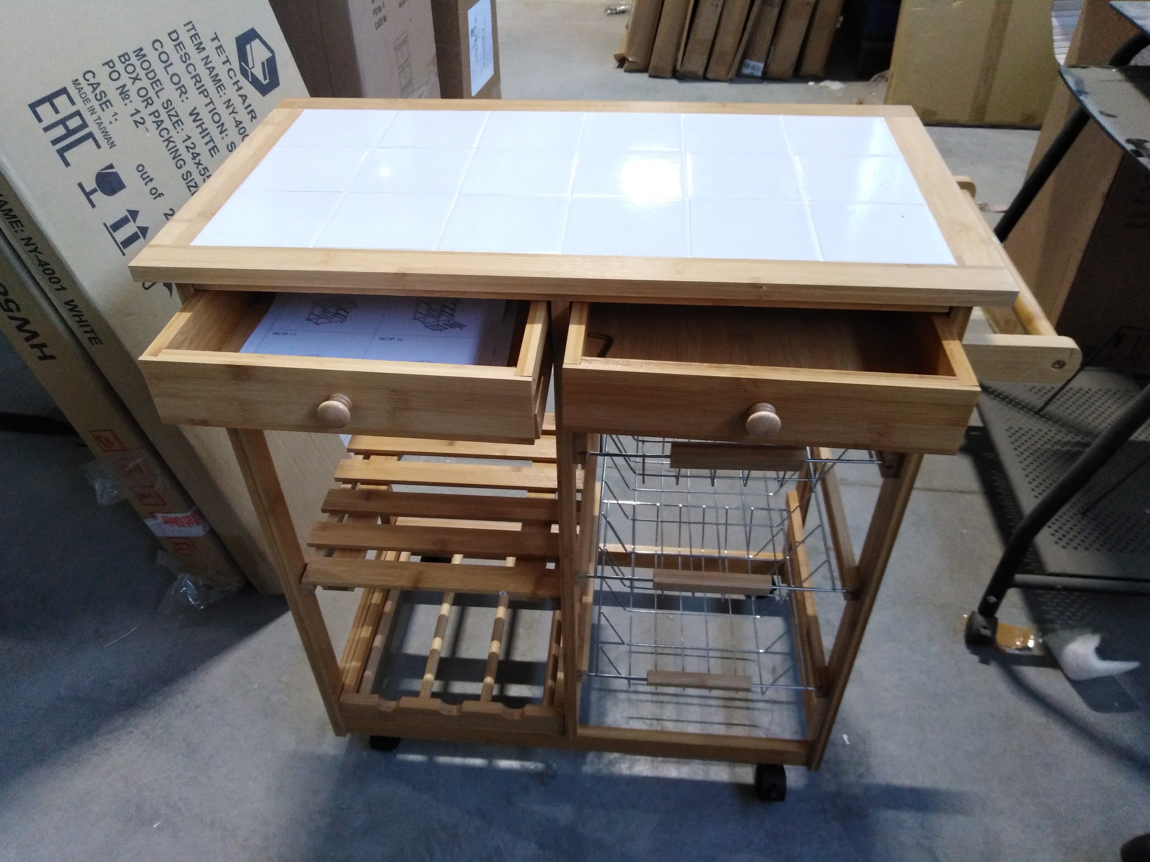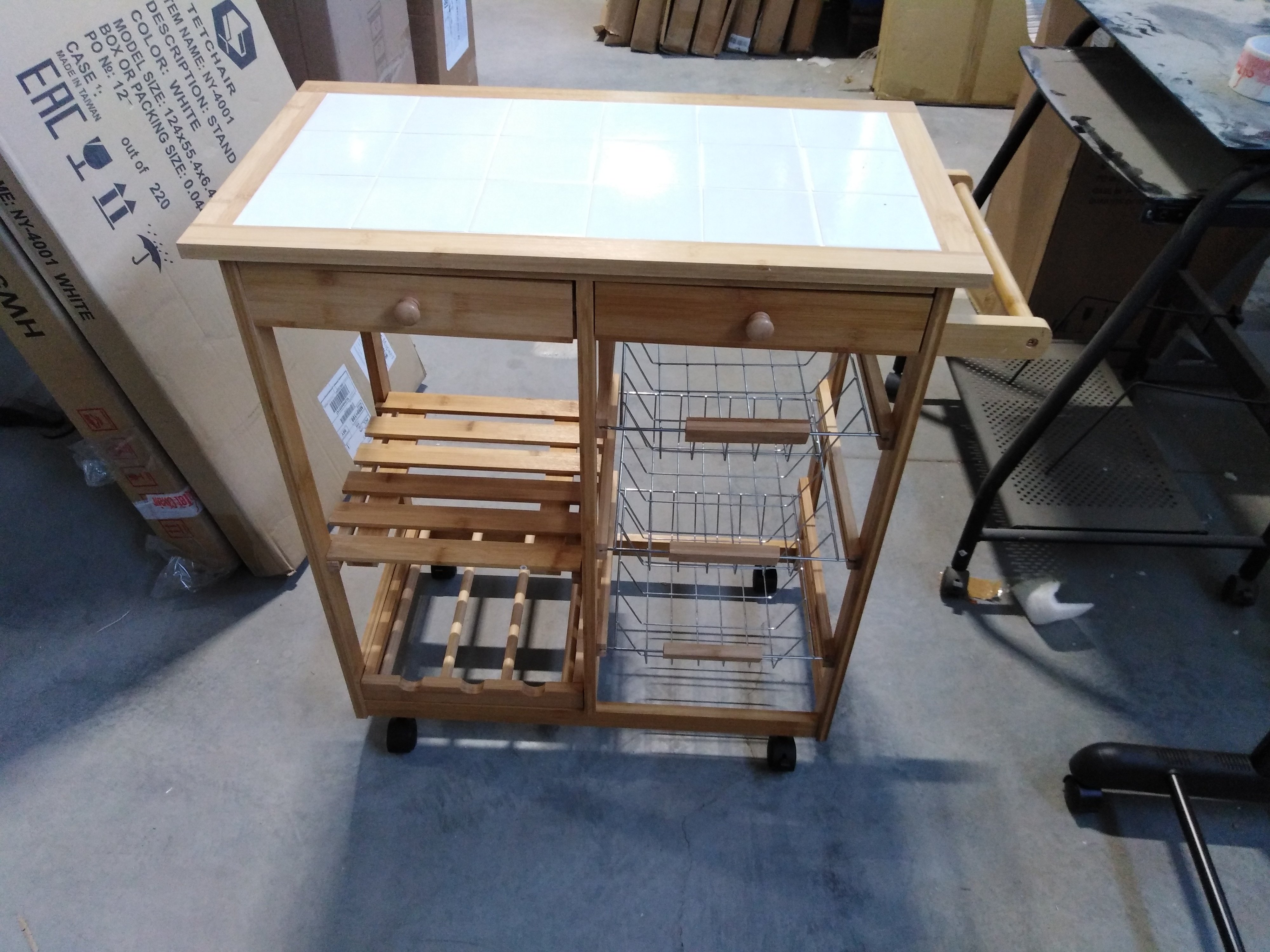Описание товара без дефектов: Коллекция «Экостиль» представляет легкие, прочные, изделия из натурального прессованного бамбука, с красивой фактурой, полностью экологичные, не подверженные влаге, для кухни, ванной и жилых комнат. Столик передвижной кухонный разделочный на колесиках, столешница из плитки, с 2-мя ящиками и тремя металлическими выдвижными полками. Материал: прессованный бамбук, поставляется 1 шт. в 1 кор.; объем 0,05м3.