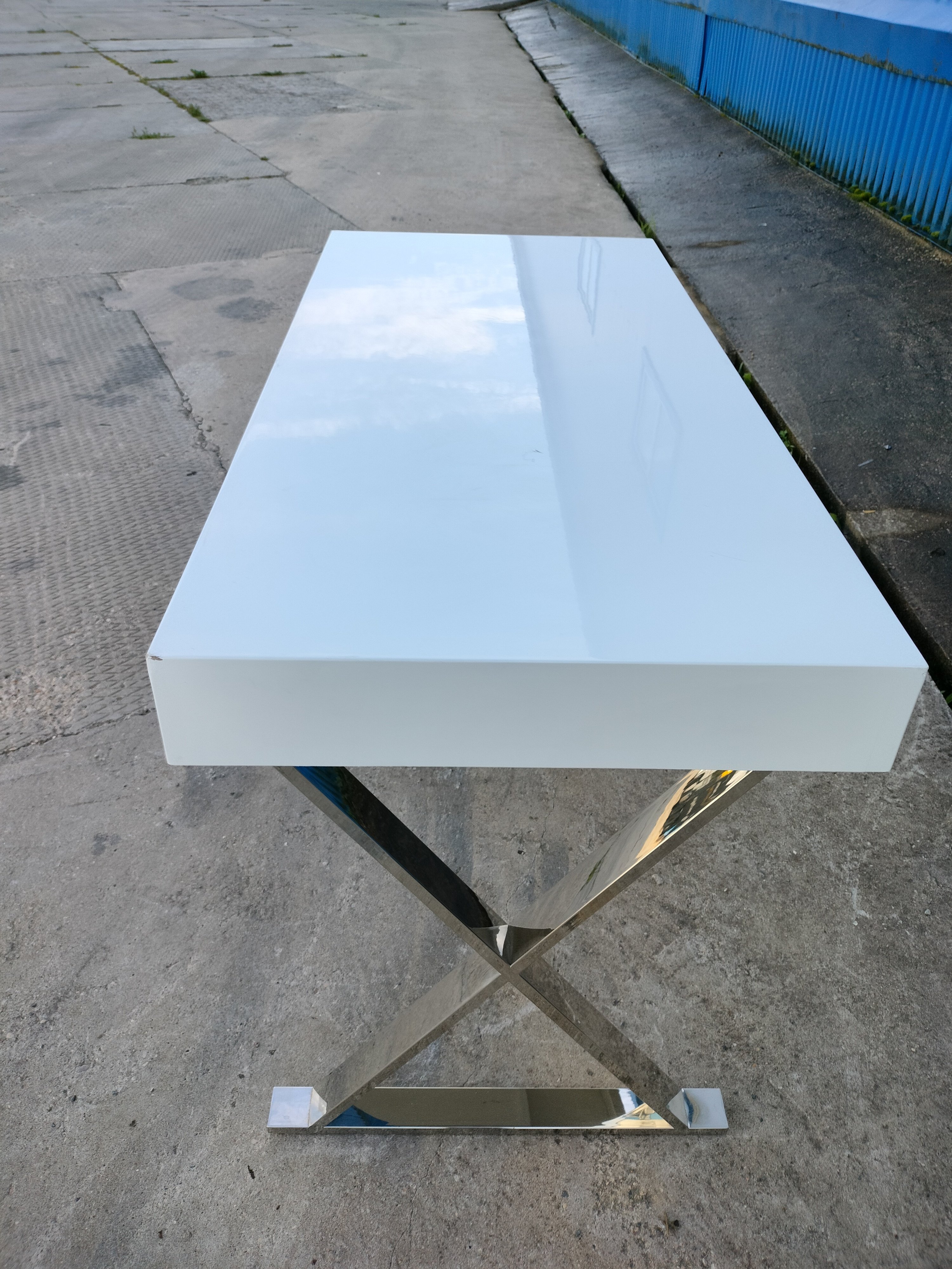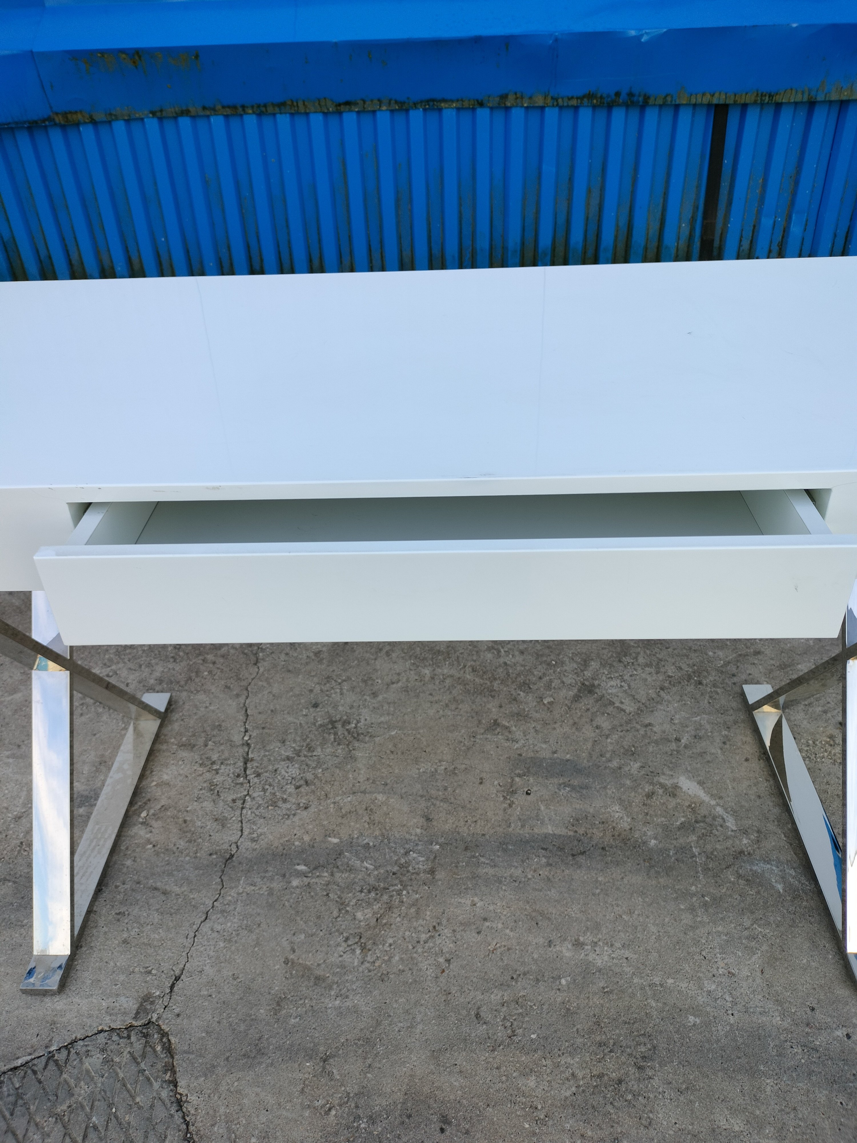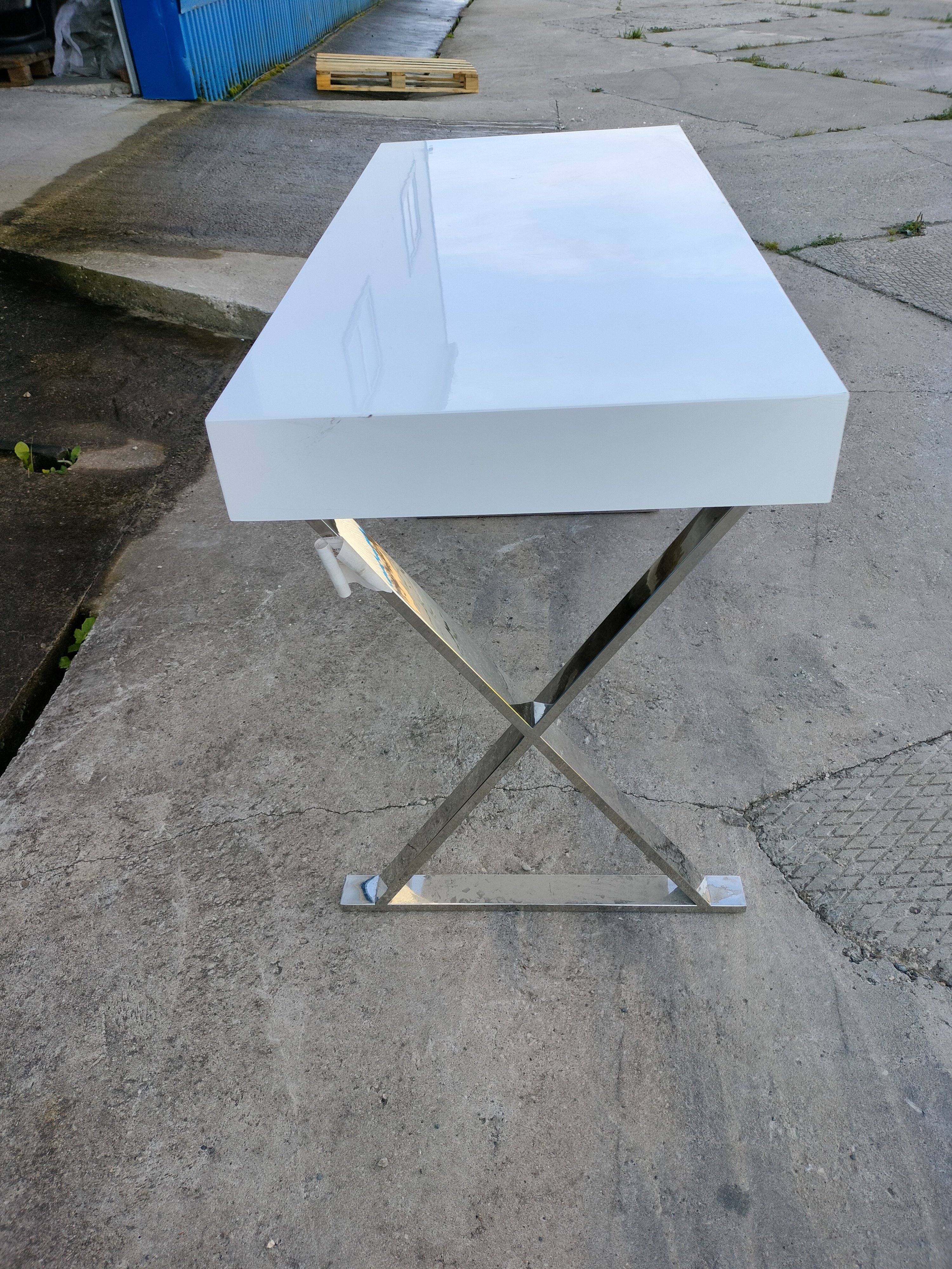 Описание товара без дефектов: Ящик с механизмом открывания PUSH ON (от нажатия). Материал: ножки - нержавеющая сталь, столешница и ящик - мдф high gloss. Цвет: ножки - хром, столешница и ящик - белый. Размеры: 120х55х75 см