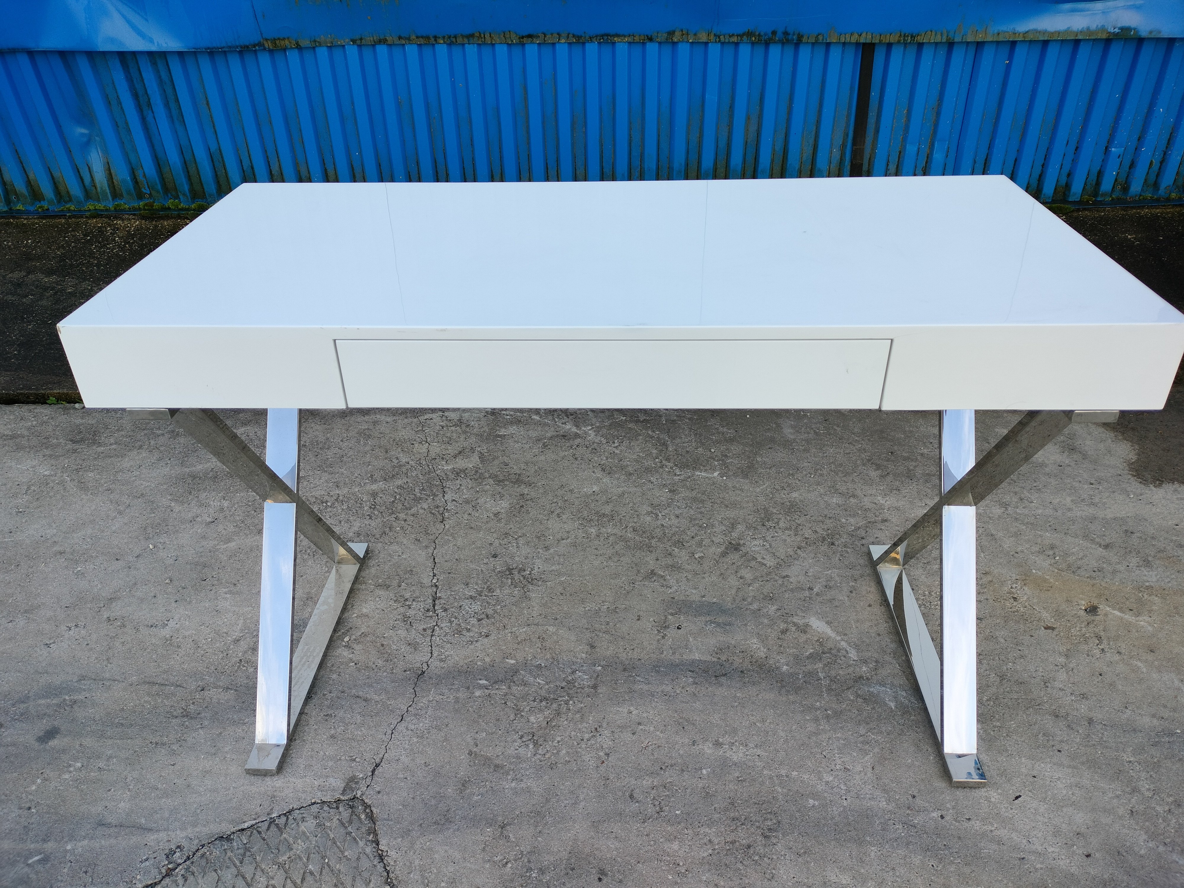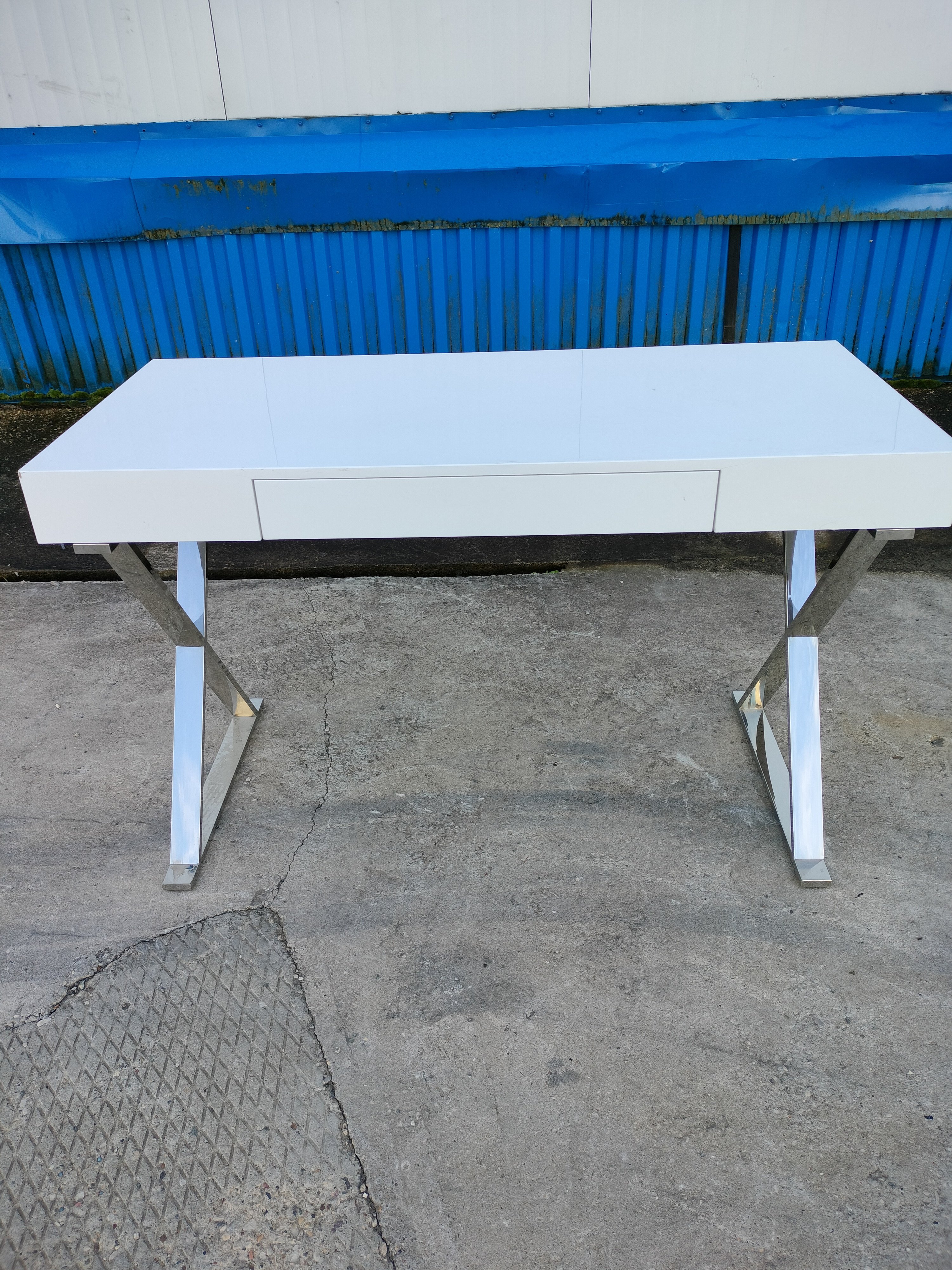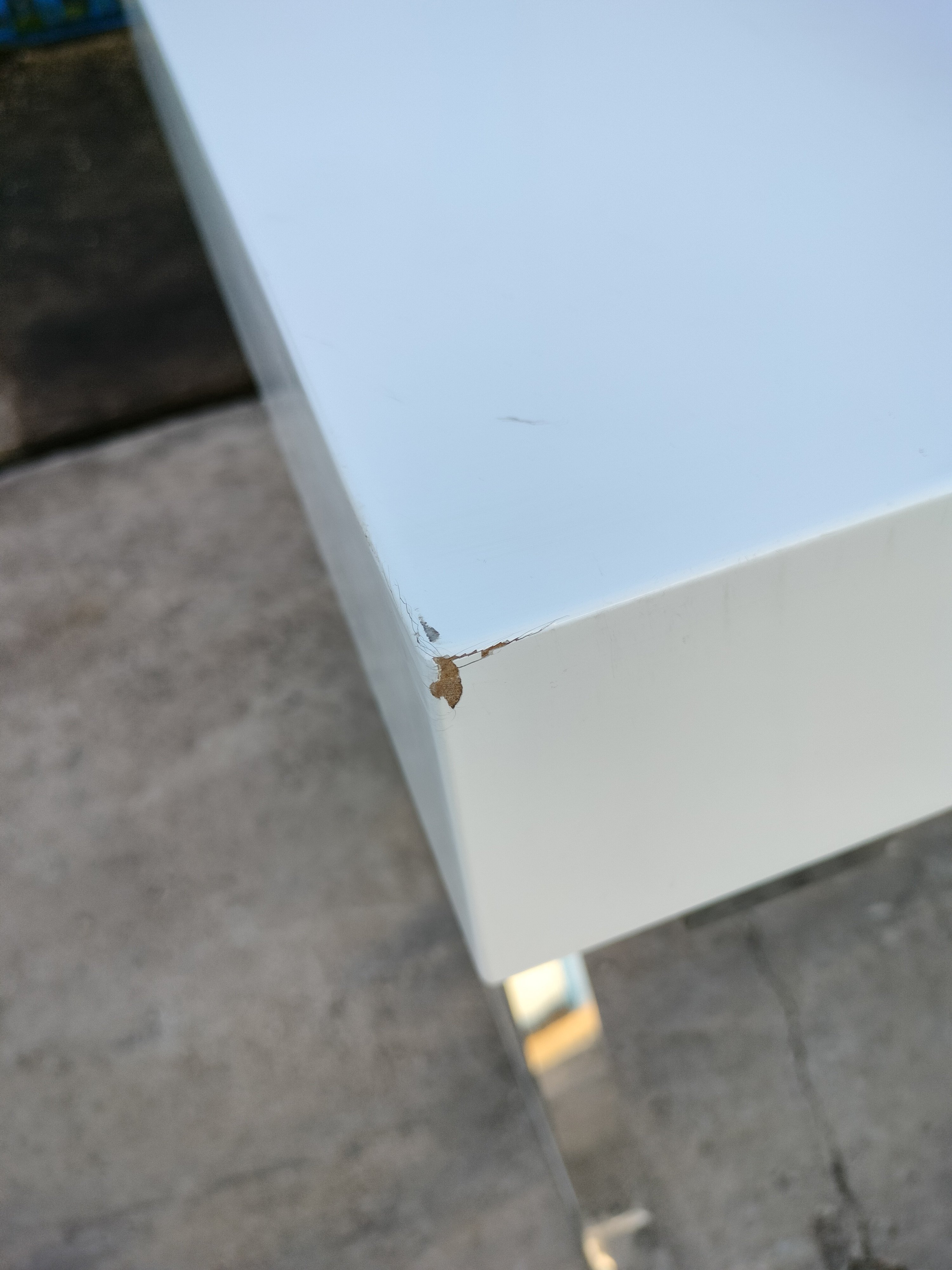 Описание товара без дефектов: Ящик с механизмом открывания PUSH ON (от нажатия). Материал: ножки - нержавеющая сталь, столешница и ящик - мдф high gloss. Цвет: ножки - хром, столешница и ящик - белый. Размеры: 120х55х75 см