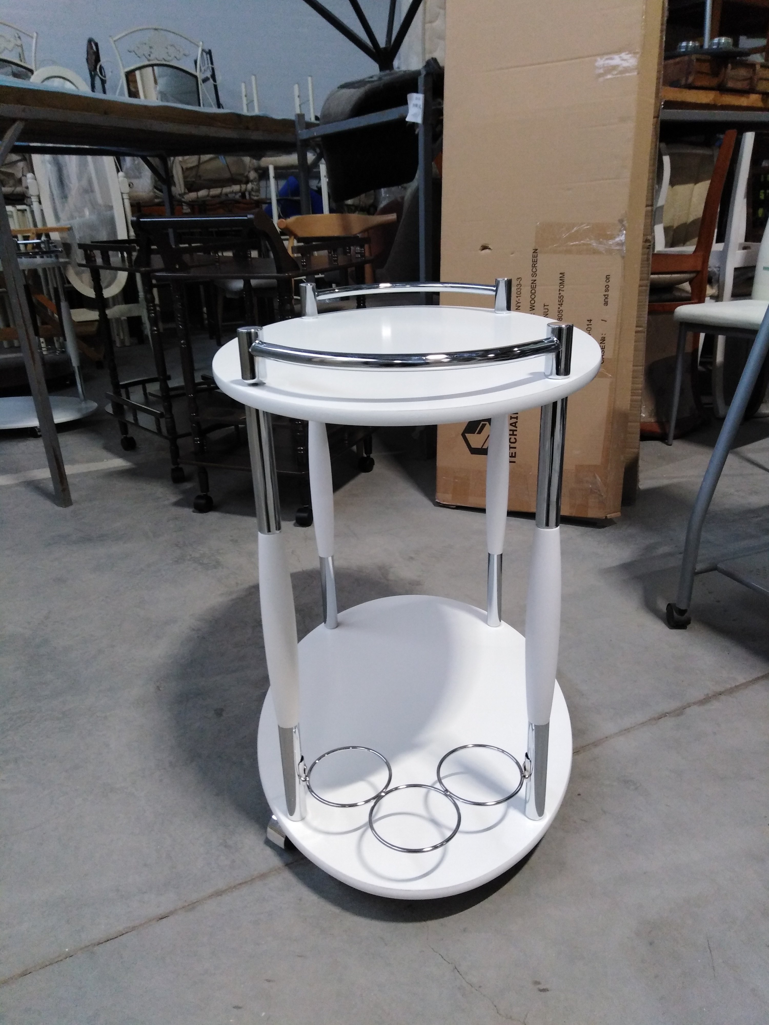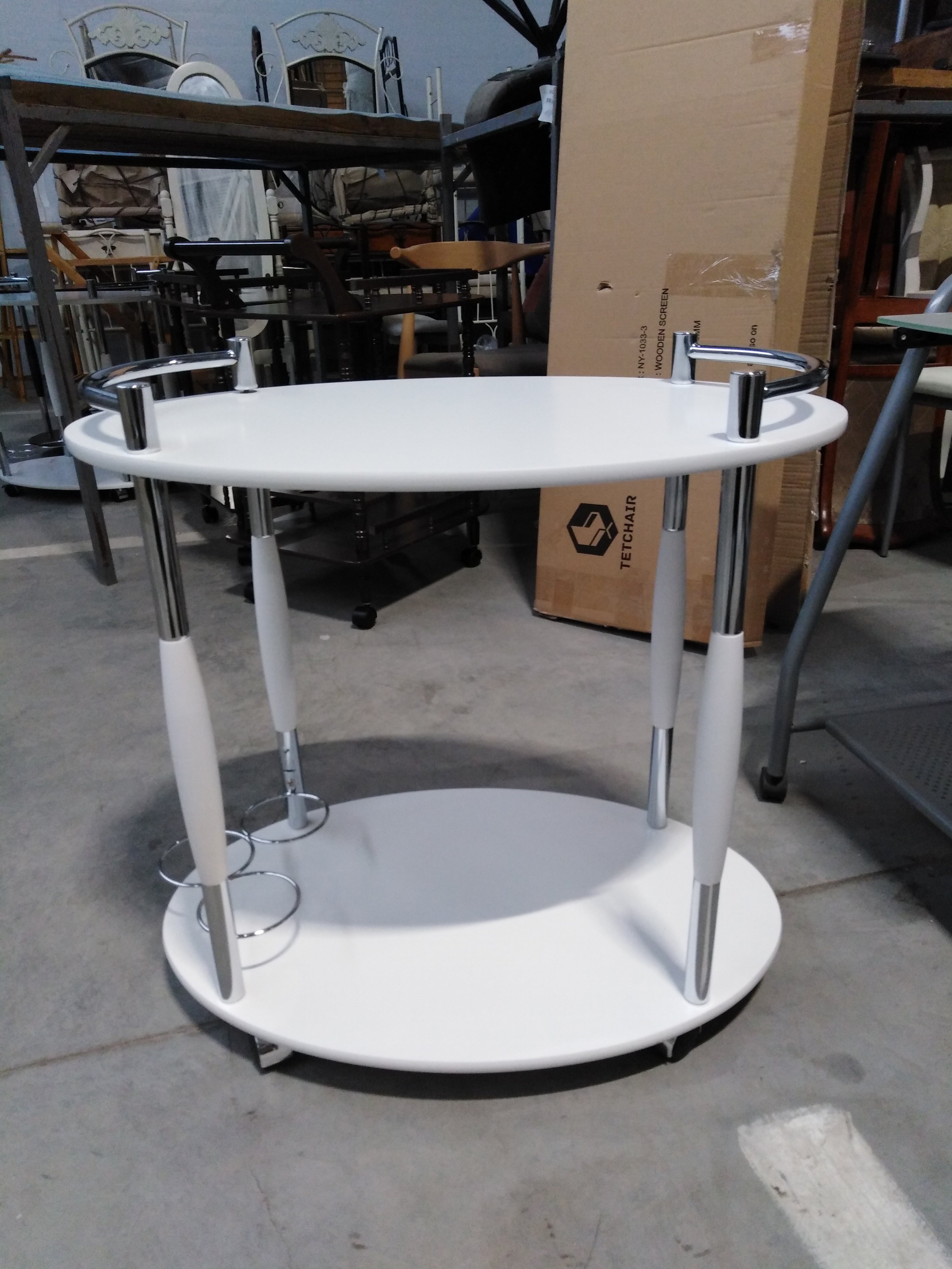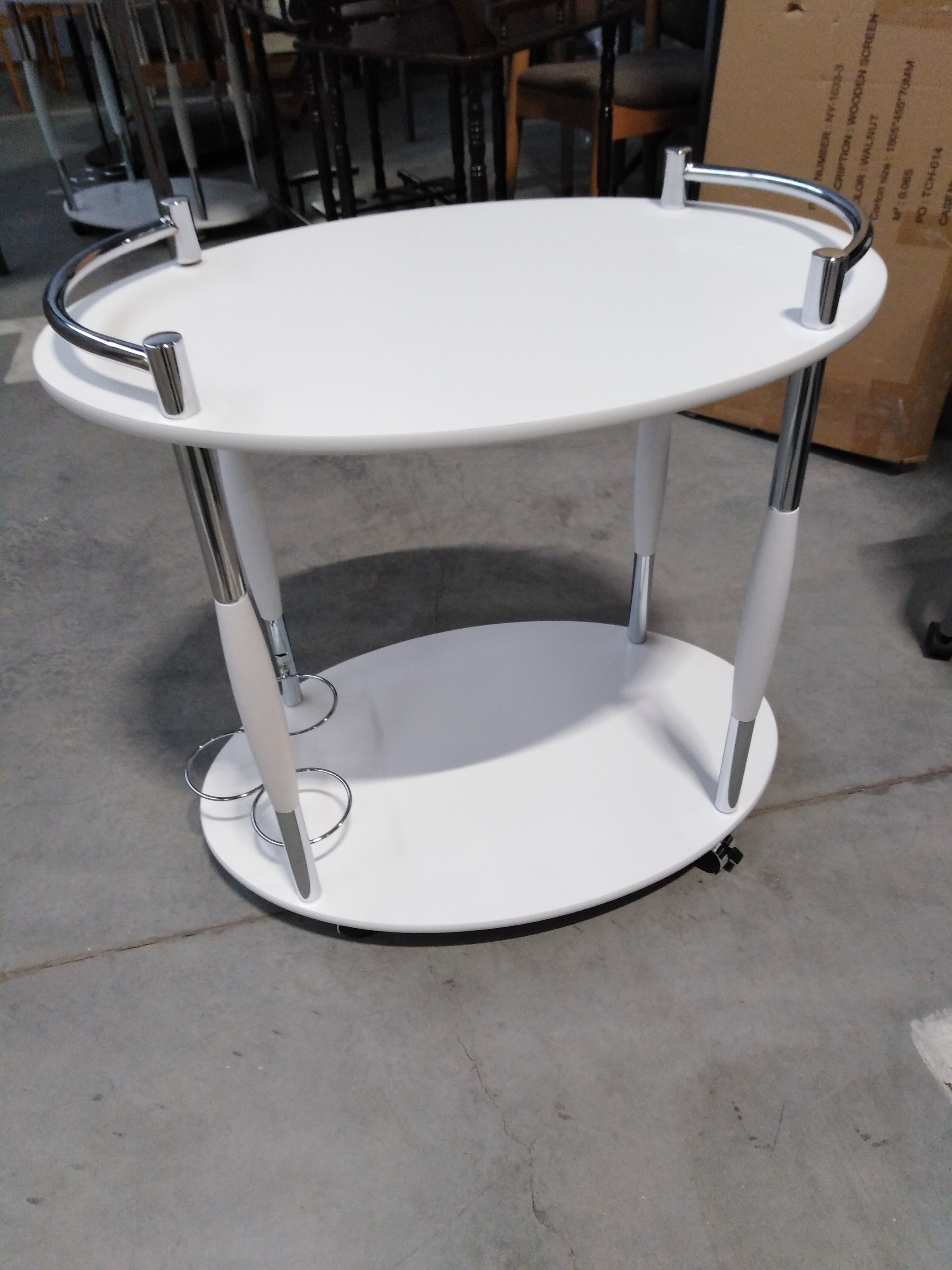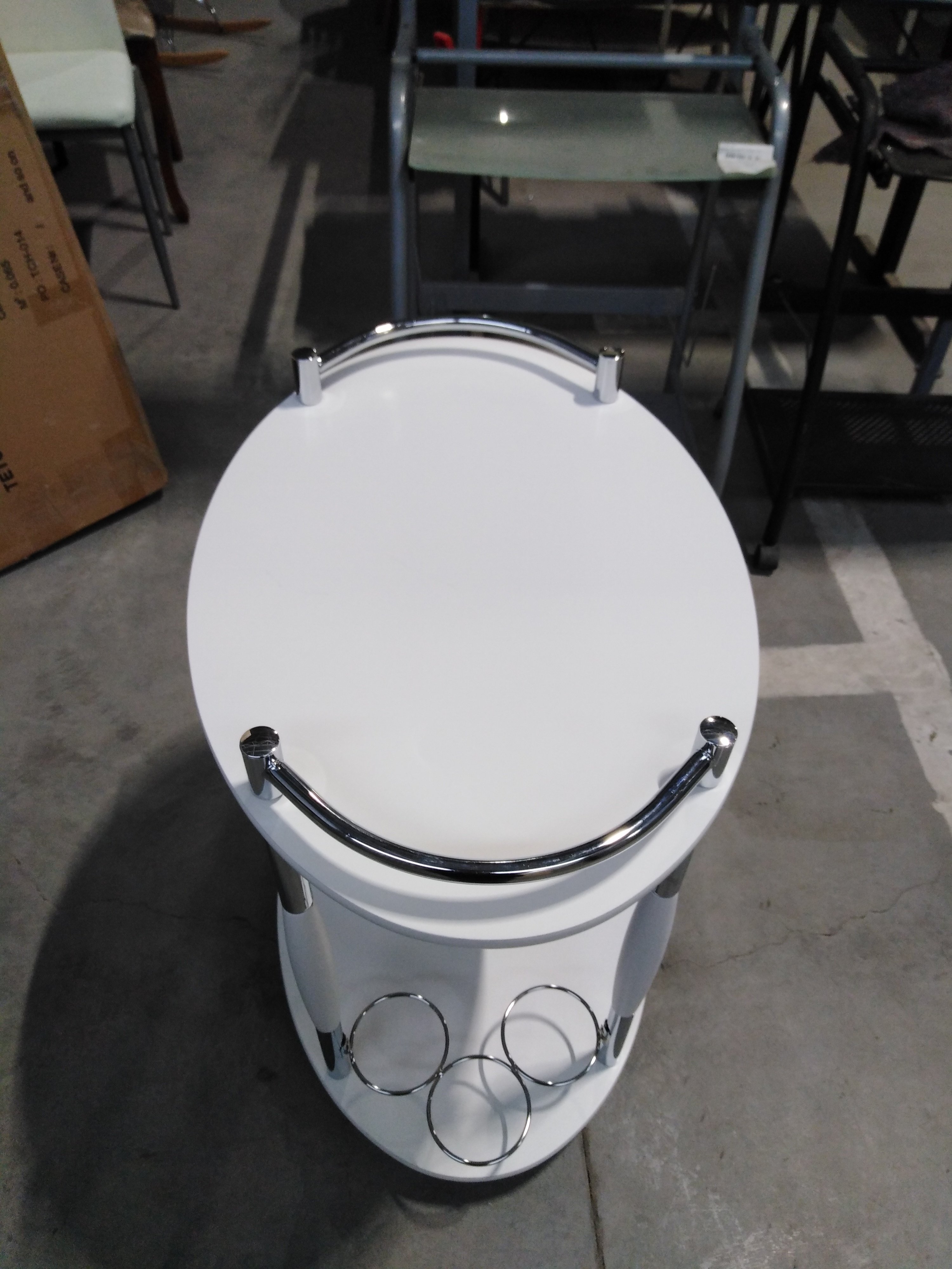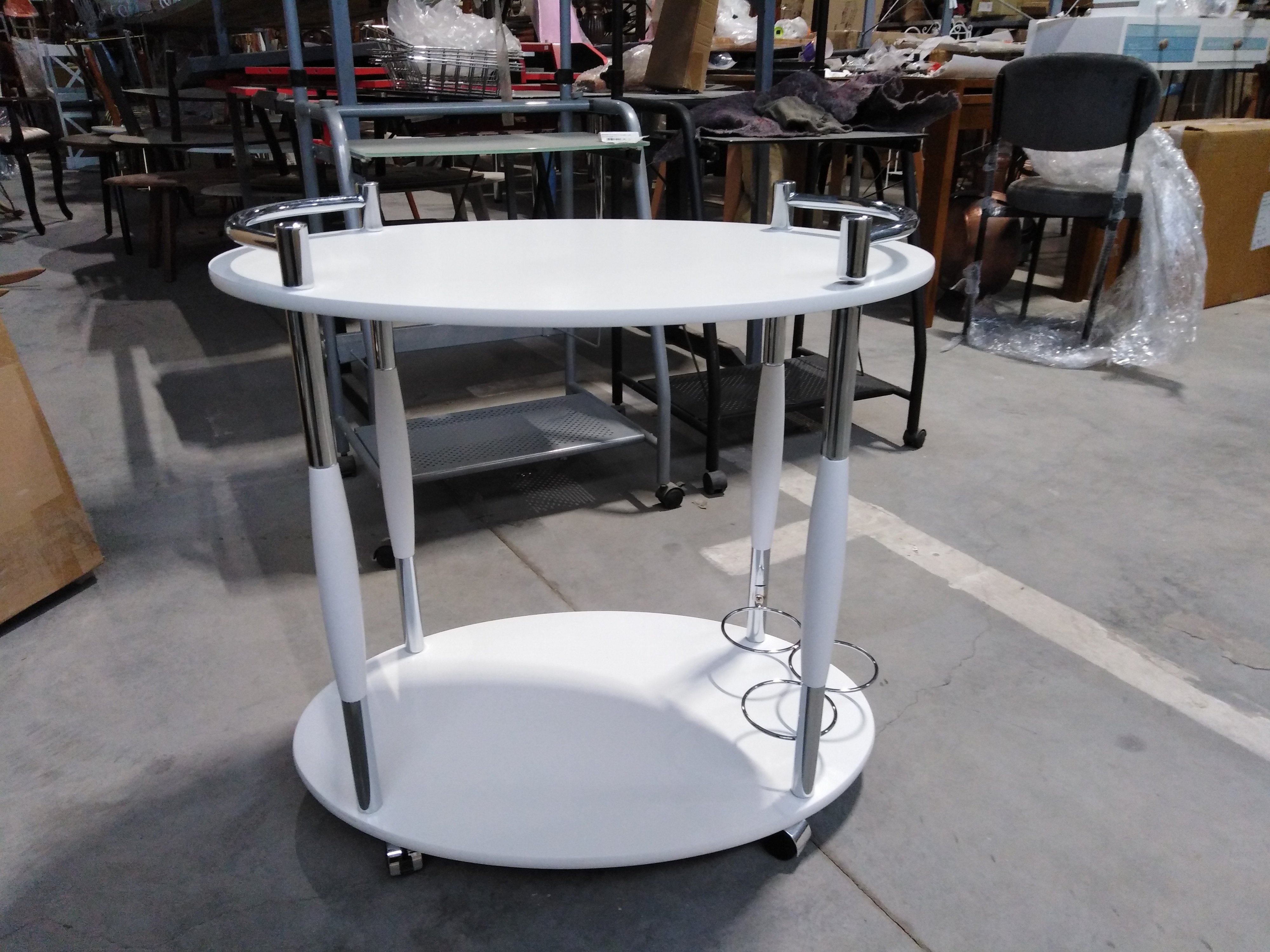 Описание товара без дефектов: Материал: столешницы - МДФ, элементы - металл. Оснащён колёсиками. Размеры: 47х70х67 см