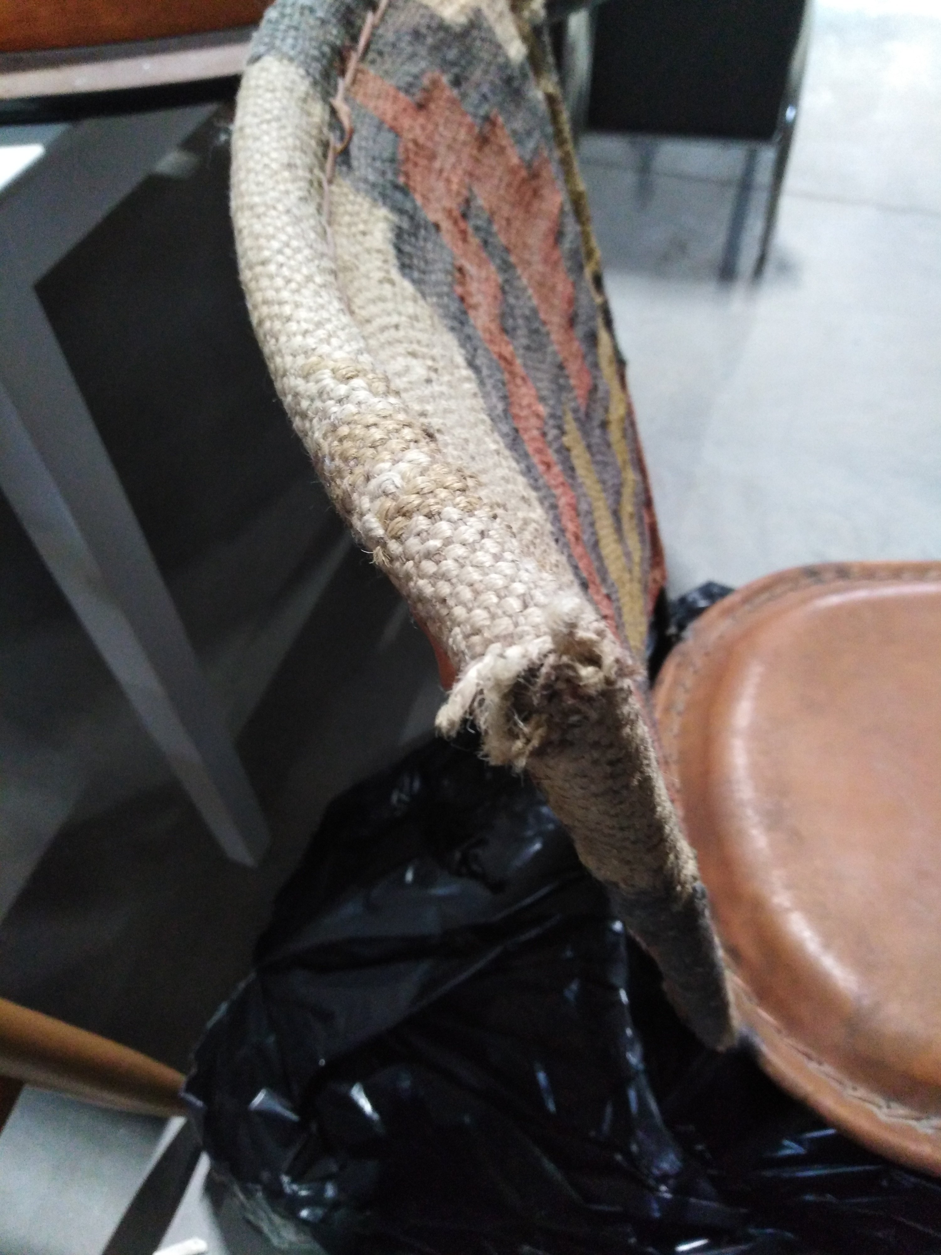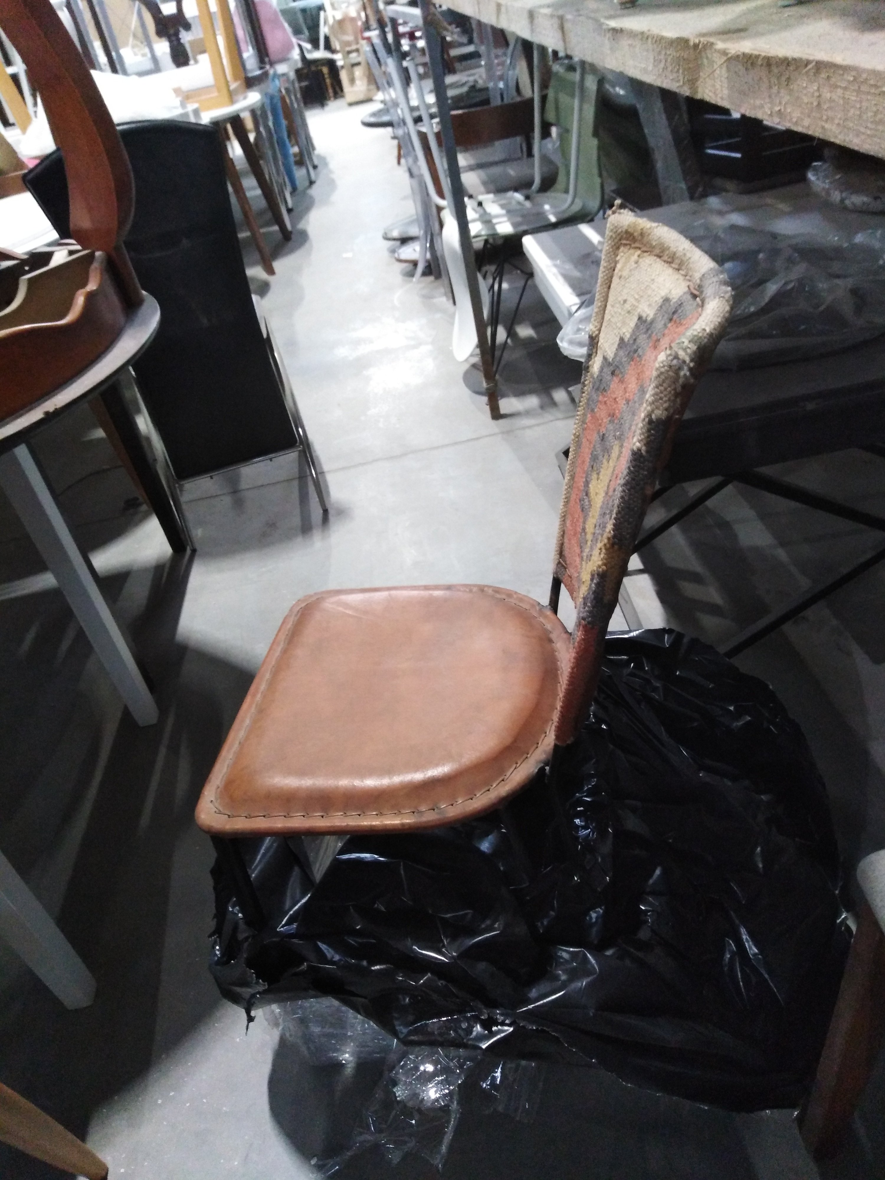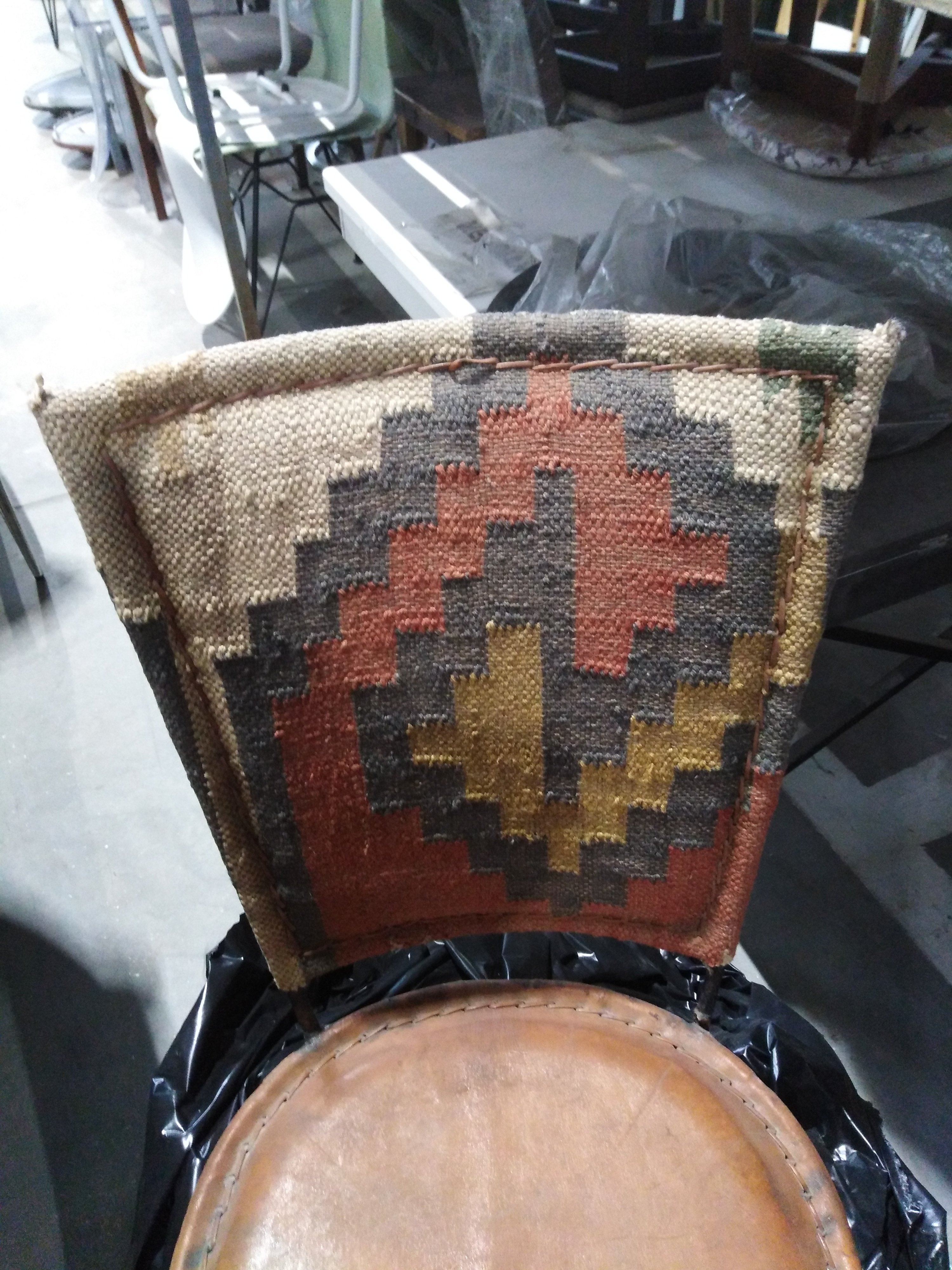 Описание товара без дефектов: Материал: каркас - металл, спинка - килим, сиденье - кожа буйвола. Цвет: металл - чёрный, спинка - этнический орнамент, сиденье - античный светлый. Размеры: 48х42х88 см