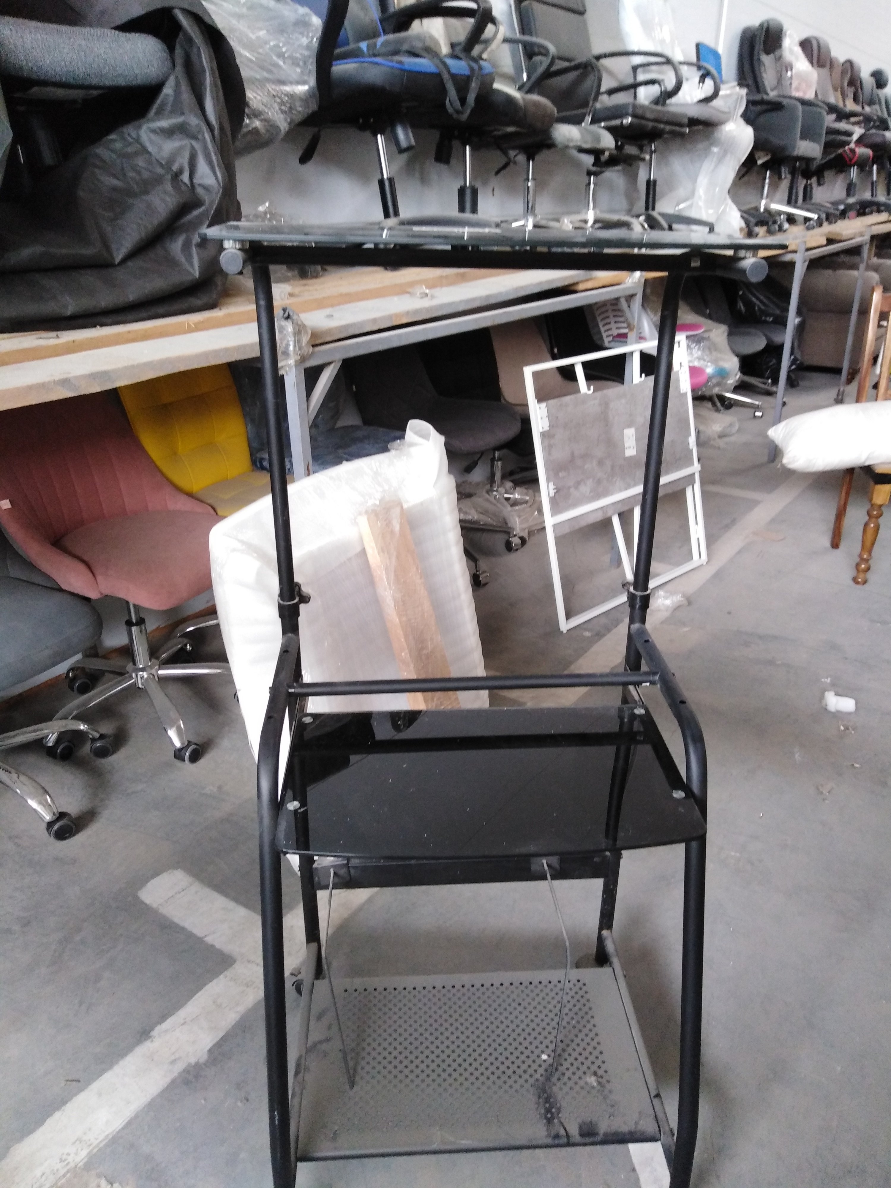 Описание дефекта: Стол продается в собраном виде без основной столешницы, царапины на стекле.
