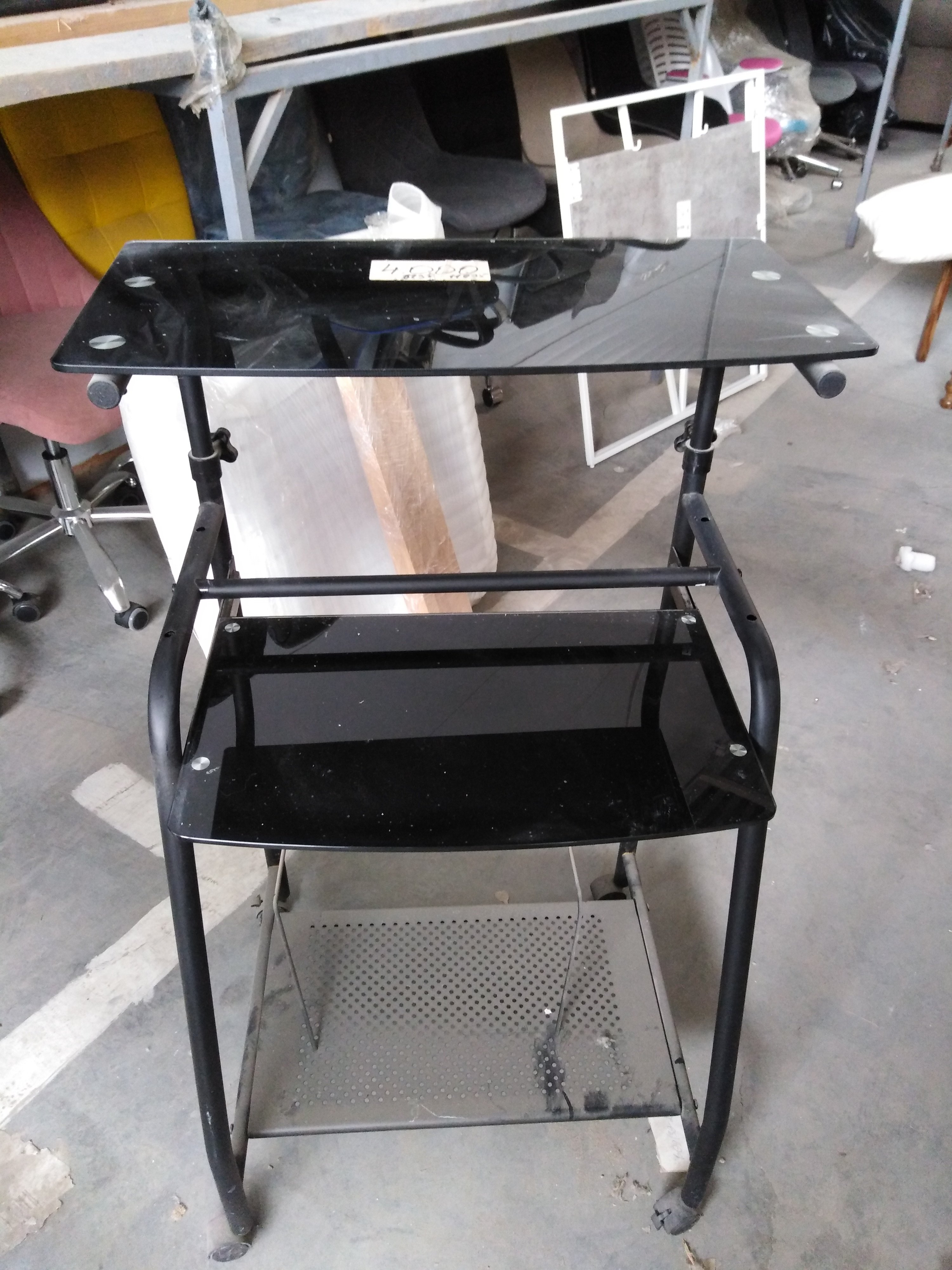 Описание товара без дефектов: На колёсиках. Металлокаркас. Плоскостные поверхности - закалённое стекло (5 мм). Цвет: металл - чёрный, стекло - прозрачный тонированный. Размеры: 65х49х140 см