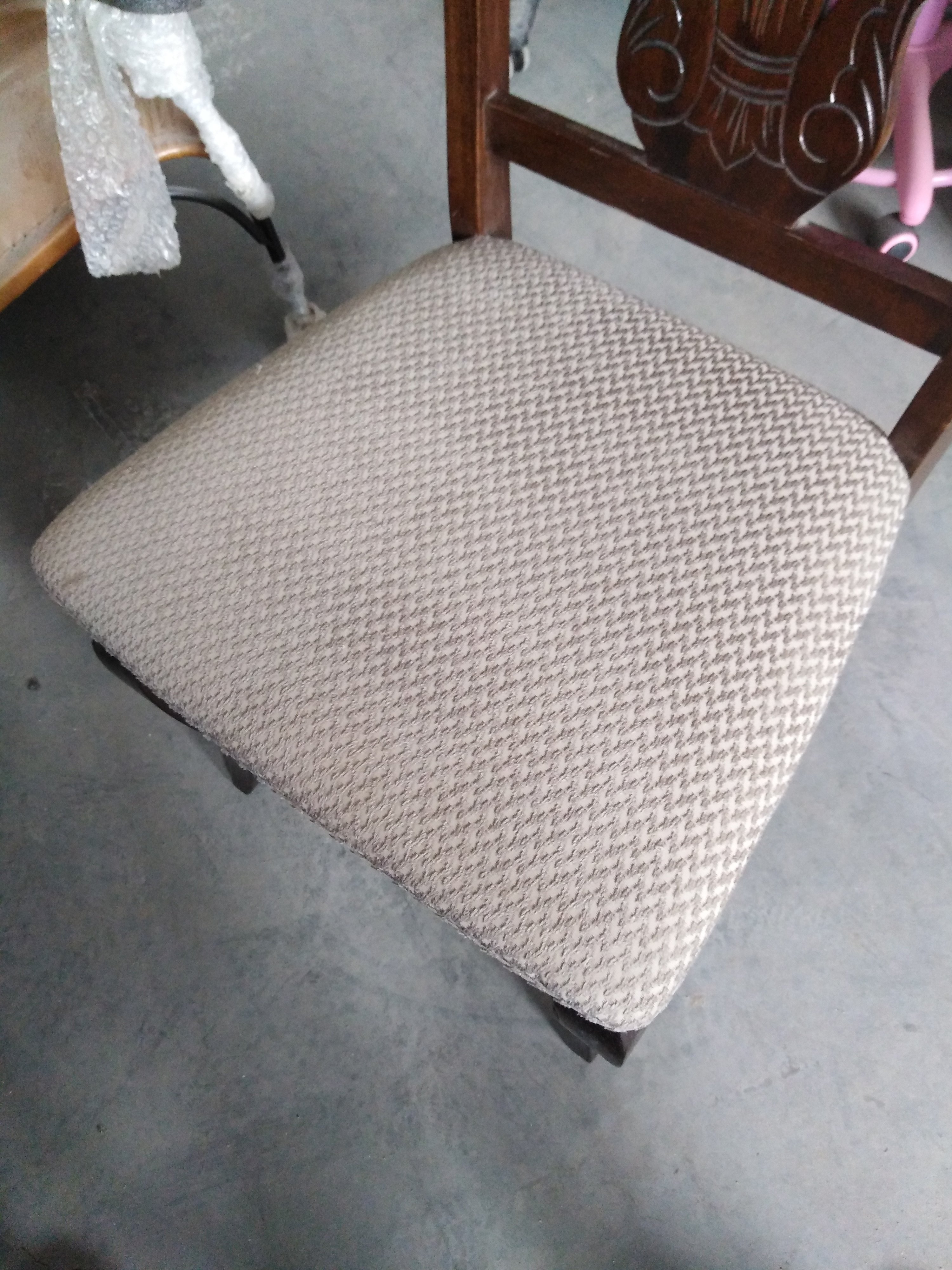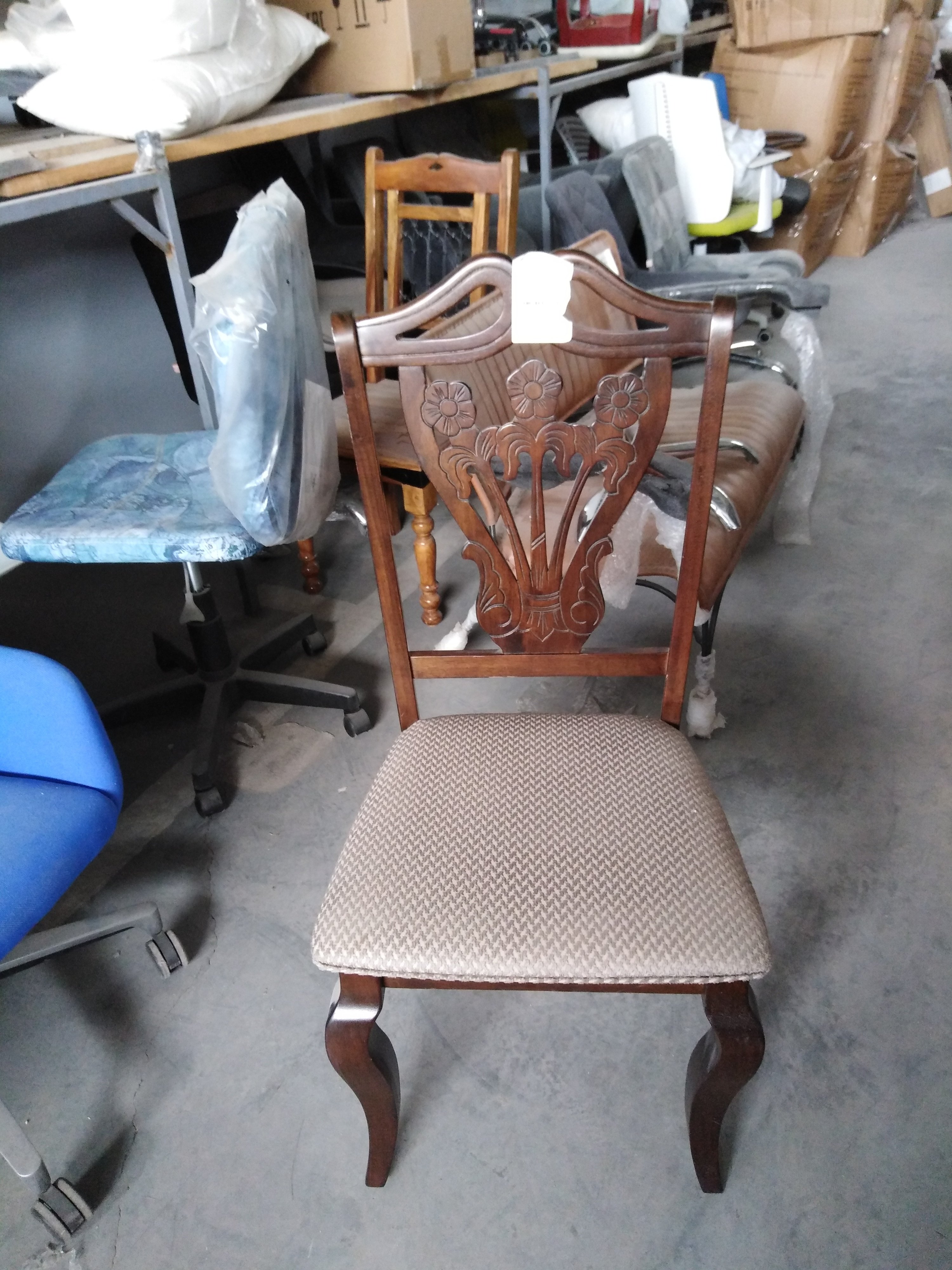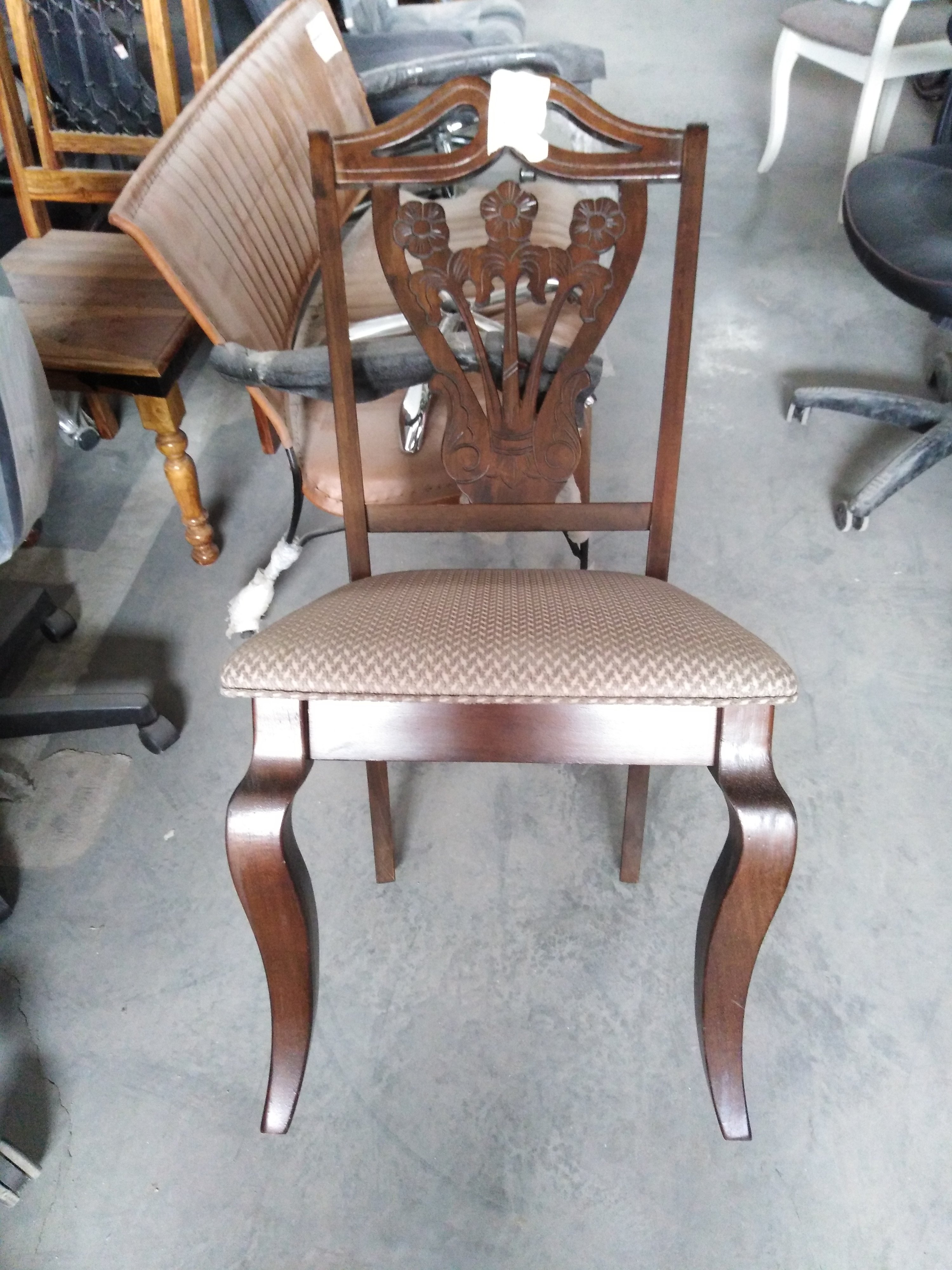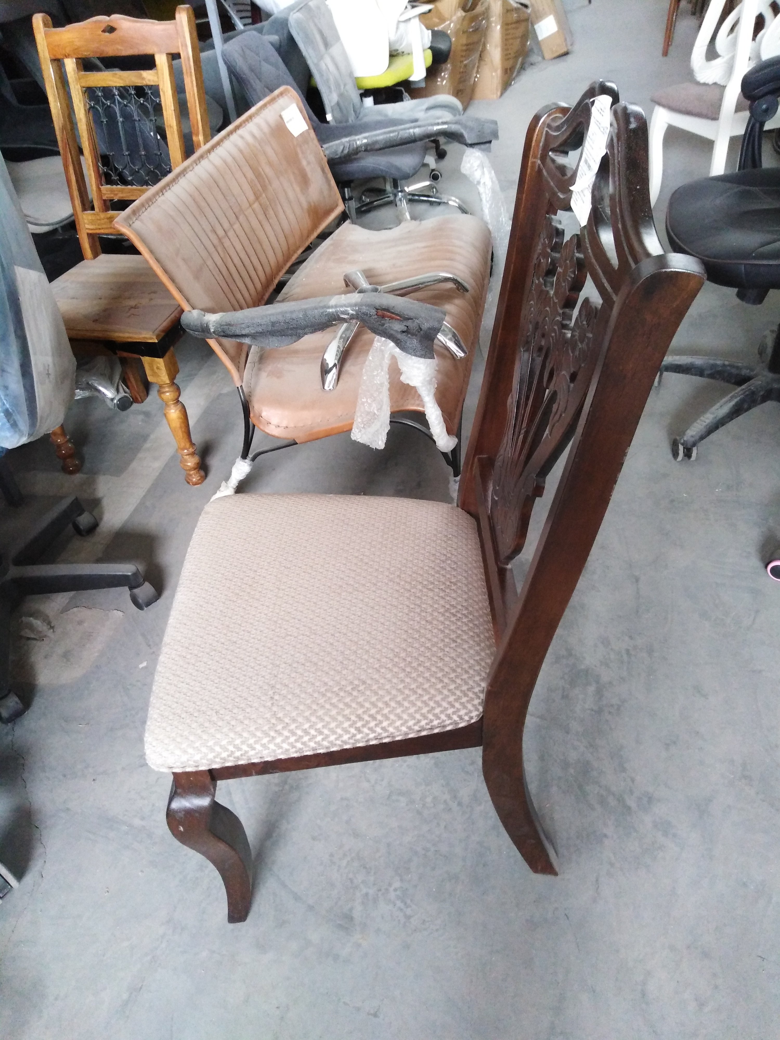 Описание товара без дефектов: Каркас - дерево гевея. Обивка - ткань. Спинка резная. Размеры: 49х56х102 см