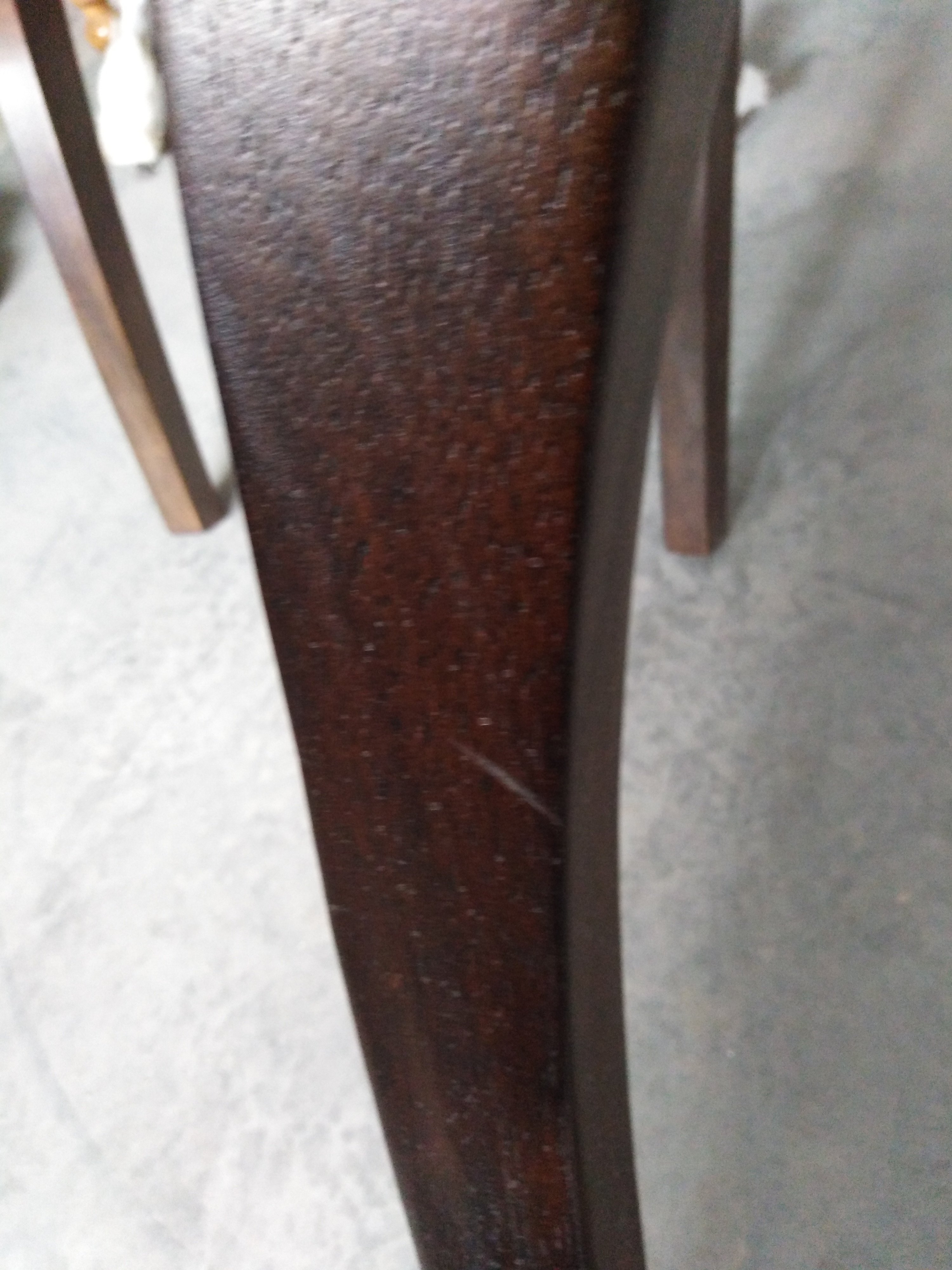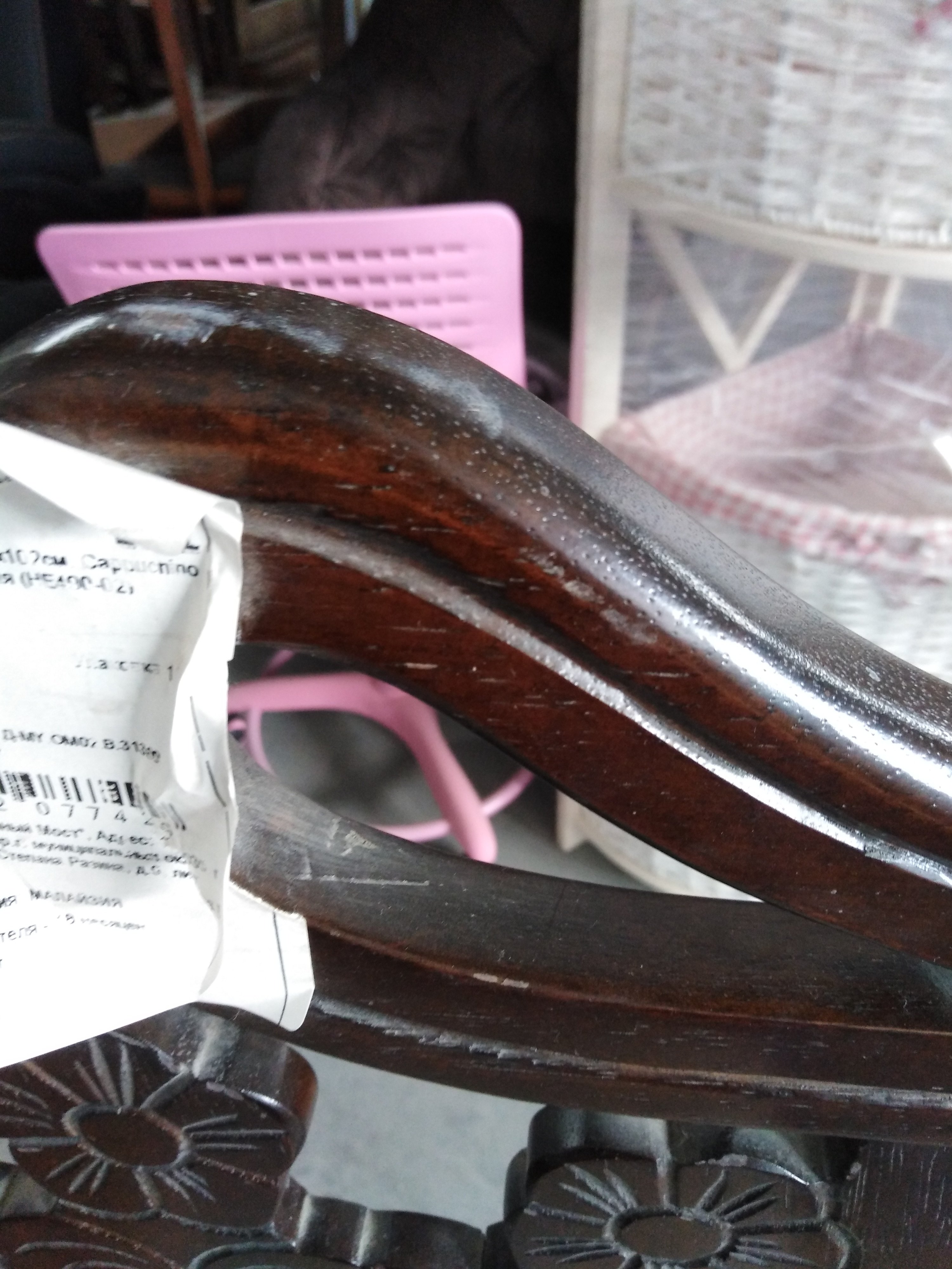 Описание дефекта: Нарушение ЛКП, царапины на ножках, трещина на декоре спинки, частичная загрязненность материала сидения.