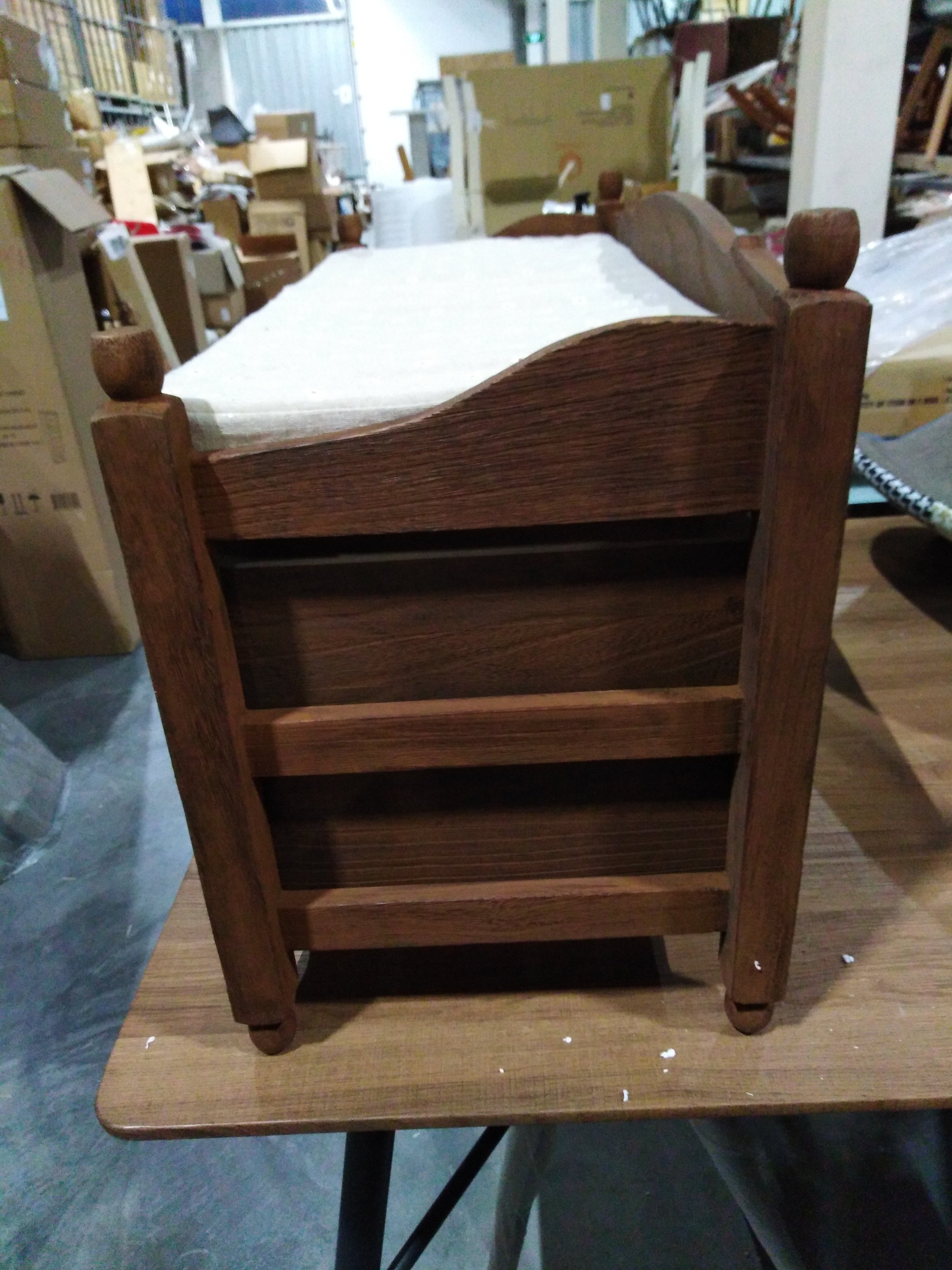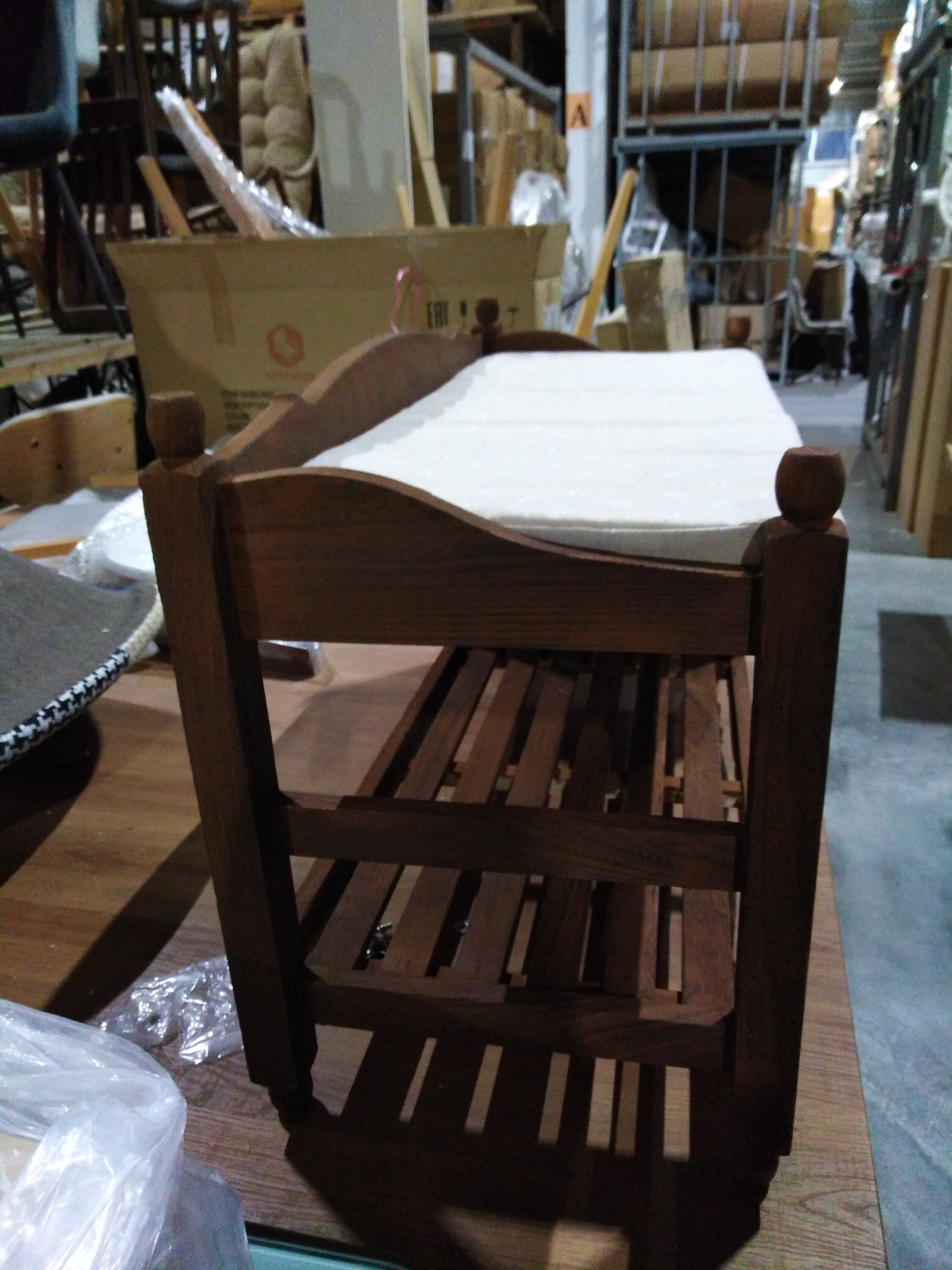 Описание дефекта: Ножки разной высоты, дефекты покраски, неравномерно прокрашены перекладины и повреждена, треснута одна из полок (треснуто дно).