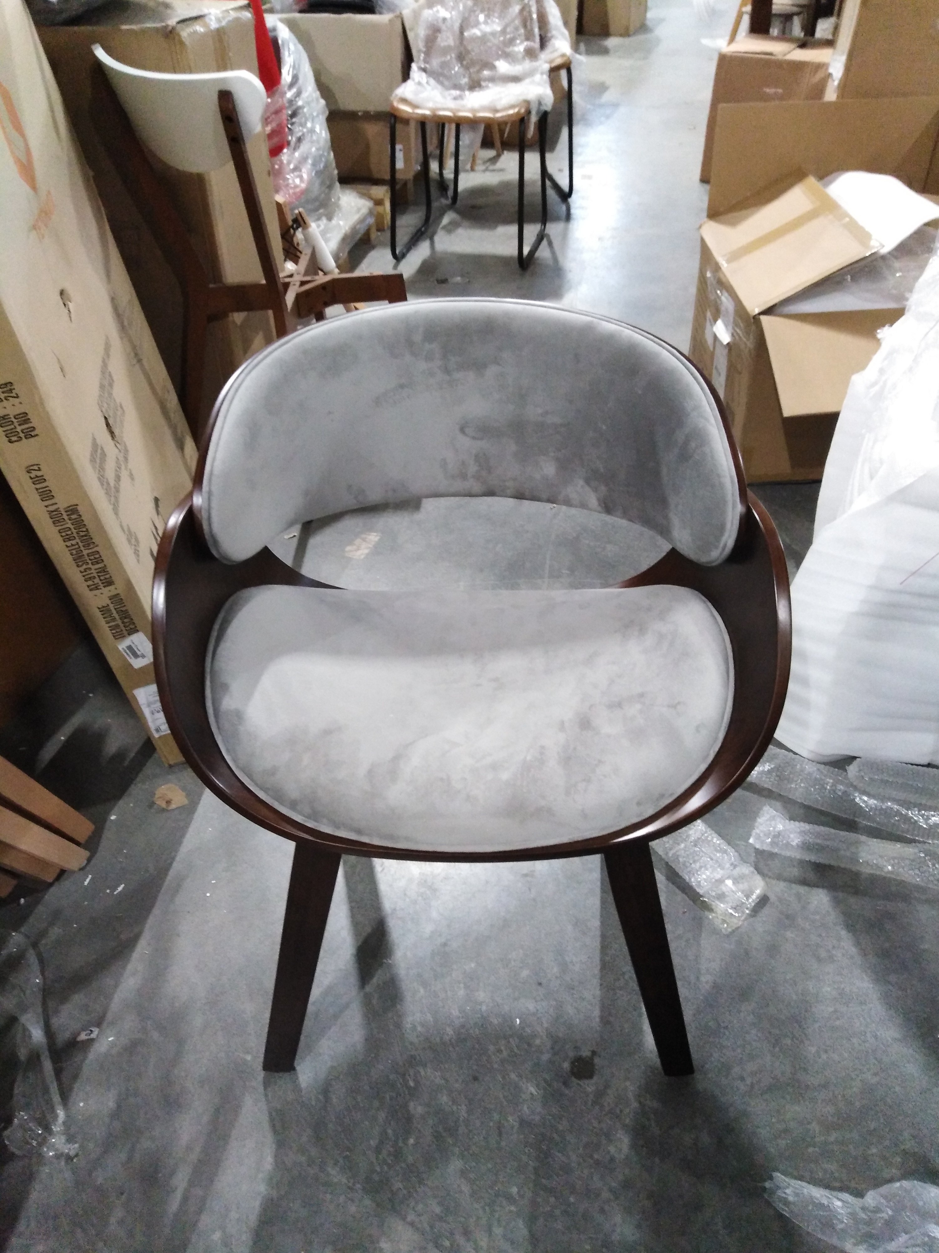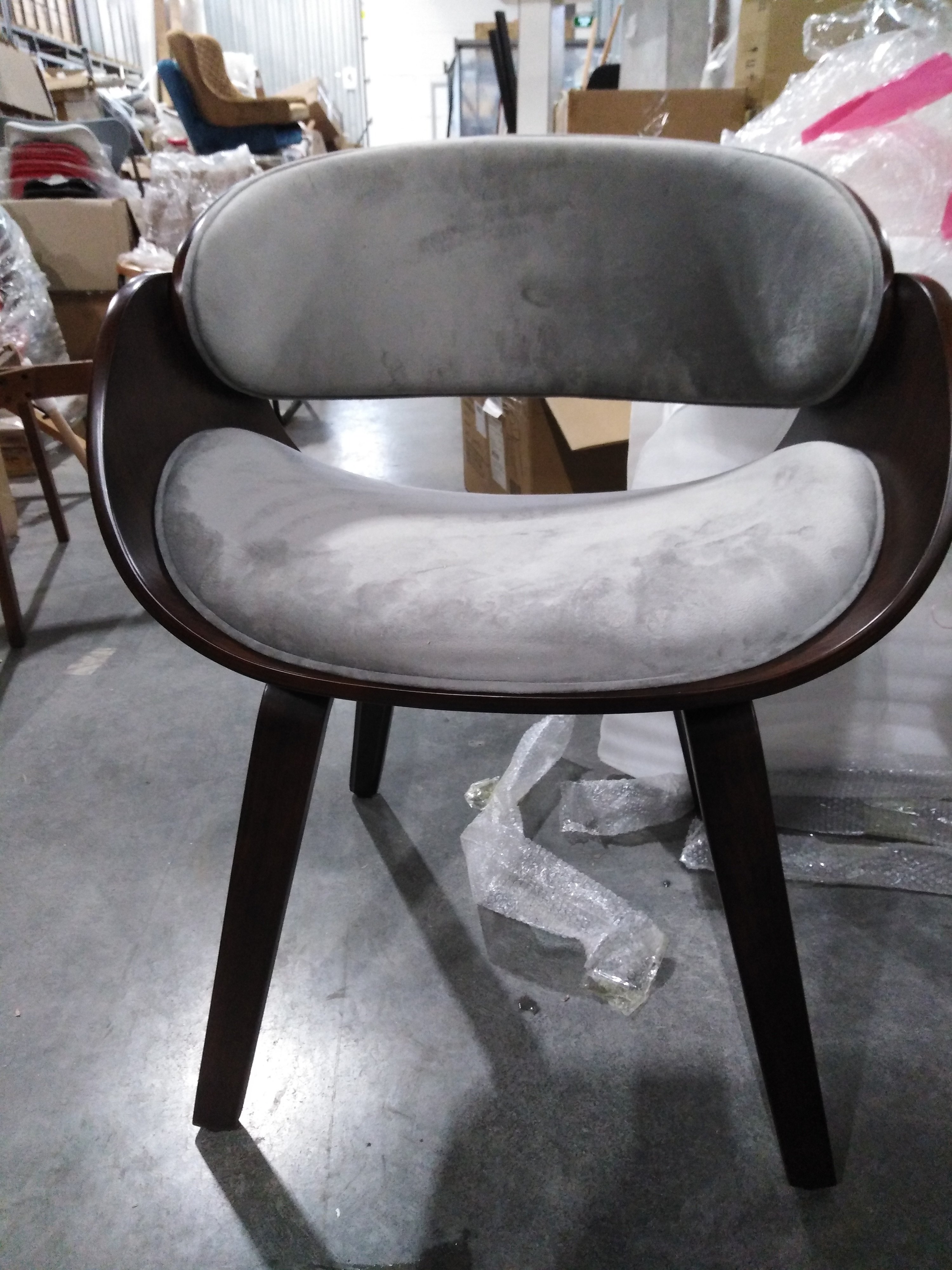 Обивка стула, выполнена из качественного флока, не только радует взгляд, но также отличается высокой износостойкостью (до 50 000 циклов по шкале Мартиндейла), что гарантирует долгий срок службы и лёгкость в уходе. Эргономичная форма и гладкие линии в стиле среднего модерна 20 века делают его не только эстетически привлекательным, но и комфортным для длительного использования. На ножках стула присутствуют накладки, которые предотвращают скольжение стула и защищают покрытие пола от повреждений.