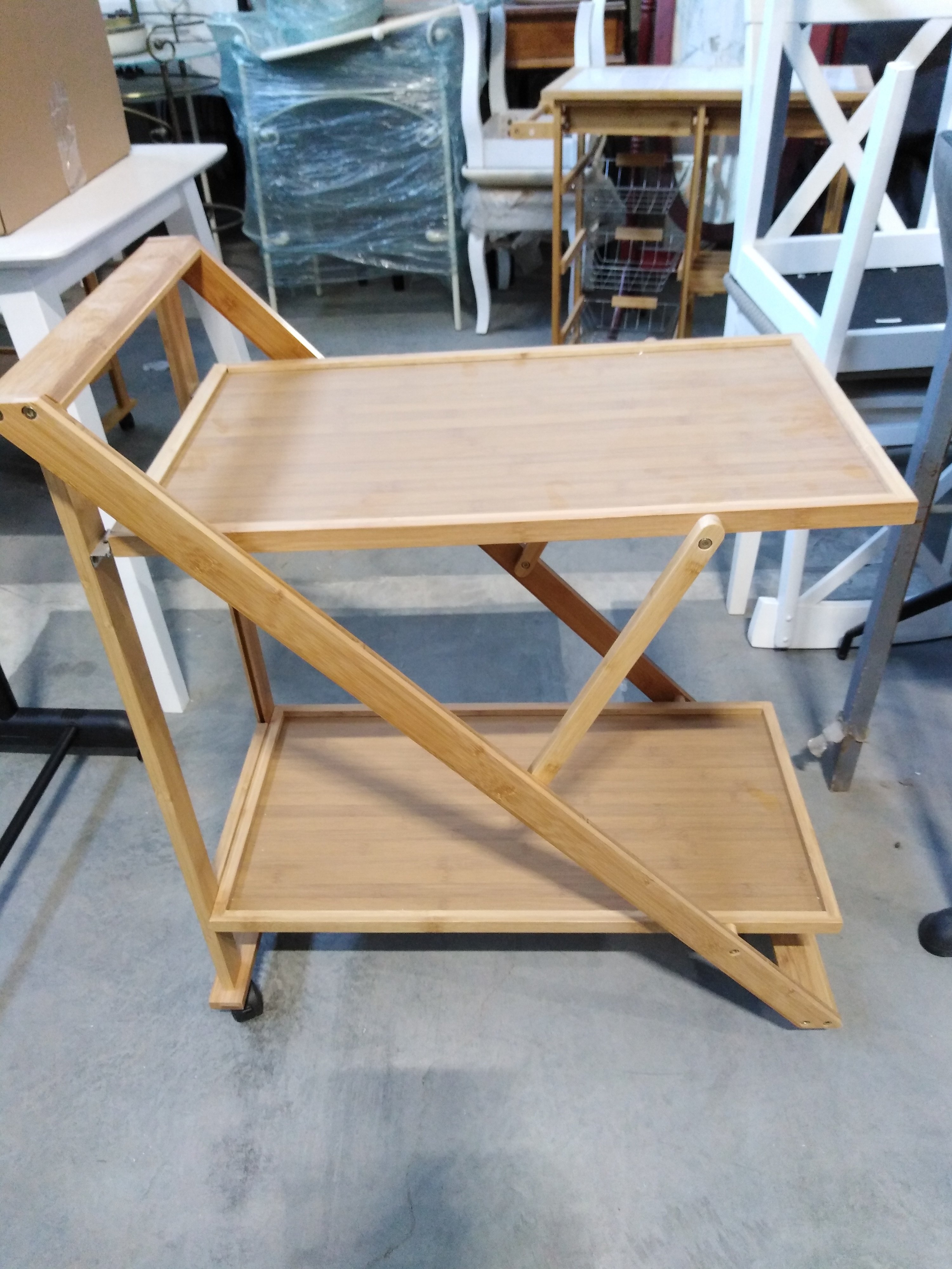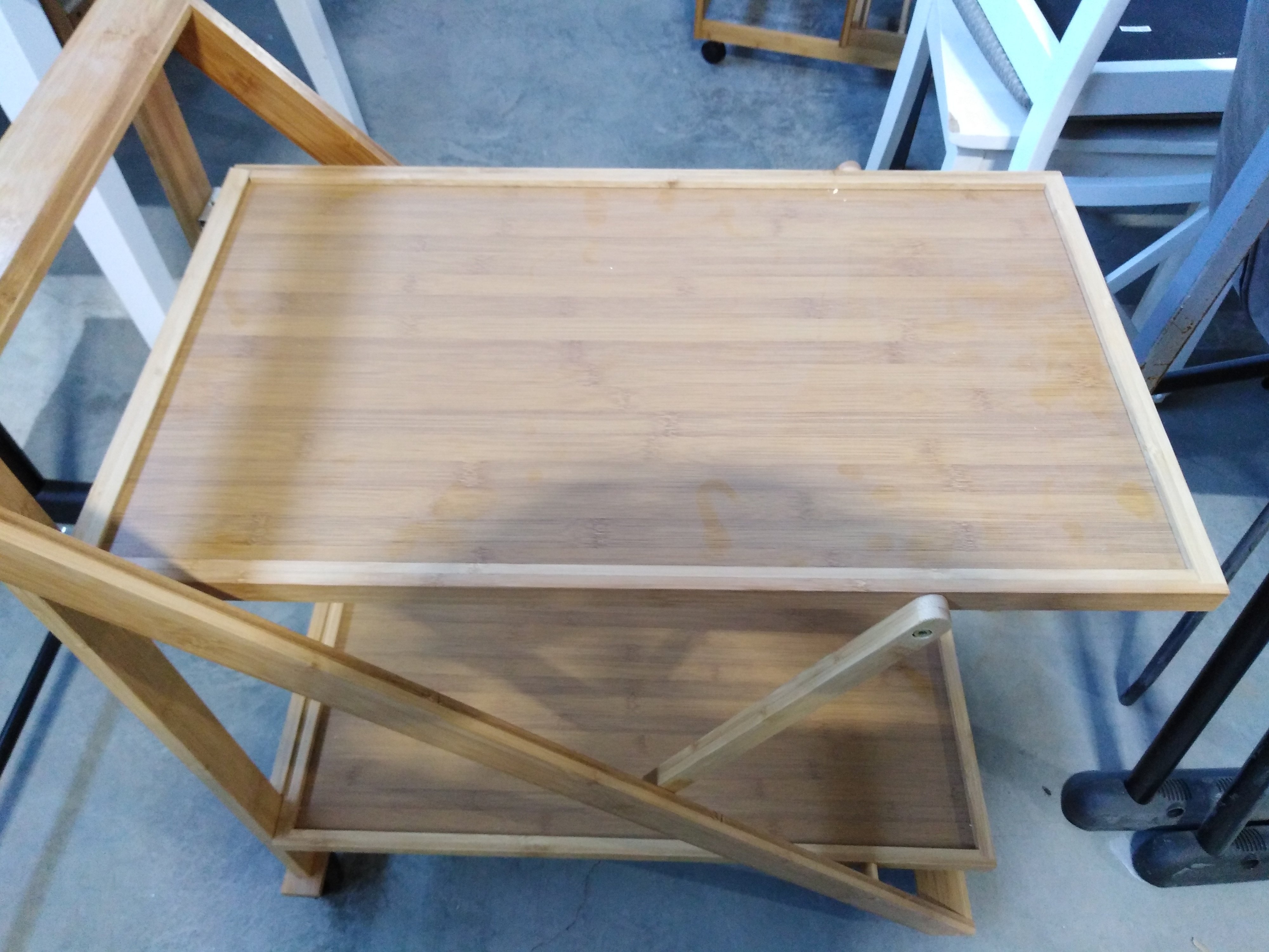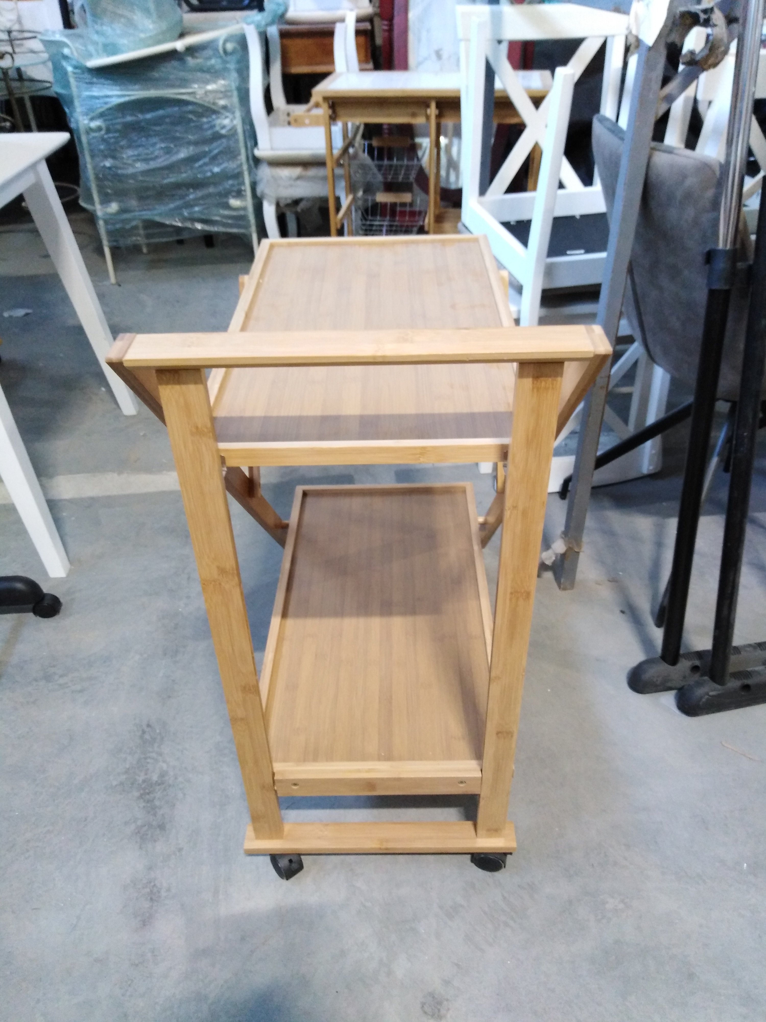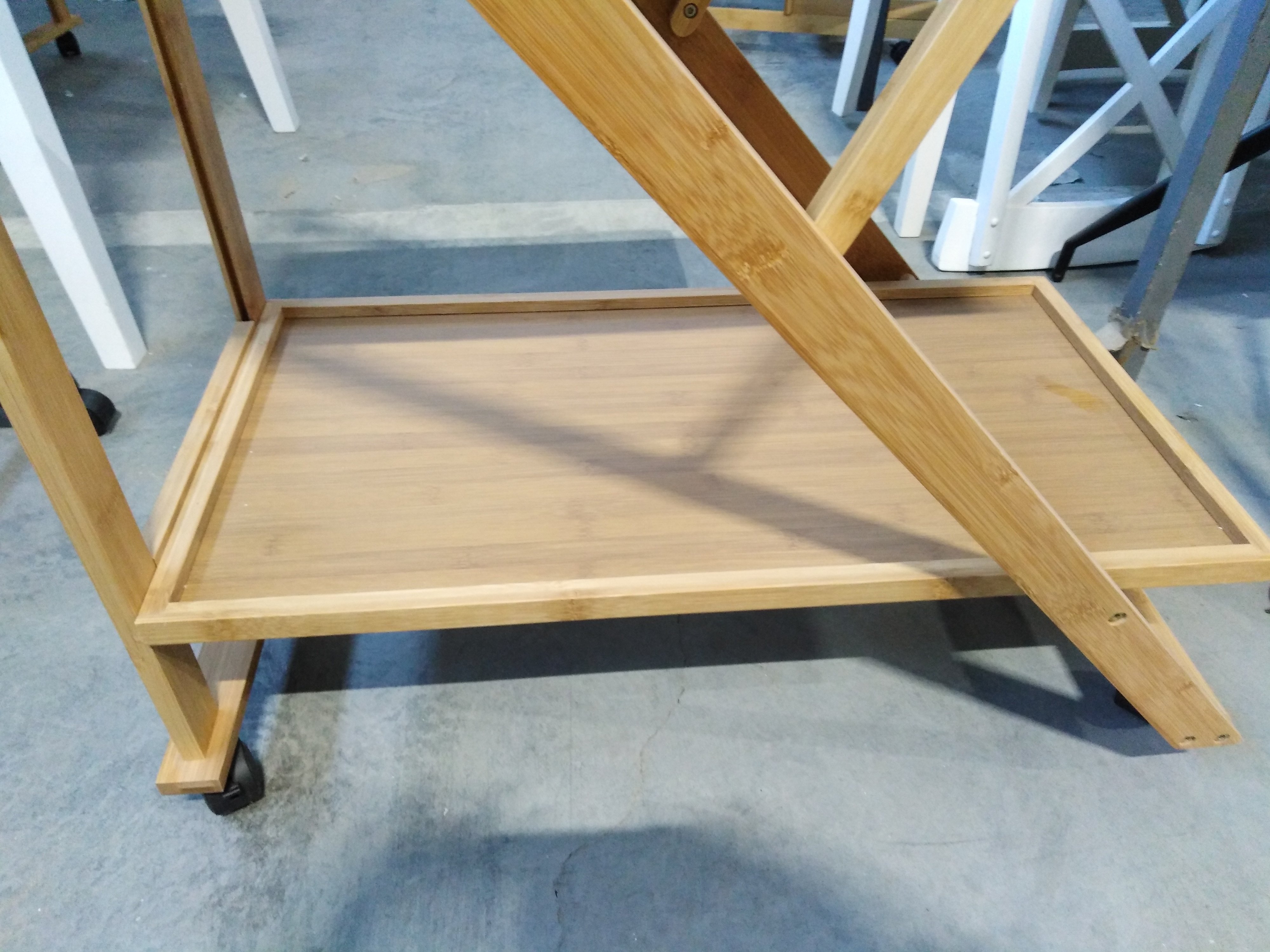 Описание товара без дефектов: Основание на колёсиках. 2 столешницы. Материал: прессованный бамбук. Цвет: натуральный. Размеры: 72х42х81,5 см