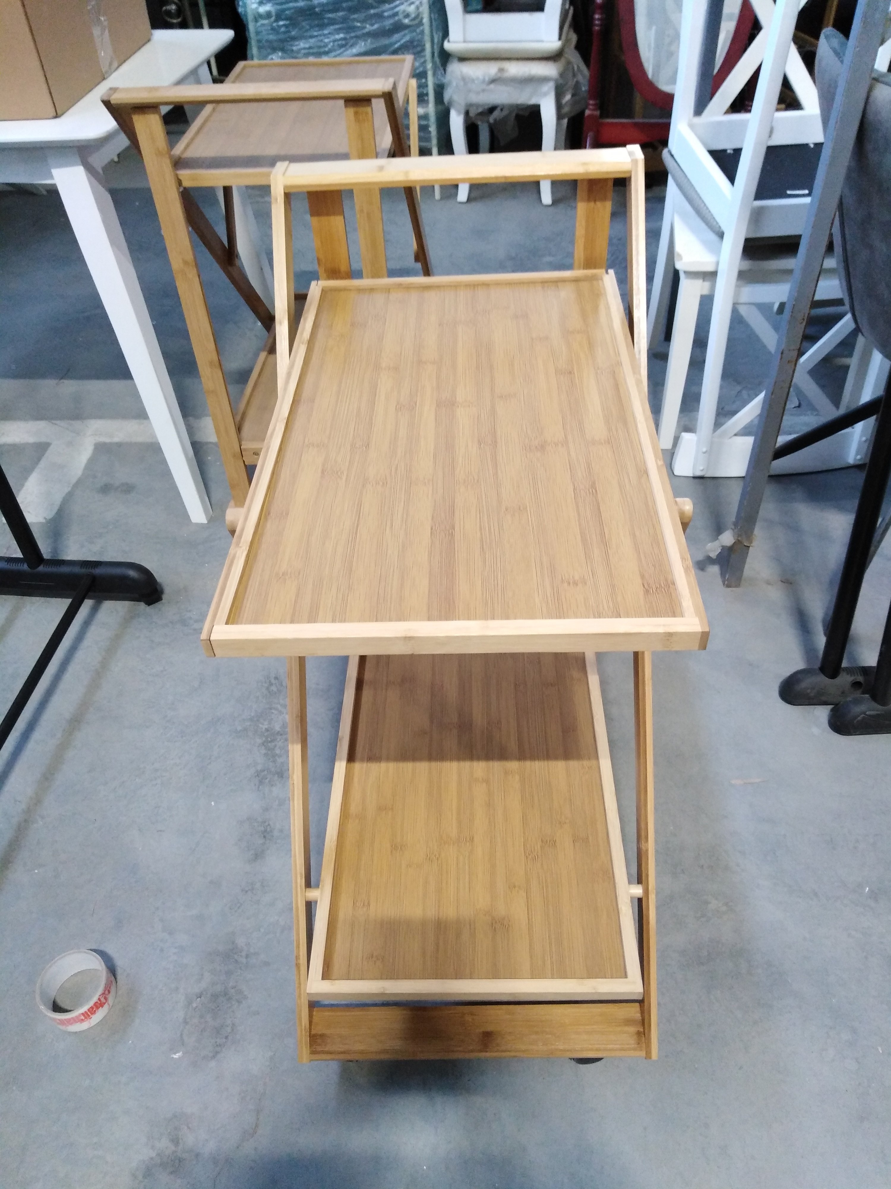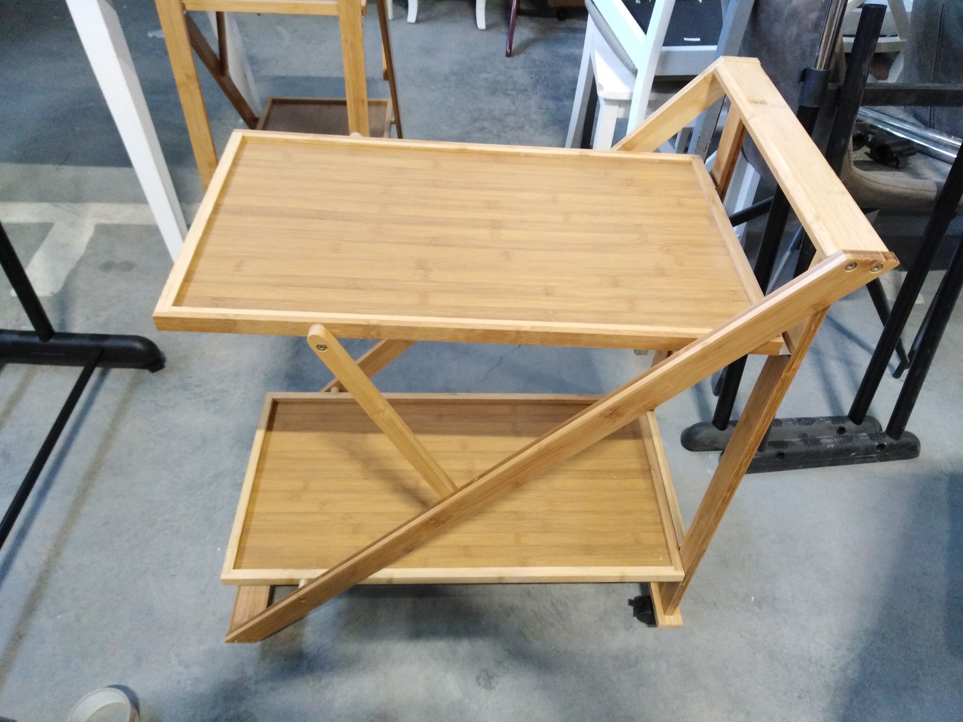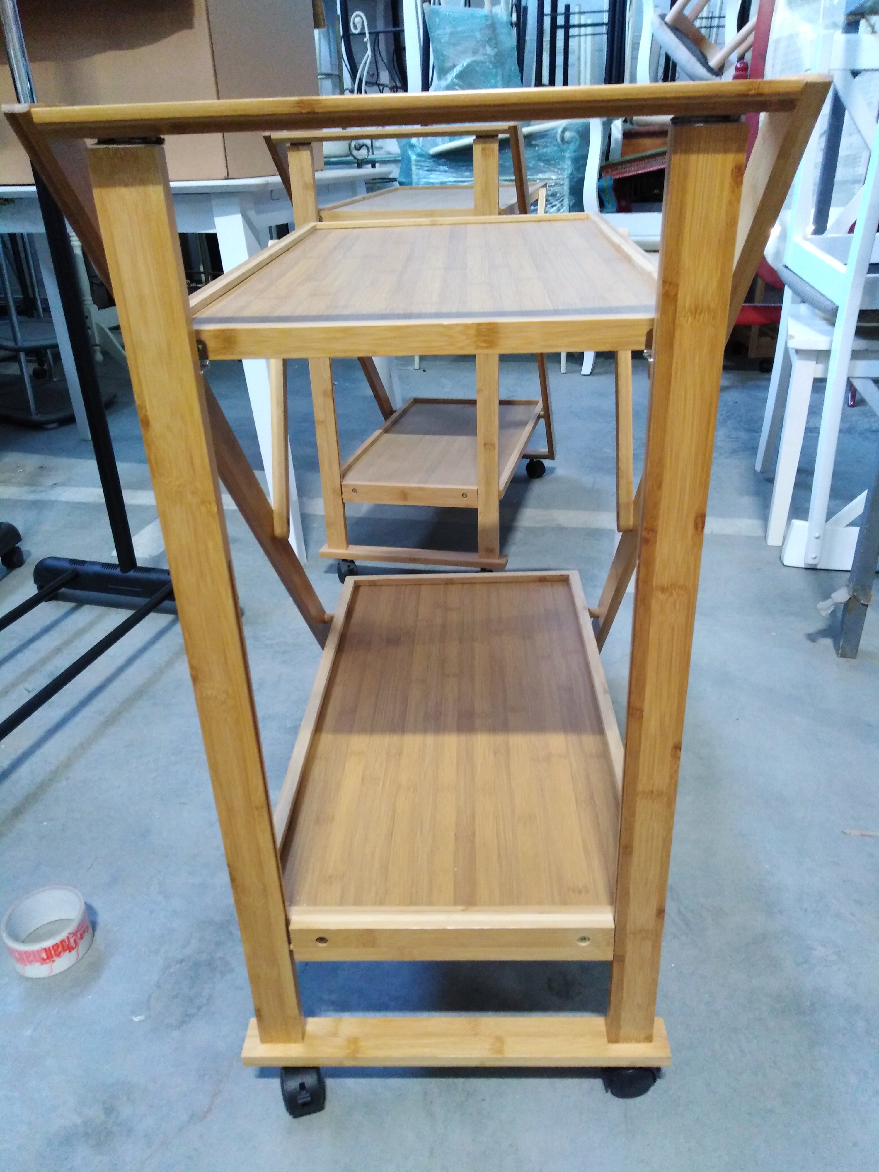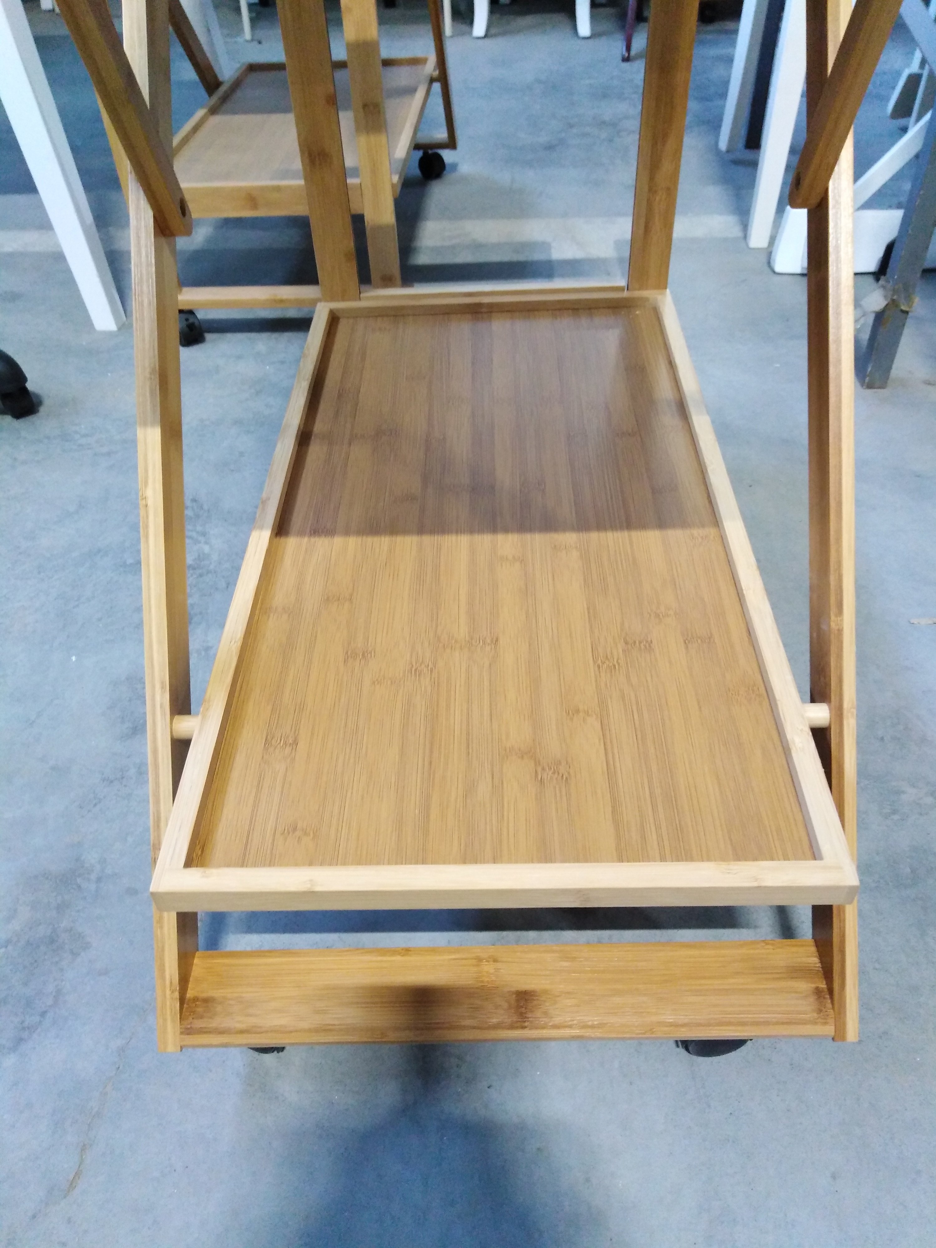 Описание товара без дефектов: Основание на колёсиках. 2 столешницы. Материал: прессованный бамбук. Цвет: натуральный. Размеры: 72х42х81,5 см