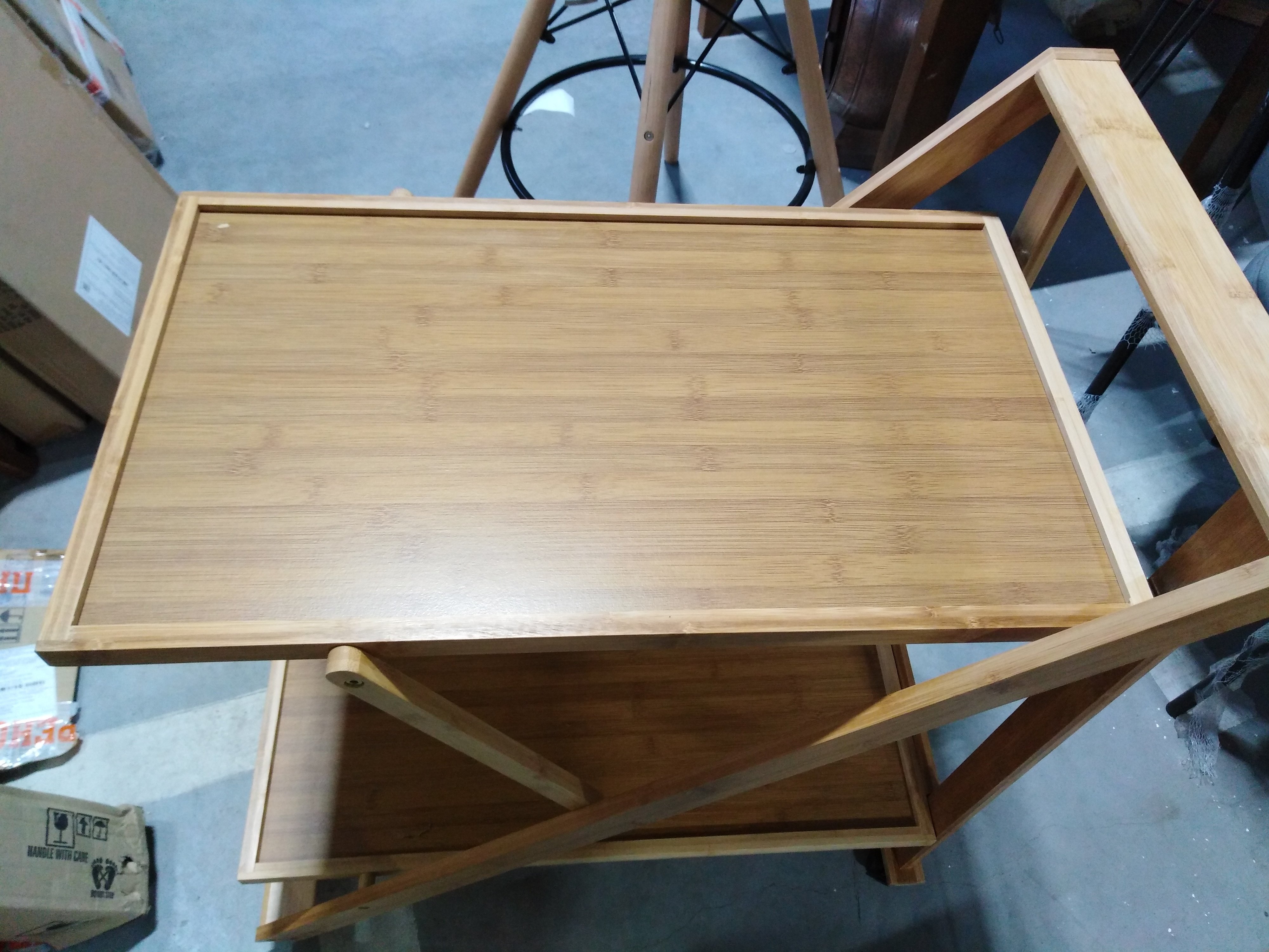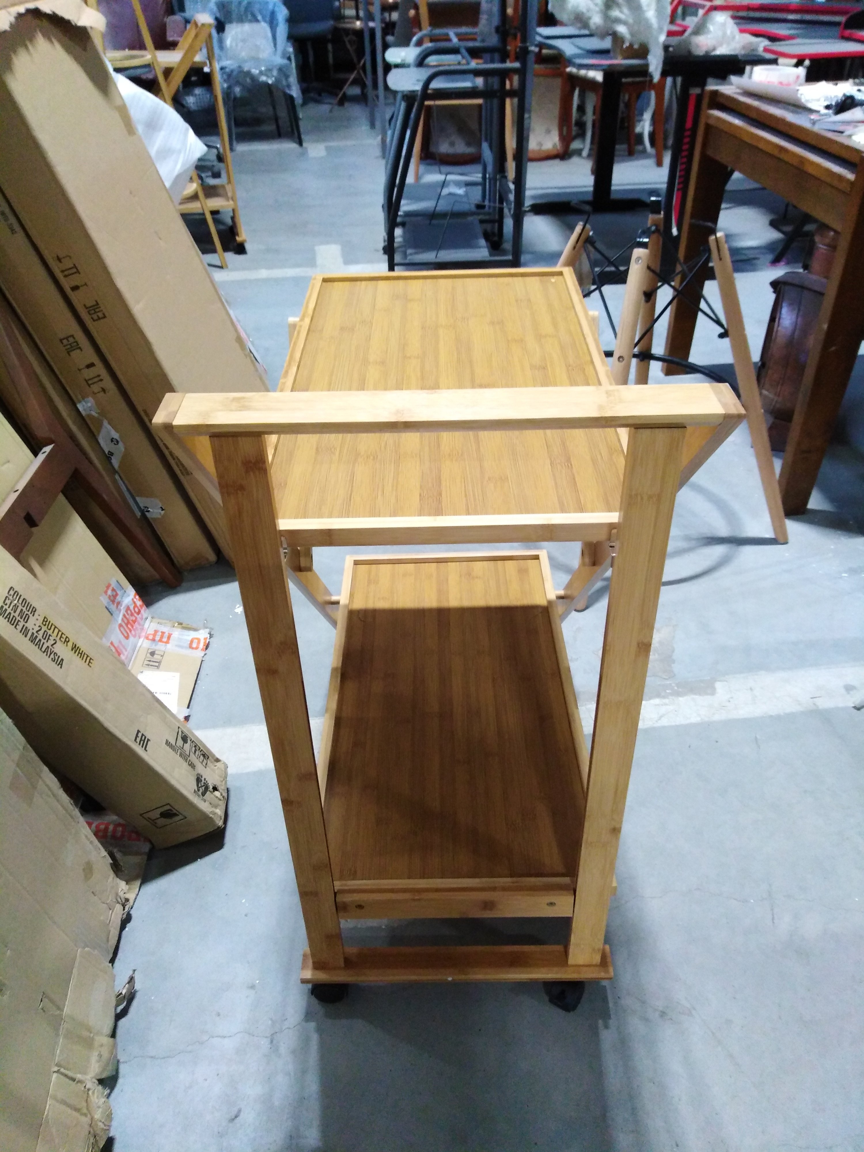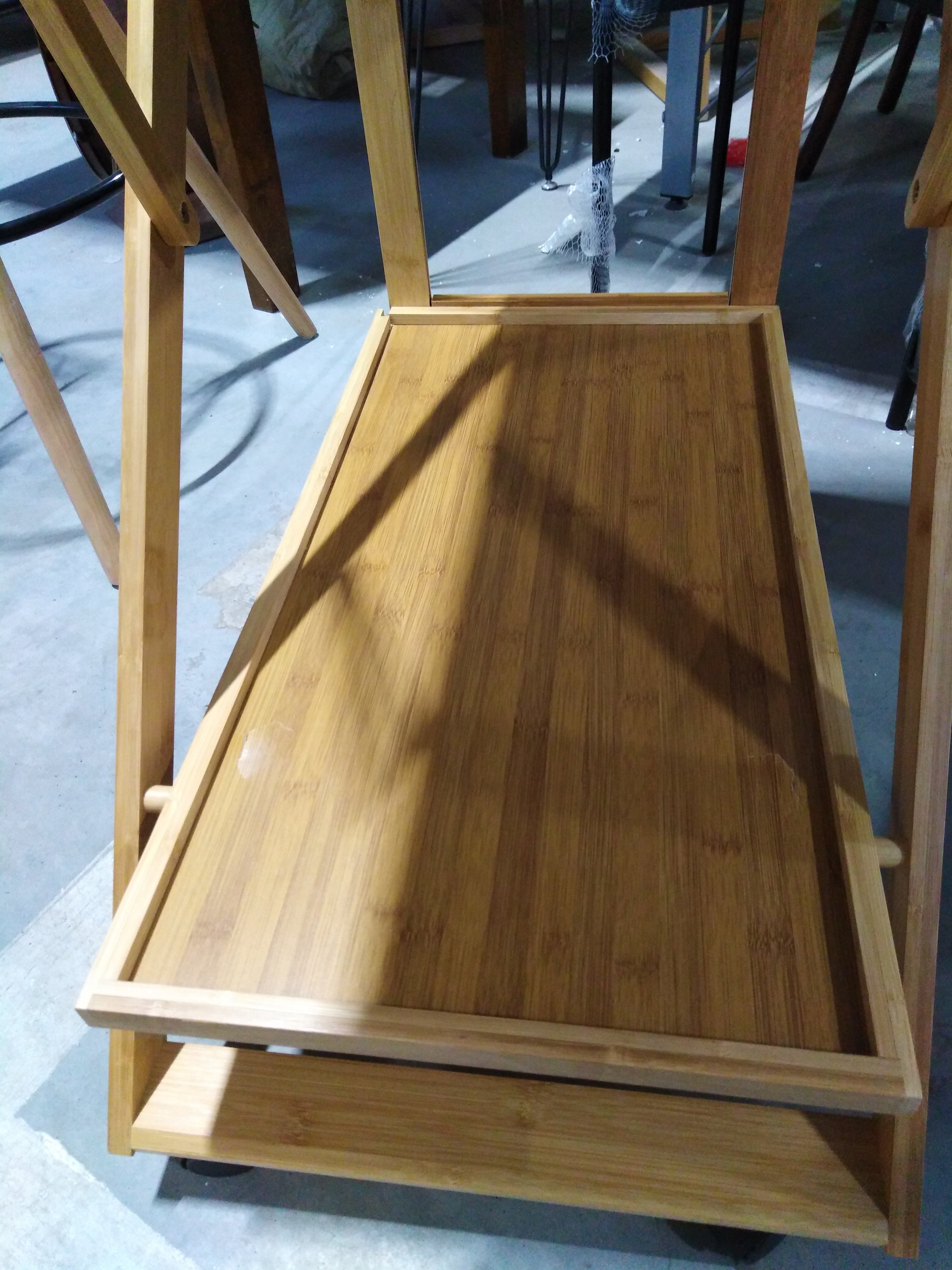 Описание товара без дефектов: Основание на колёсиках. 2 столешницы. Материал: прессованный бамбук. Цвет: натуральный. Размеры: 72х42х81,5 см