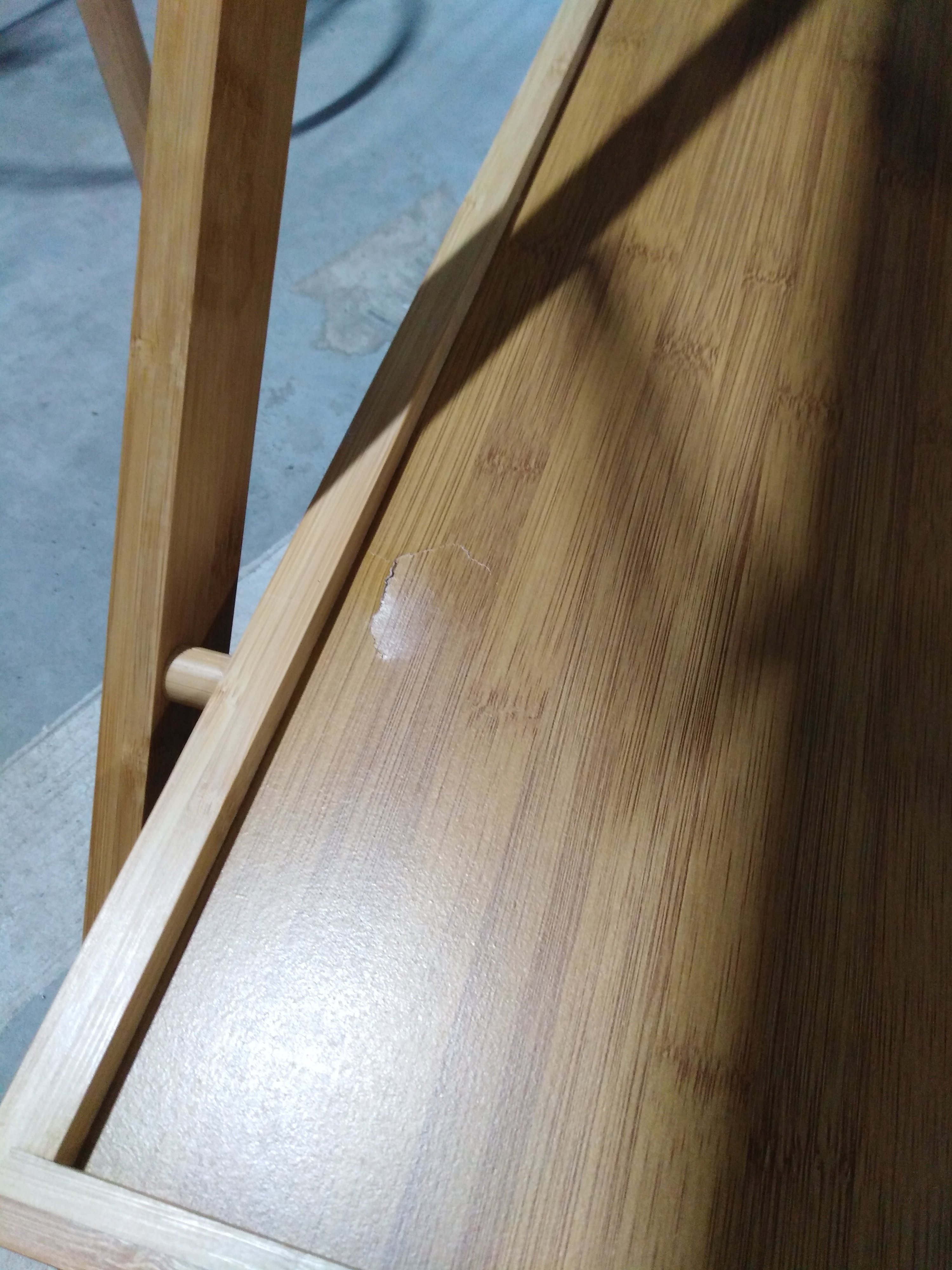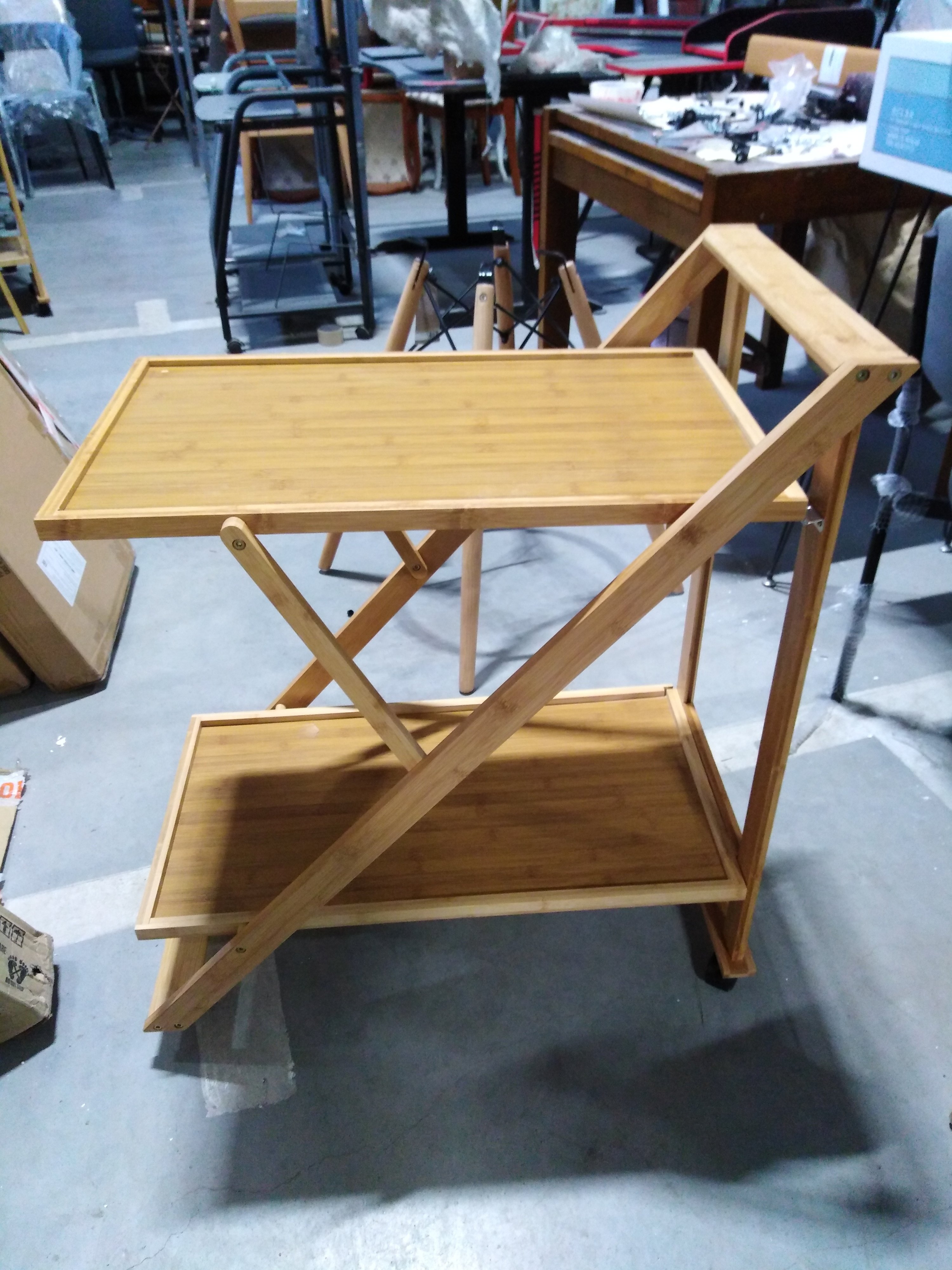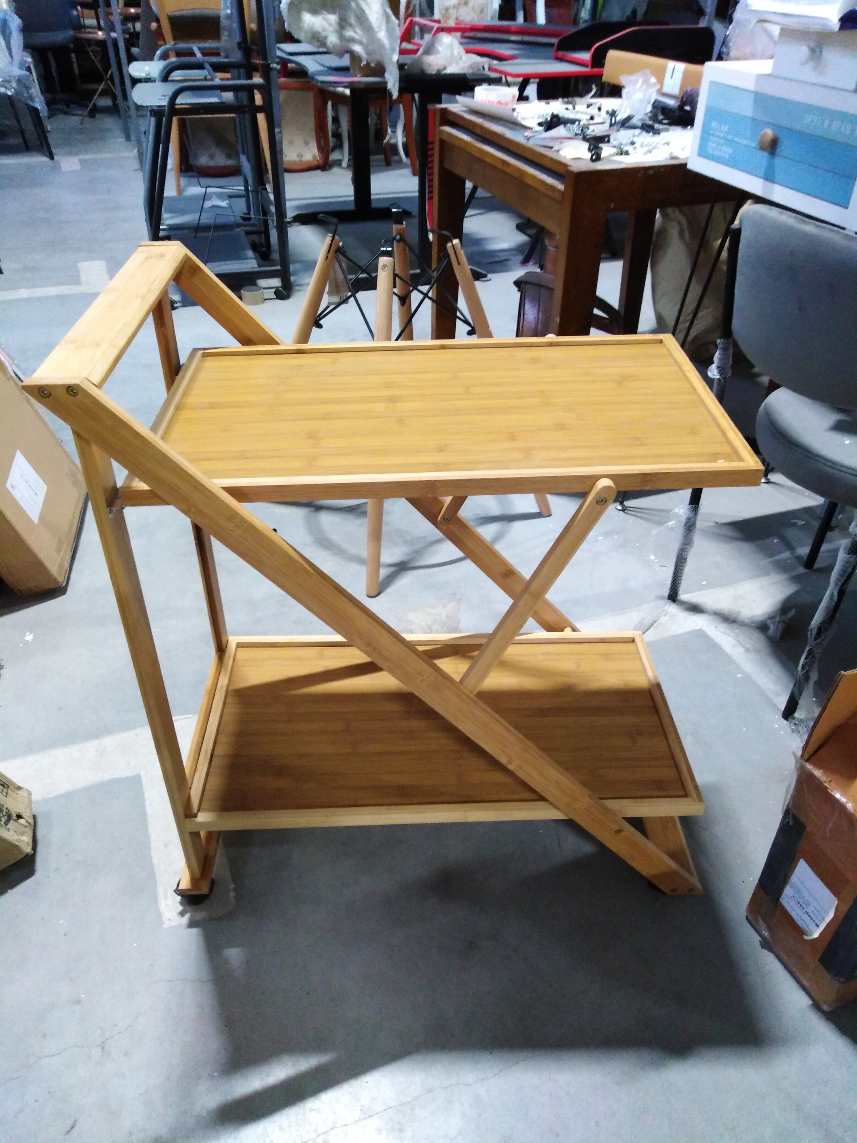 Описание товара без дефектов: Основание на колёсиках. 2 столешницы. Материал: прессованный бамбук. Цвет: натуральный. Размеры: 72х42х81,5 см
