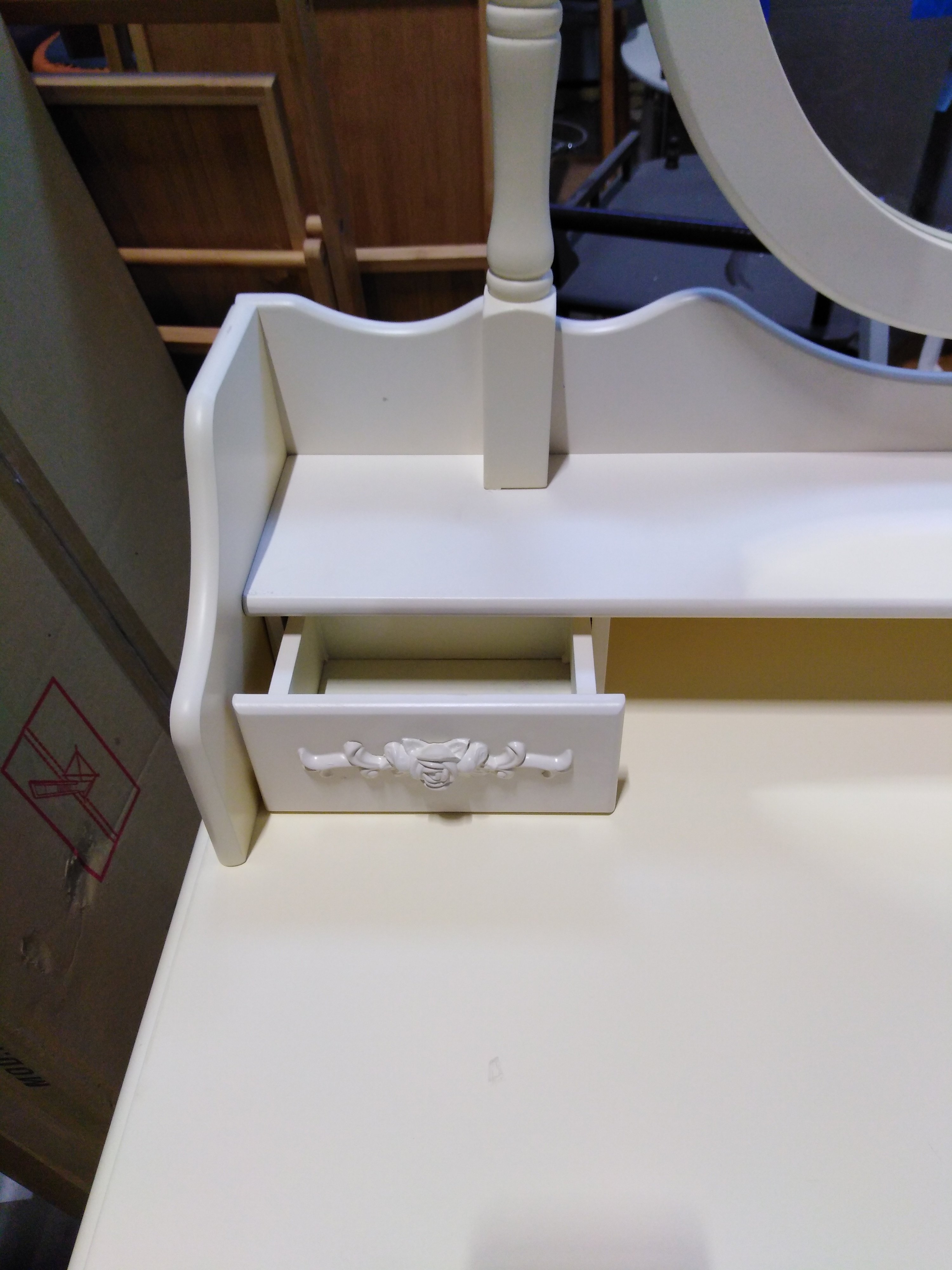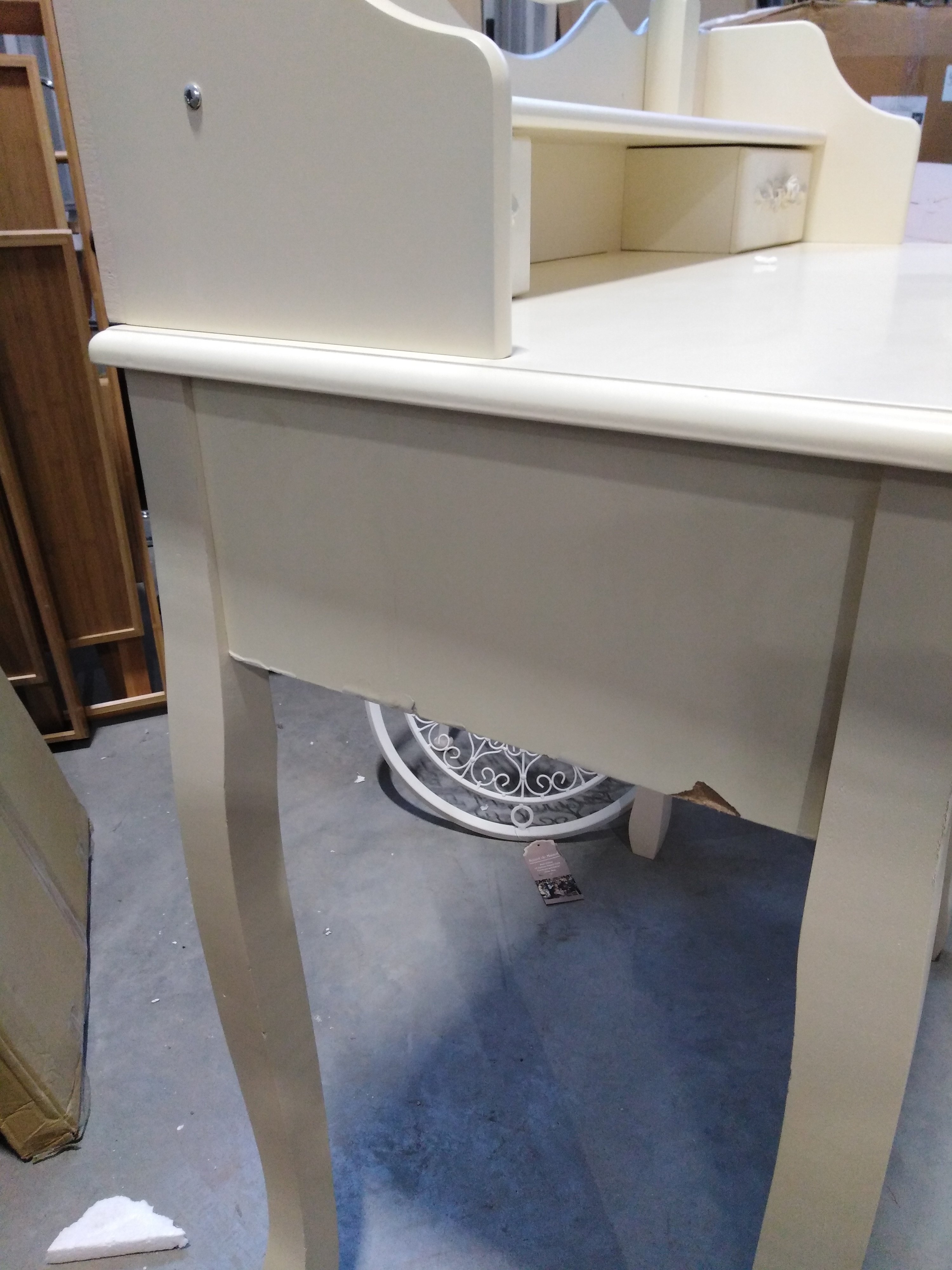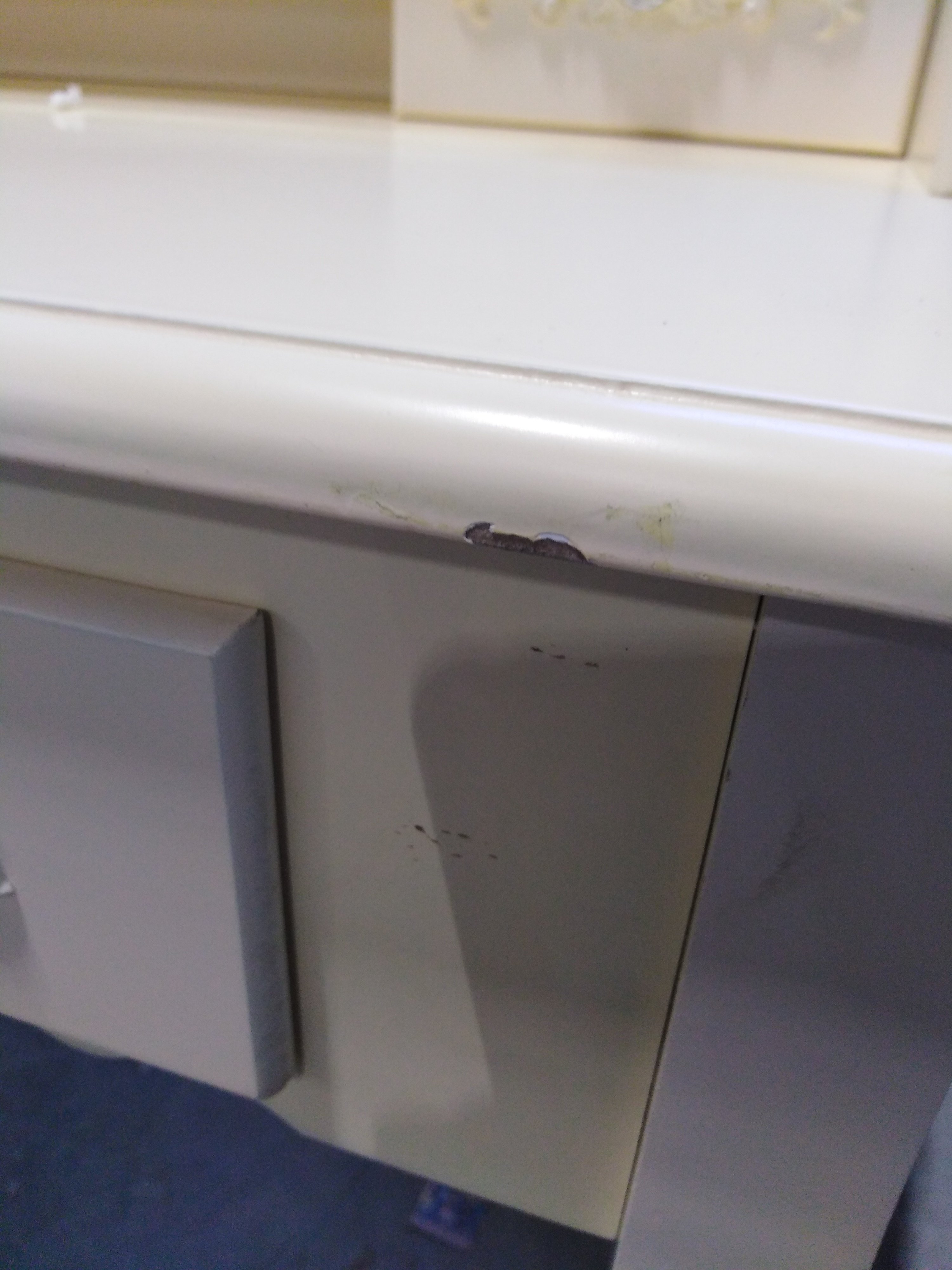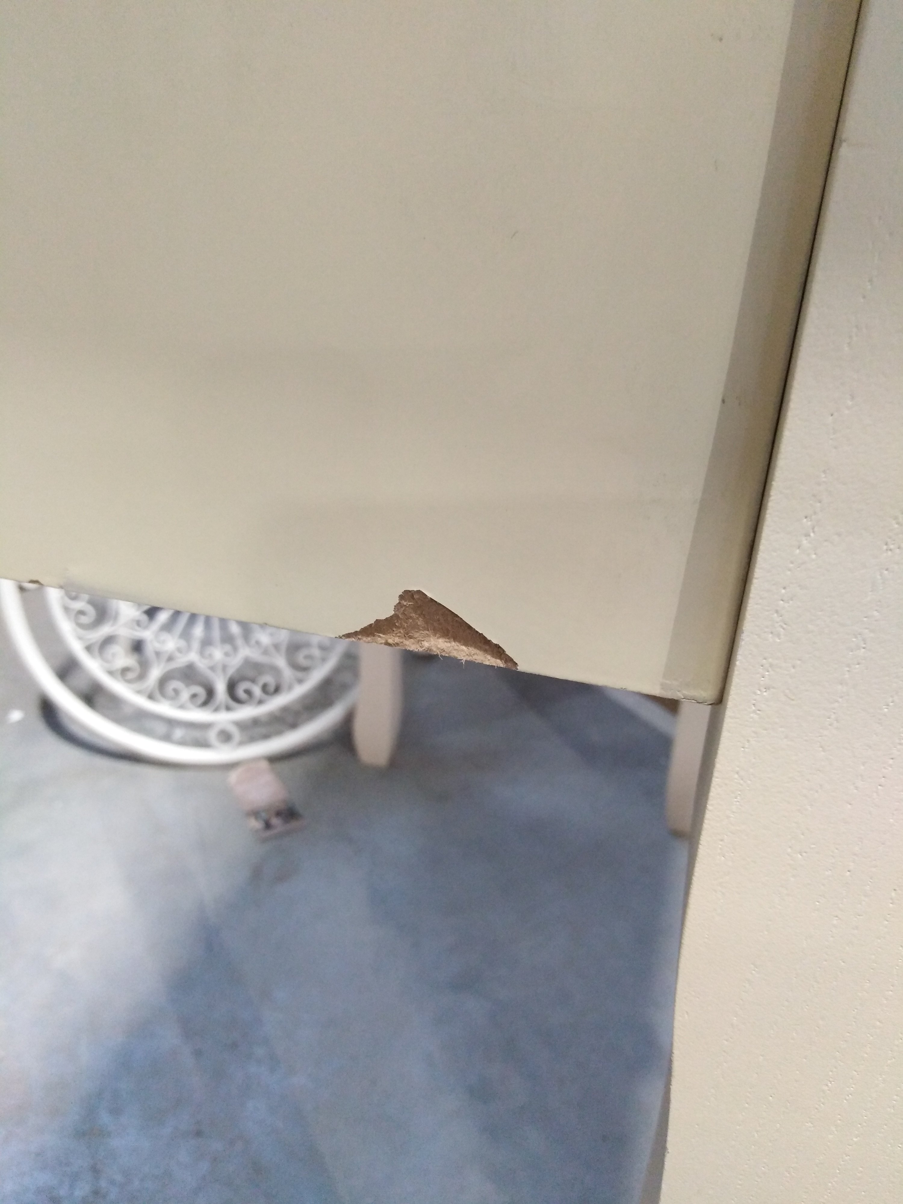 Описание дефекта: многочисленные вмятины на ножках , на столешнице , нарушен угол столешницы -расслоение лкп