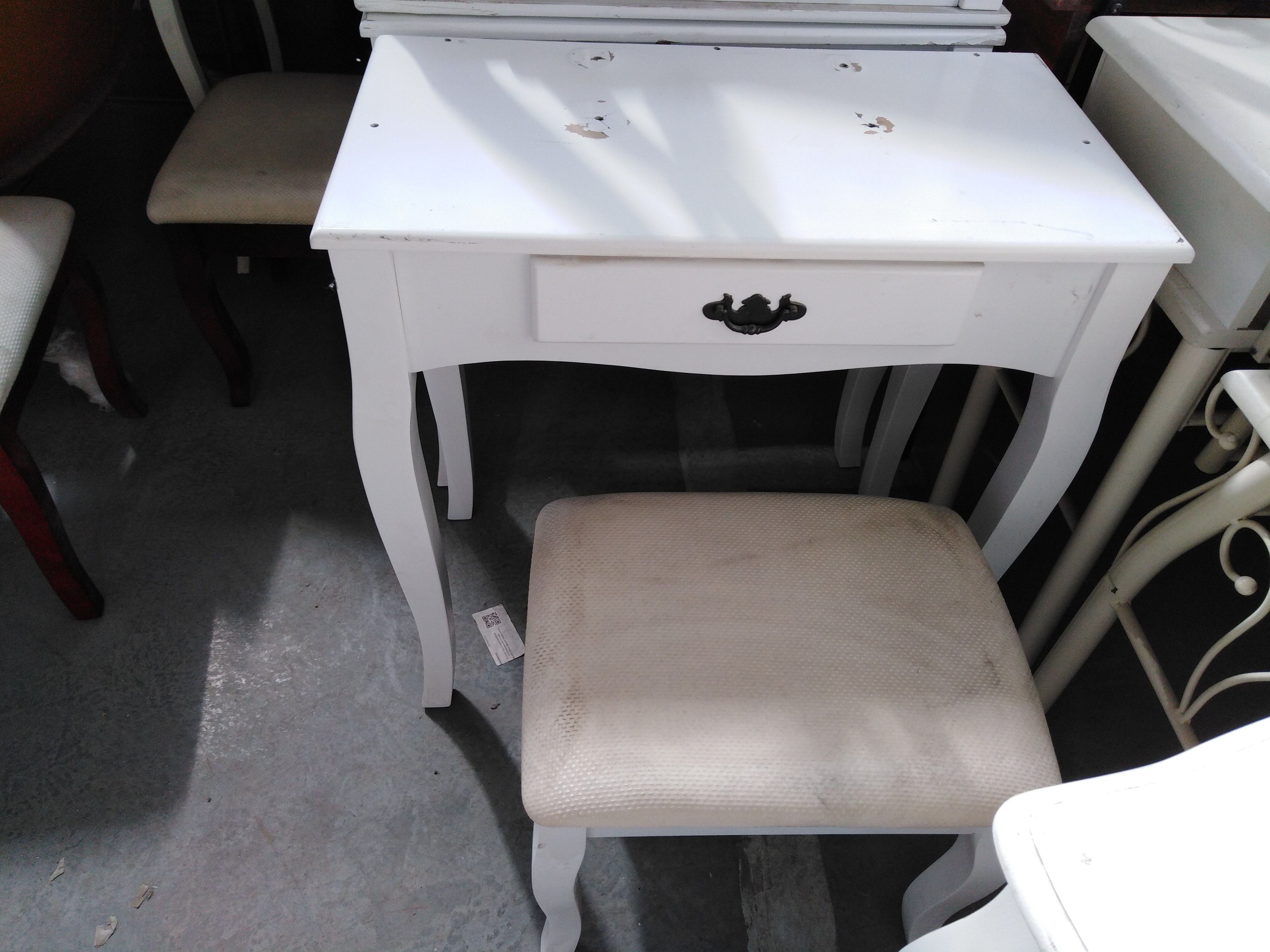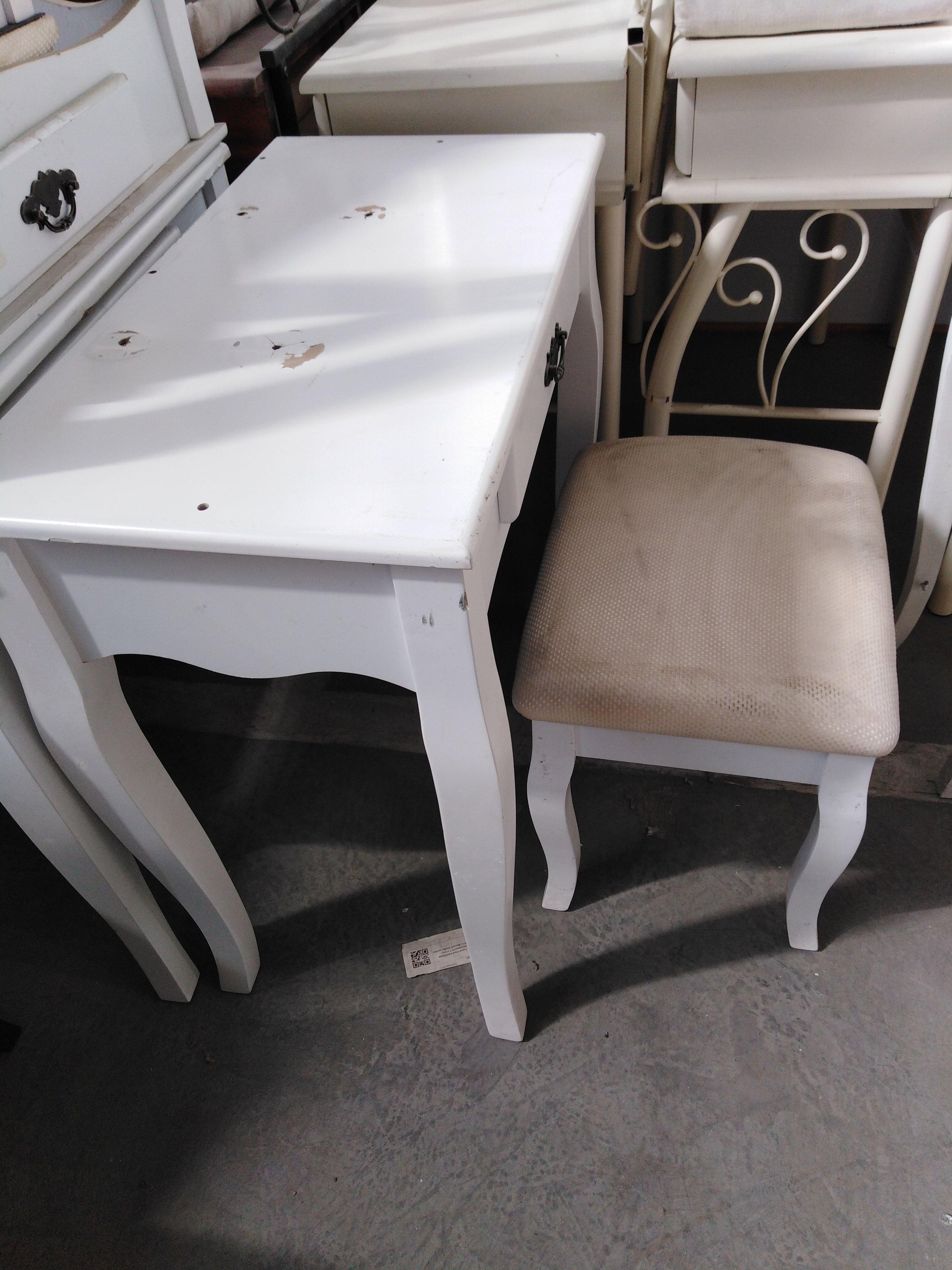 Описание товара без дефектов: Туалетный столик с 3 выдвижными ящиками и зеркалом с поворотным механизмом. Пуф с мягким сиденьем в комплекте. Материал: МДФ/дерево, обивка - ткань. Цвет: дерево - белый (white), ткань - бежевый. Размеры: 76х40,5х135,5 см