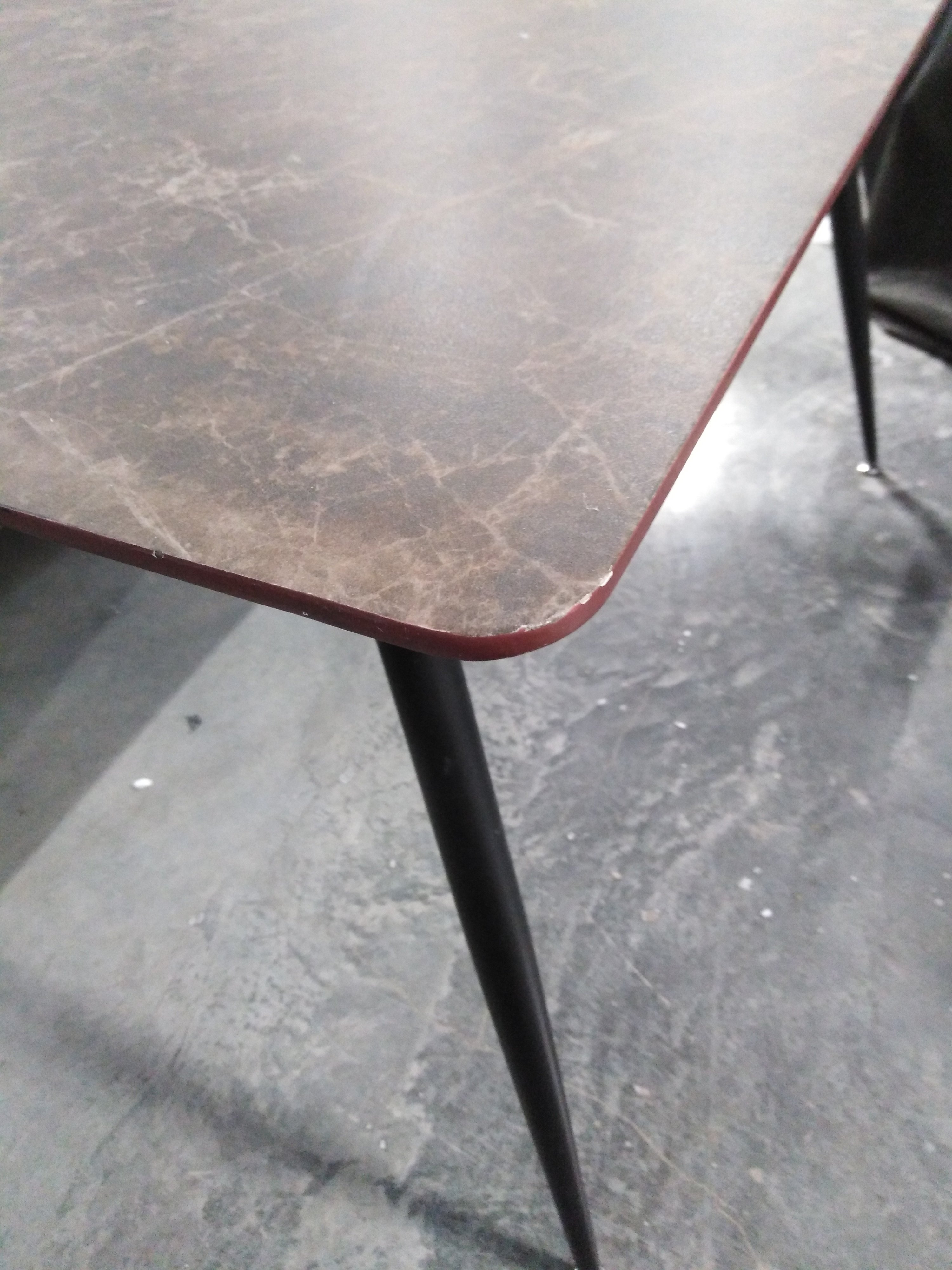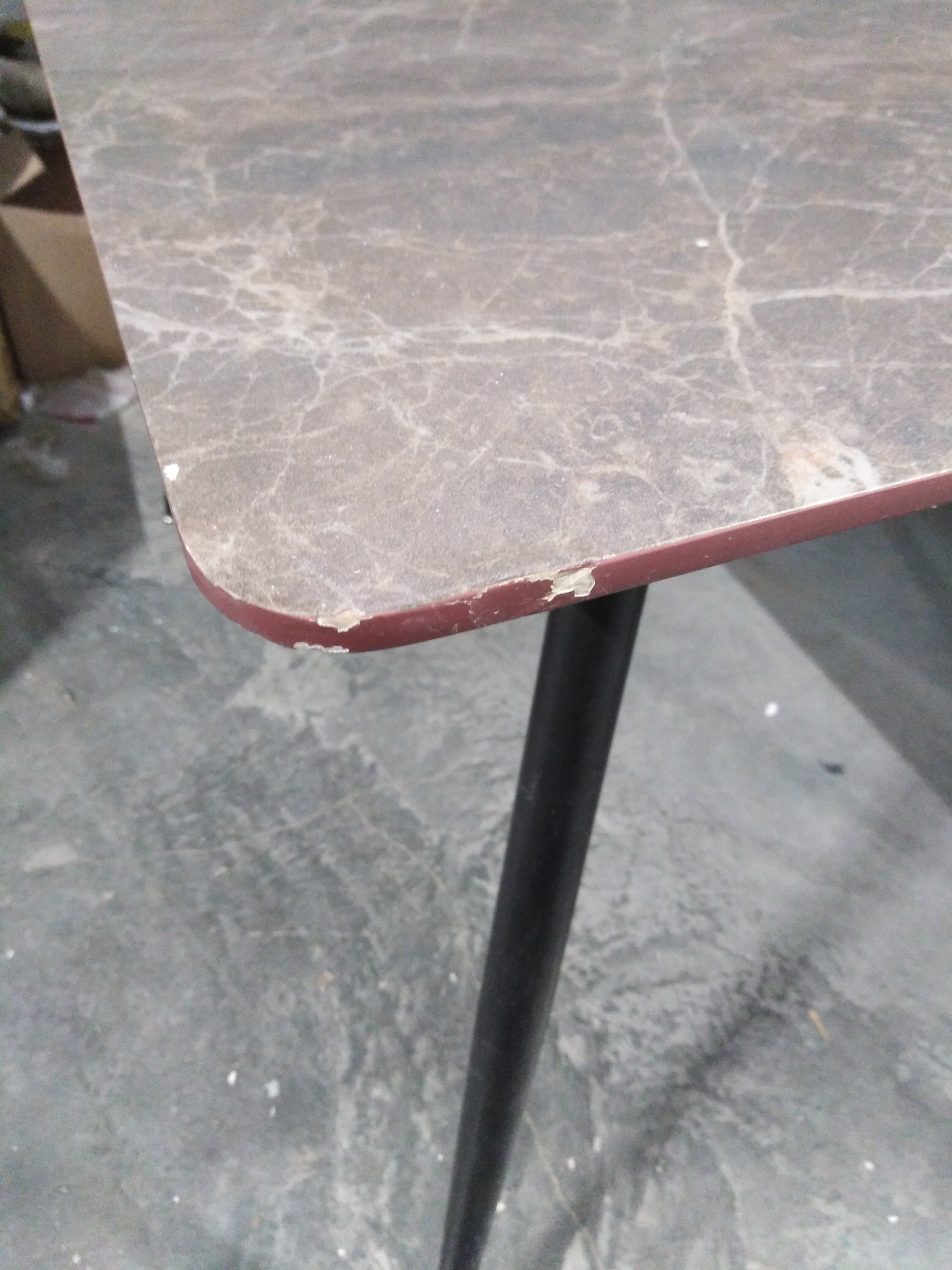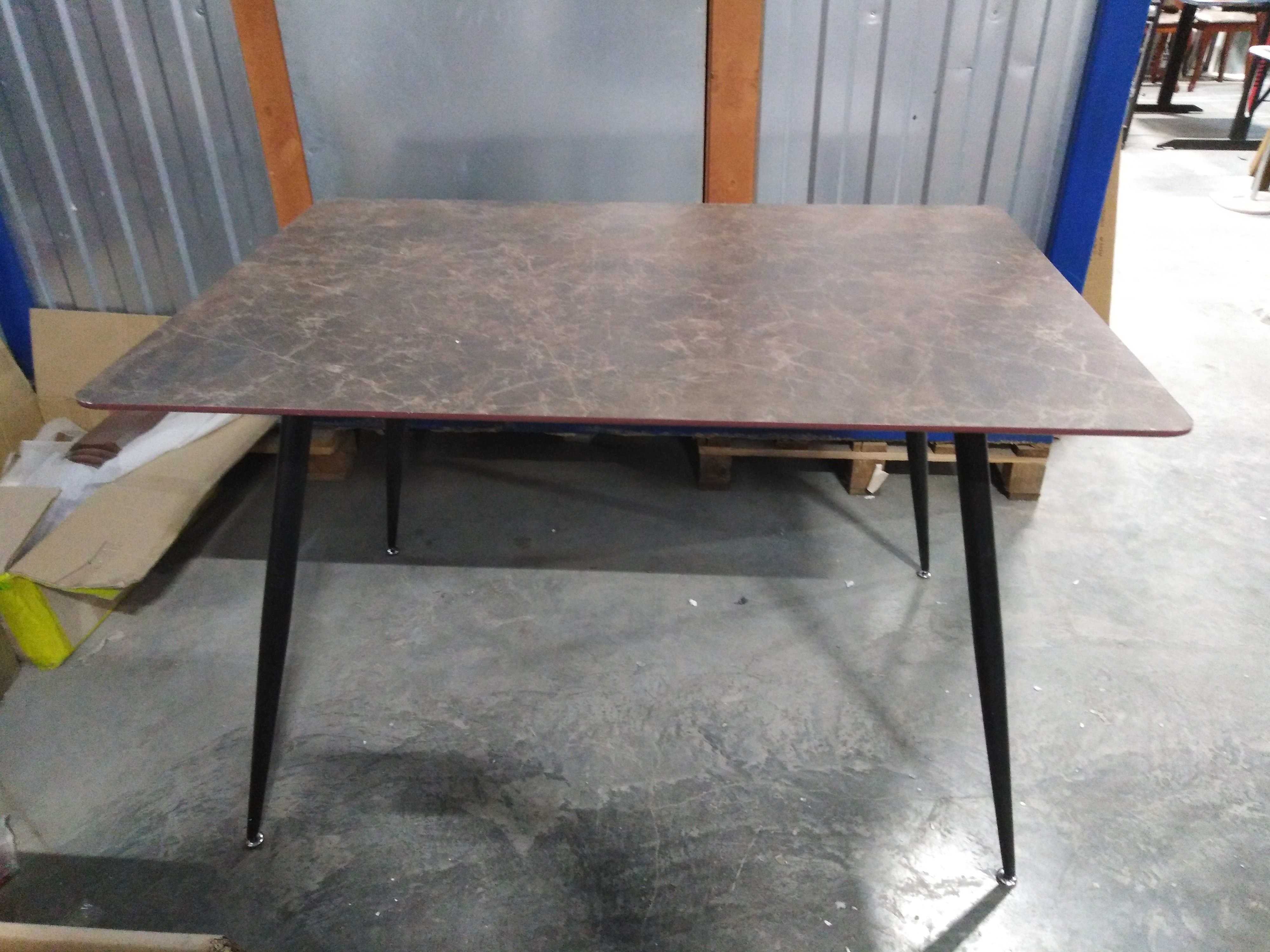 Описание товара без дефектов: Материал: ножки - металл, столешница - ламинированный МДФ. Размеры: 120х80х76 см