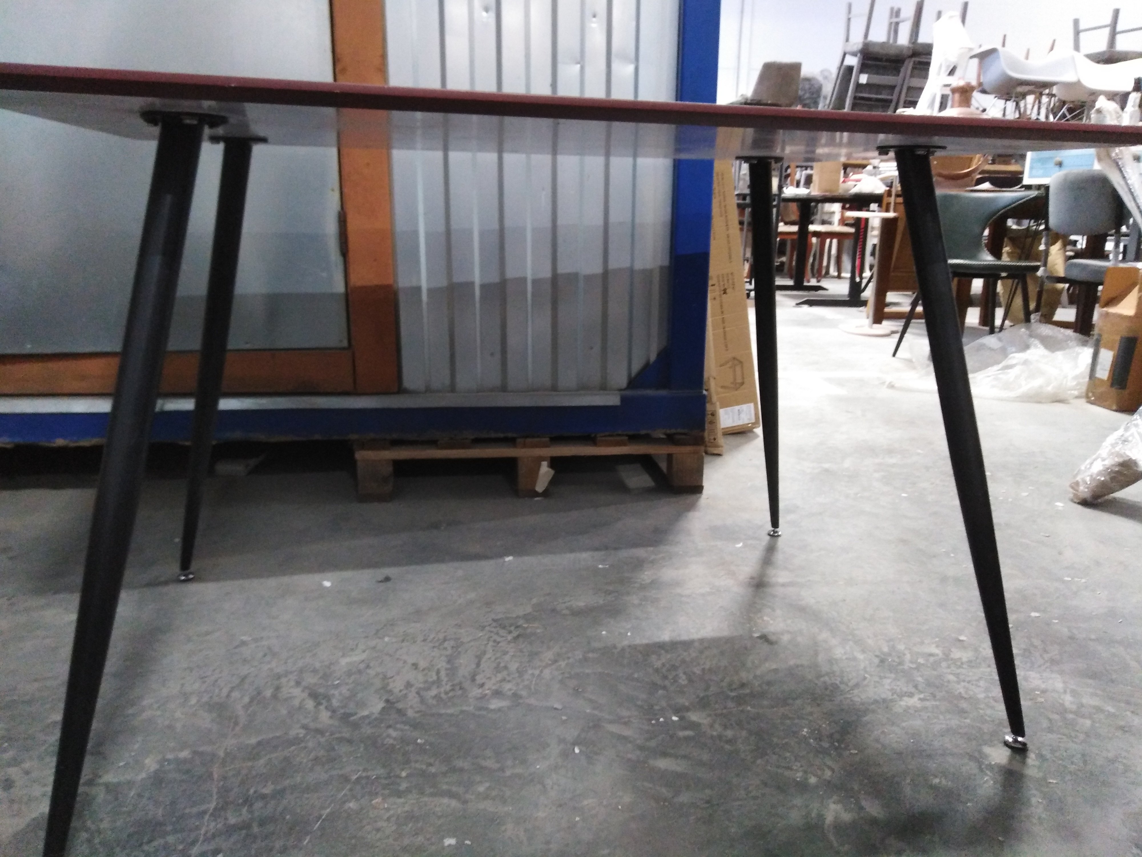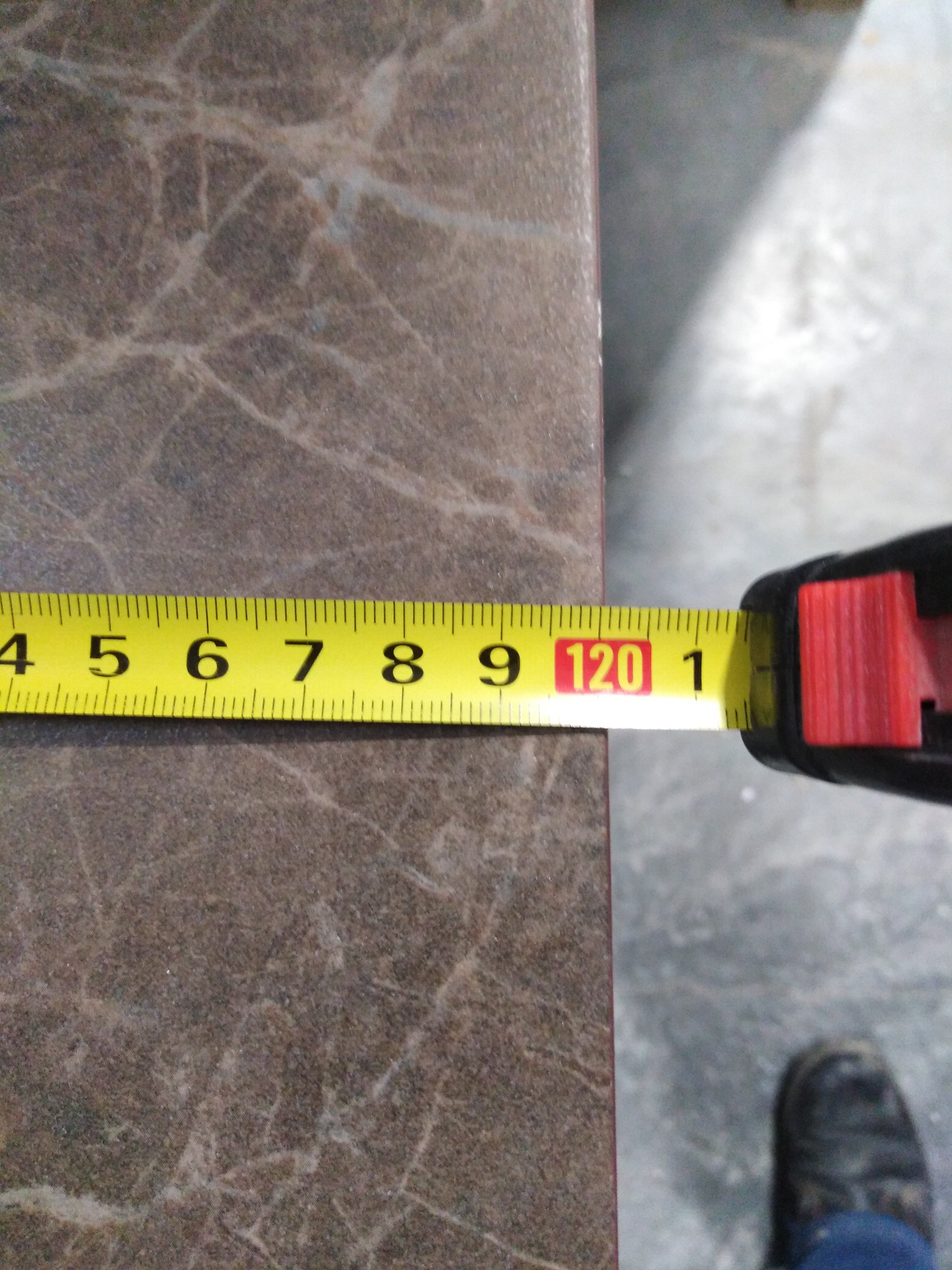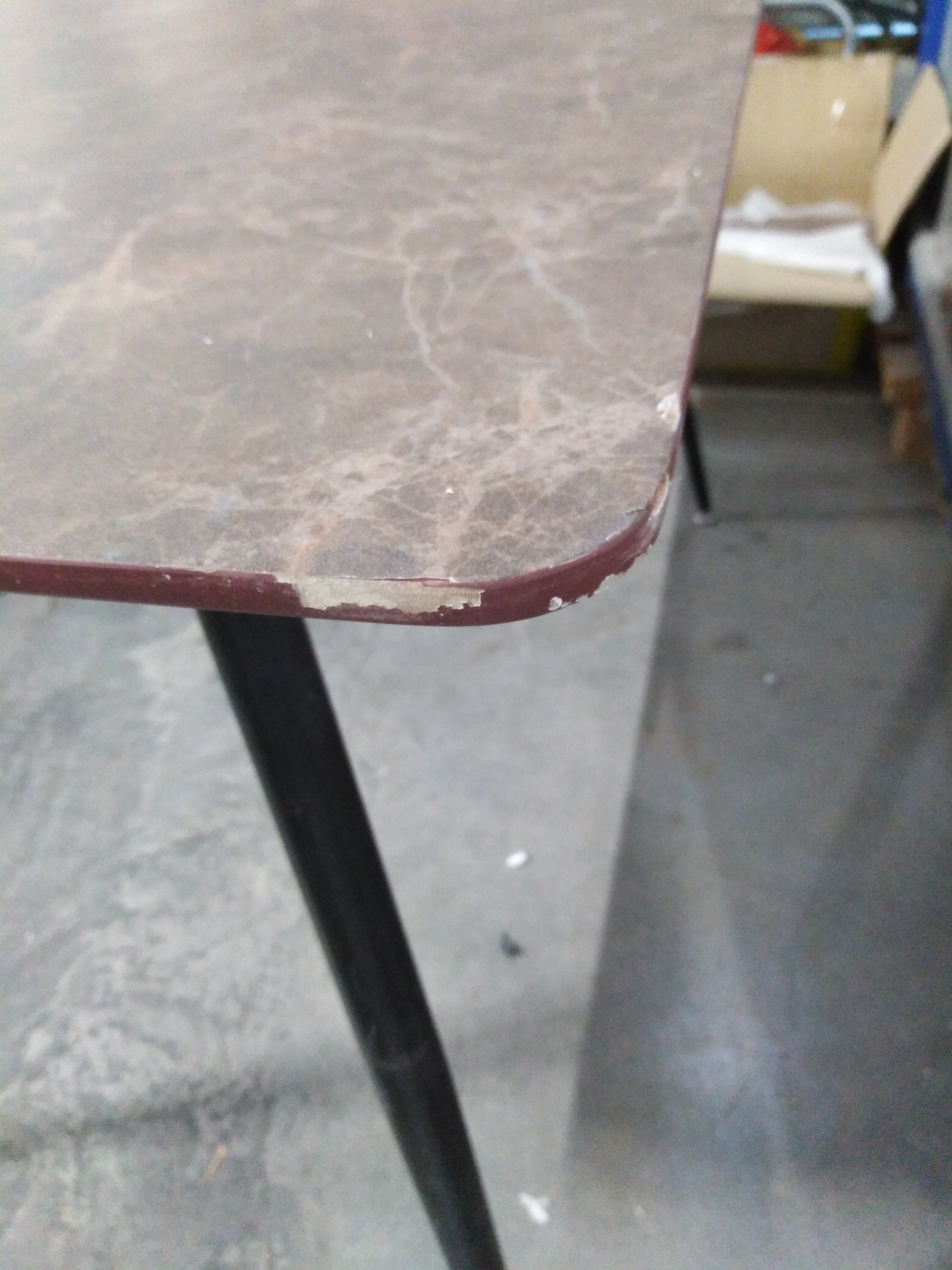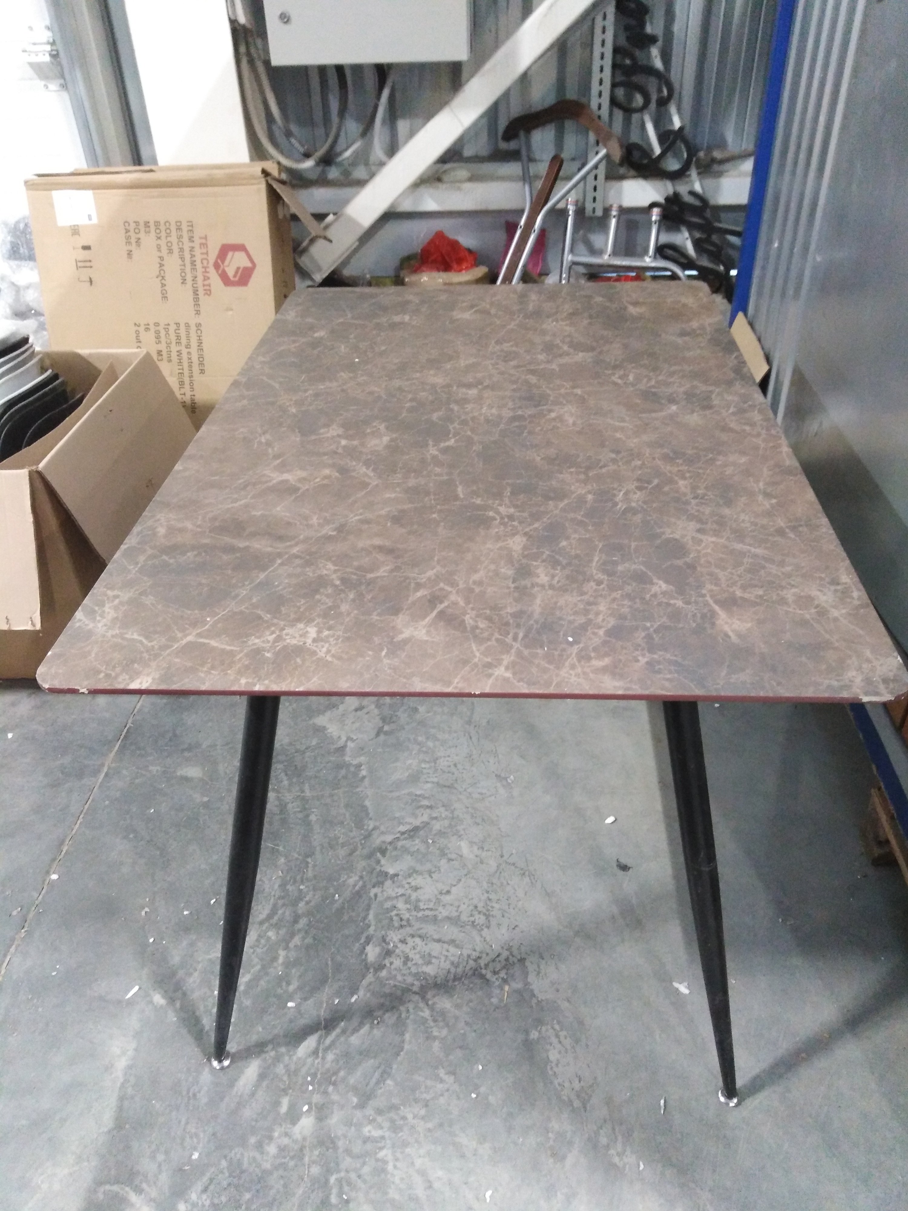 Описание товара без дефектов: Материал: ножки - металл, столешница - ламинированный МДФ. Размеры: 120х80х76 см