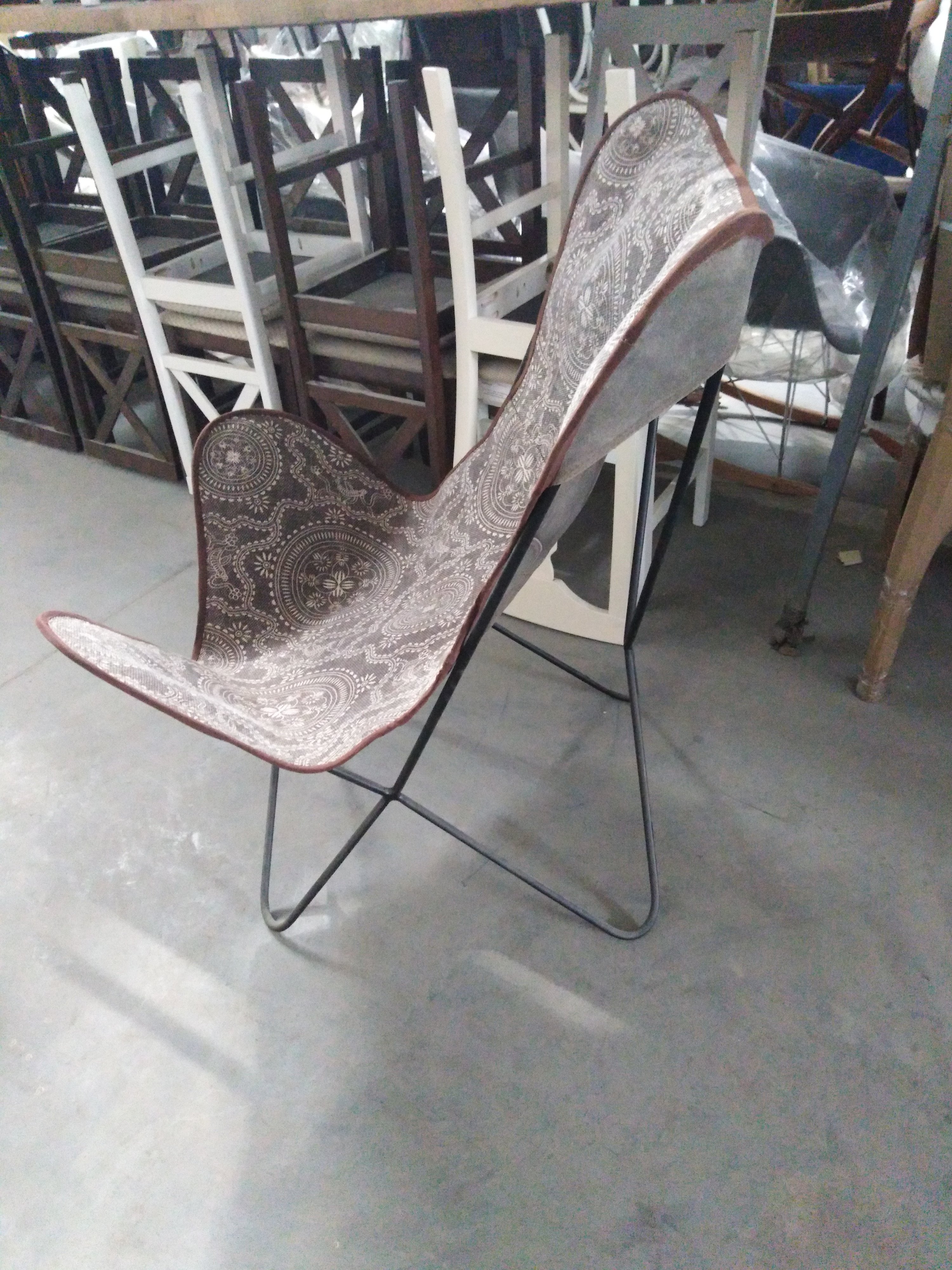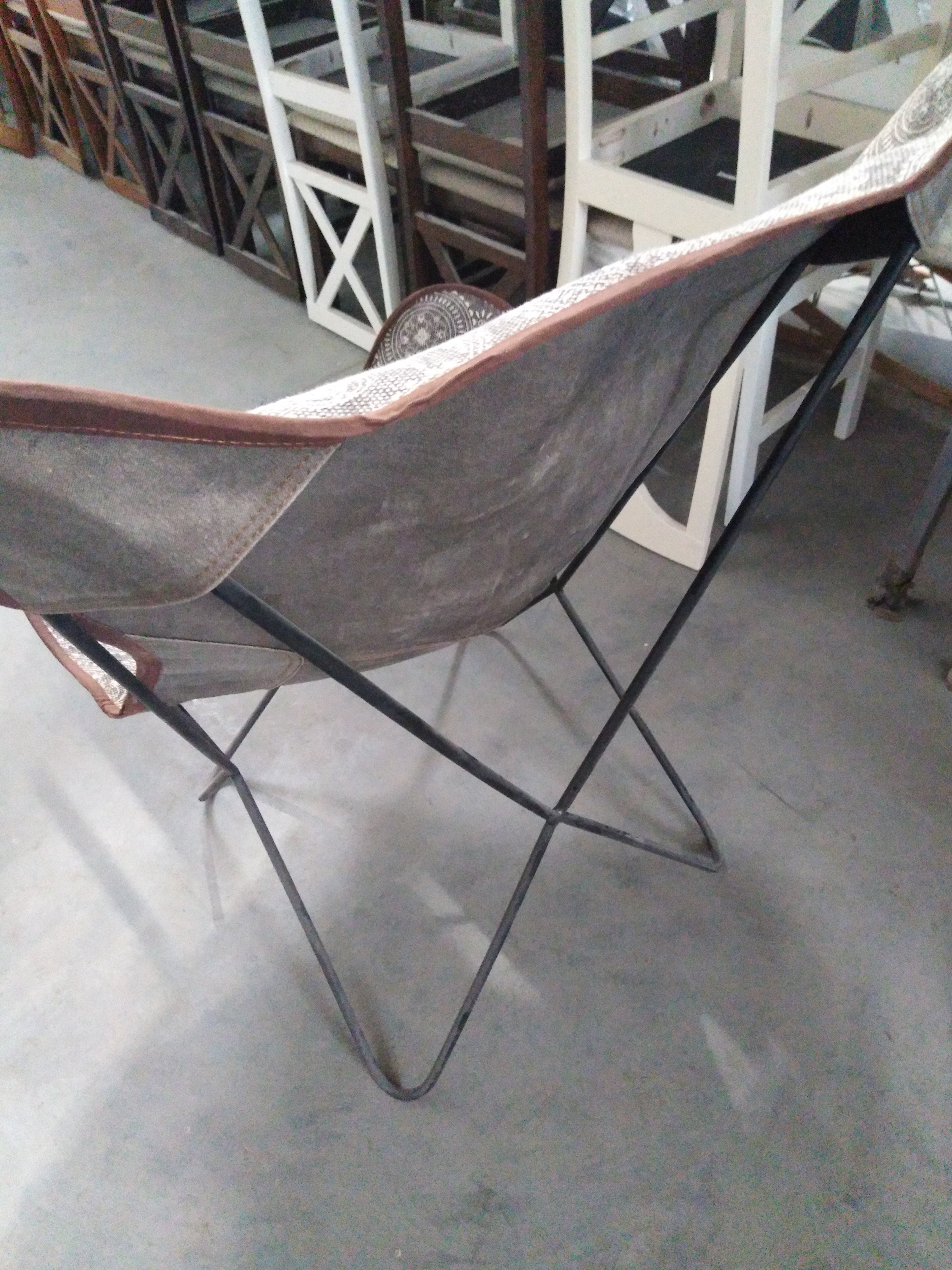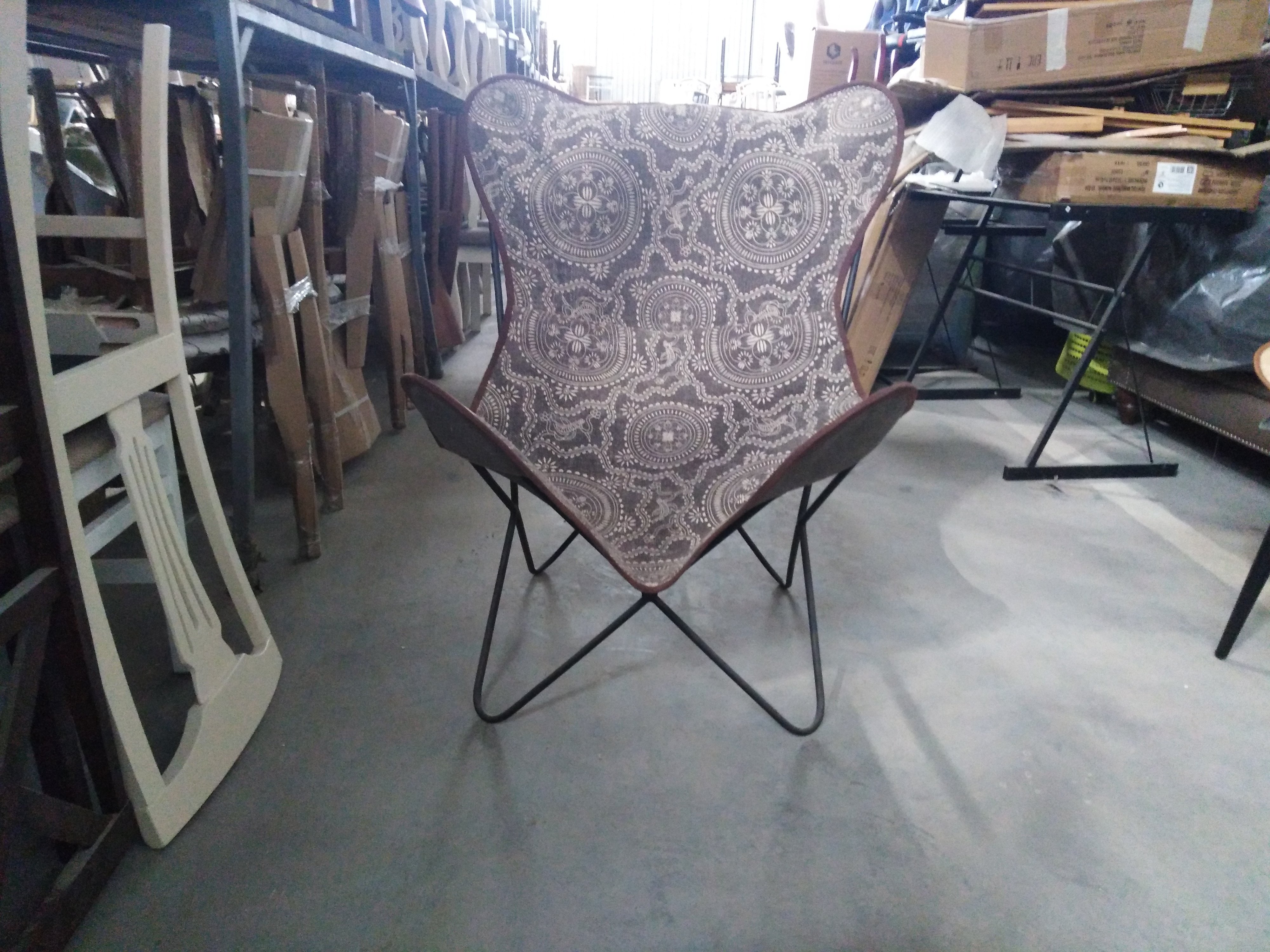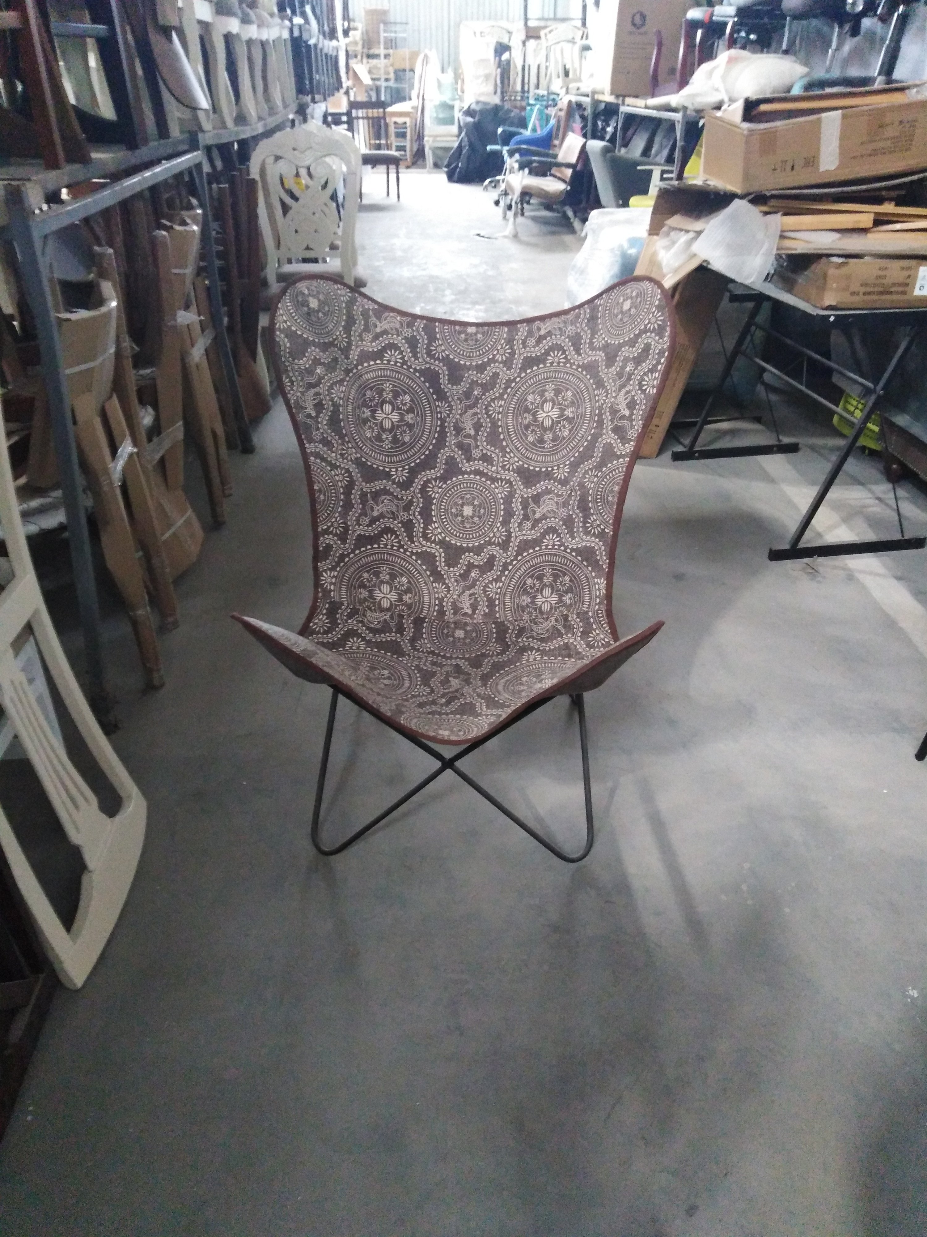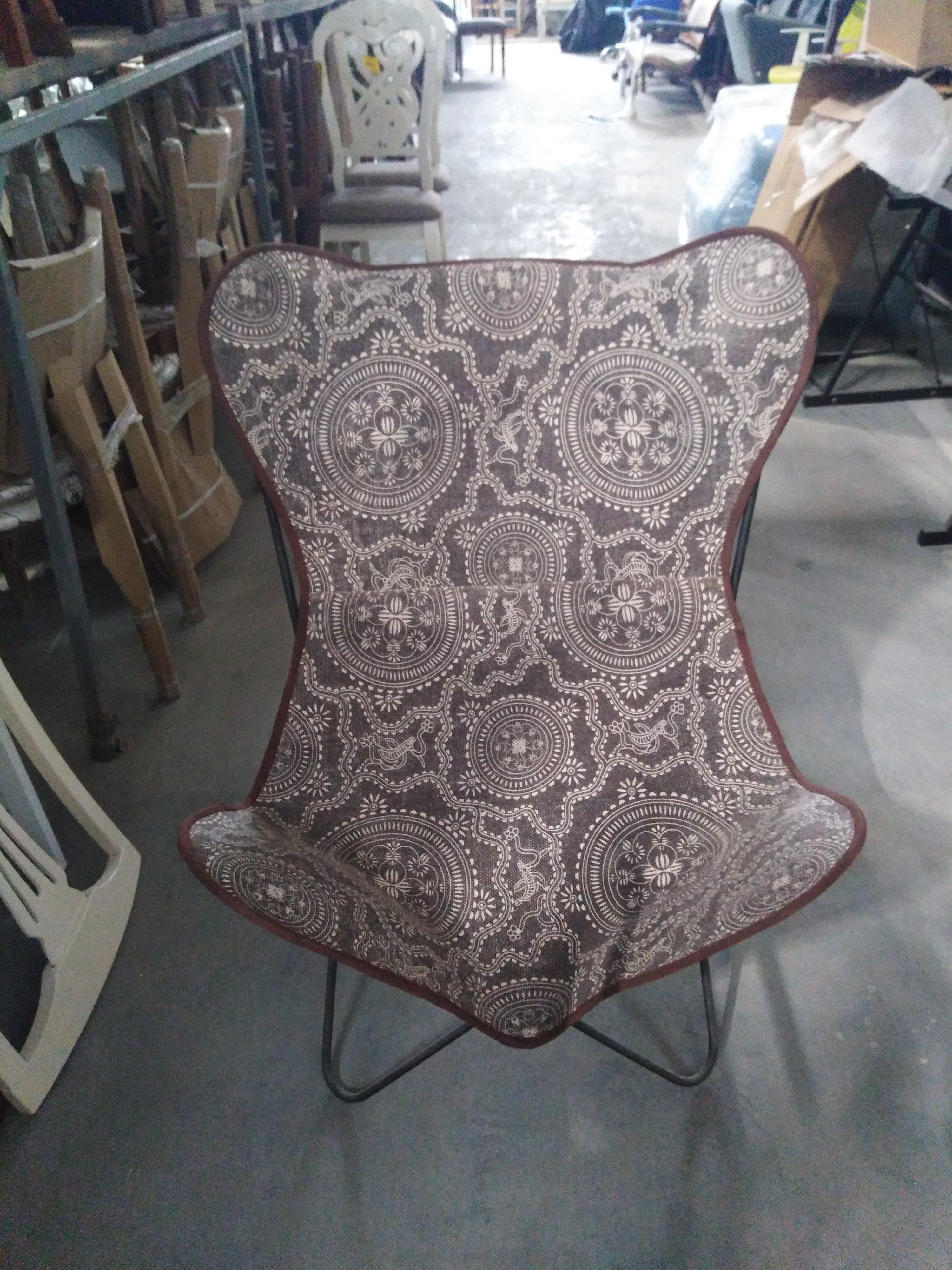Описание товара без дефектов: Материал: каркас - металл, чехол - ткань. Цвет: металл - чёрный, ткань - белый принт на коричневом фоне, кант по краю чехла - коричневый. Размеры: 75х75х90 см