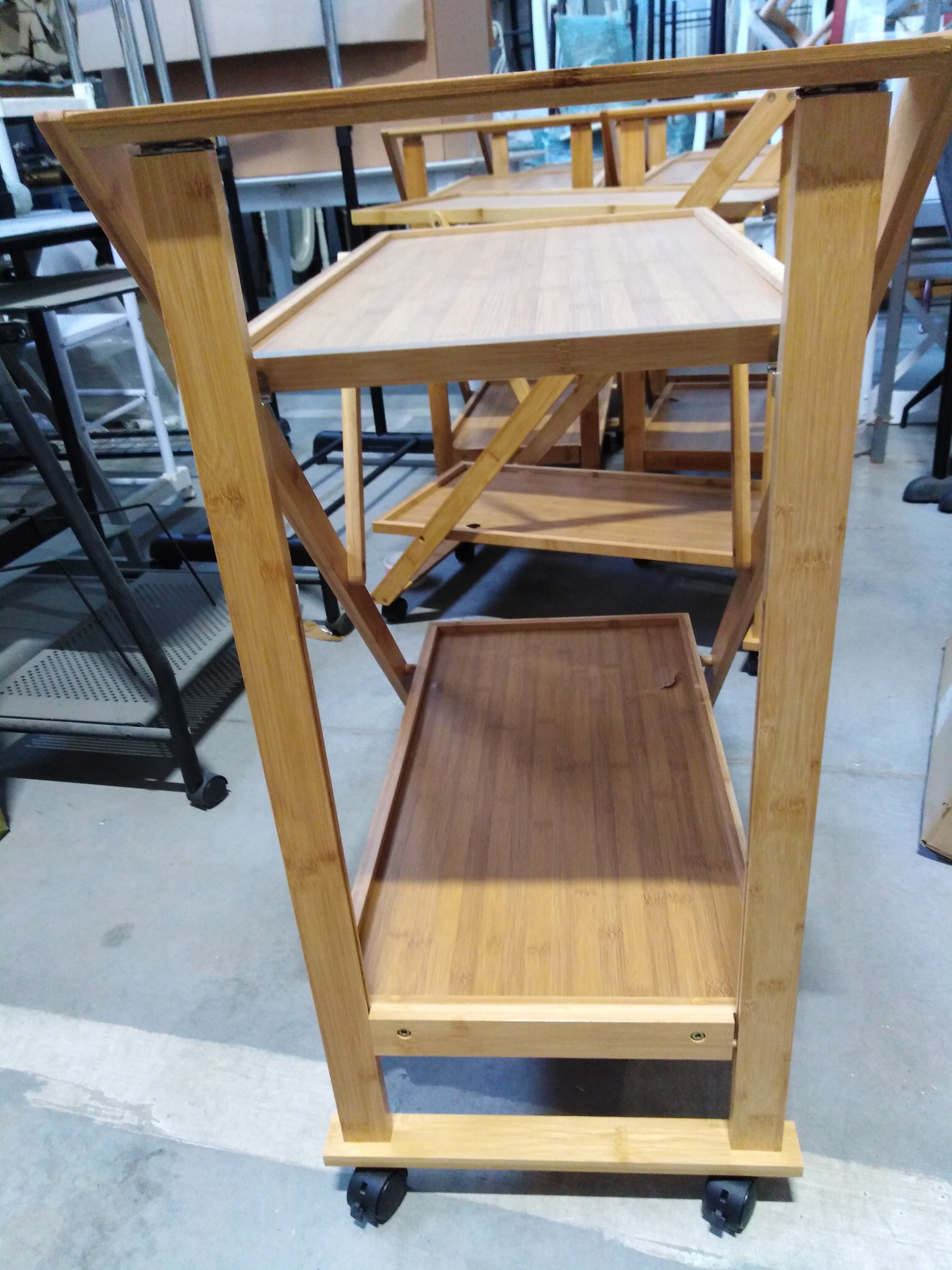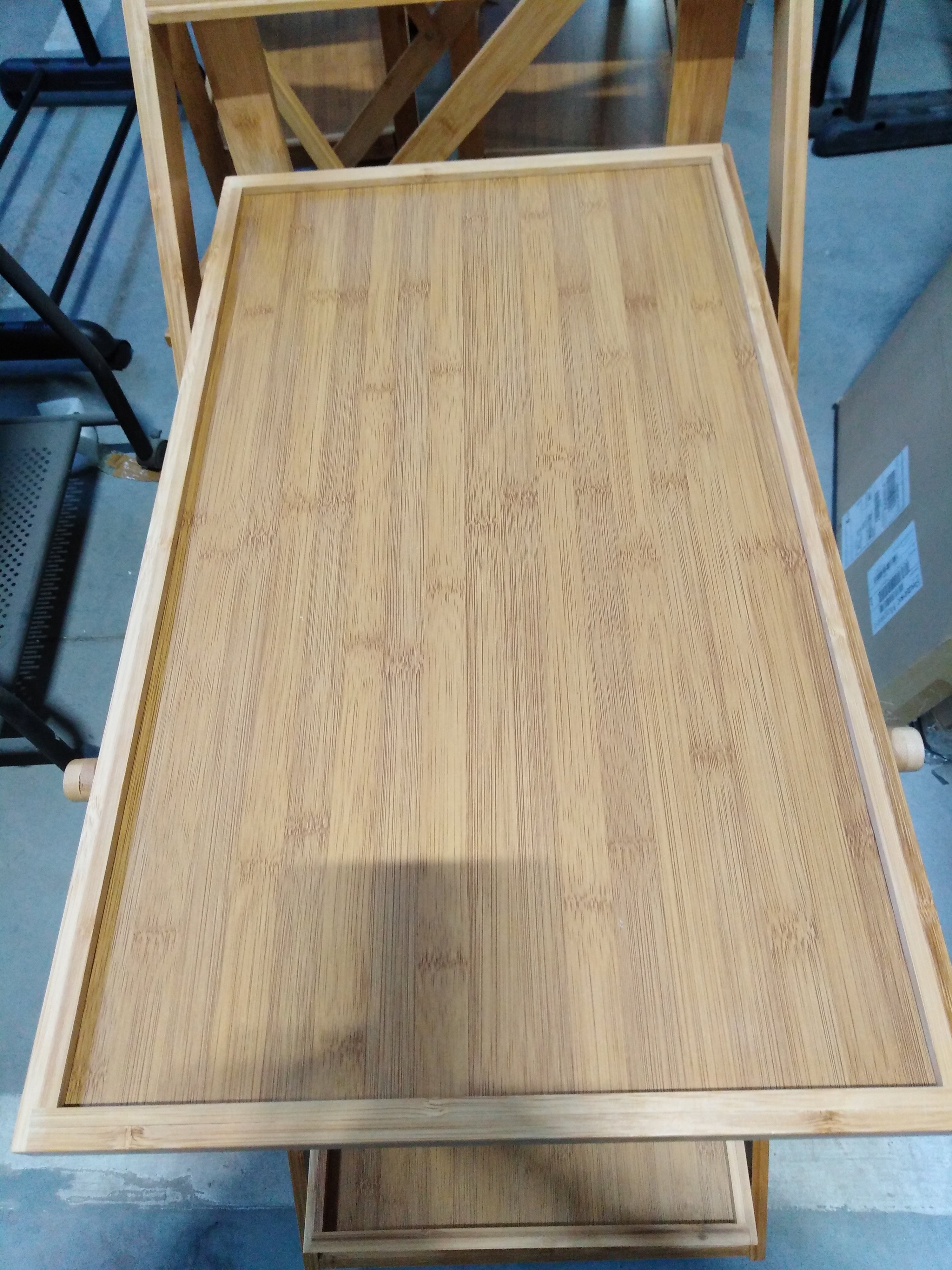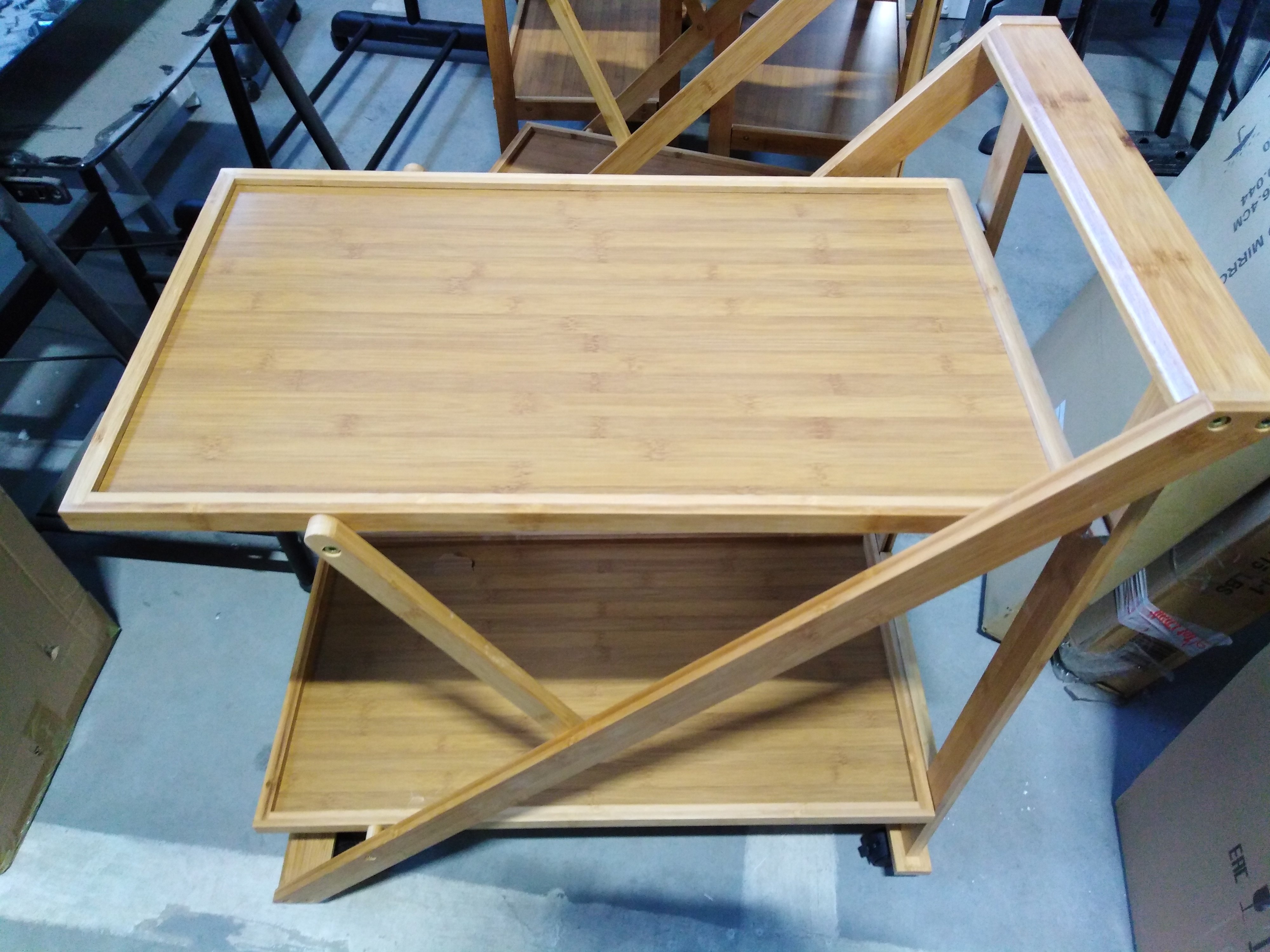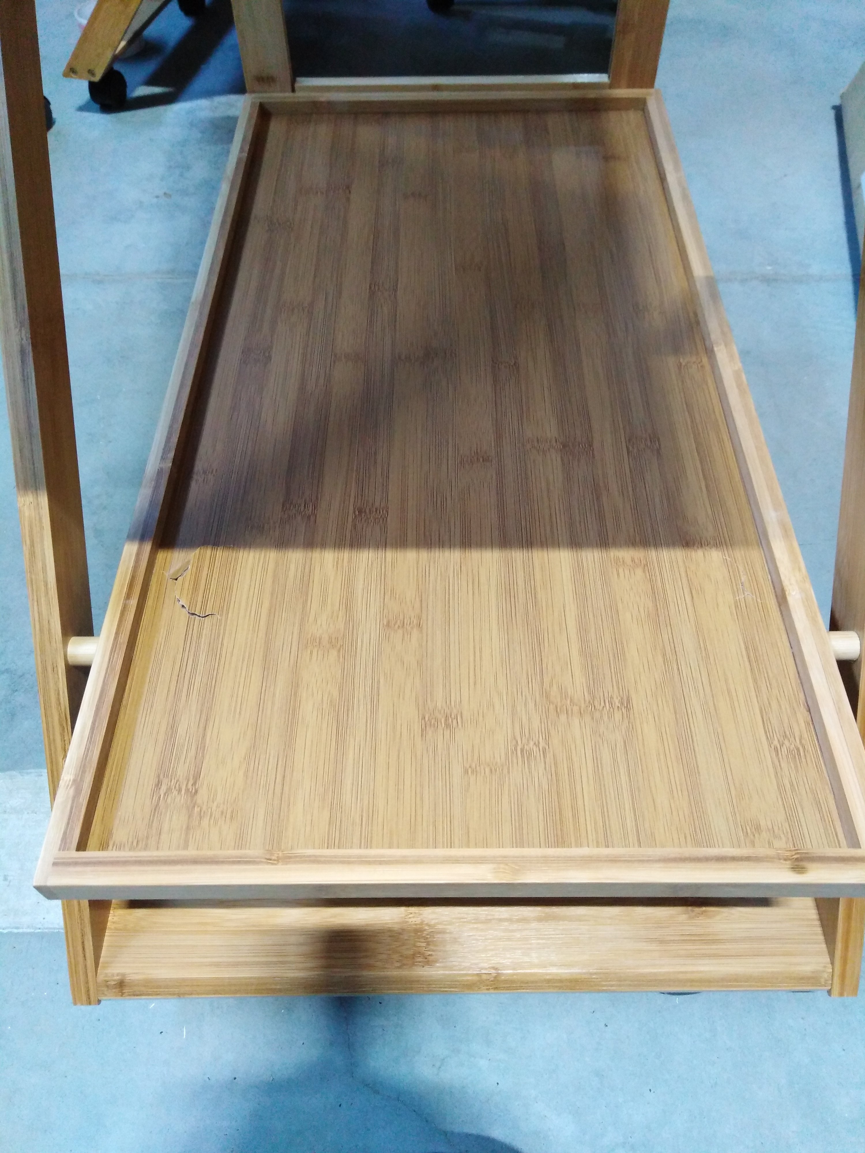 Описание товара без дефектов: Основание на колёсиках. 2 столешницы. Материал: прессованный бамбук. Цвет: натуральный. Размеры: 72х42х81,5 см