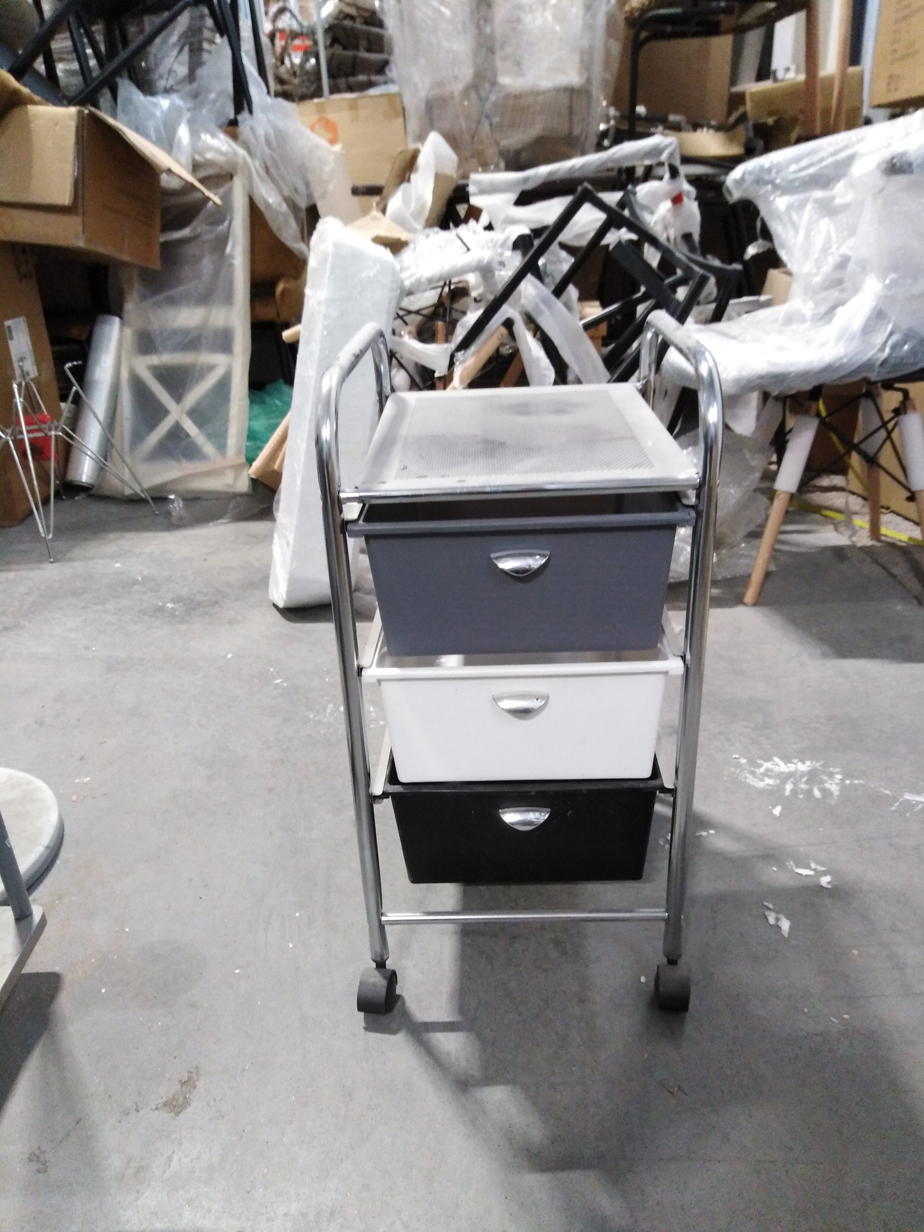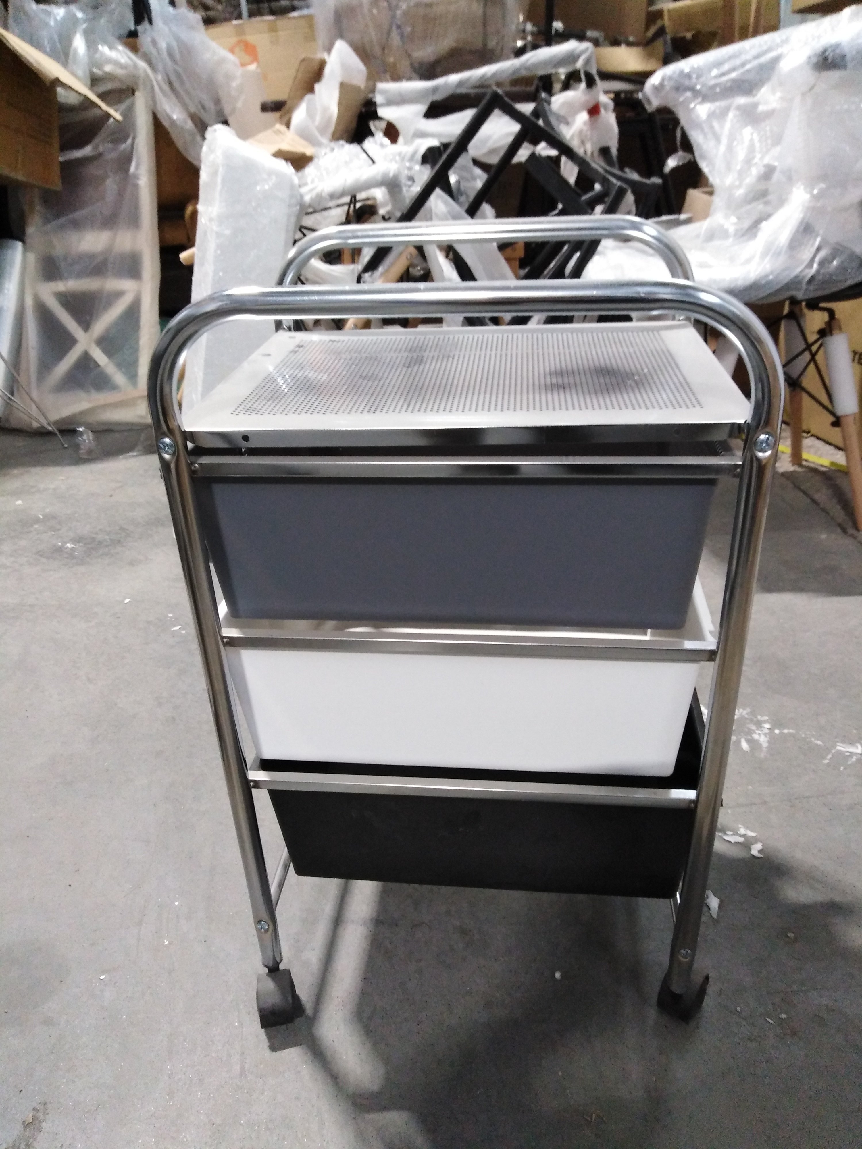 Описание товара без дефектов: Столик c 3 пластиковыми ящиками для хранения на колёсиках. Материал: металл/пластик. Цвет: хром/чёрный/белый/серый. Размеры: 39х33х59,5 см