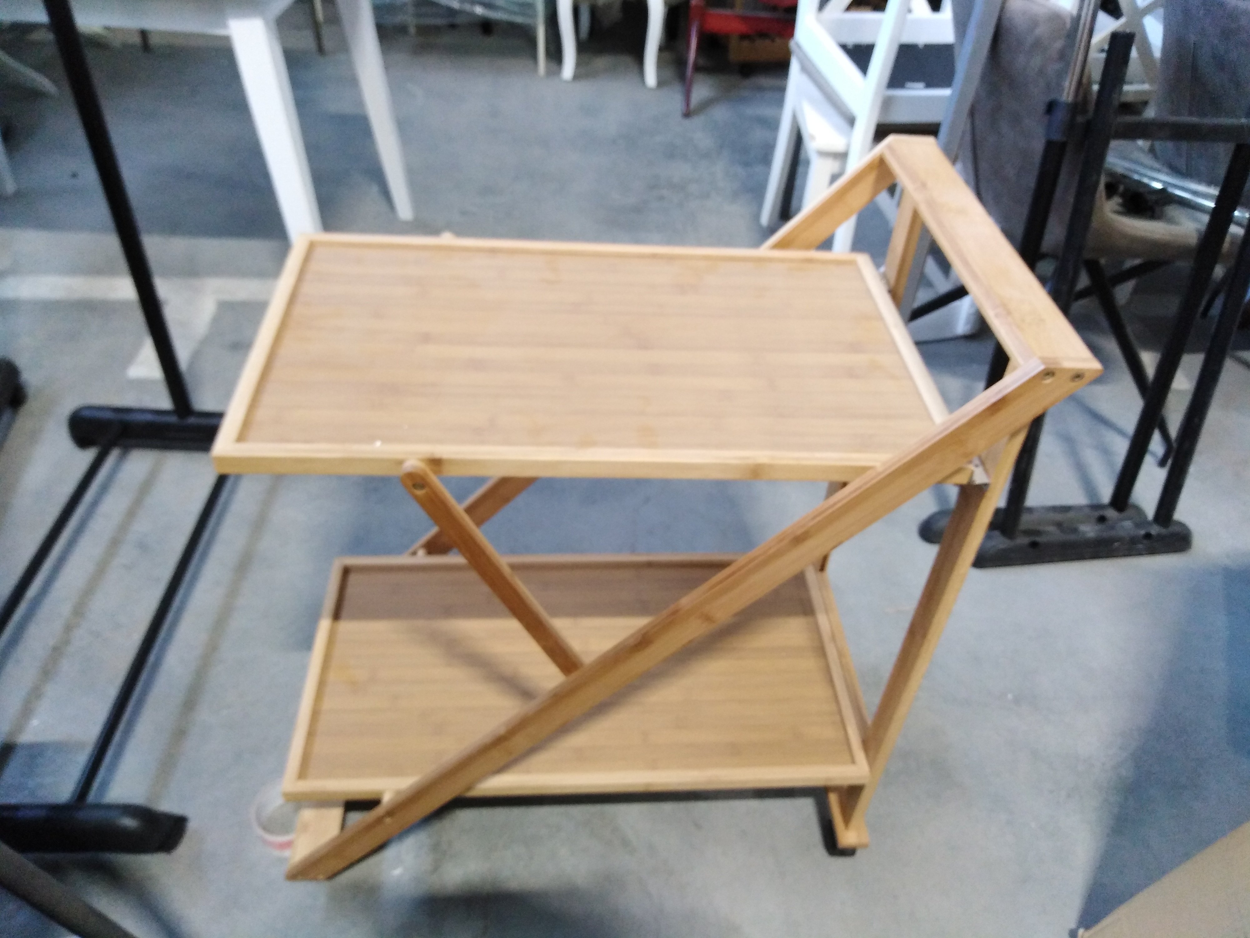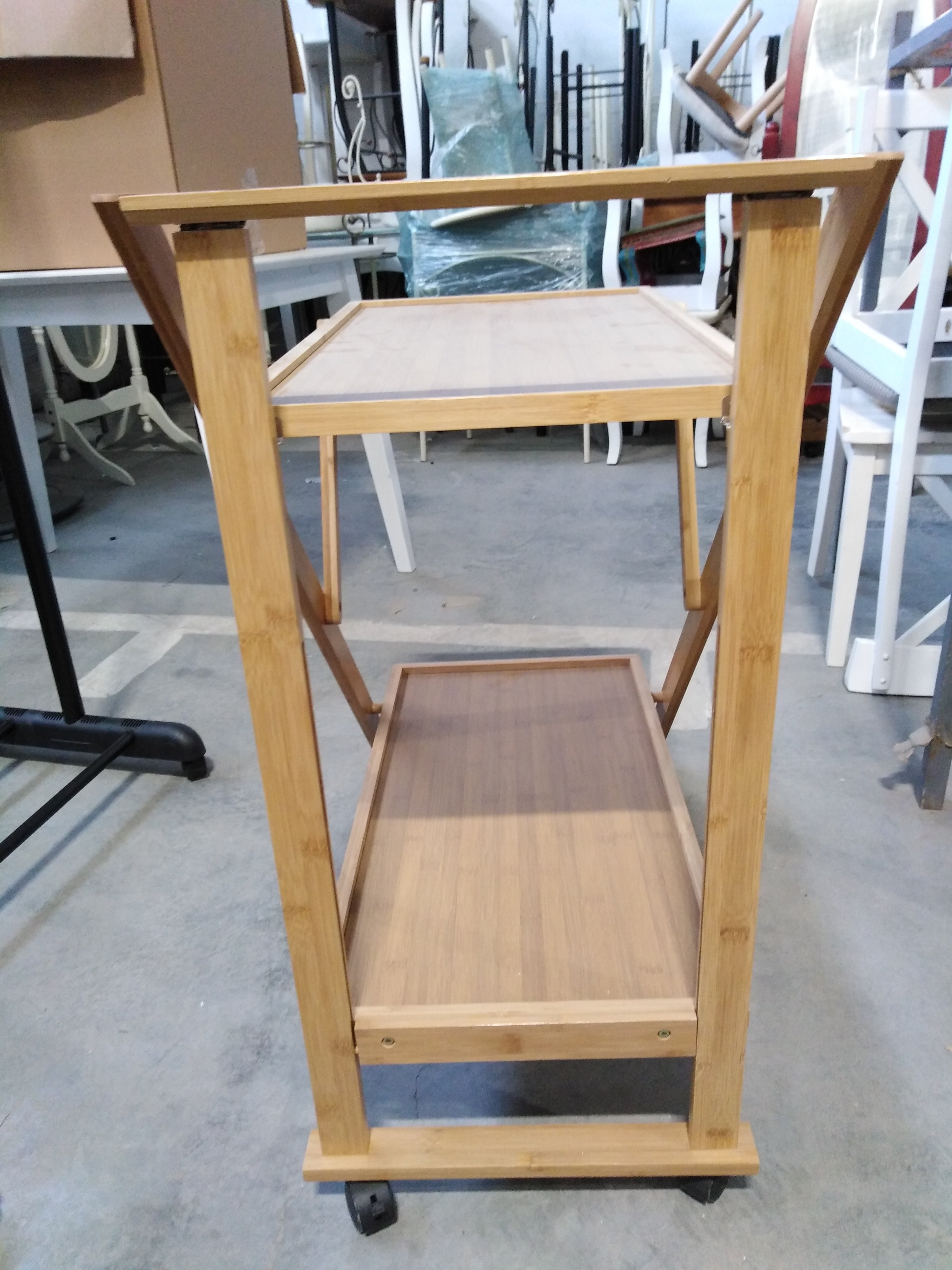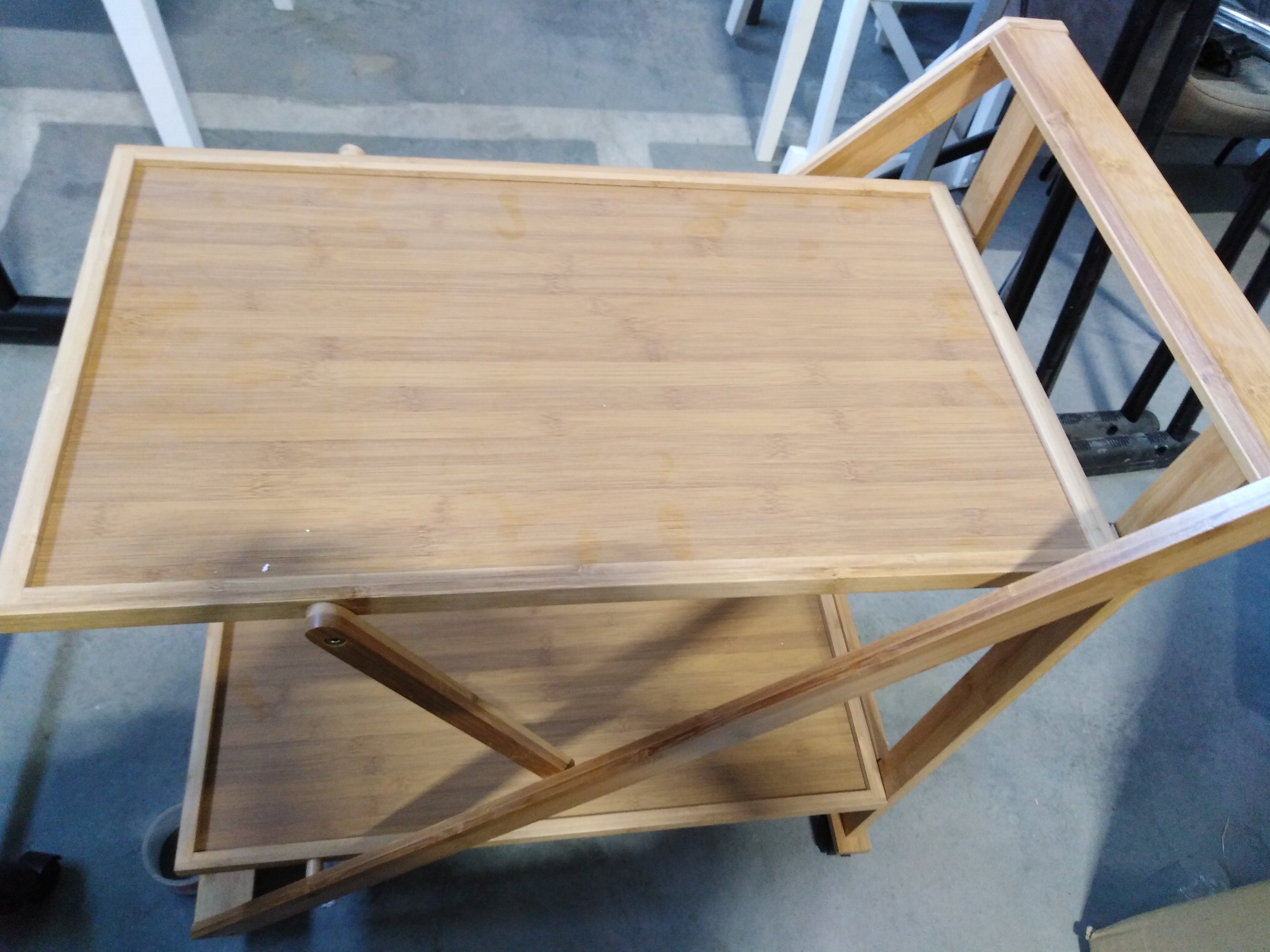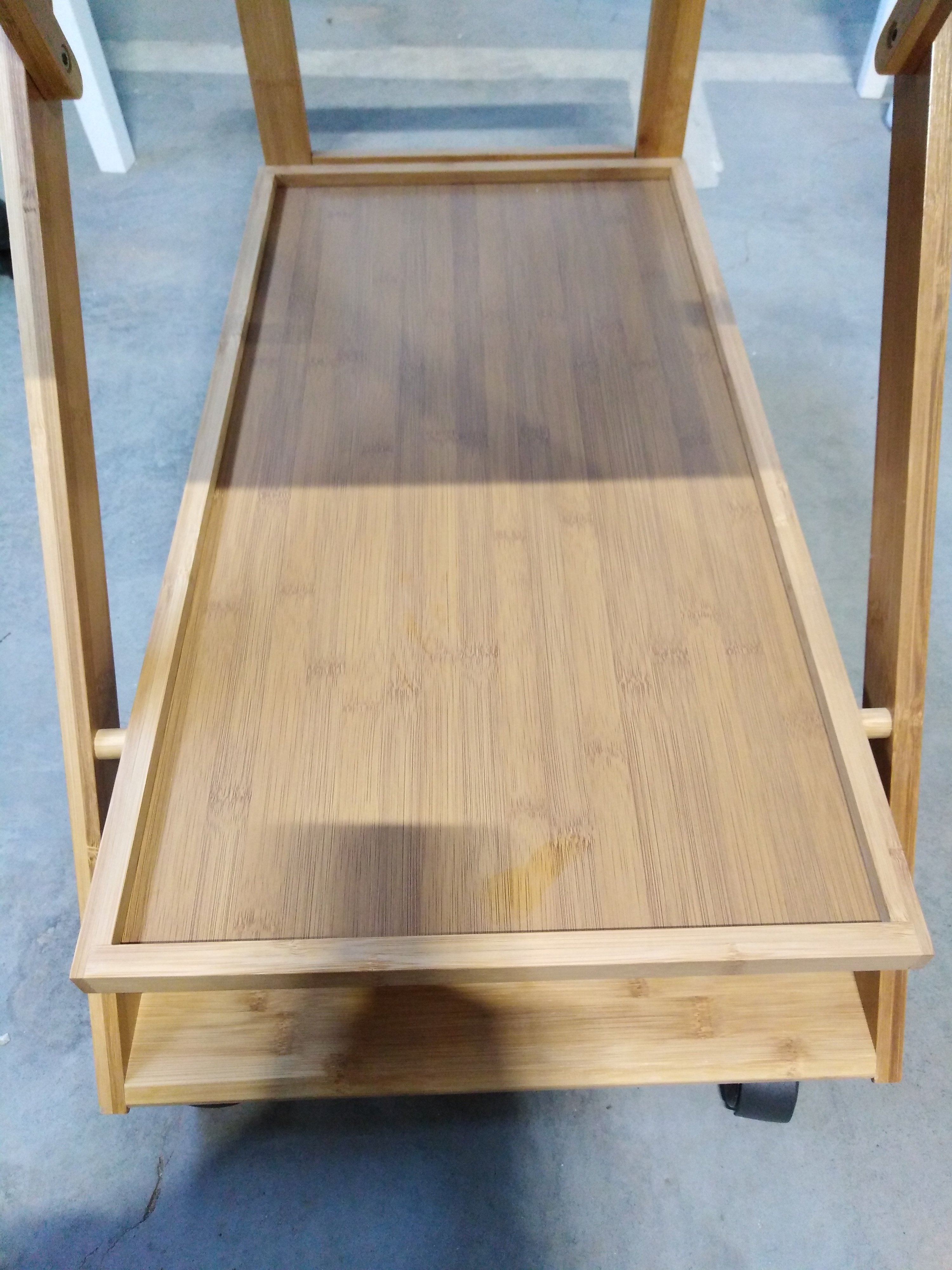 Описание товара без дефектов: Основание на колёсиках. 2 столешницы. Материал: прессованный бамбук. Цвет: натуральный. Размеры: 72х42х81,5 см