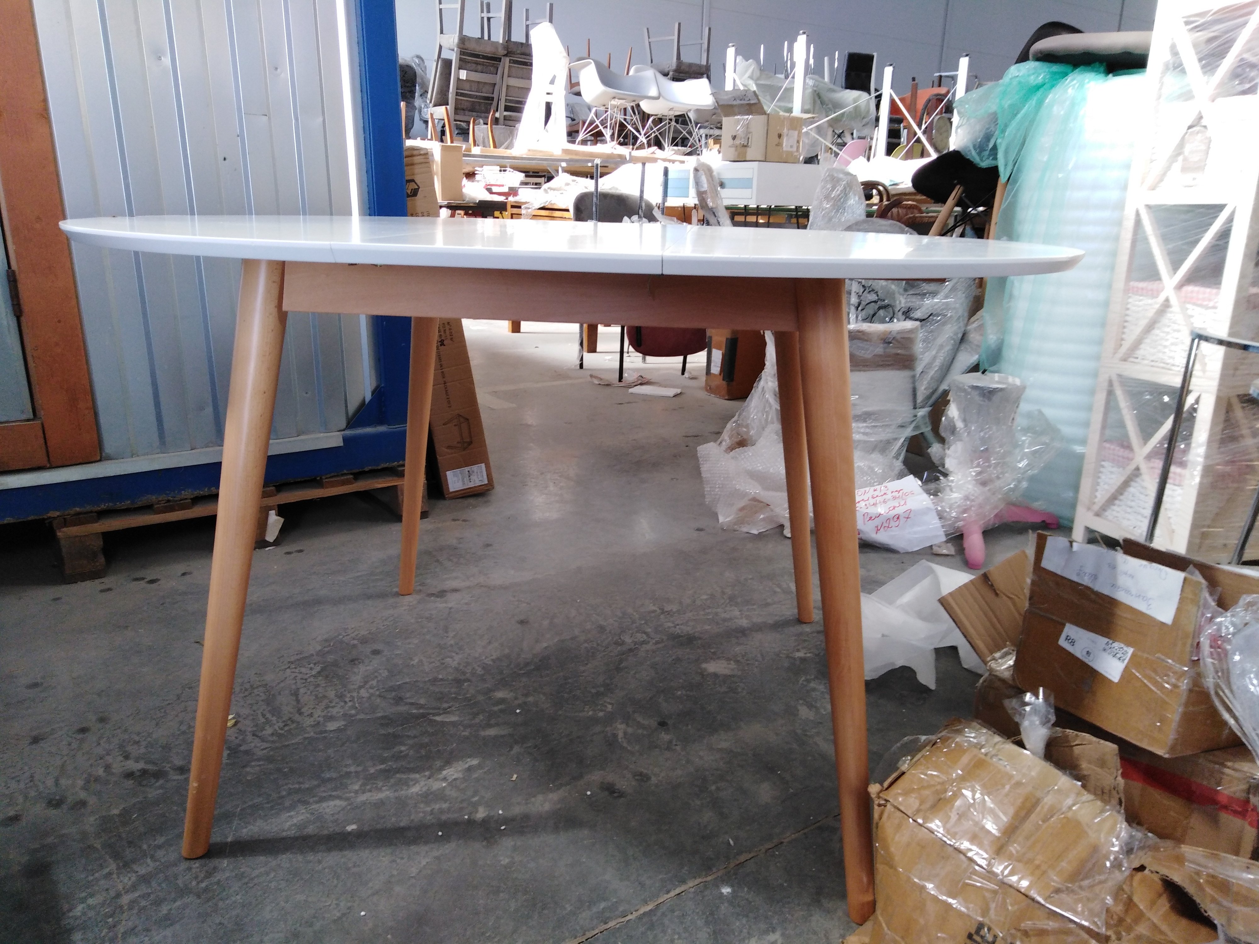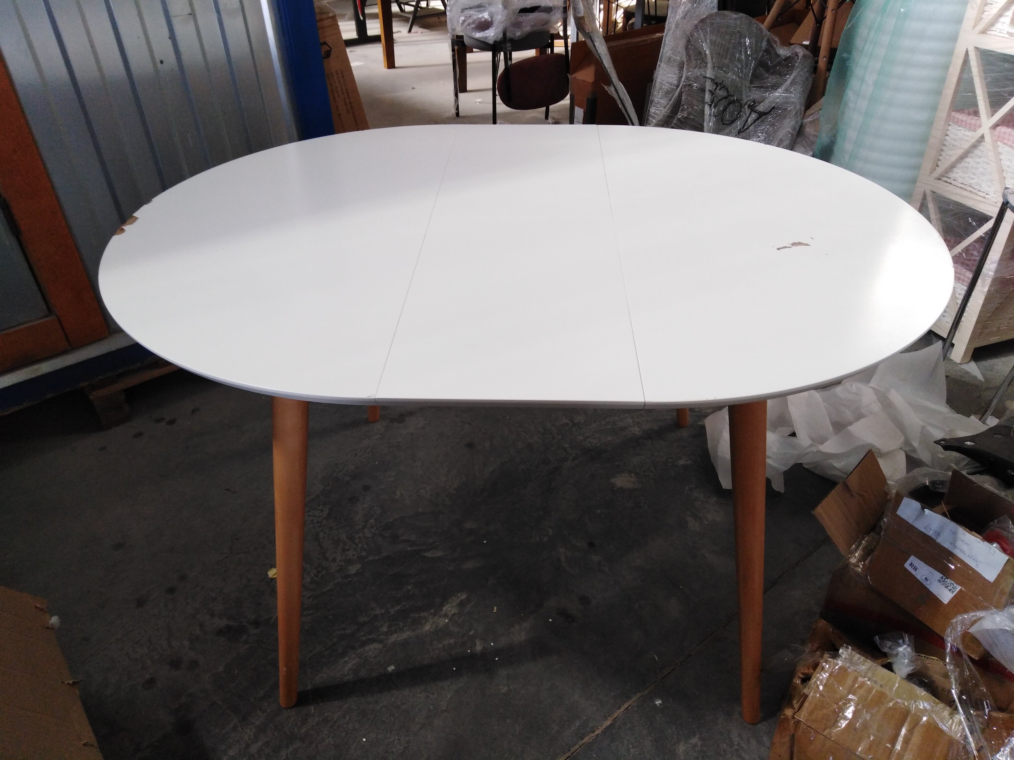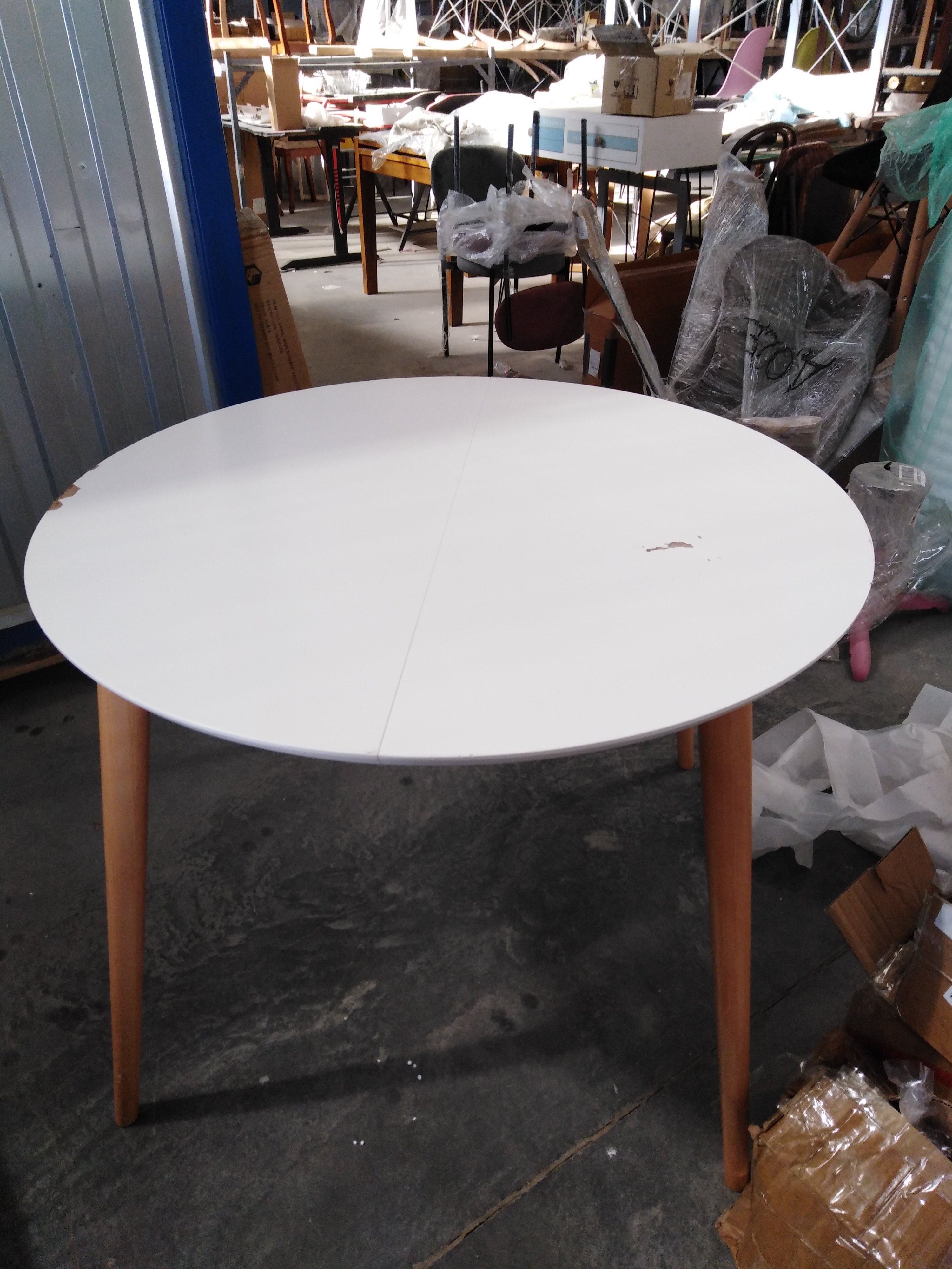 Описание товара без дефектов: Стильный обеденный стол BOSCO из Датской коллекции отлично дополнит интерьер загородного дома, городской квартиры, кухни, гостиной, кафе или ресторана. Удачное сочетание столешницы, покрашенной в белый цвет, и визуально легких ножек цвета натурального дерева выглядит стильно и привлекательно. Обеденный стол BOSCO хорошо впишется в любой современный интерьер. Модель имеет основательный раздвижной механизм, который позволит разместить с комфортом всю вашу семью. Круглая форма столешницы помогает создать свободную и легкую атмосферу в комнате, способствует спокойному и приятному общению. Изящные тонкие ножки изготовлены из натуральной экологически чистой древесины ─ массива бука. Столешница из МДФ со шпоном бука и глянцевым напылением не требует специального ухода, выдерживает воздействие жидкости и тепла. Стол поставляется в разобранном виде, необходима несложная сборка по инструкции.
