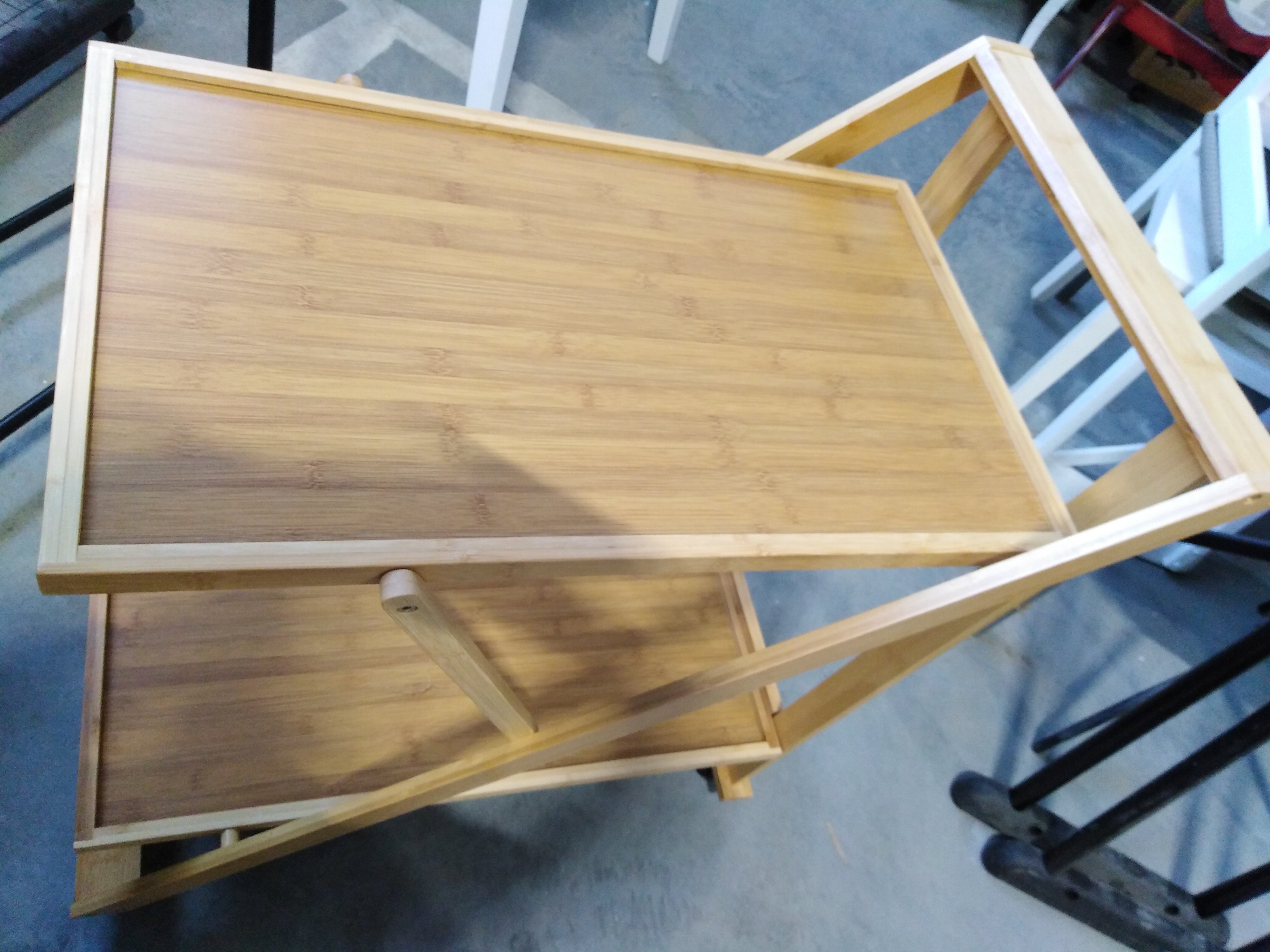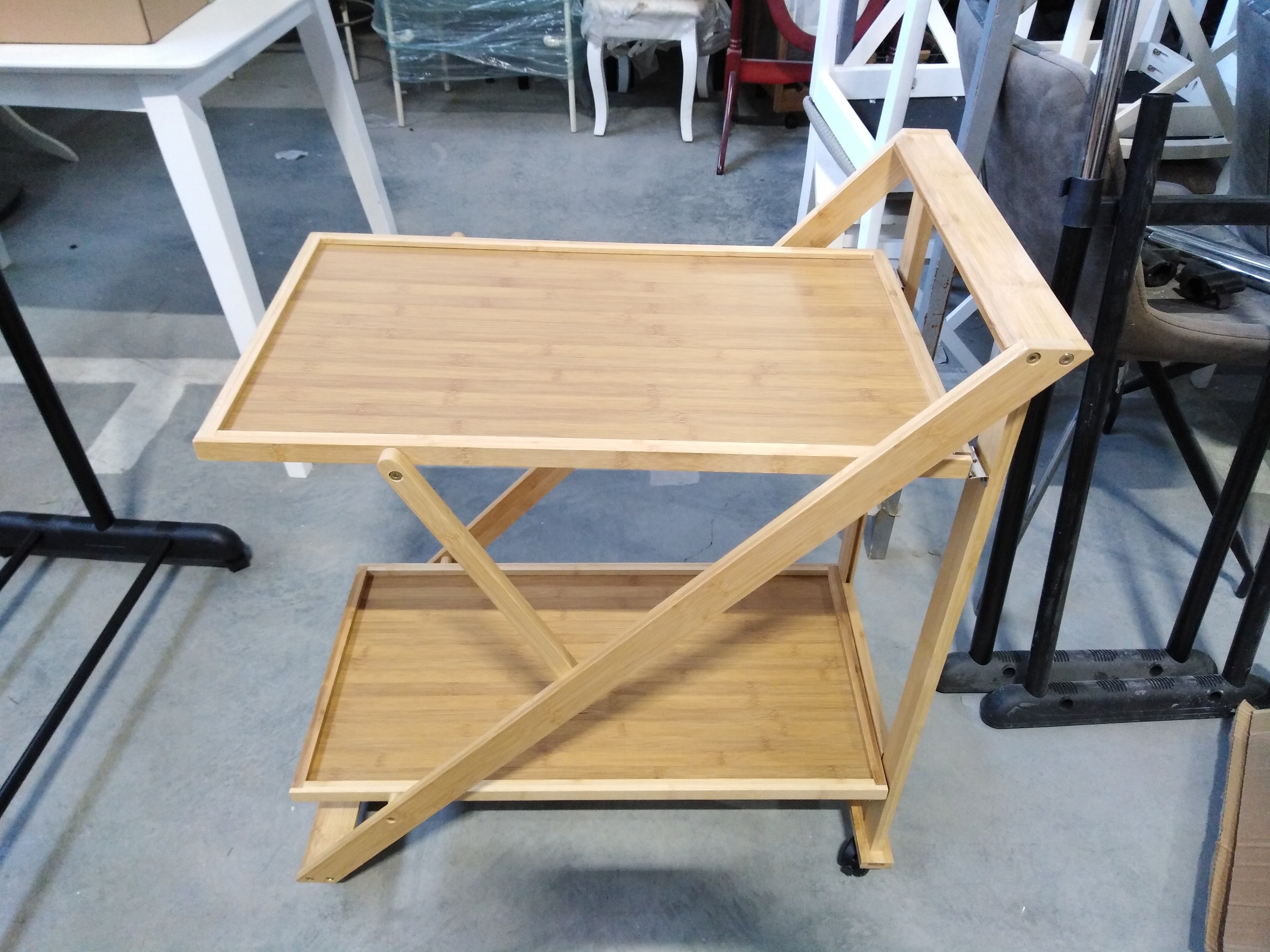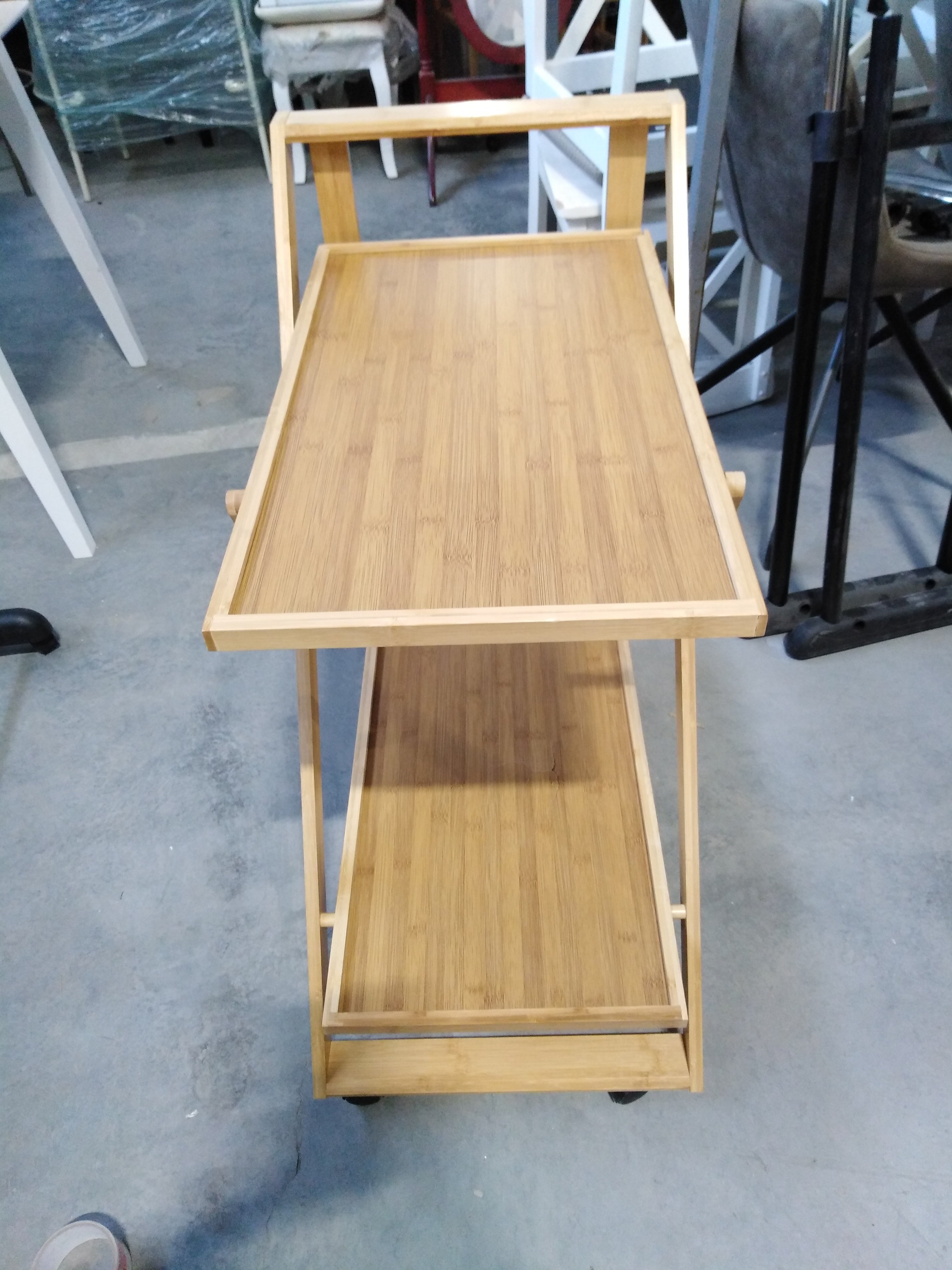 Описание товара без дефектов: Основание на колёсиках. 2 столешницы. Материал: прессованный бамбук. Цвет: натуральный. Размеры: 72х42х81,5 см