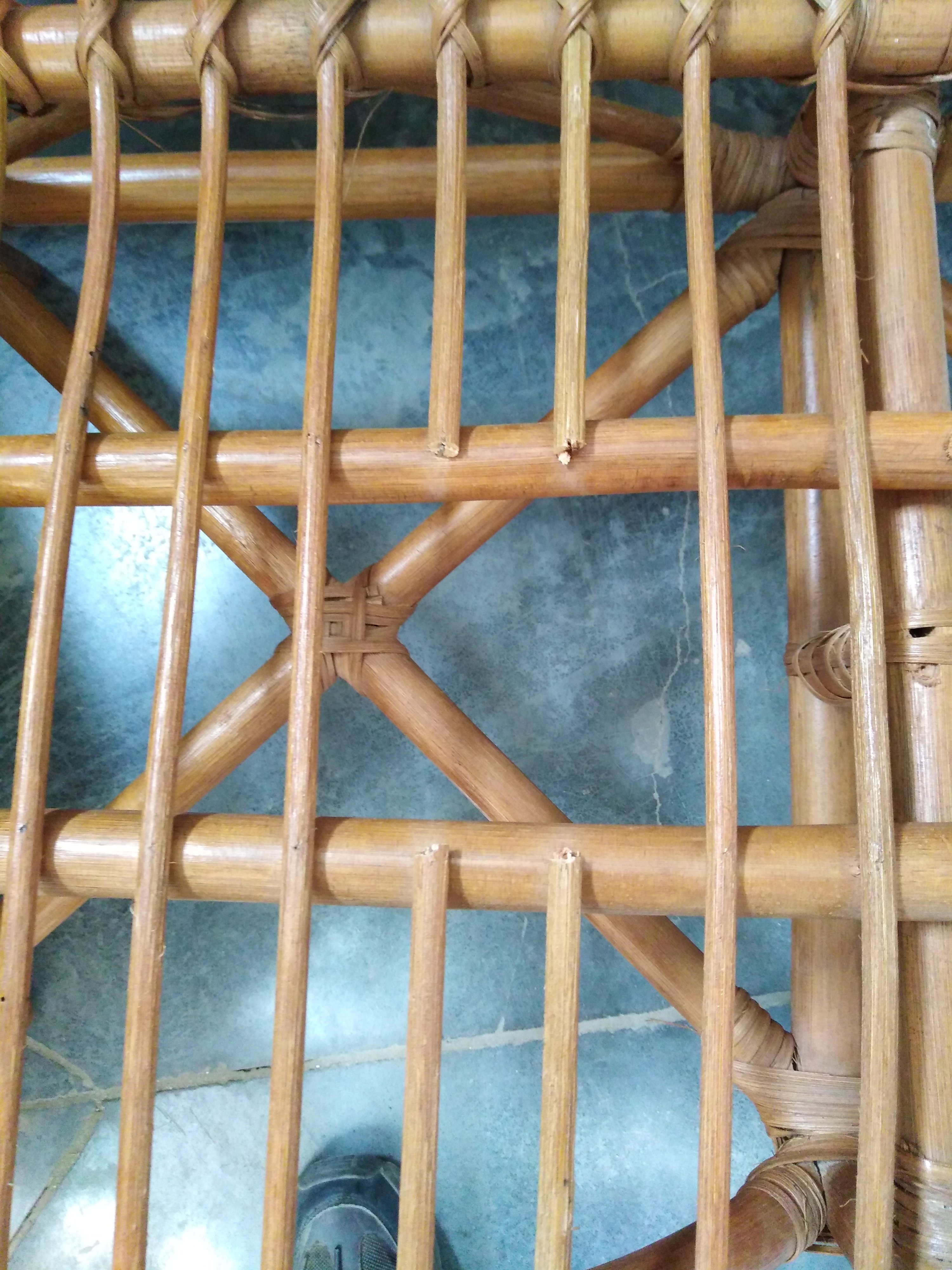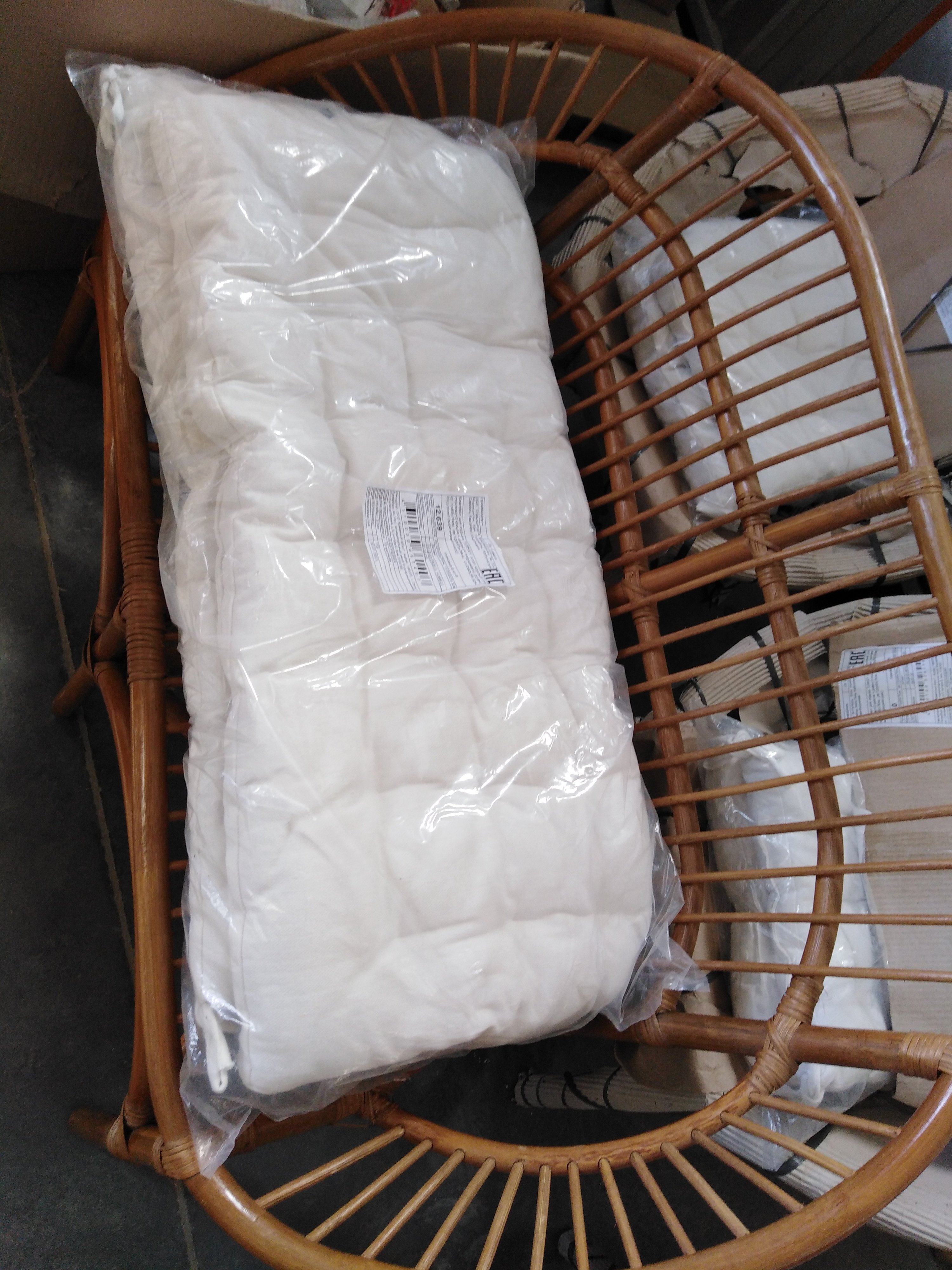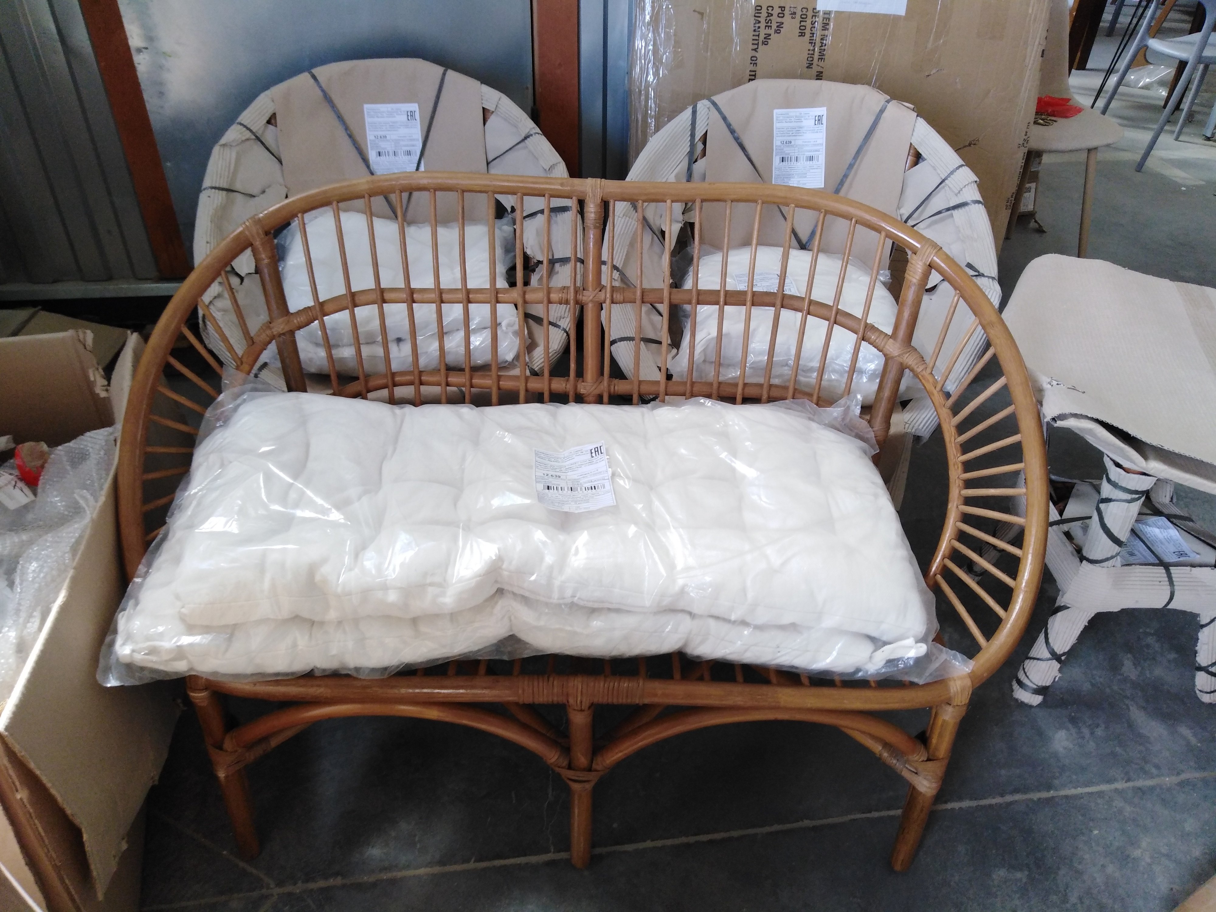Описание товара без дефектов: Материал: каркас - натуральный ротанг (высший сорт), мягкие элементы - хлопок, столешница - закалённое стекло. Размеры: кресло - 70х65х78см, диван - 0х65х78см, стол - D50х56,5см