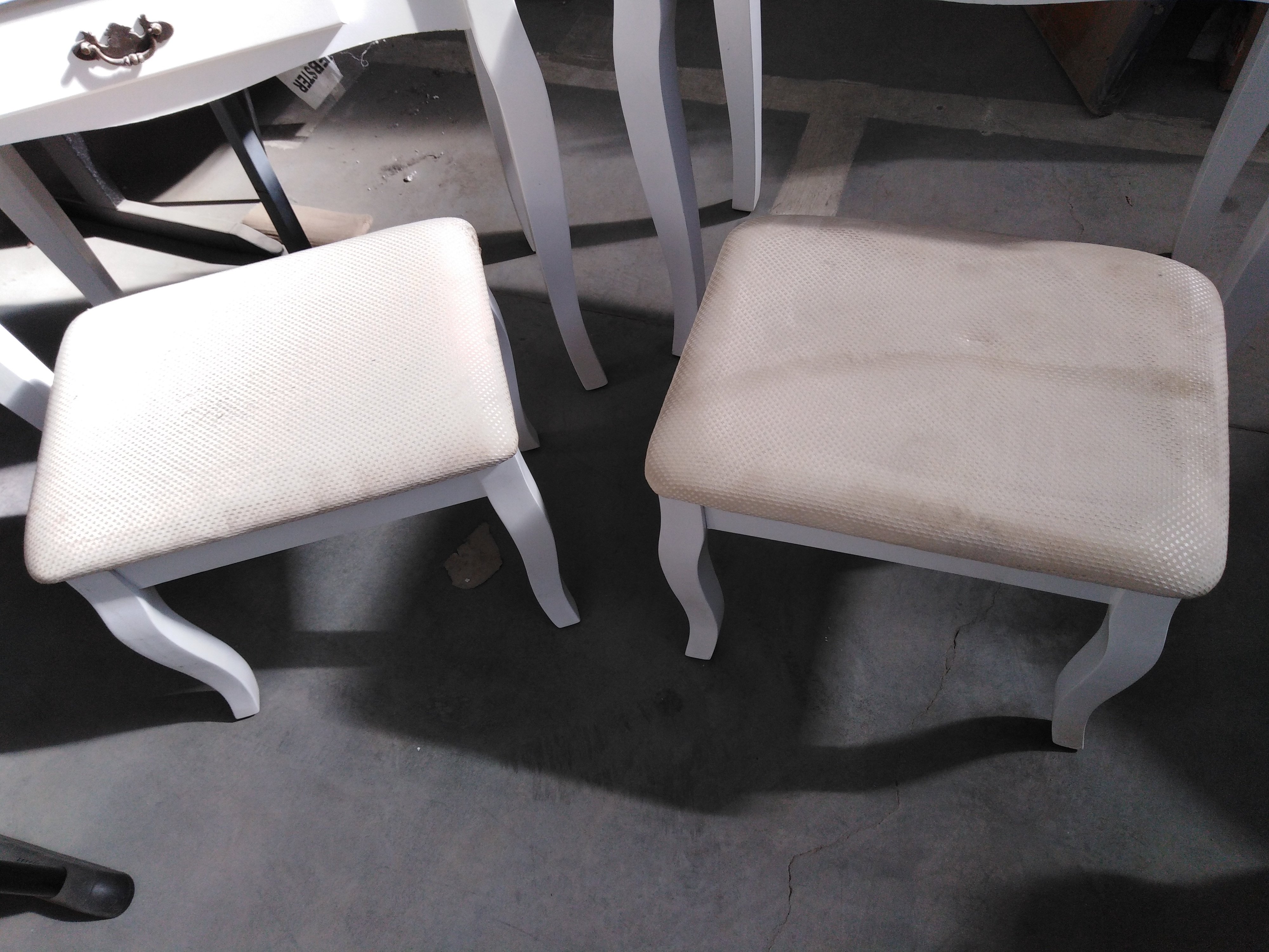 Описание товара без дефектов: Туалетный столик с 3 выдвижными ящиками и зеркалом с поворотным механизмом. Пуф с мягким сиденьем в комплекте. Материал: МДФ/дерево, обивка - ткань. Цвет: дерево - белый (white), ткань - бежевый. Размеры: 76х40,5х135,5 см