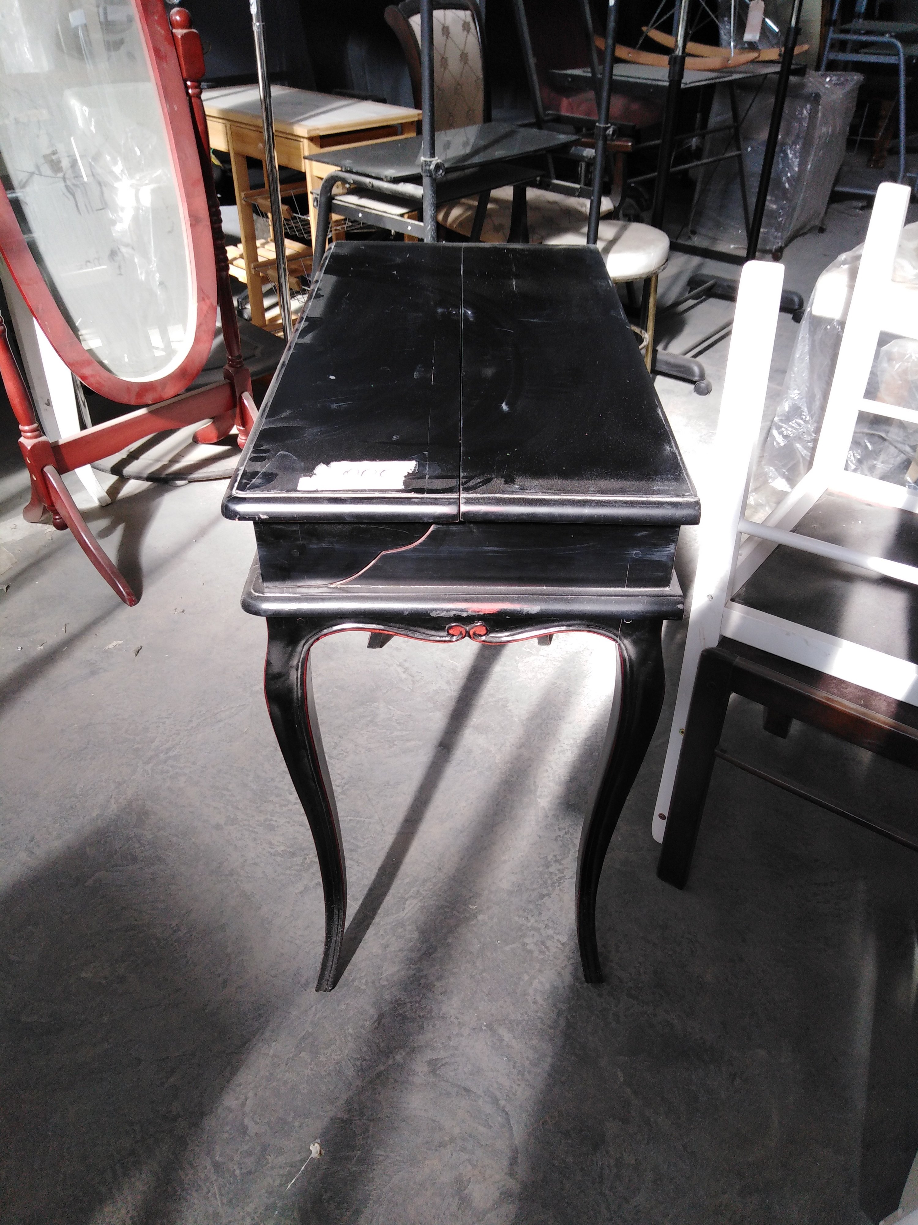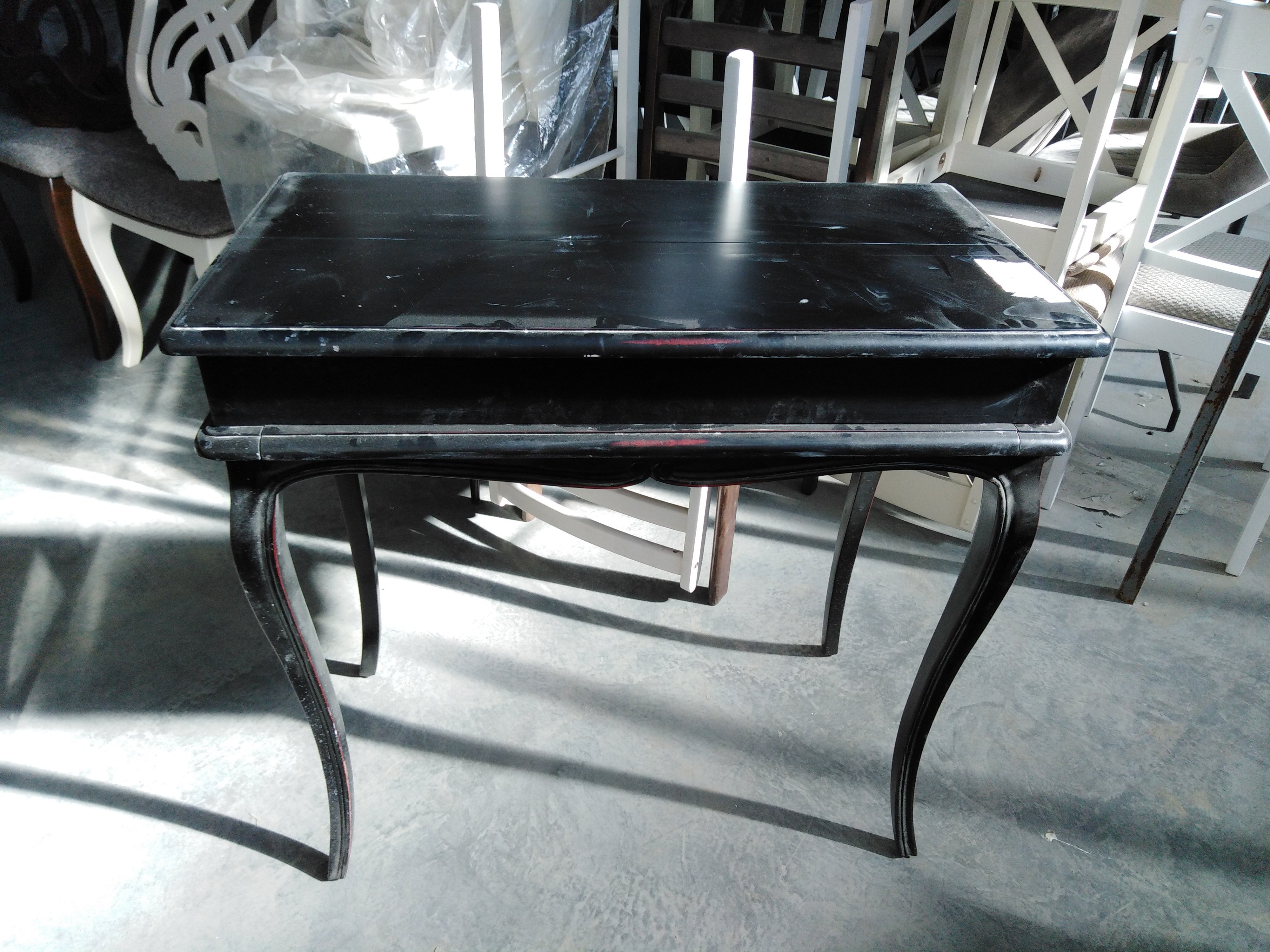 Описание товара без дефектов: Верх открывается вертикально. Внутри несколько комбинируемых отделений для хранения бумаг, писем и мелочей; место для ноутбука. Декор - резьба ручной работы. Материал: красное дерево. Цвет: чёрный антик+коричневый. Размеры: 78х40х75 см