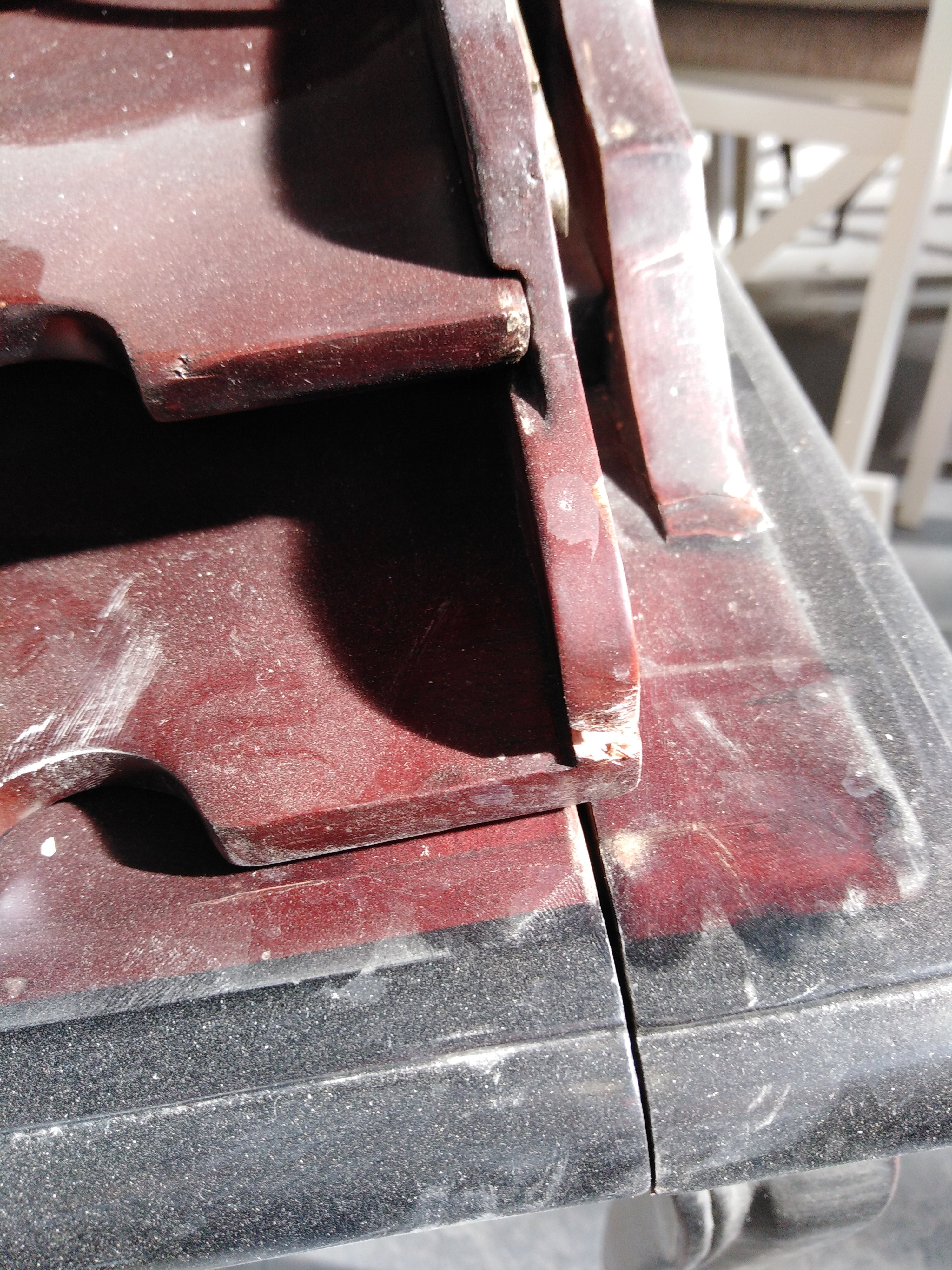 Описание дефекта: Нарушение ЛКП на деревяных деталях. Есть сколы , трещины и царапины на изделии