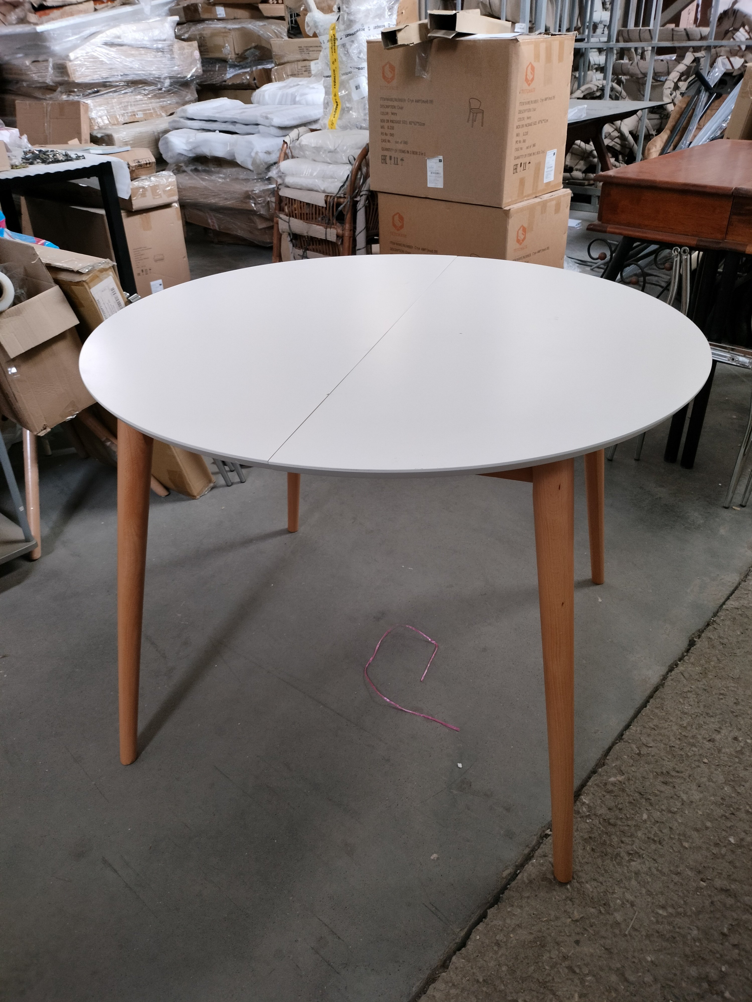 Описание товара без дефектов: Стильный обеденный стол BOSCO из Датской коллекции отлично дополнит интерьер загородного дома, городской квартиры, кухни, гостиной, кафе или ресторана. Удачное сочетание столешницы, покрашенной в белый цвет, и визуально легких ножек цвета натурального дерева выглядит стильно и привлекательно. Обеденный стол BOSCO хорошо впишется в любой современный интерьер. Модель имеет основательный раздвижной механизм, который позволит разместить с комфортом всю вашу семью. Круглая форма столешницы помогает создать свободную и легкую атмосферу в комнате, способствует спокойному и приятному общению. Изящные тонкие ножки изготовлены из натуральной экологически чистой древесины ─ массива бука. Столешница из МДФ со шпоном бука и глянцевым напылением не требует специального ухода, выдерживает воздействие жидкости и тепла. Стол поставляется в разобранном виде, необходима несложная сборка по инструкции.