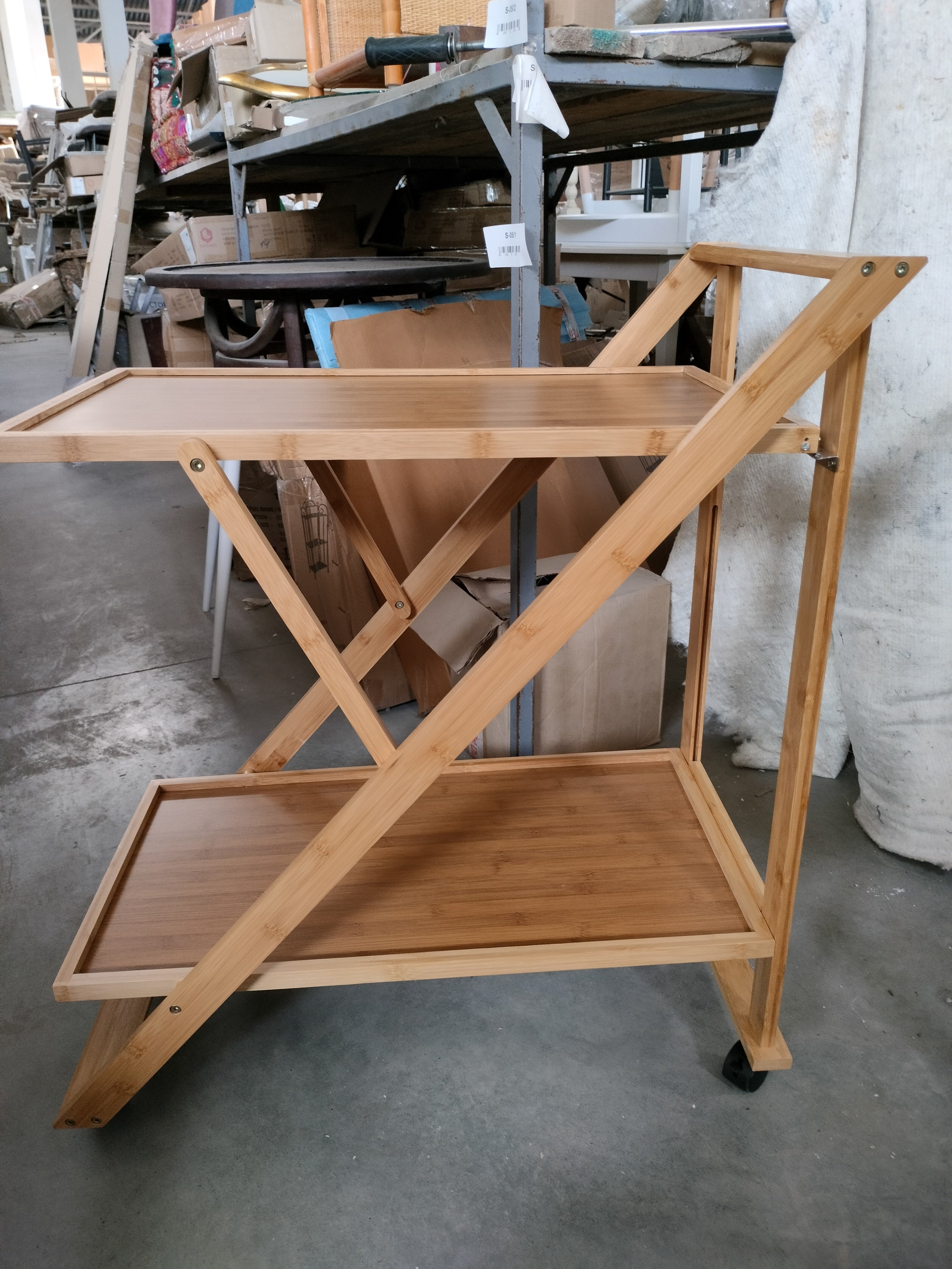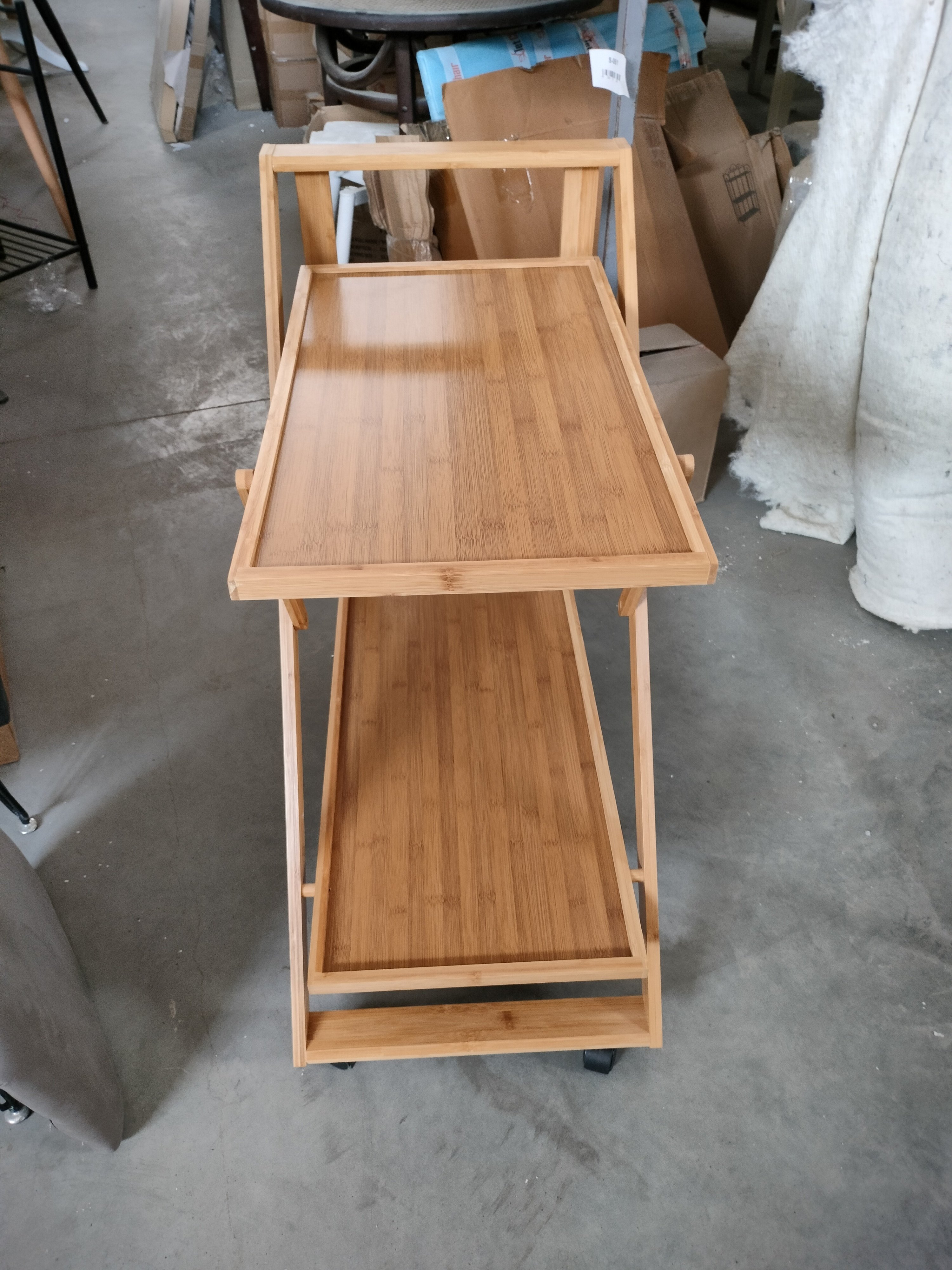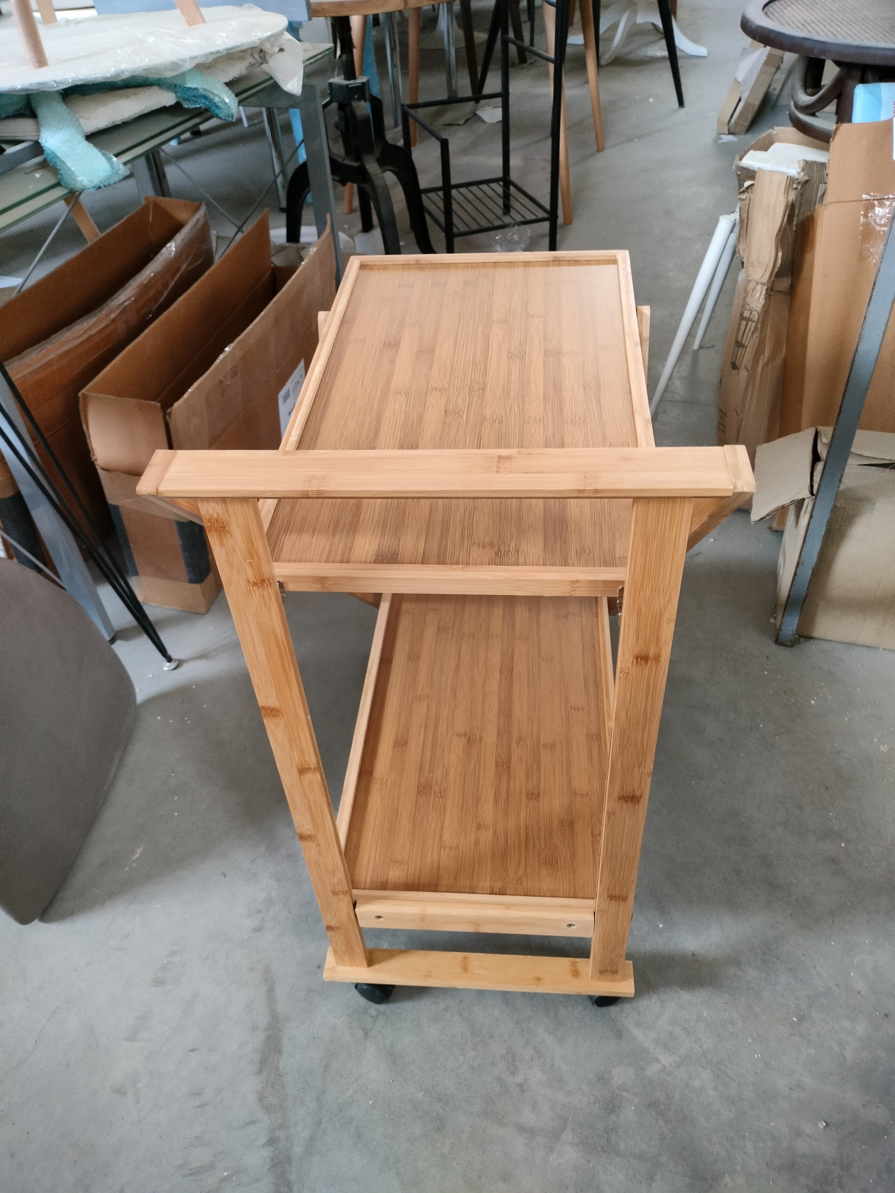 Описание товара без дефектов: Основание на колёсиках. 2 столешницы. Материал: прессованный бамбук. Цвет: натуральный. Размеры: 72х42х81,5 см