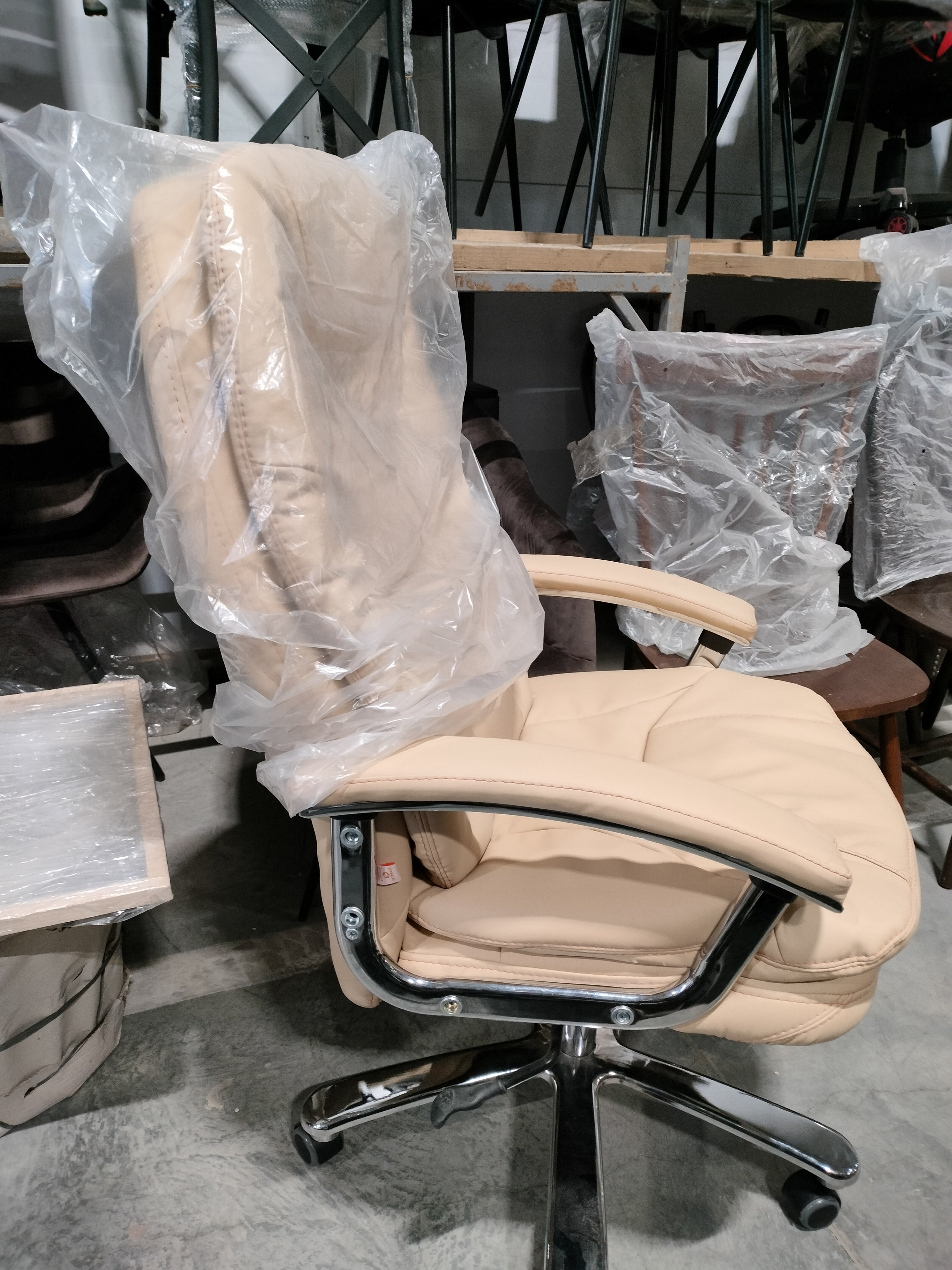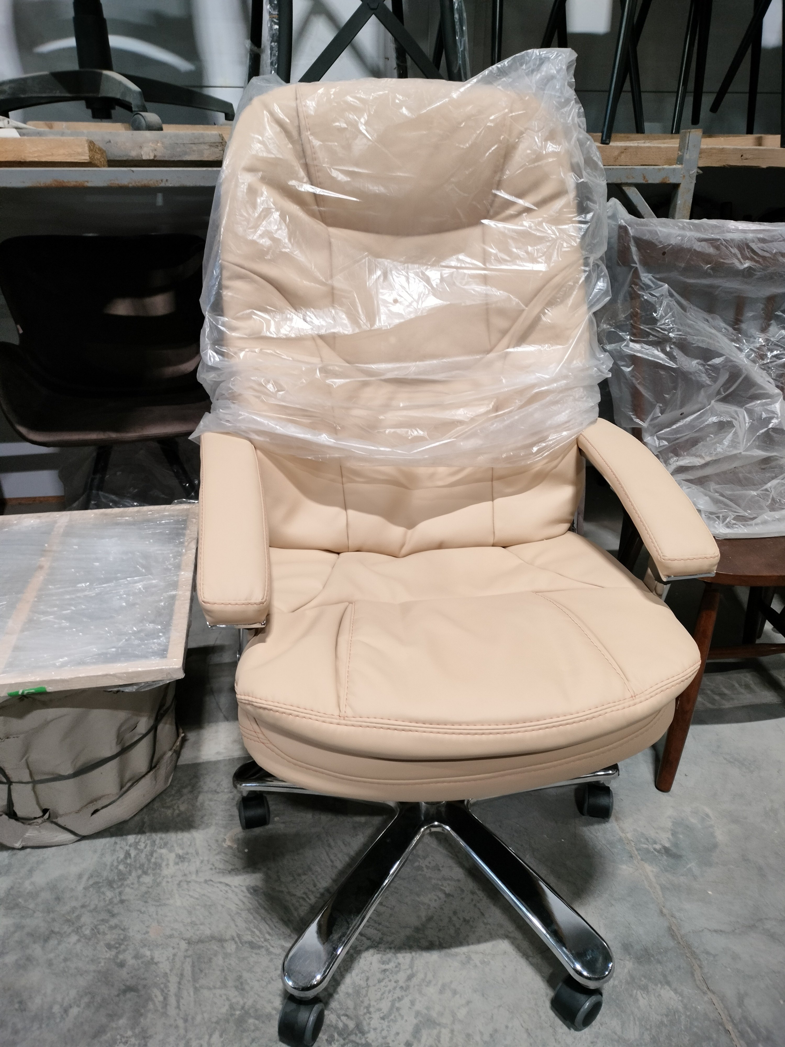 Описание товара без дефектов: Металлический каркас внутри, основа сиденья – мебельные ремни. Механизм фиксации в любом положении. Подлокотники - пластик, регулировка по высоте. Ролики - прорезиненные. Увеличенная ширина сиденья и спинки. Наполнитель - высококачественный формованный ППУ. Максимальная нагрузка 120 кг.