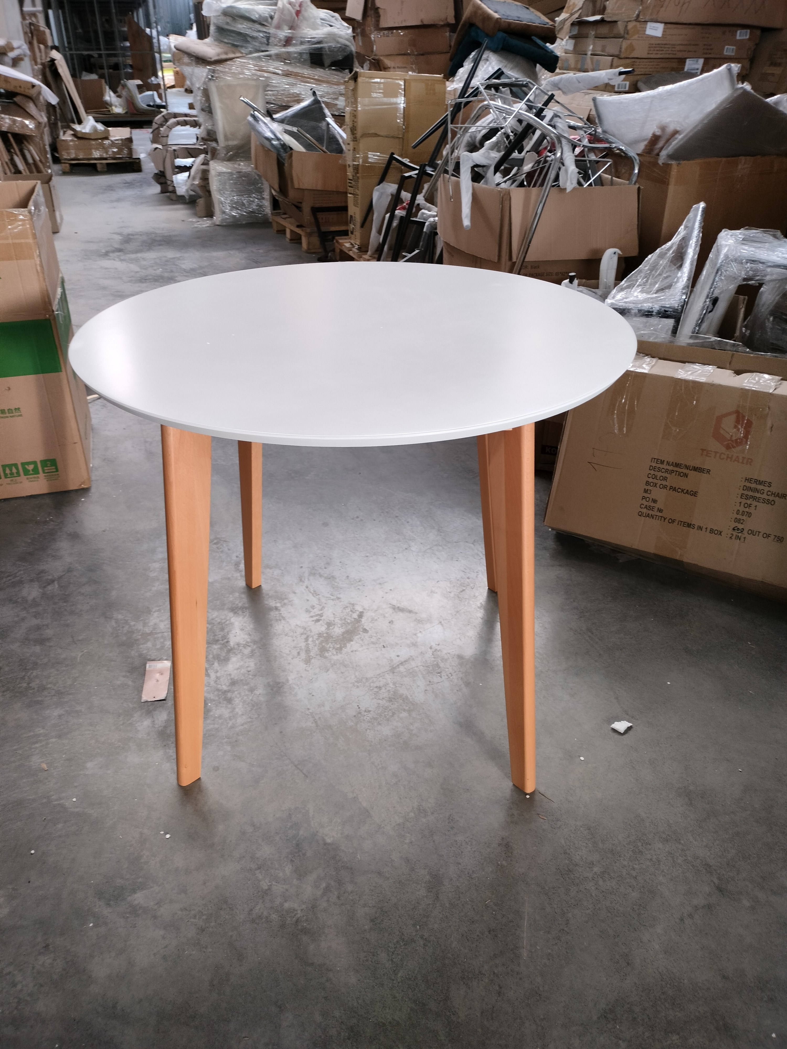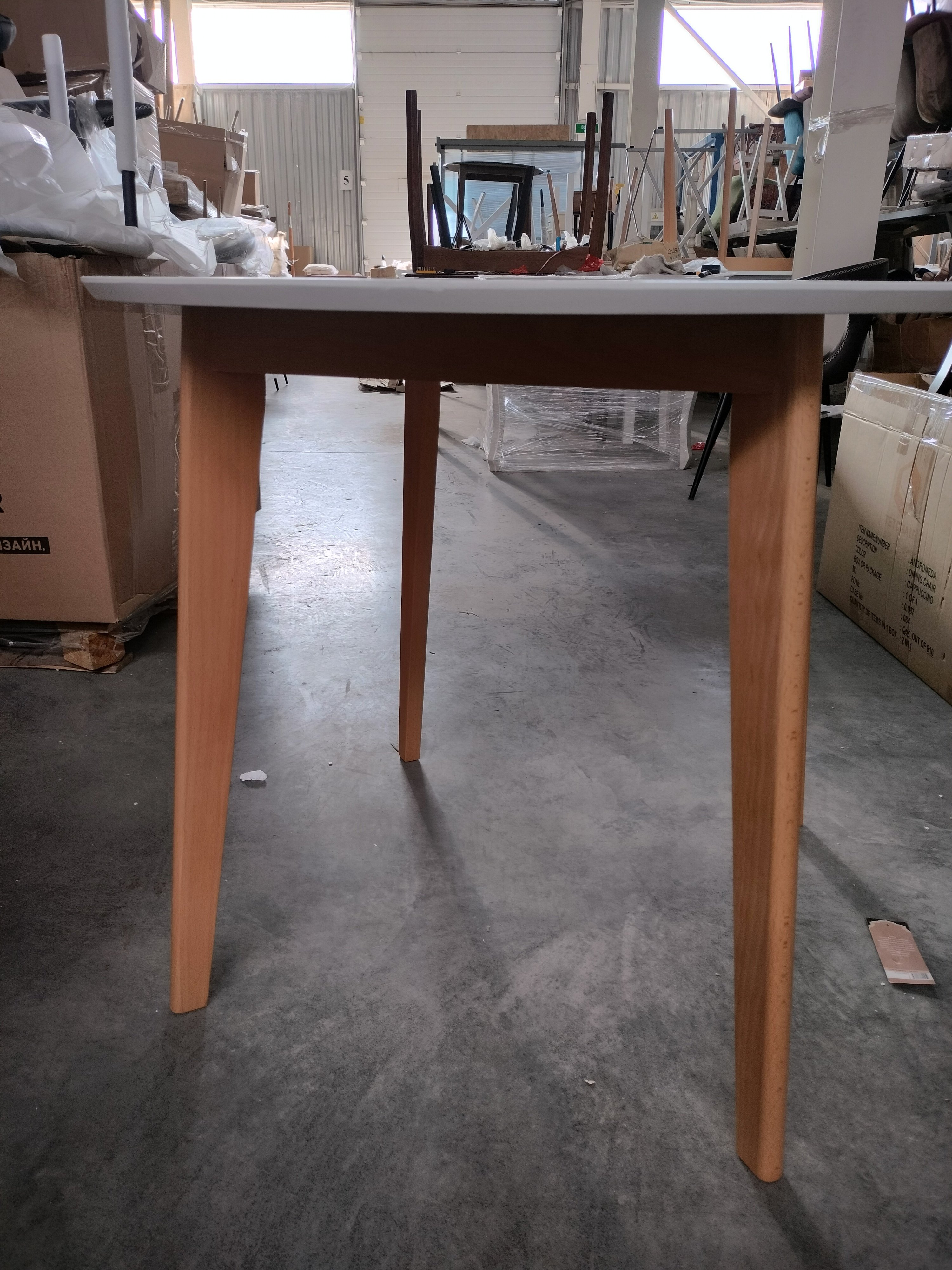 Описание товара без дефектов: Стильный обеденный стол BOSCO из Датской коллекции отлично дополнит интерьер загородного дома, городской квартиры, кухни, гостиной, кафе или ресторана. Компактный и аккуратный стол отлично подойдет даже для небольших помещений. Удачное сочетание столешницы, покрашенной в белый цвет, и визуально легких ножек цвета натурального дерева выглядит стильно, легко и привлекательно. Обеденный стол BOSCO хорошо впишется в любой современный интерьер. Круглая форма столешницы помогает создать свободную и легкую атмосферу в комнате, способствует спокойному и приятному общению. Изящные тонкие ножки изготовлены из натуральной экологически чистой древесины ─ массива бука. Столешница из МДФ со шпоном бука и глянцевым напылением не требует специального ухода, выдерживает воздействие жидкости и тепла. Модель поставляется в разобранном виде, необходима несложная сборка по инструкции.