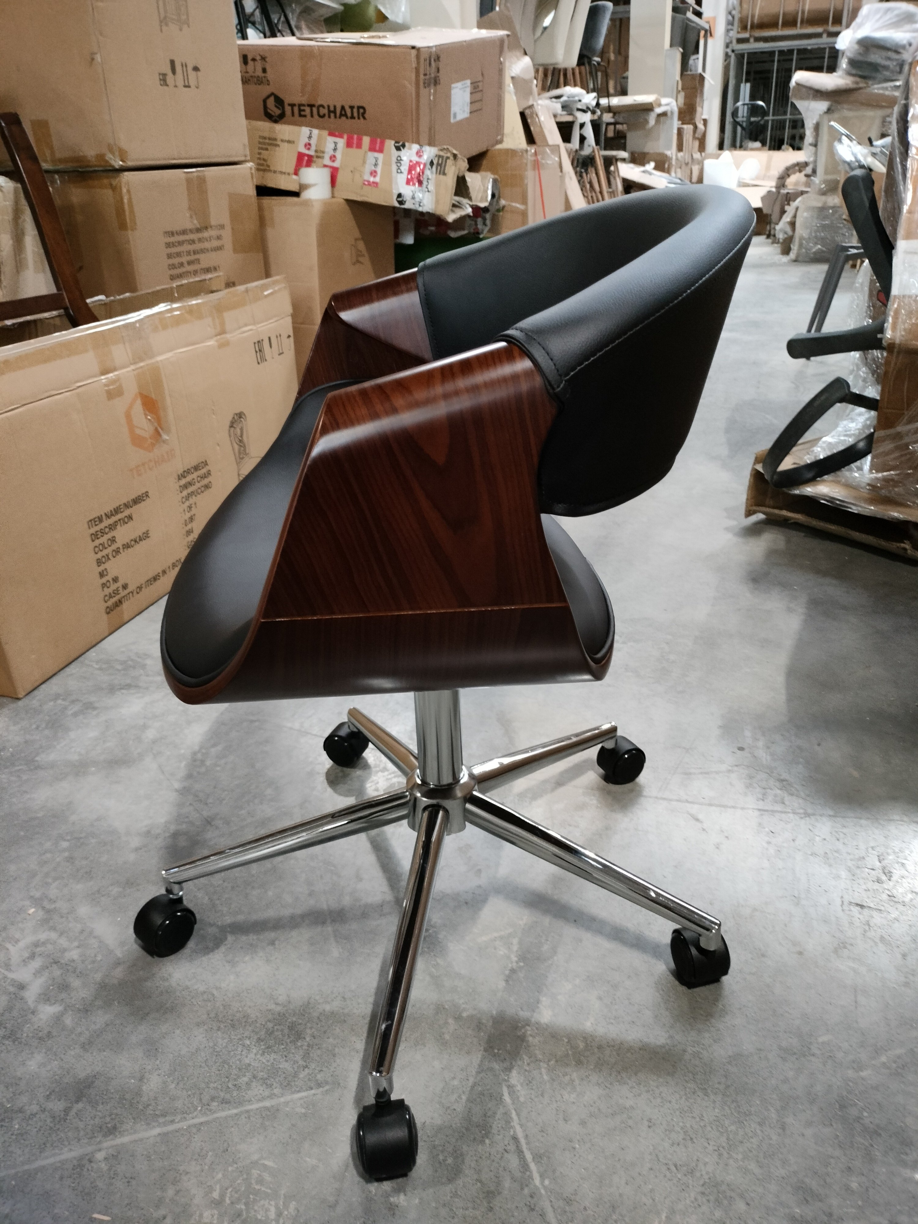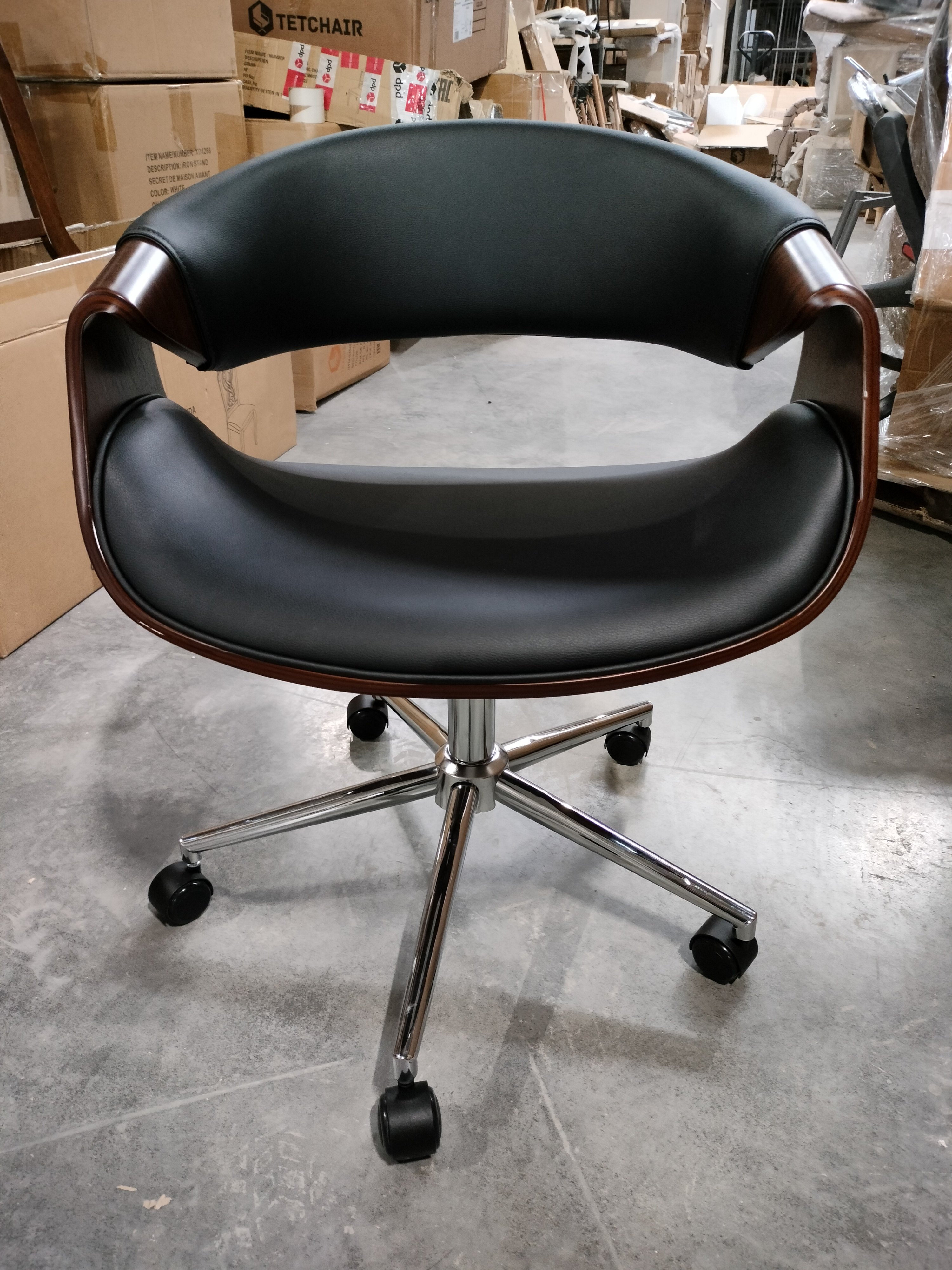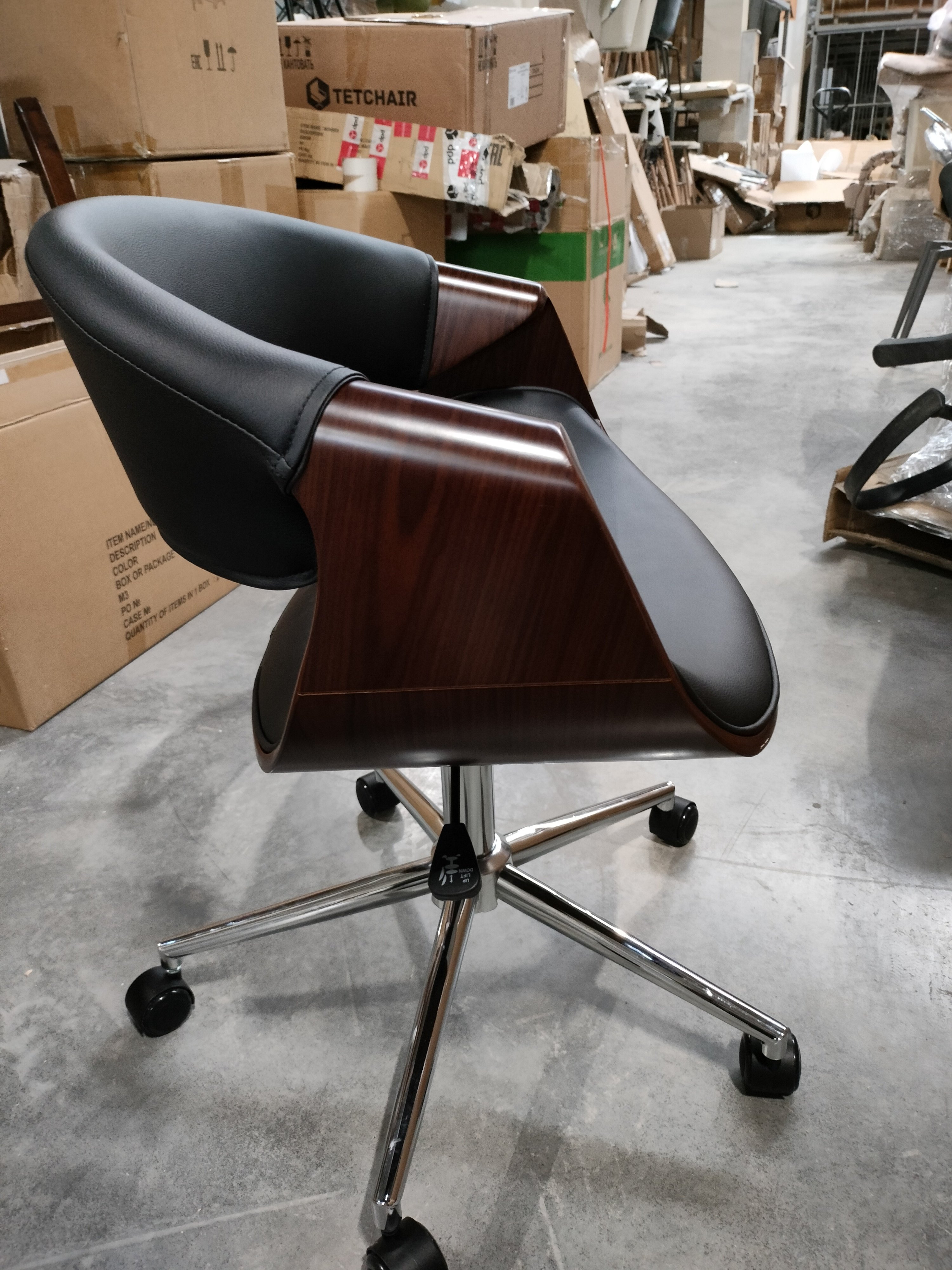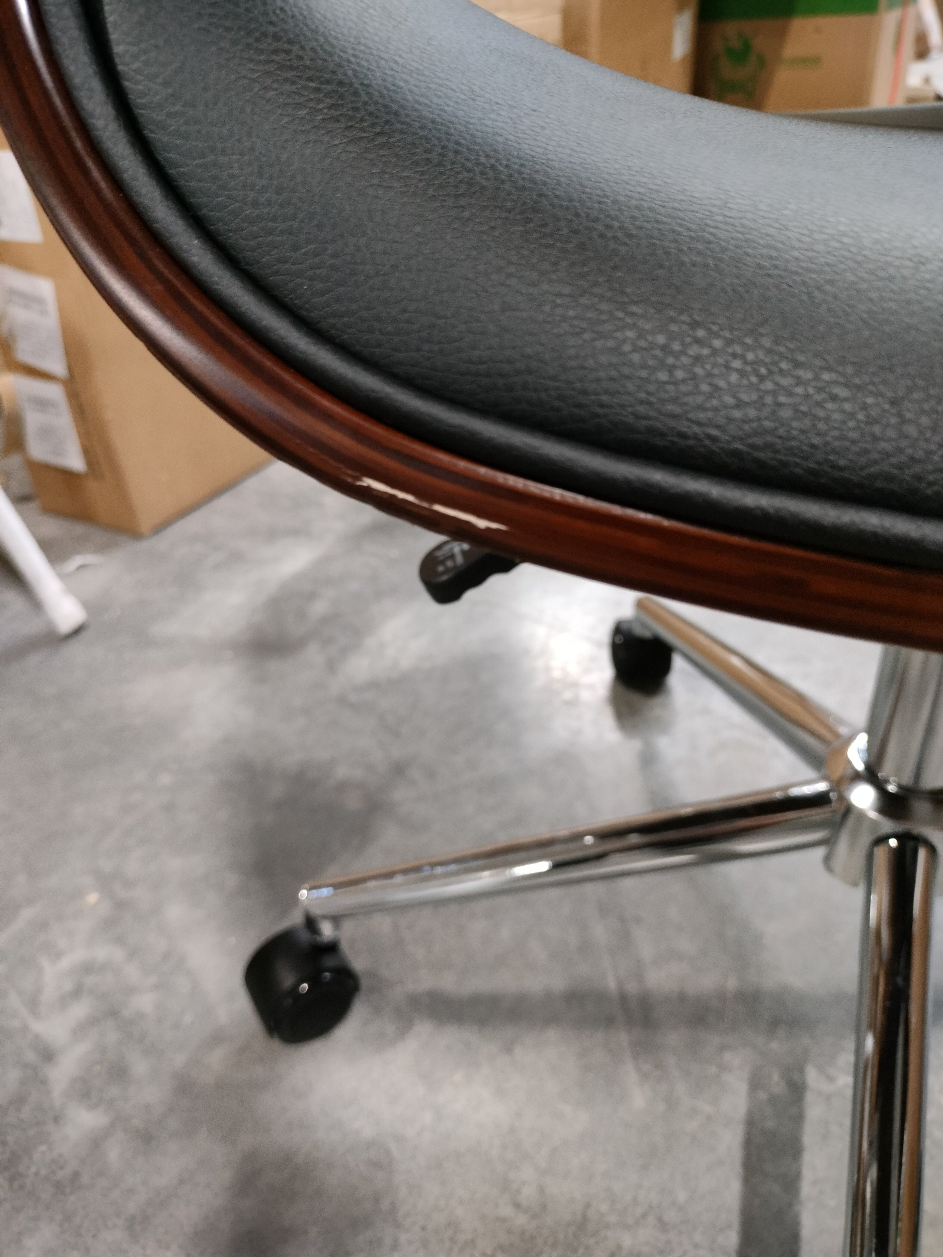 Описание товара без дефектов: Элегантное и надежное кресло BEND из коллекции OFFICE - показатель безупречного вкуса своего владельца. Уникальная модель прекрасно впишется в дизайн офиса или дома. Деревянный каркас из шпонированной фанеры и обивка из искусственной кожи – удачное сочетание надежности и элегантности. Искусственная кожа гипоаллергенна, износостойка и проста в уходе. Сиденье с мягким наполнителем из пенополиуретана стандартной плотности пропускает воздух, не накапливает пыль, не деформируется на протяжении длительного времени. Для принятия удобной позы кресло регулируется по высоте. Деревянные подлокотники необычной формы помогут уменьшить дискомфорт в плечах и шее при длительной работе, а также комфортно расположиться у стола. Металлическая хромированная крестовина диаметром 640 мм обеспечивает устойчивость и безопасность модели. Сочетание каркаса цвета орех с черным сиденьем и спинкой выглядит привлекательно и эстетично. Наличие высококачественных полиамидных роликов позволяет легко передвигаться на кресле, даже не вставая с него. Колесики подходят для использования на низковорсовых ковровых покрытиях и на специальных защитных поверхностях. Модель BEND отличается повышенным комфортом и презентабельным внешним видом, удивит владельца своей долговечностью и надежностью. Максимальная нагрузка кресла 120 кг. Кресло поставляется в разобранном виде. Инструкция по сборке прилагается.