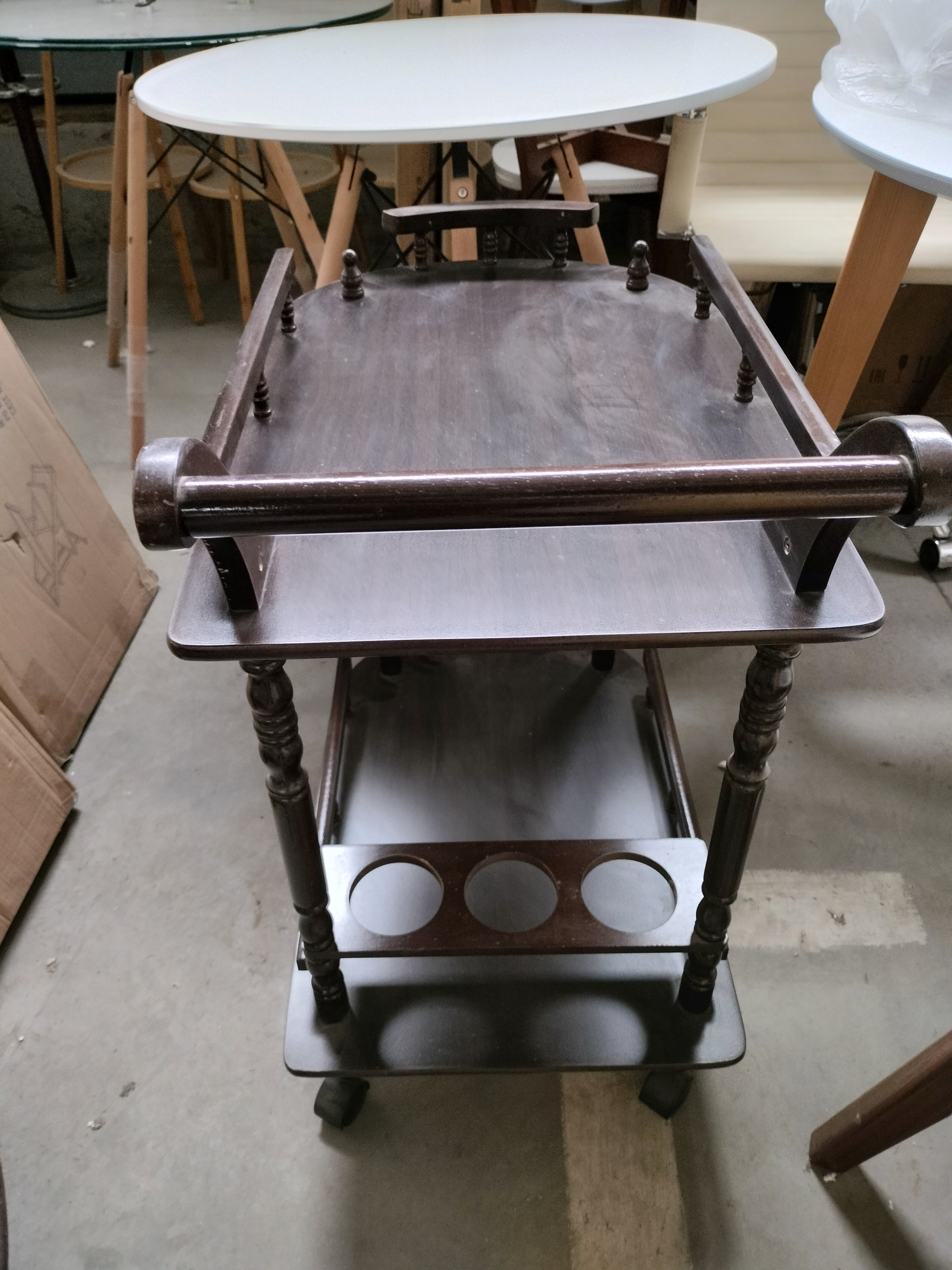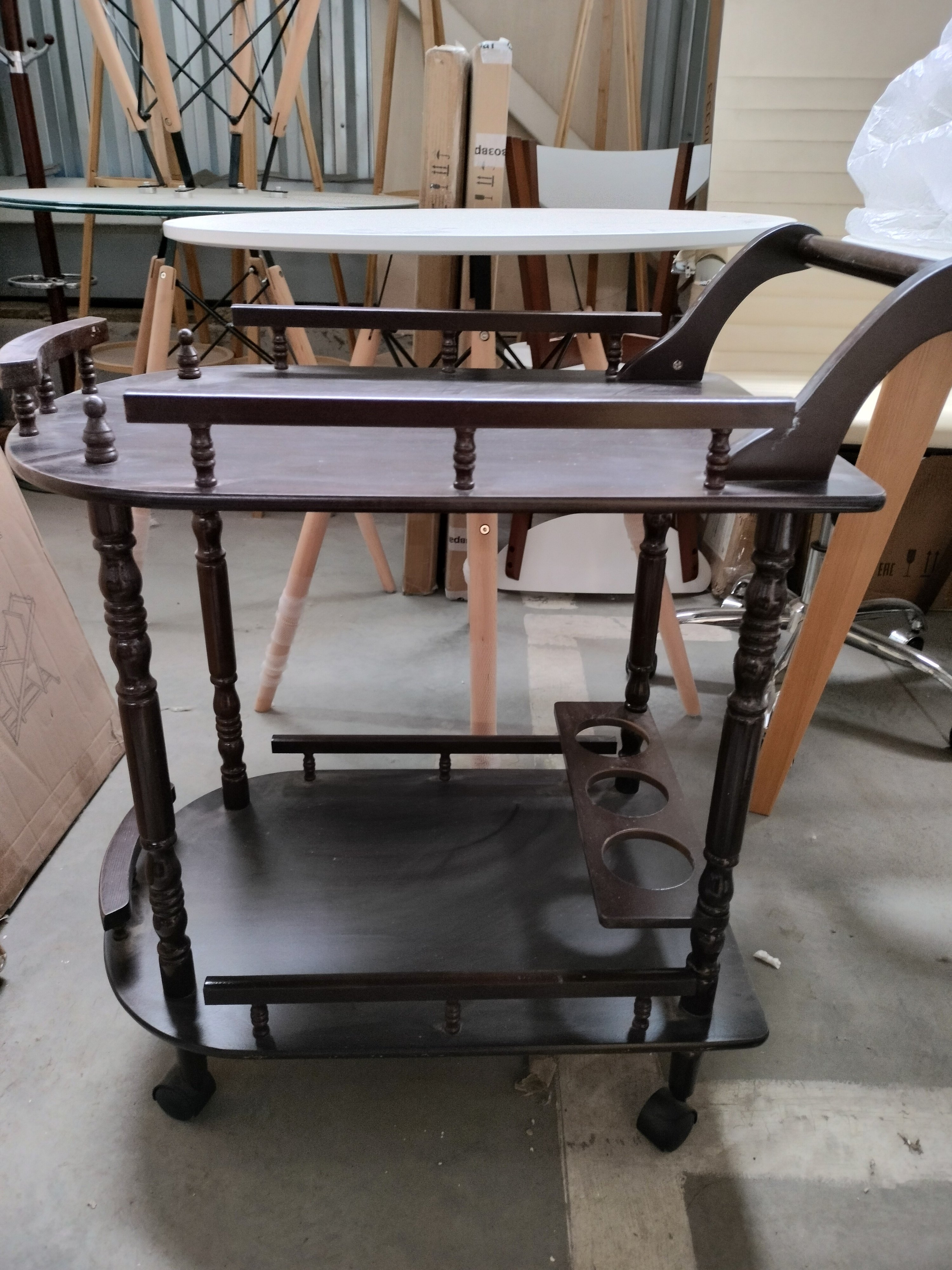 Описание товара без дефектов: Деревянный сервировочный столик из коллекции УЮТНЫЙ ДОМ будет выгодно выделяться среди других предметов интерьера за счет своего элегантного внешнего вида. Он прекрасно подойдет как для загородного дома, так и для городской квартиры. Столешница оригинальной формы придает модели изысканность и уникальность. Нижний уровень сервировочного столика оборудован специальным отделением для винных бутылок. Высокие боковые ограничители позволяют ставить на столешницу различные продукты или бокалы, не опасаясь, что они упадут или скатятся с поверхности. Колесики дают возможность свободно перемещать его по кухне, столовой или гостиной вместе с угощениями. Резные элементы ручной работы выполнены из дерева, полки из МДФ подчеркнут тонкий вкус владельца, а также добавят помещению ноты элегантности и изящности. Деревянный сервировочный столик в цвете орех из коллекции УЮТНЫЙ ДОМ будет отлично смотреться в любом интерьере гостиной или кабинета, порадует вас своей долговечностью, мобильностью и компактностью. Интсрукция по сборке прилагается.