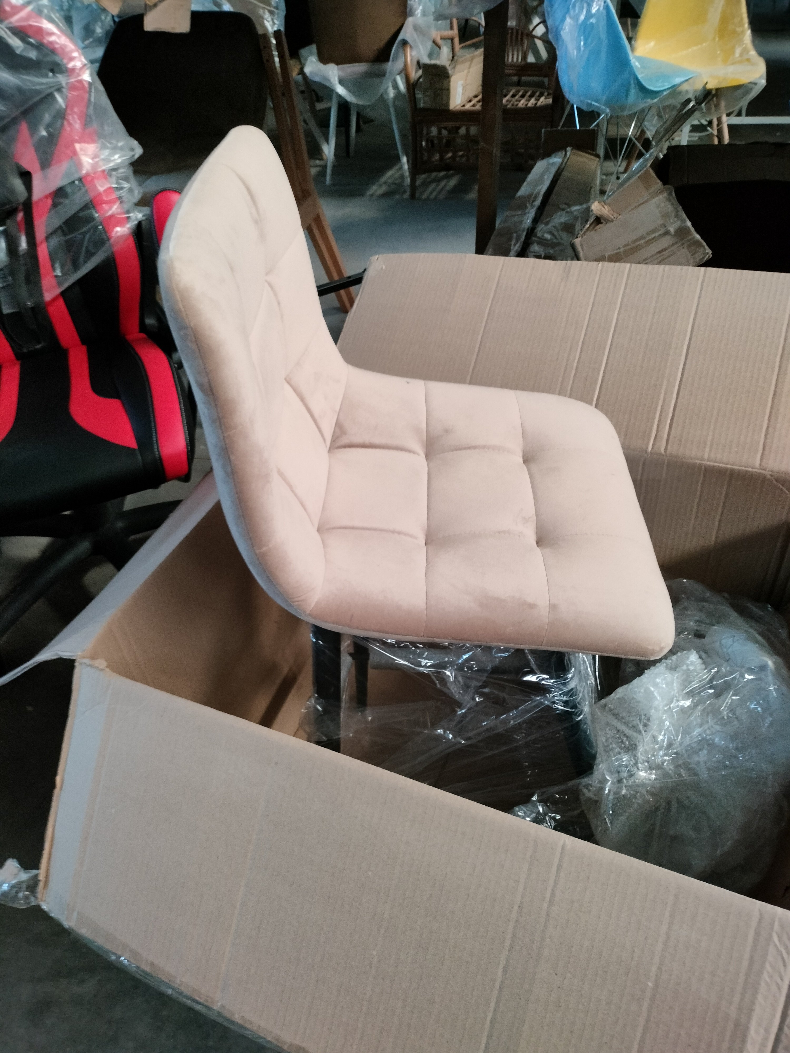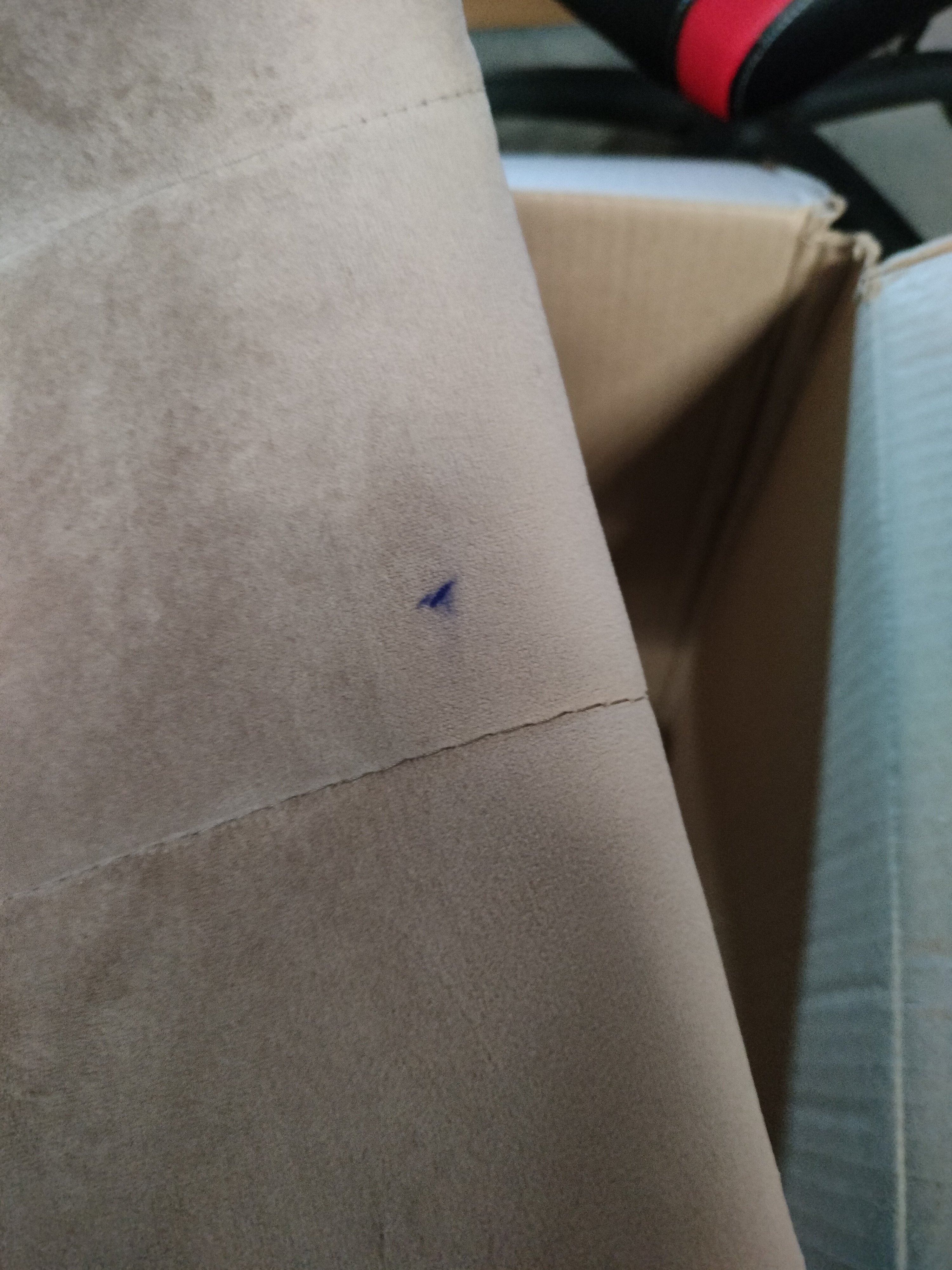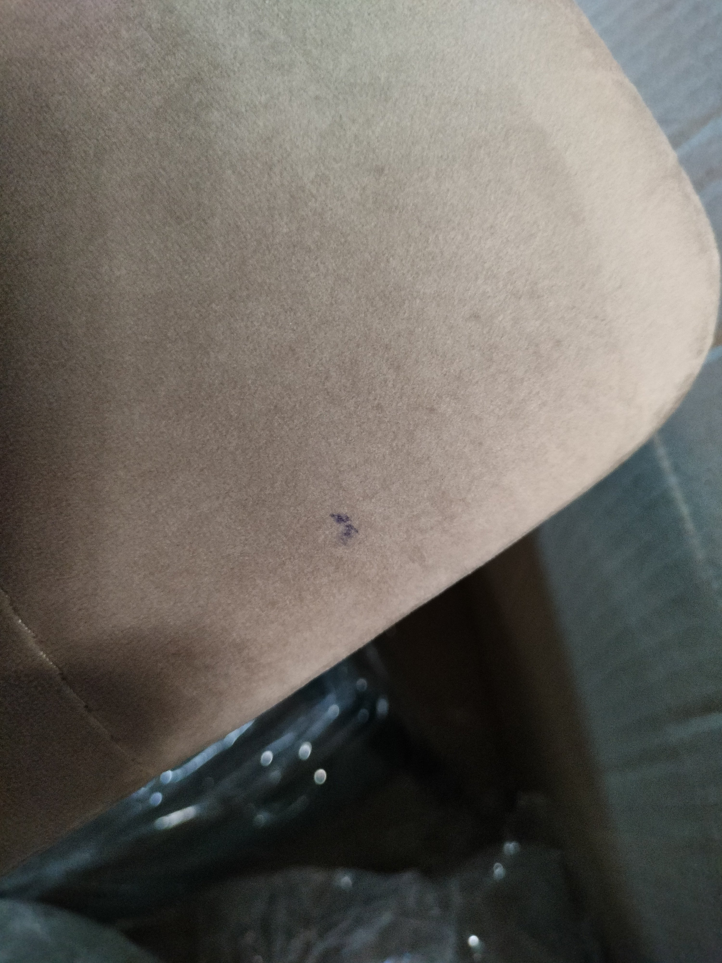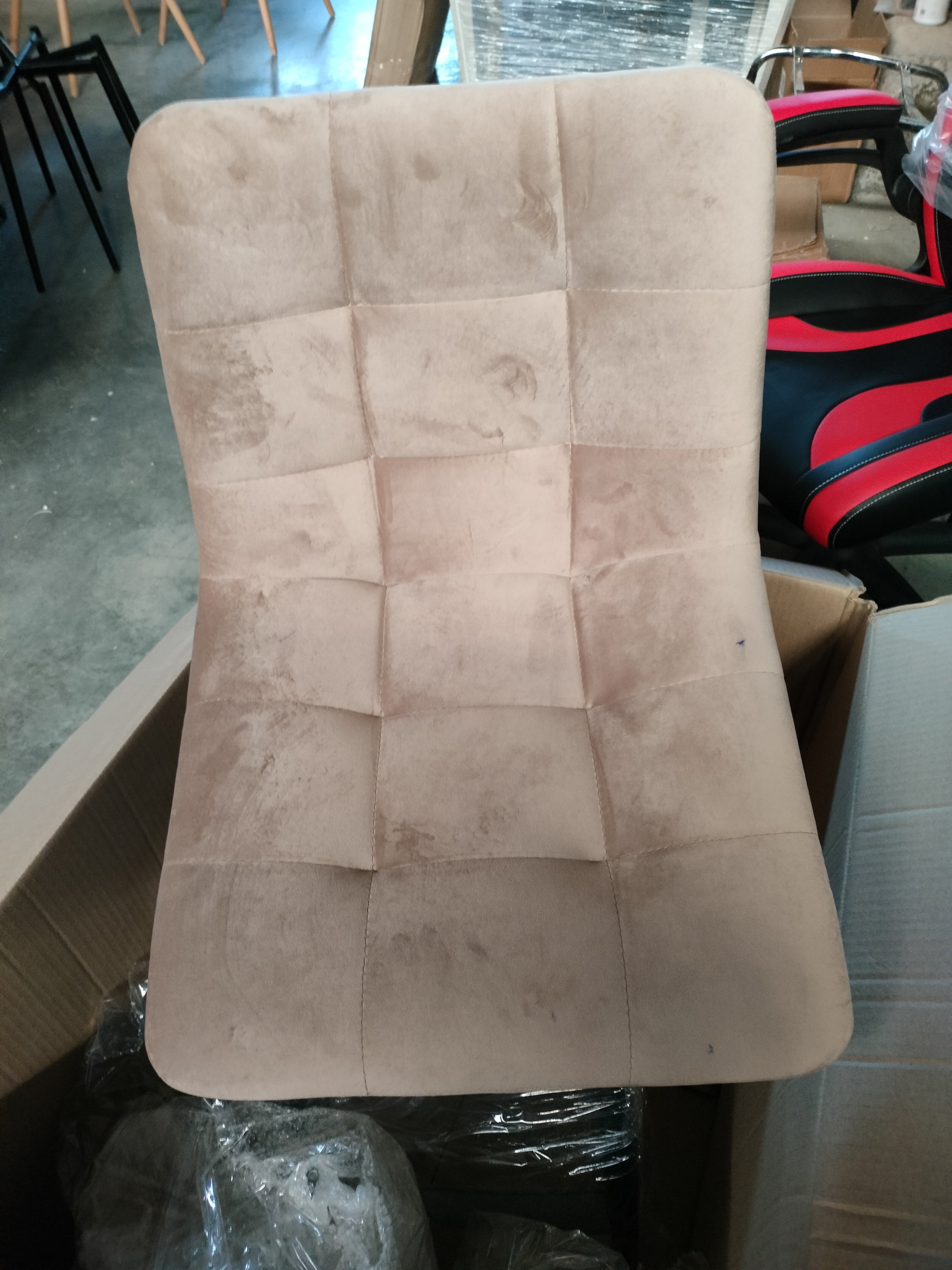 Описание дефекта: на сиденье одного стула пятна темно-синего цвета , обнаружили при распаковки