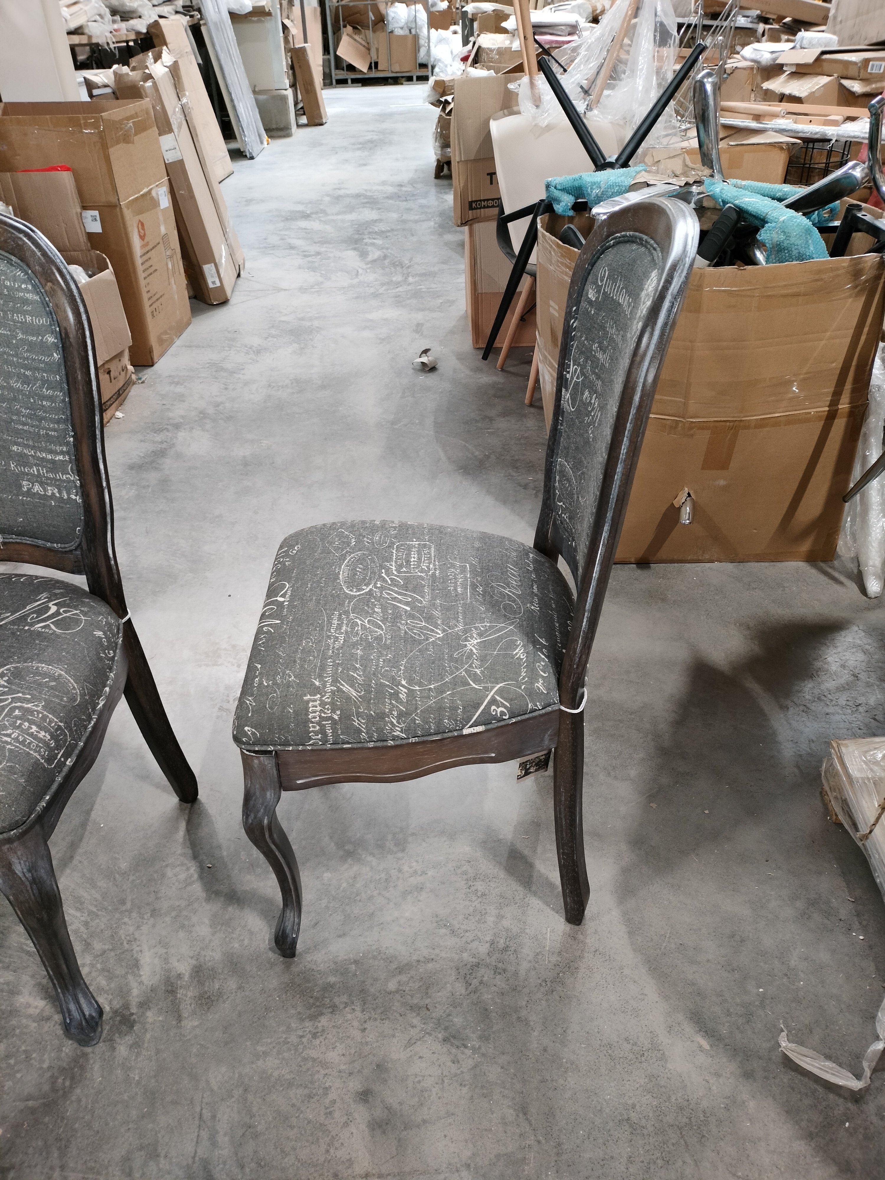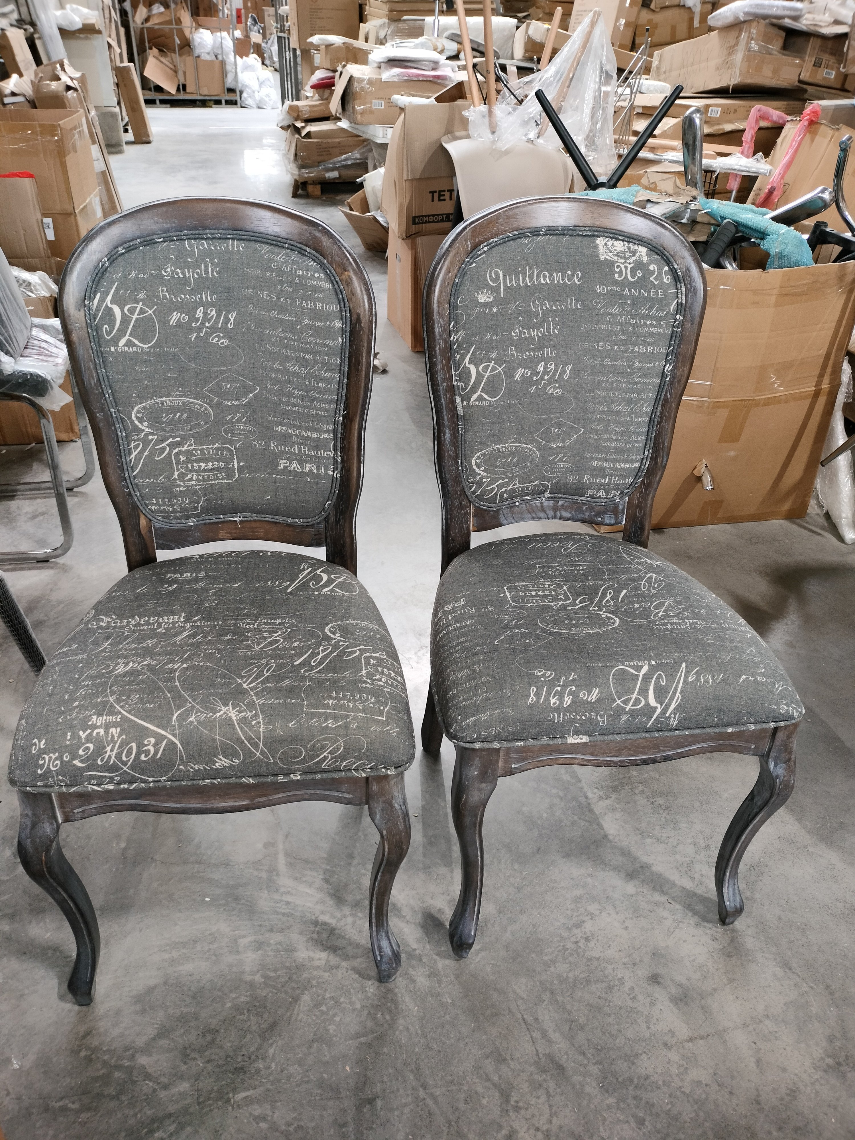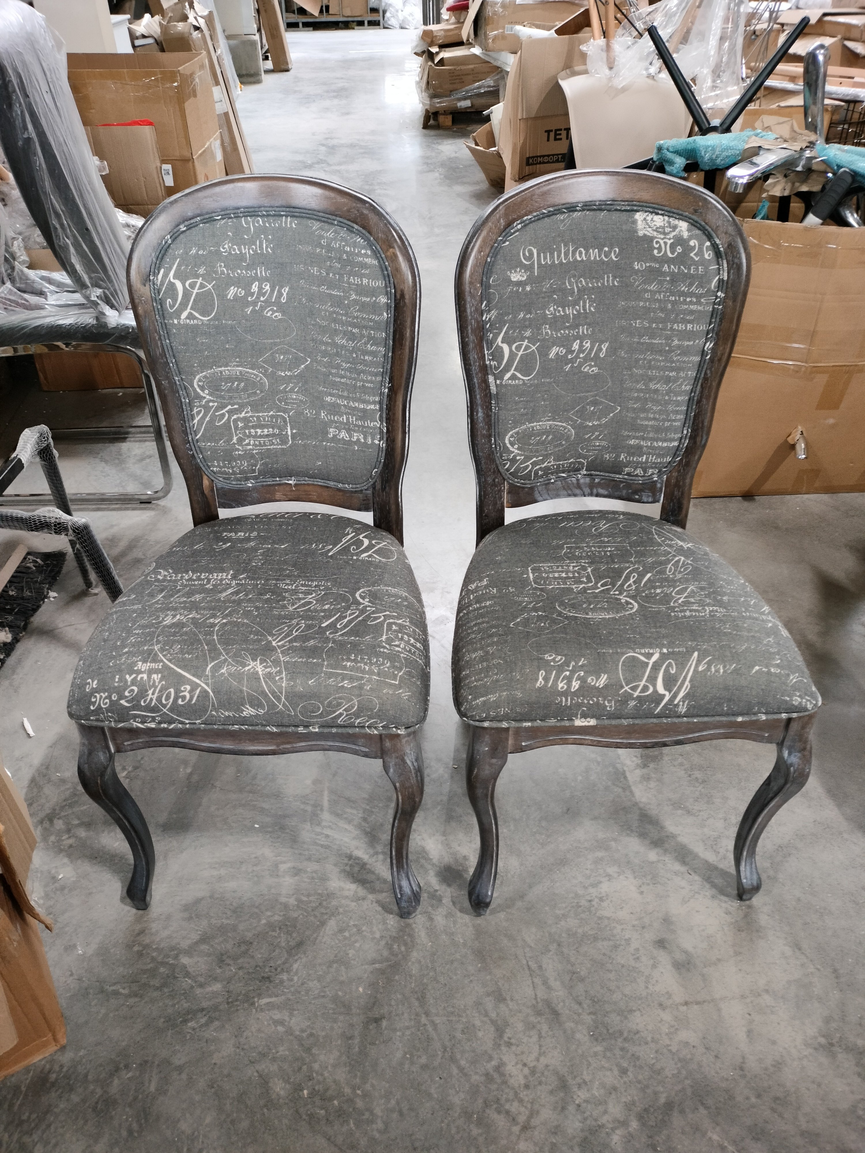 Описание товара без дефектов: Материал: каркас - массив гевеи, обивка - ткань. Форма спинки - неоклассический медальон. Размеры: 96х55х46 см
