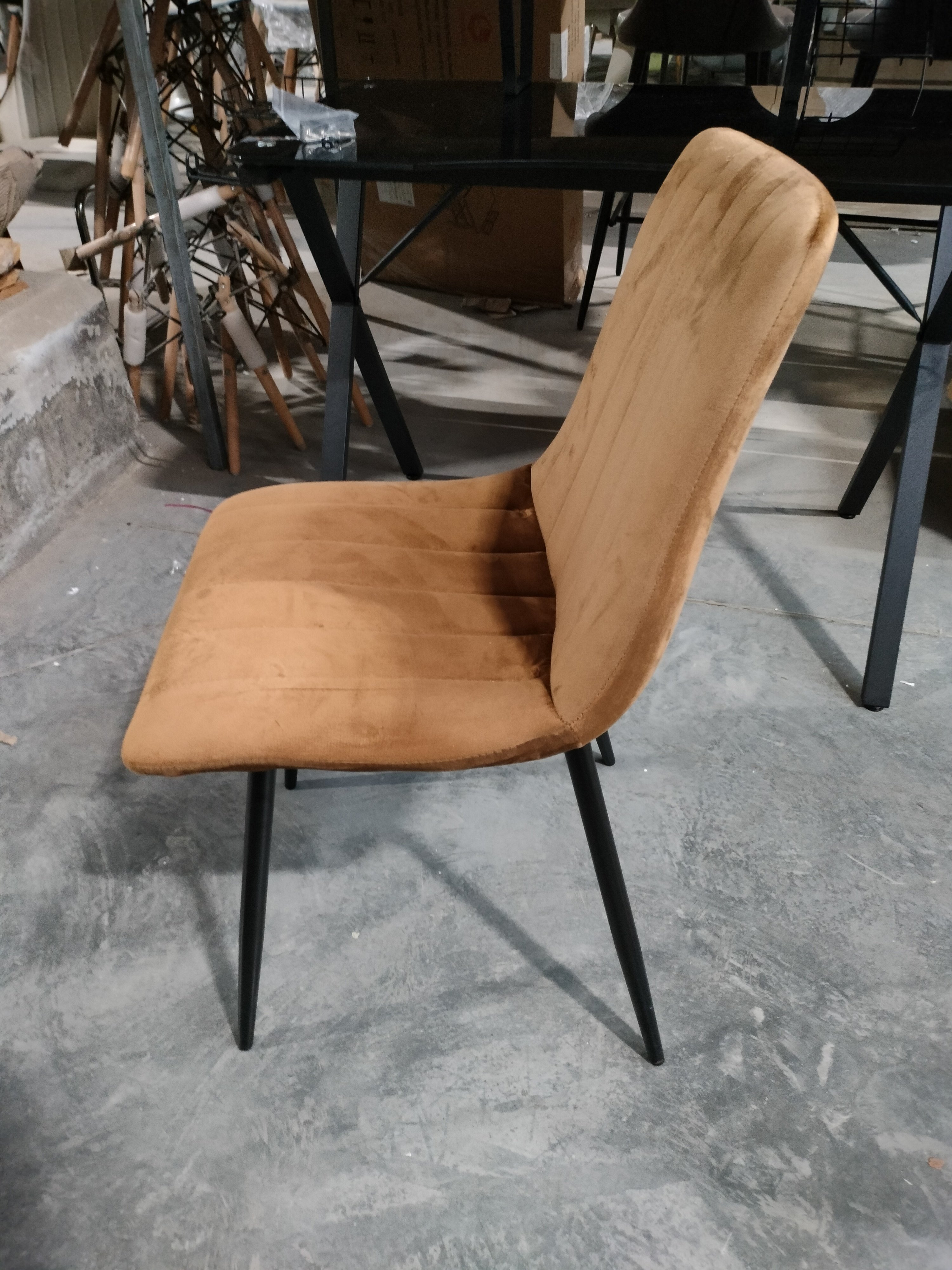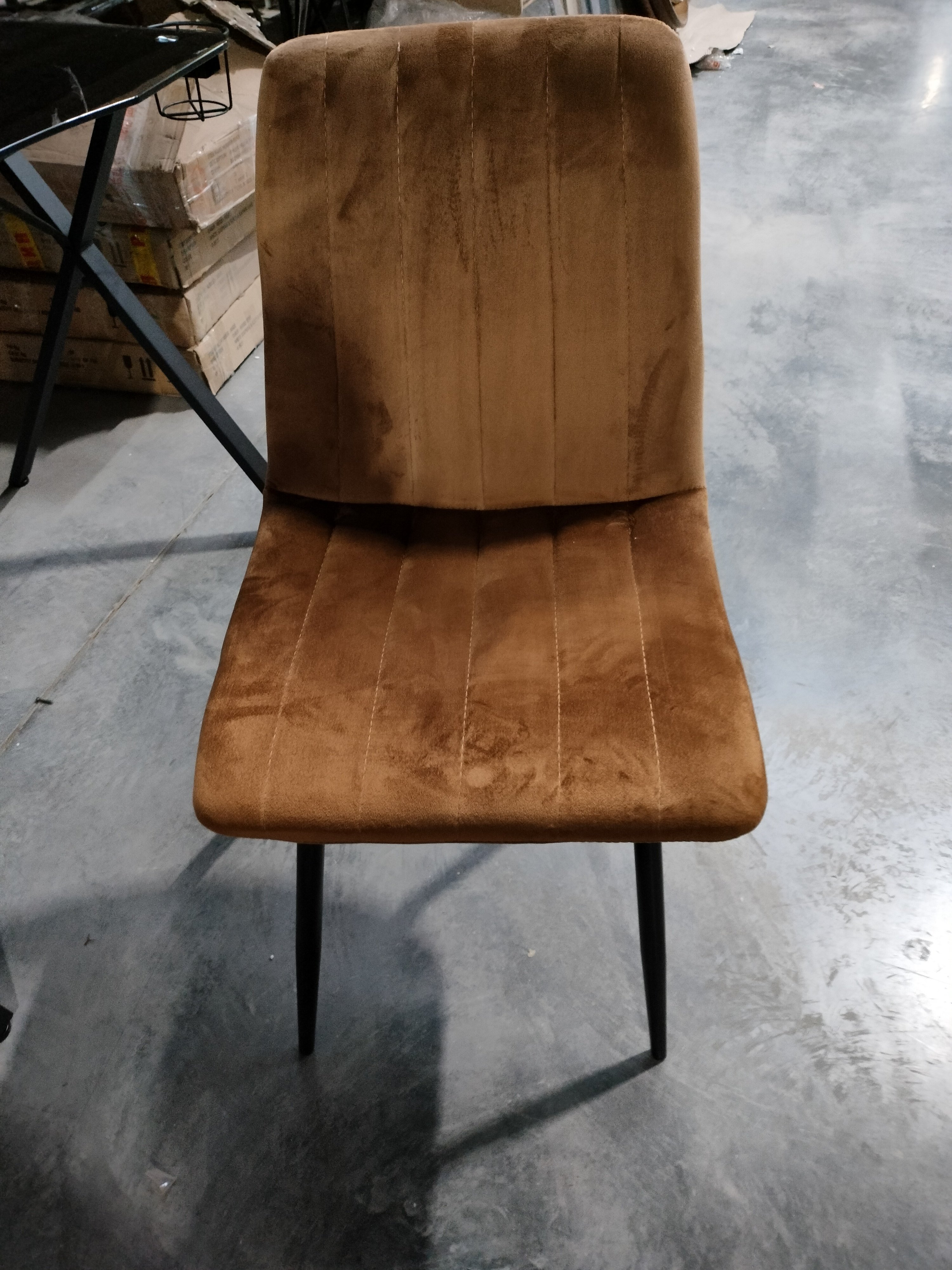Описание товара без дефектов: Великолепный стул DUBLIN из коллекции Modern сделает ваш интерьер не только стильным, но по-домашнему уютным и комфортным. Тонкие изящные ножки в сочетании со стеганой обивкой из вельвета коричневого цвета выгодно выделяют его в интерьере. Мягкое сиденье и спинка позволяют комфортно сидеть в течение длительного времени. Бархатистая и приятная на ощупь поверхность обивки обеспечит максимальный комфорт и уют. Четыре прочные ножки делают модель устойчивой и надежной. Тканевая обивка не мнётся, не меняет форму, пропускает воздух, экологична и гипоаллергенна. Этот стильный и удобный стул отлично впишется в интерьер гостиной, кухни или столовой.