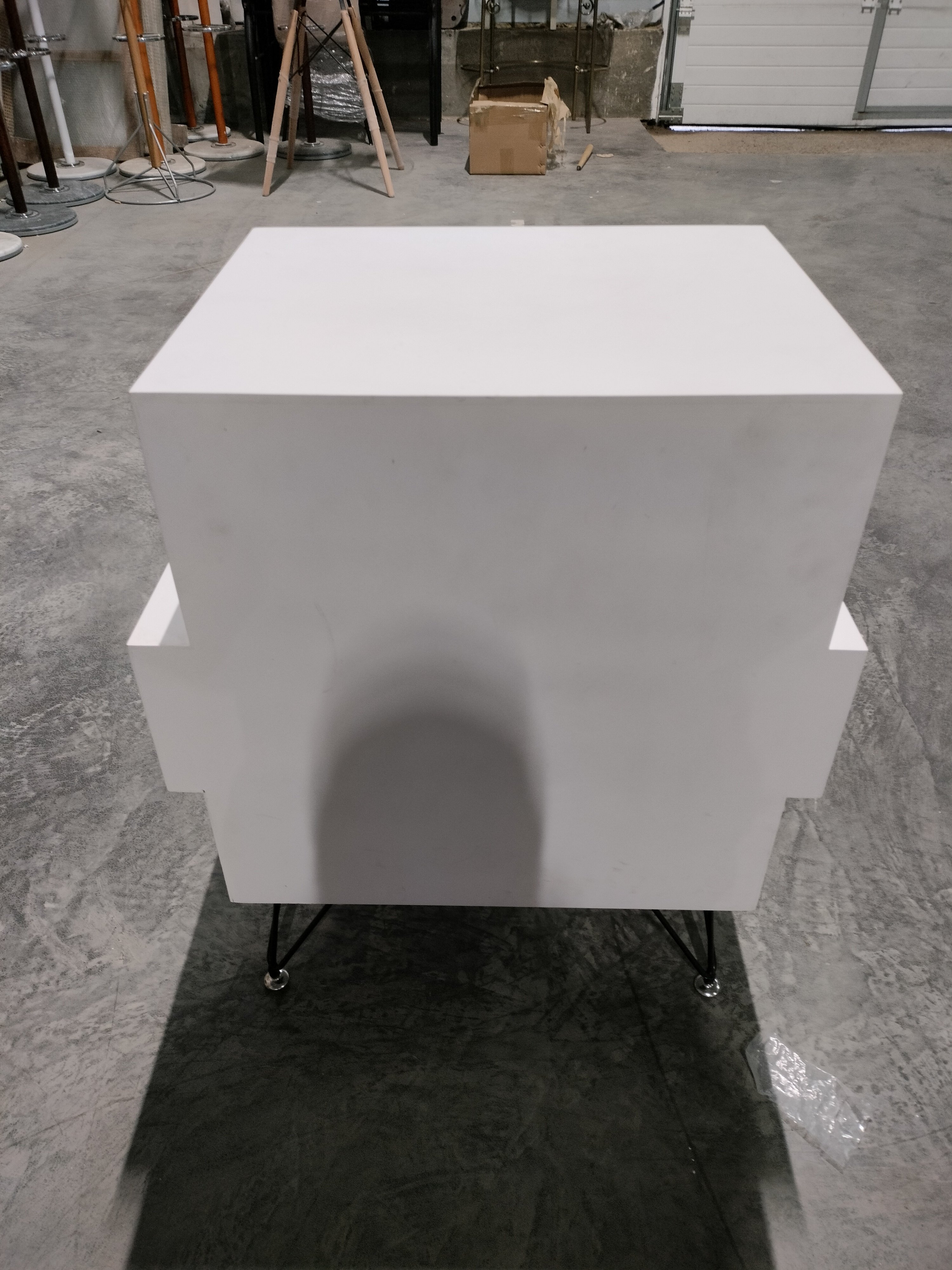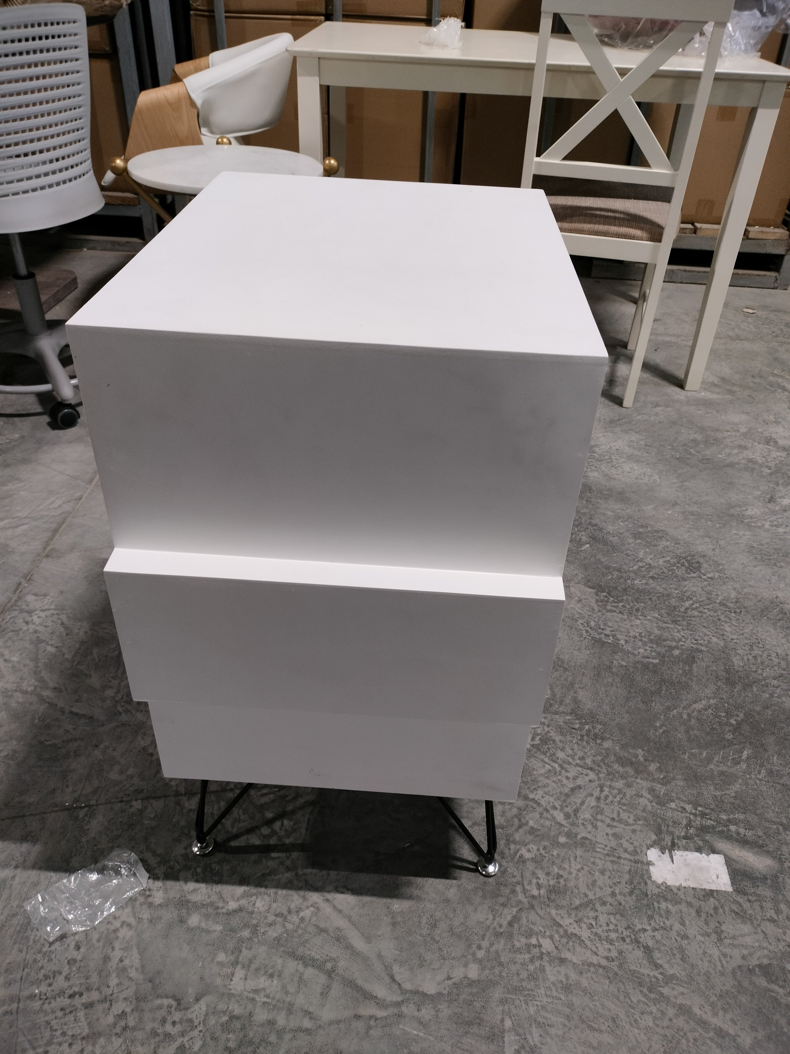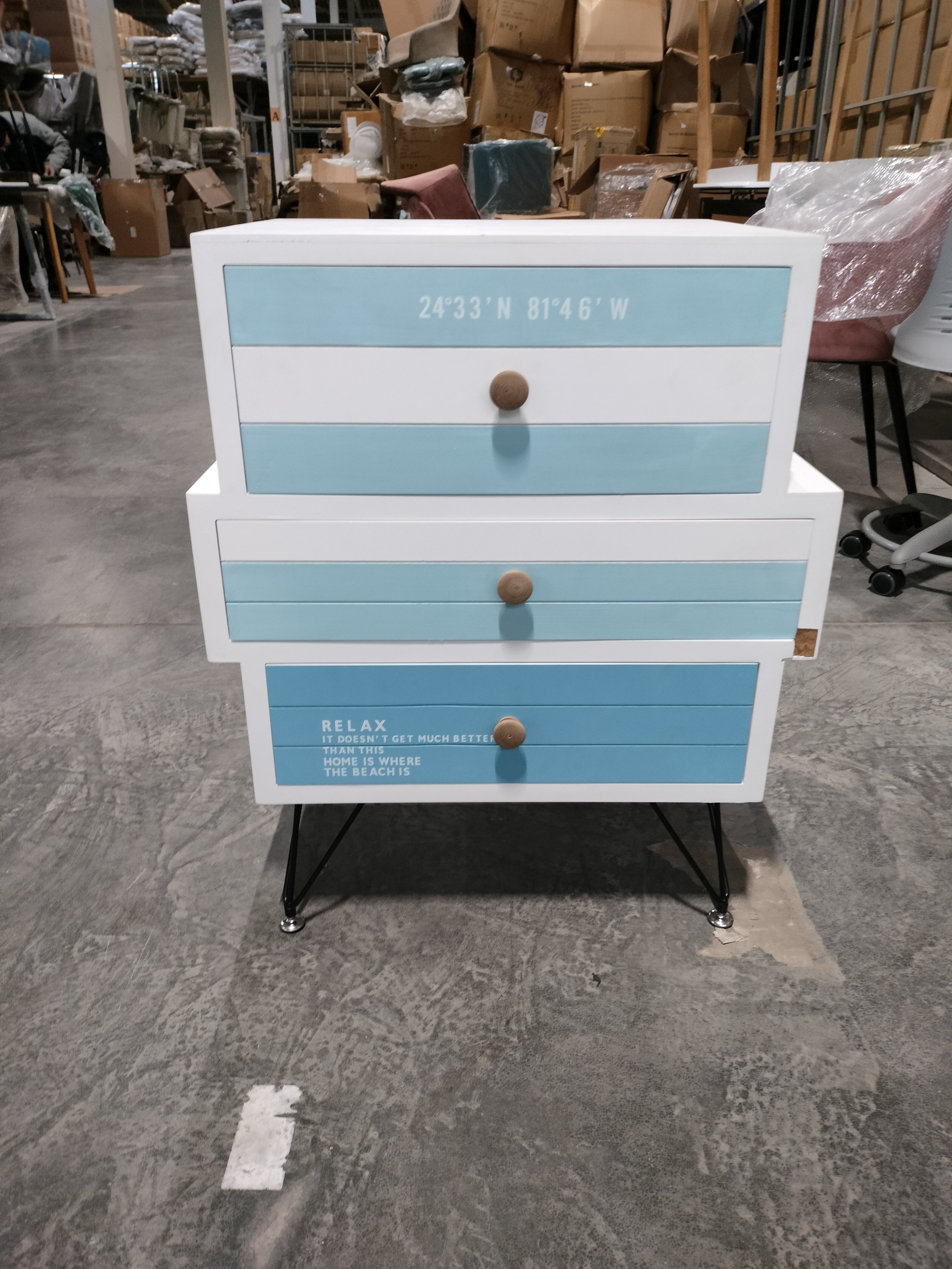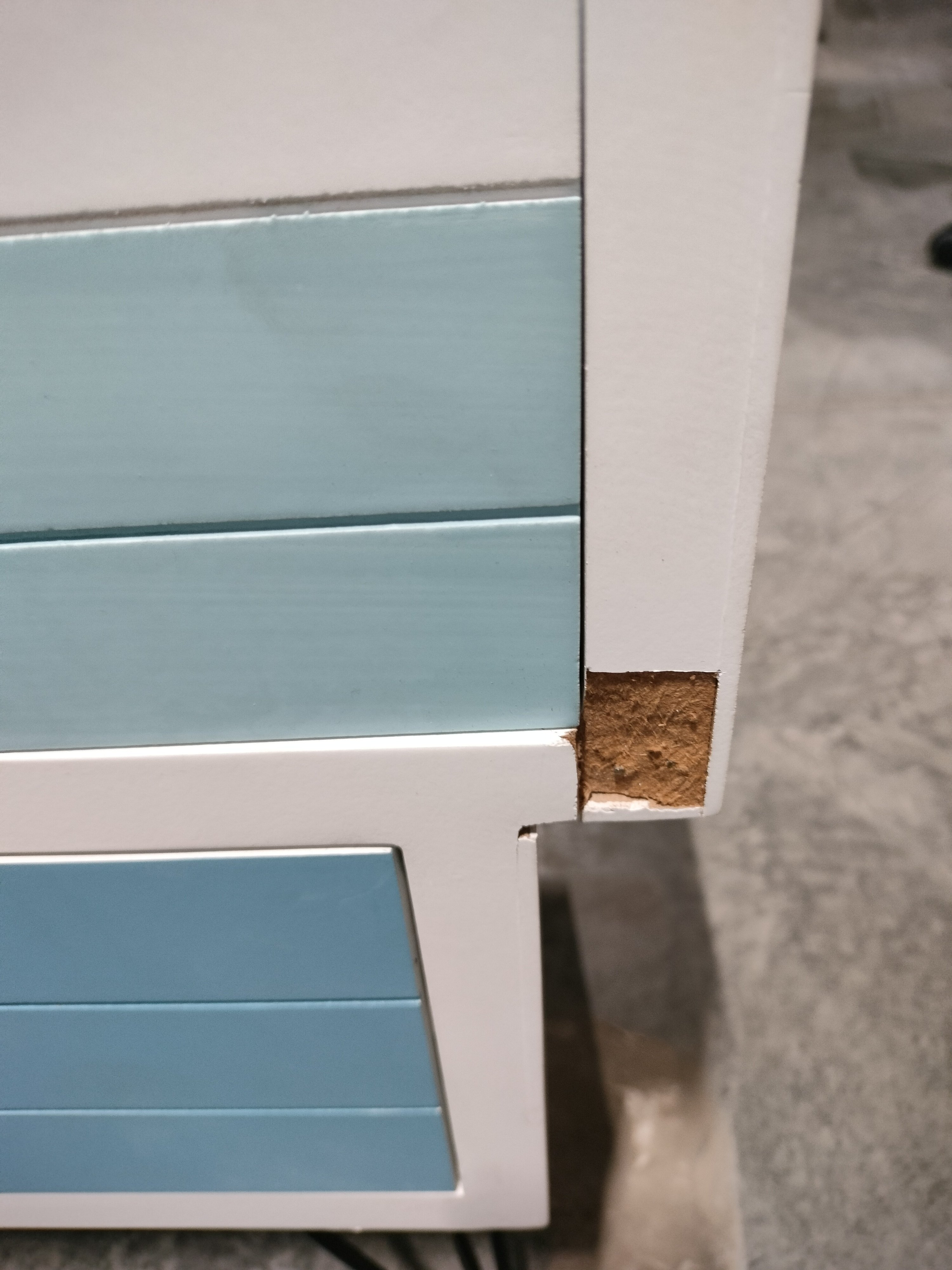 Описание товара без дефектов: Материал: ножки - металл, корпус - дерево павловния, МДФ. Цвет: ножки - чёрный, столешница - белый, голубой. Размер: 58х40х70,5 см