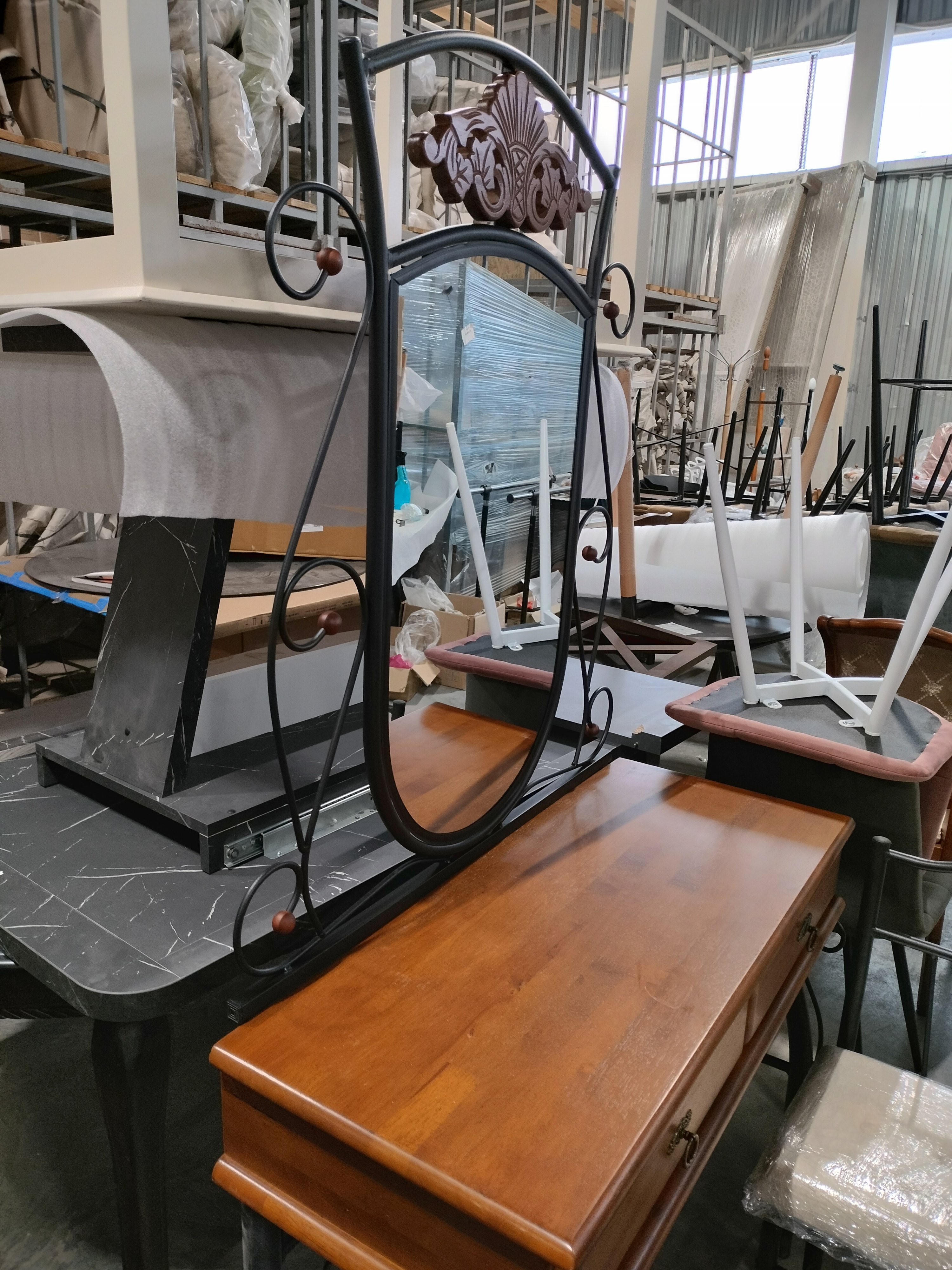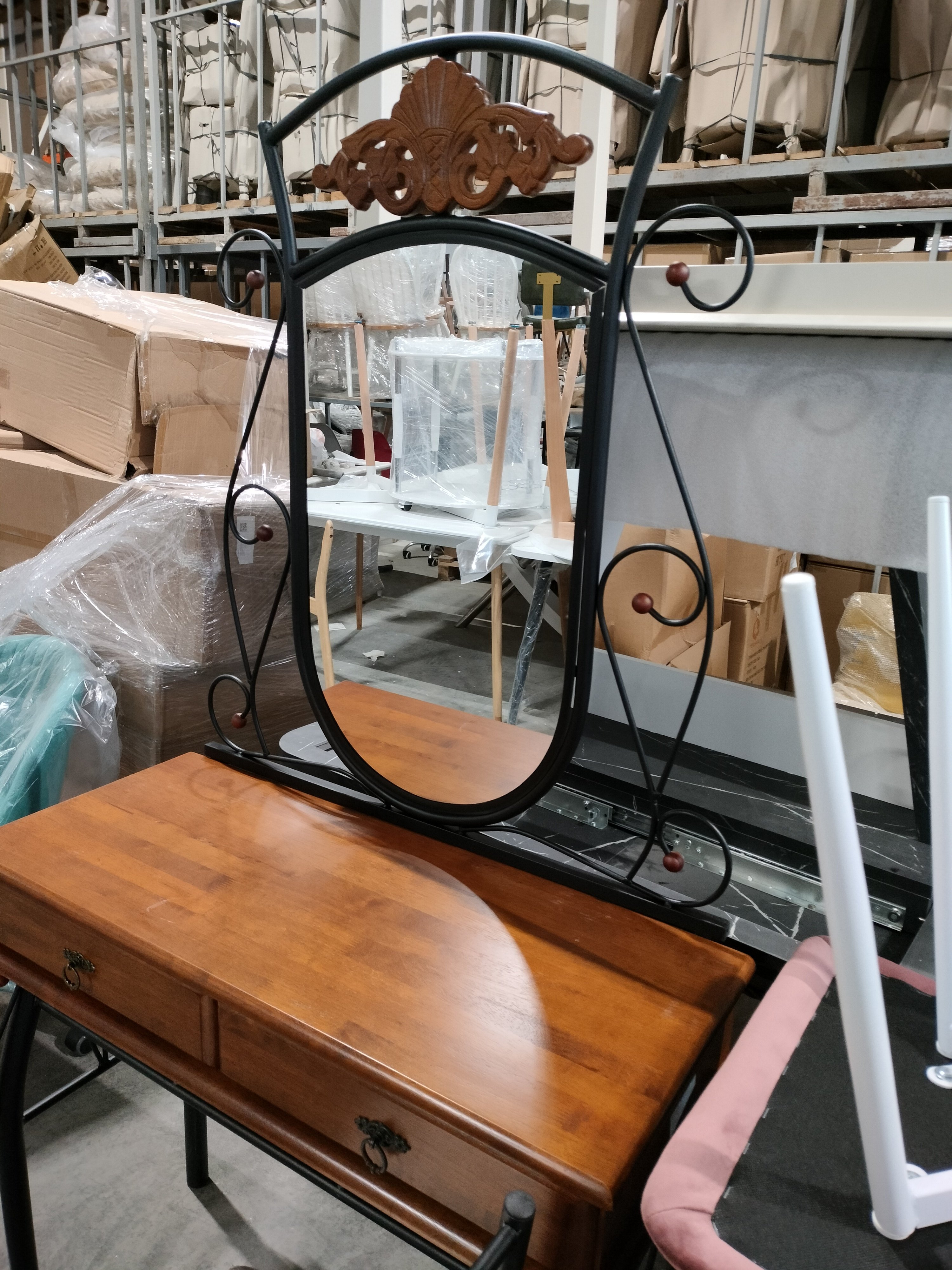 Описание товара без дефектов: Зеркало, 2 выдвижных ящика, стул с обивкой. Материал: каркас - металл; столешница, выдвижные ящики, элементы декора - дерево гевея и металл. Цвет: дерево - красный дуб, металл - чёрный. Размеры: 95х46х16,2 см