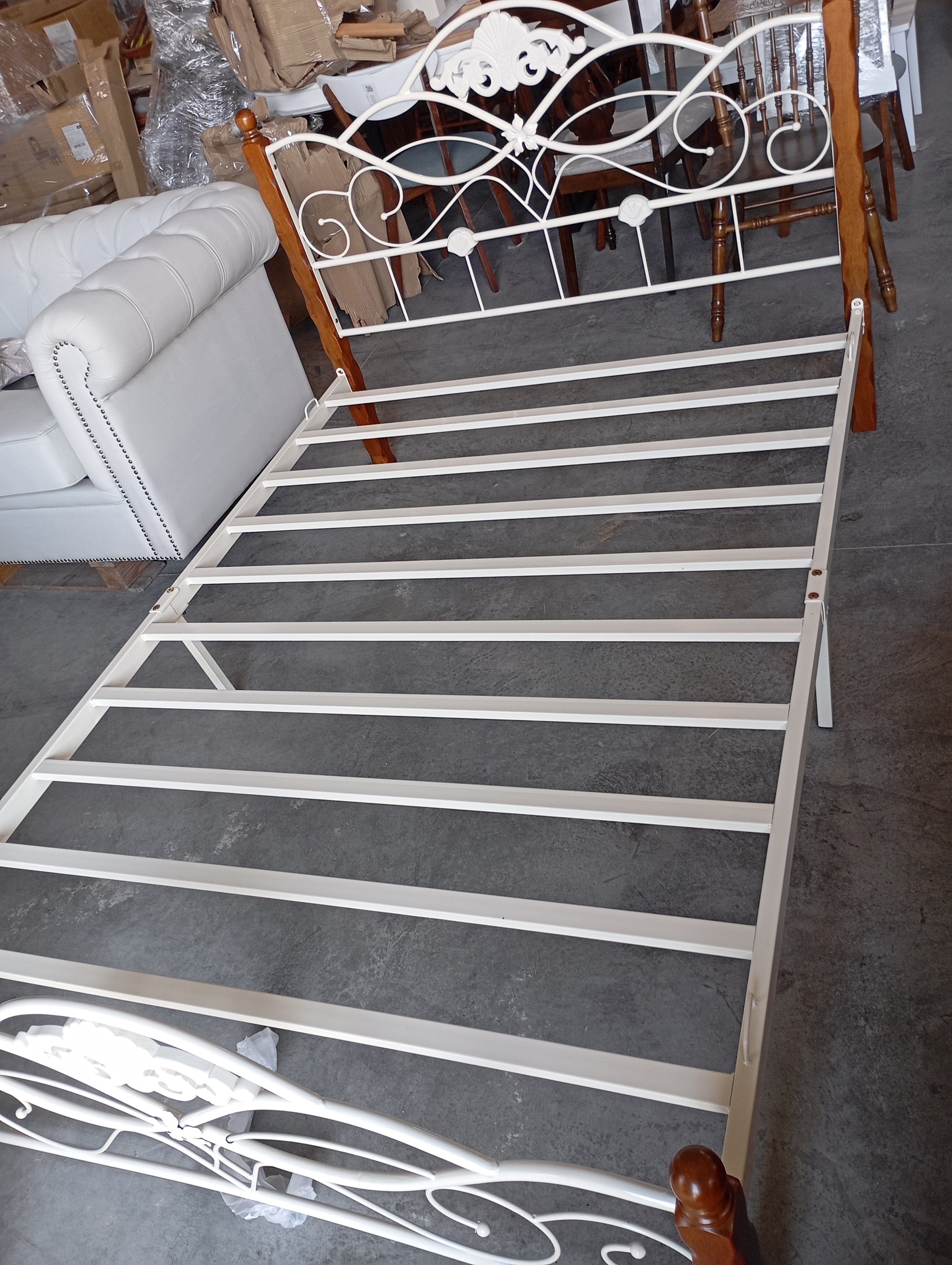 Описание товара без дефектов: Двуспальная кровать. Материал: ножки, элементы декора - дерево гевея; основание, изголовье, изножье - металл. Усиленная база.