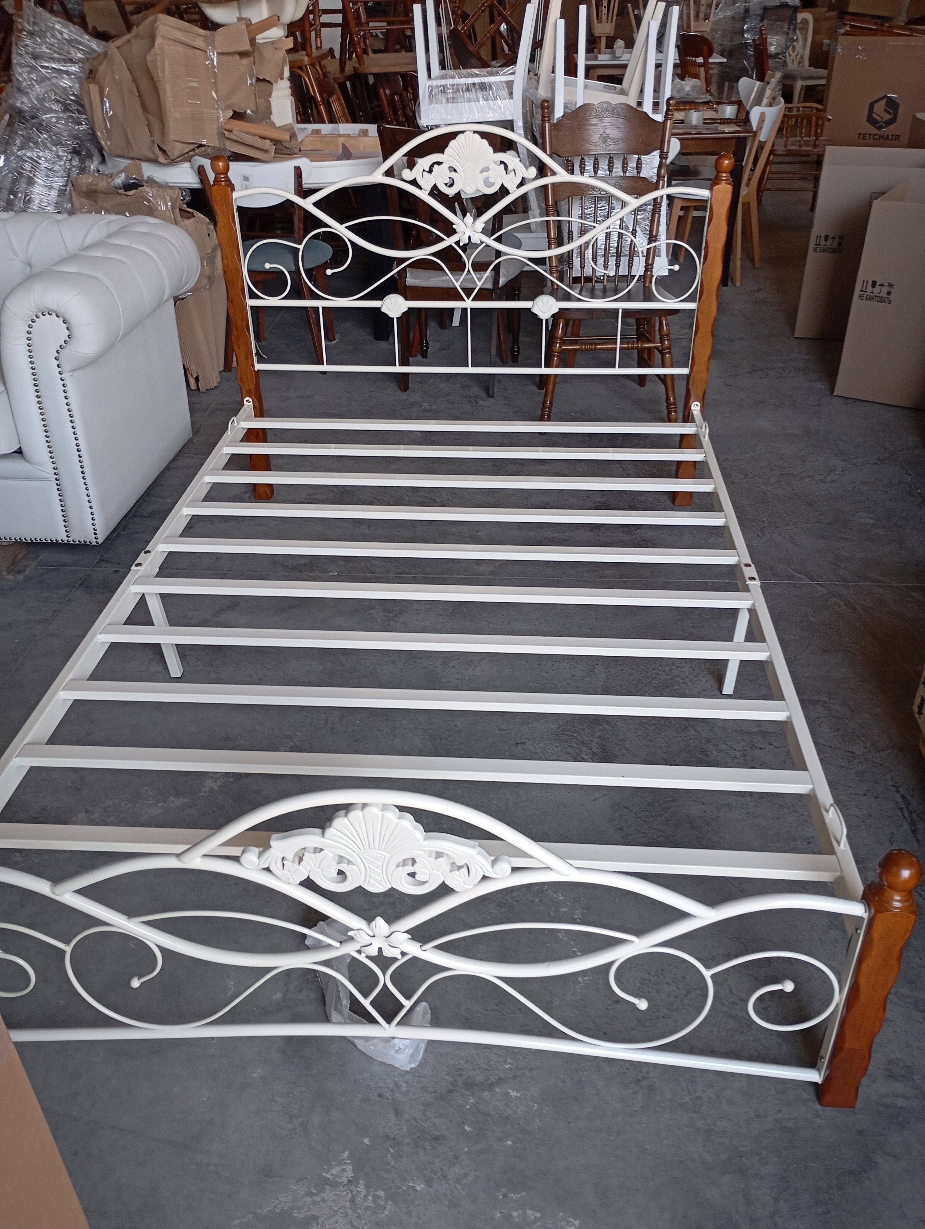 Описание товара без дефектов: Двуспальная кровать. Материал: ножки, элементы декора - дерево гевея; основание, изголовье, изножье - металл. Усиленная база.