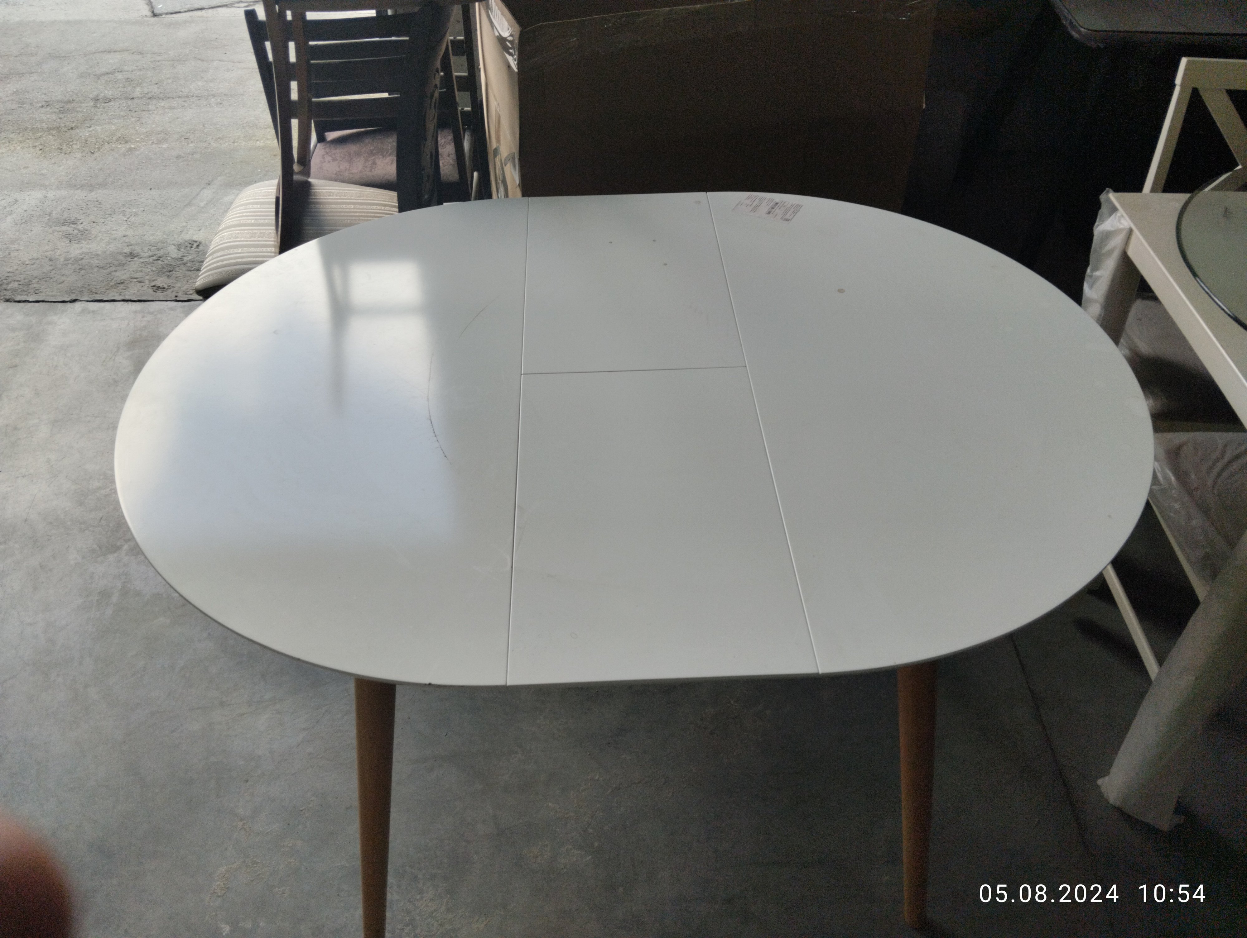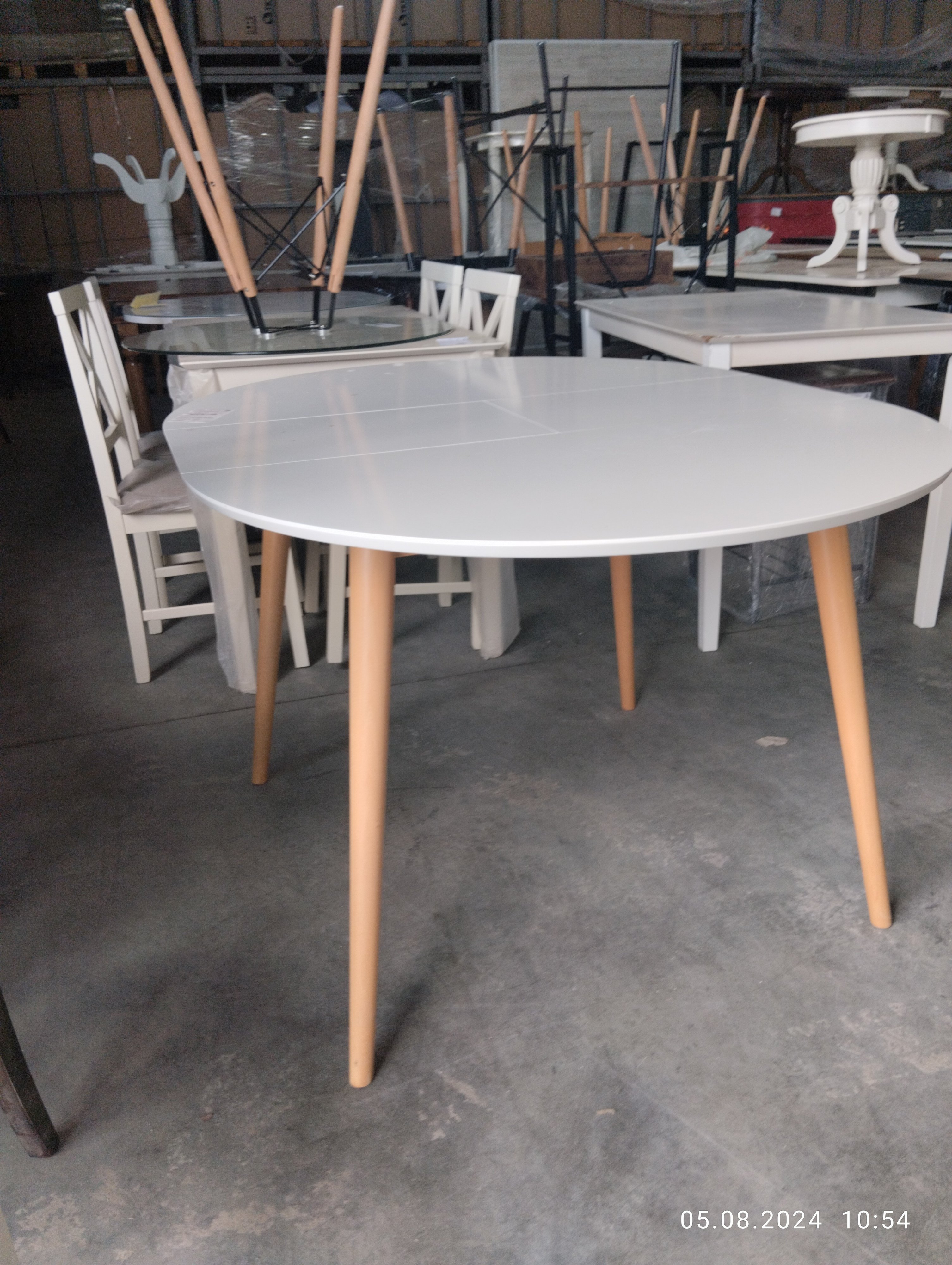 Описание товара без дефектов: Стильный обеденный стол BOSCO из Датской коллекции отлично дополнит интерьер загородного дома, городской квартиры, кухни, гостиной, кафе или ресторана. Удачное сочетание столешницы, покрашенной в белый цвет, и визуально легких ножек цвета натурального дерева выглядит стильно и привлекательно. Обеденный стол BOSCO хорошо впишется в любой современный интерьер. Модель имеет основательный раздвижной механизм, который позволит разместить с комфортом всю вашу семью. Круглая форма столешницы помогает создать свободную и легкую атмосферу в комнате, способствует спокойному и приятному общению. Изящные тонкие ножки изготовлены из натуральной экологически чистой древесины ─ массива бука. Столешница из МДФ со шпоном бука и глянцевым напылением не требует специального ухода, выдерживает воздействие жидкости и тепла. Стол поставляется в разобранном виде, необходима несложная сборка по инструкции.